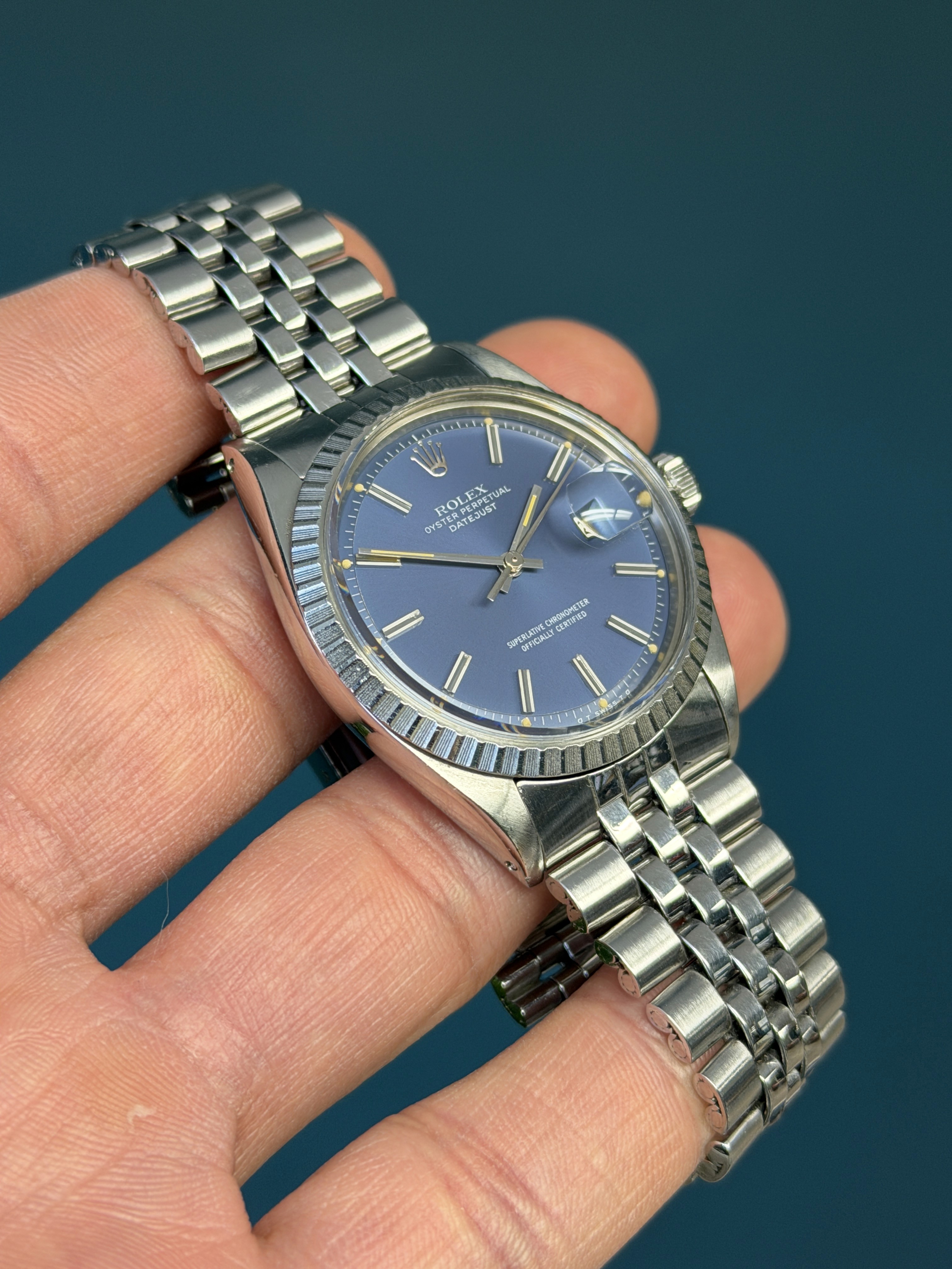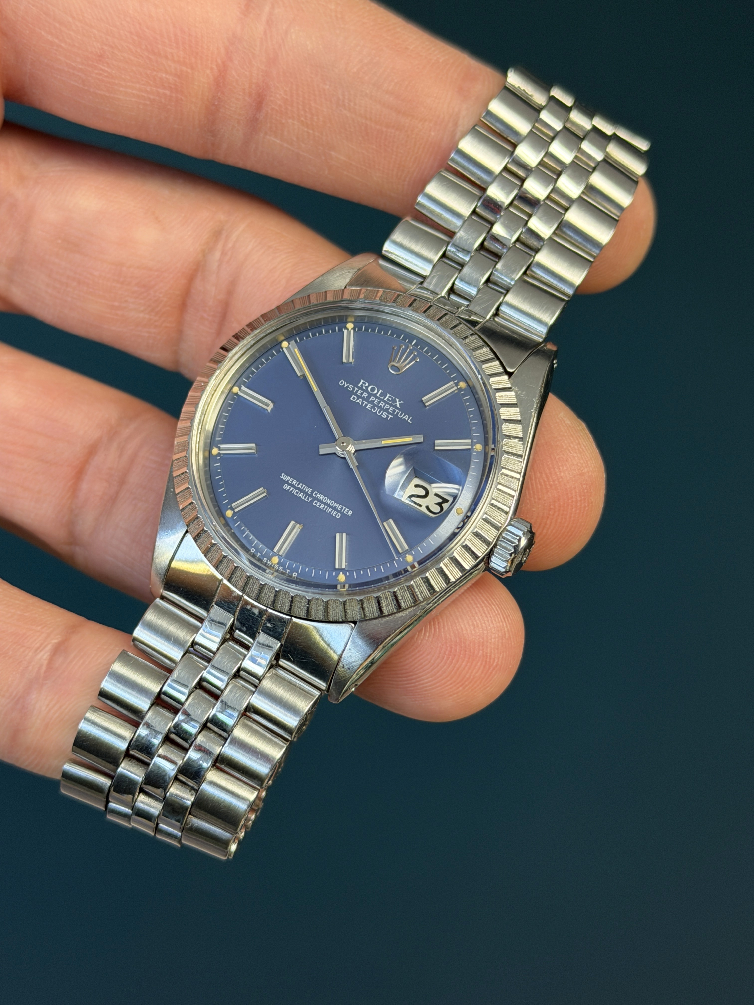 Collectors value the Vintage Rolex 1603 Date just not only for its beauty but also for its rarity and potential as an investment. Owning one means possessing a piece of history and a symbol of timeless elegance. This example from 1971 comes with a very rare Blue Lavender Sigma pie pan dial with all of its full pumpkin patina hr plots. The case is thick and even with healthy lugs. The Bracelet is long with only minimal stretch. What an excellent rare site to see a lavender Sigma Pie Pan Dial!