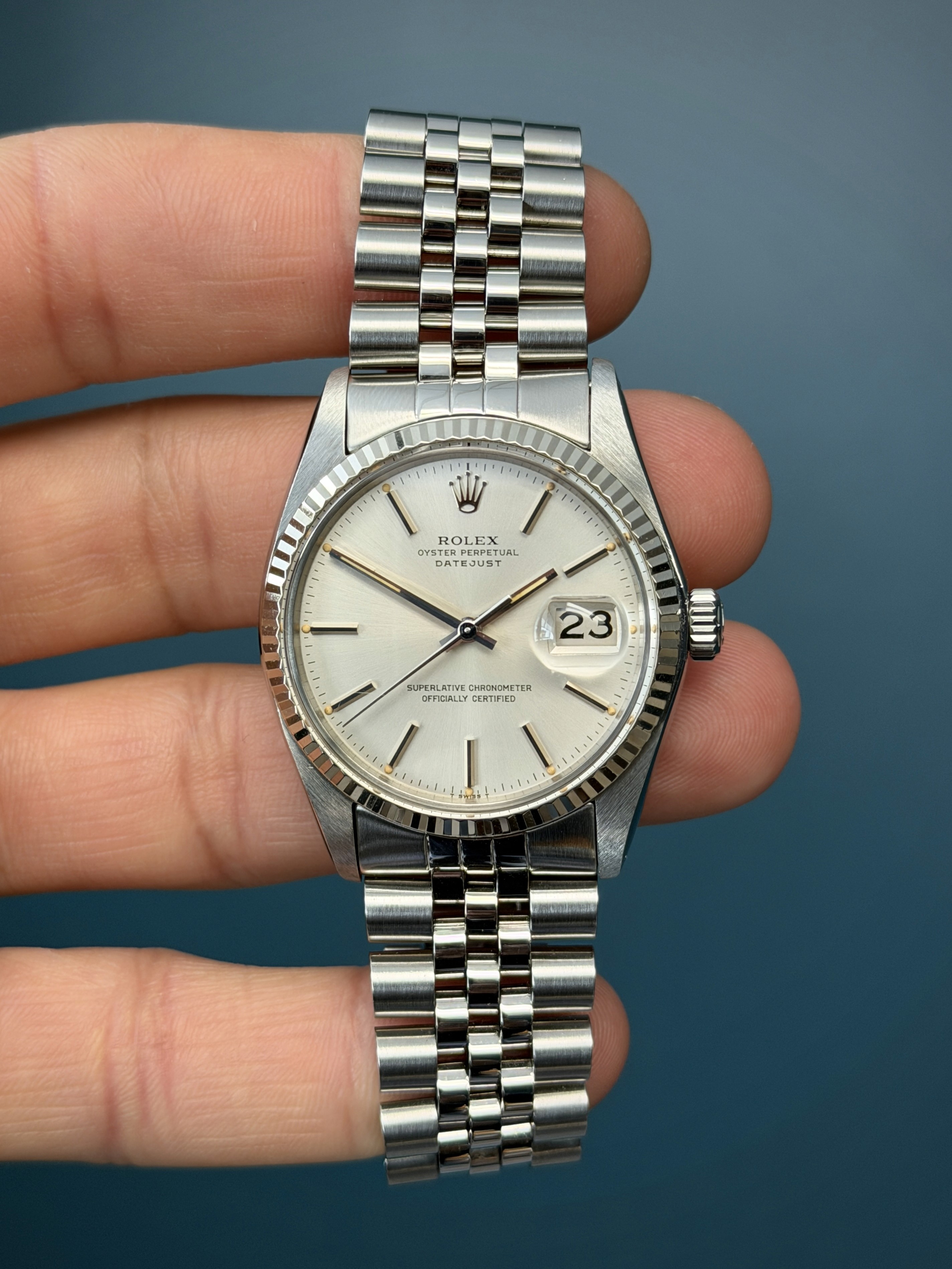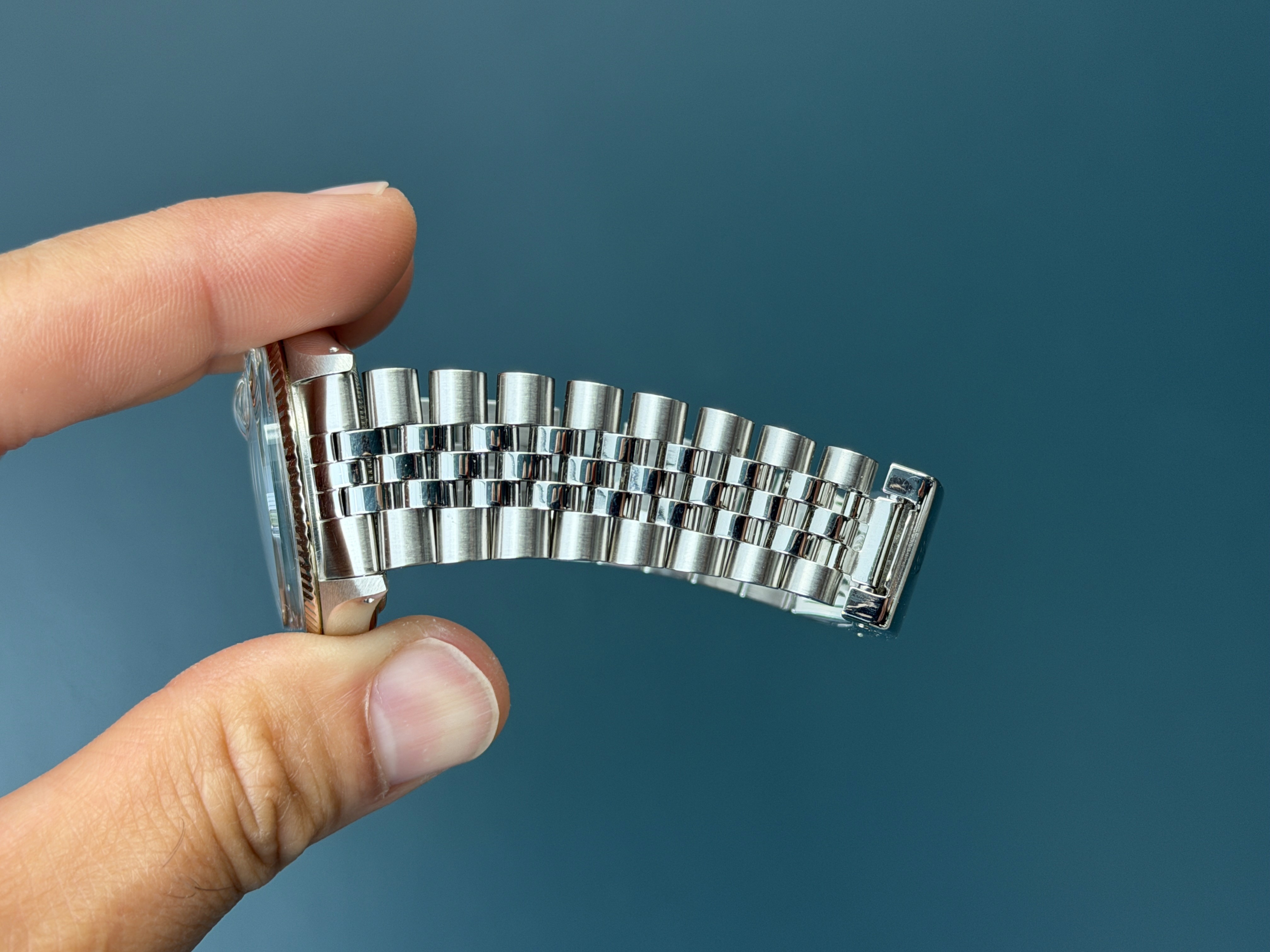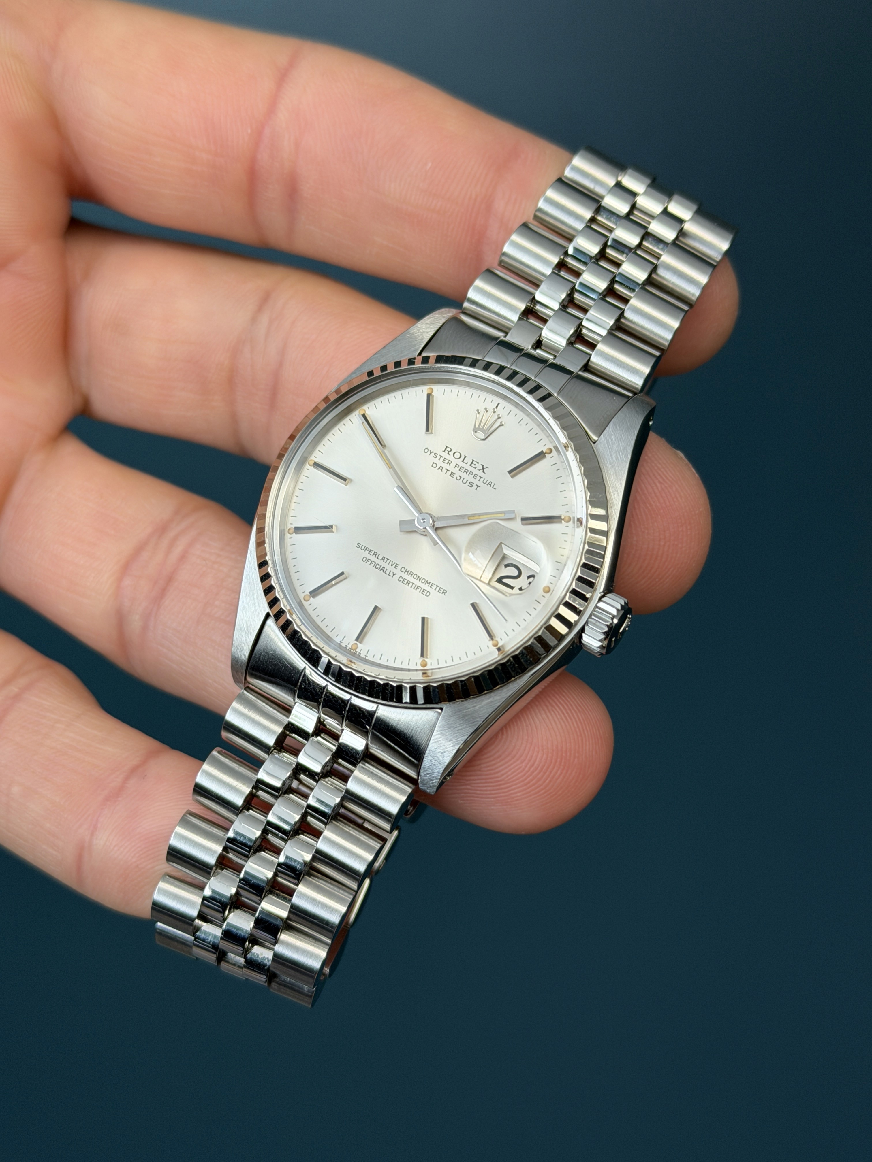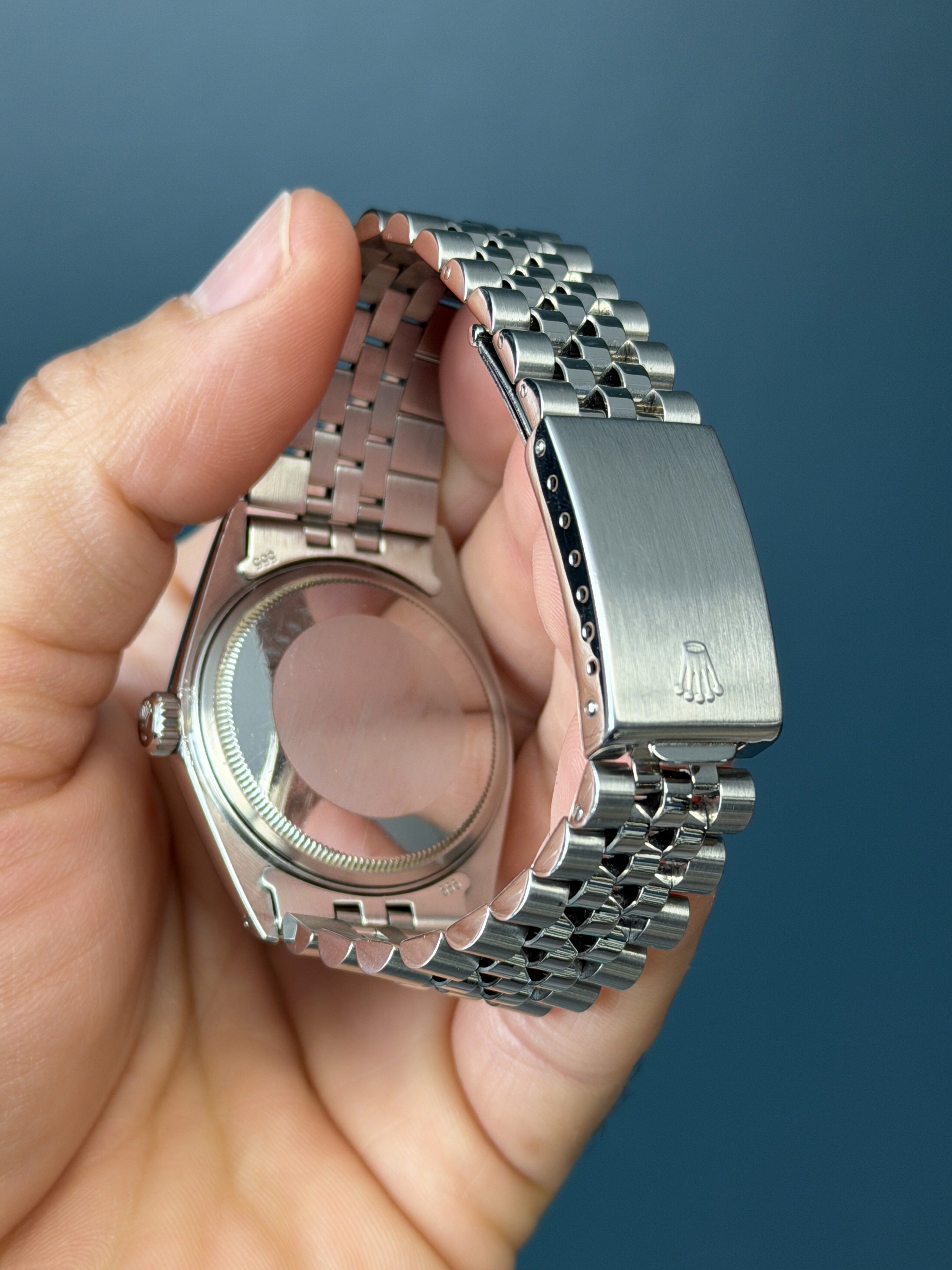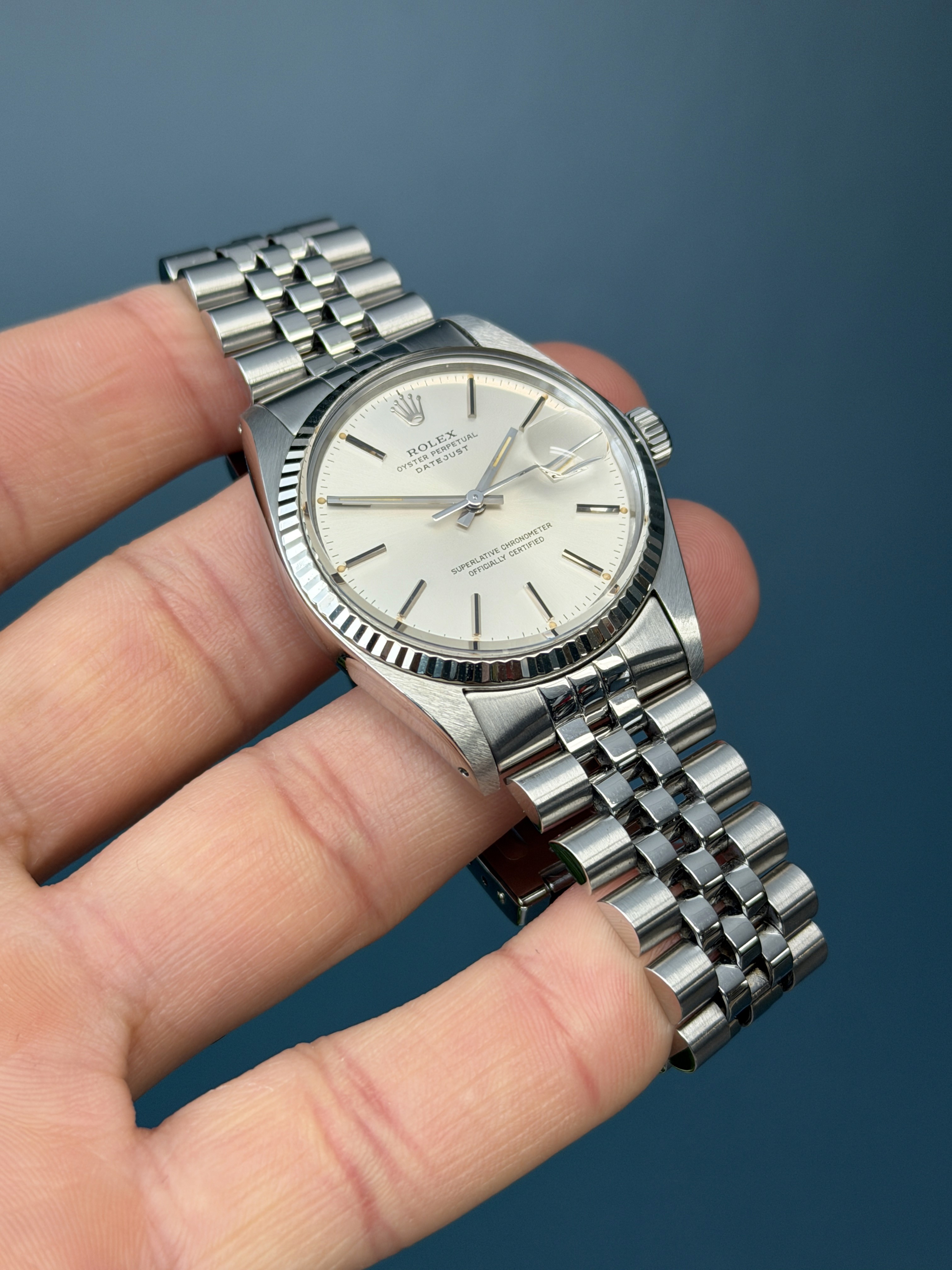 This example is in excellent retail ready condition with an excellent case with thick and sharp lugs. The dial is excellent showing no wear, and is present with thick pumpkin hour plots with matching hands. The jubilee bracelet is long with 4 removable screws with no stretch. This example is running great and has an excellent aesthetic appearance.