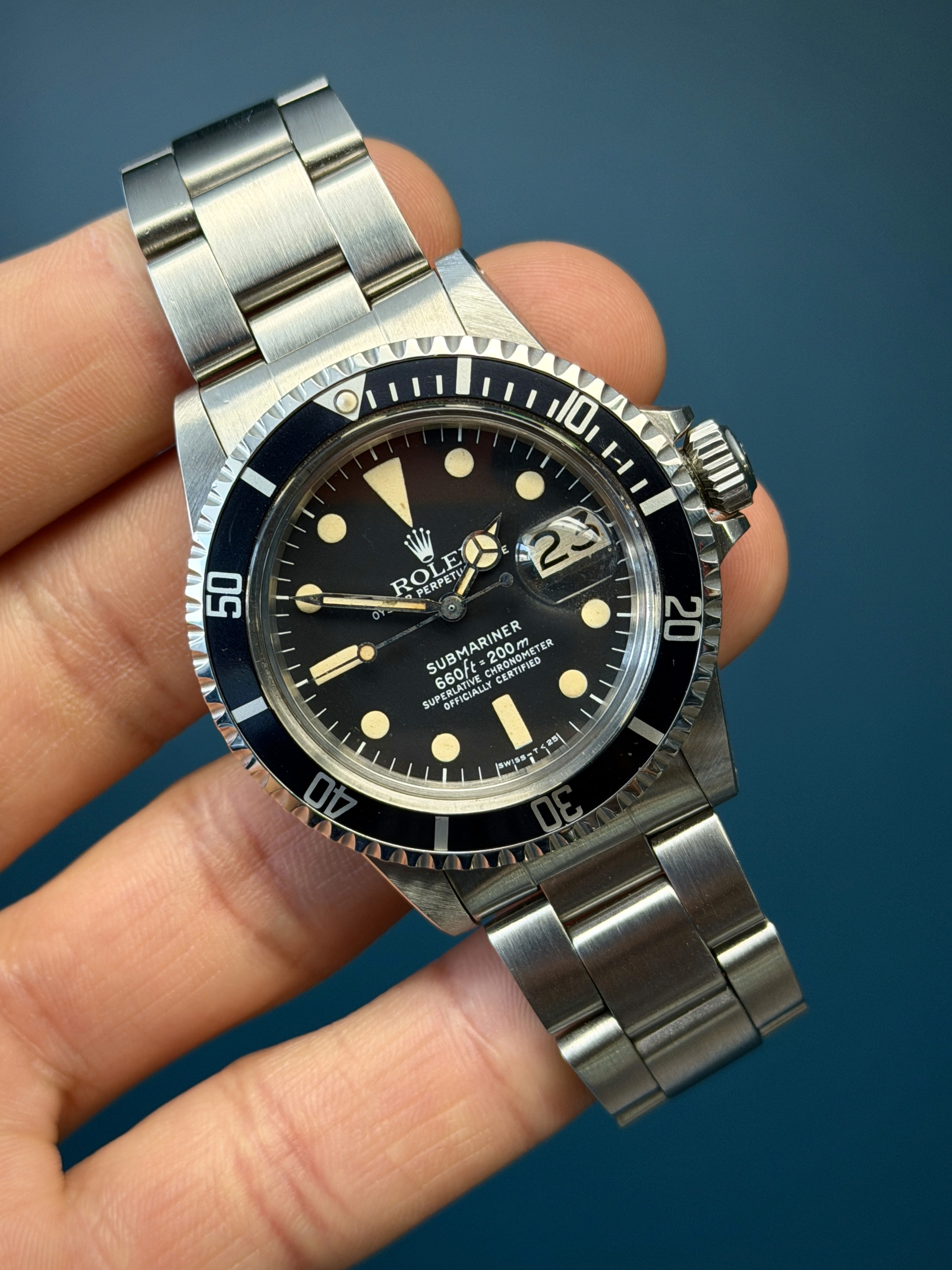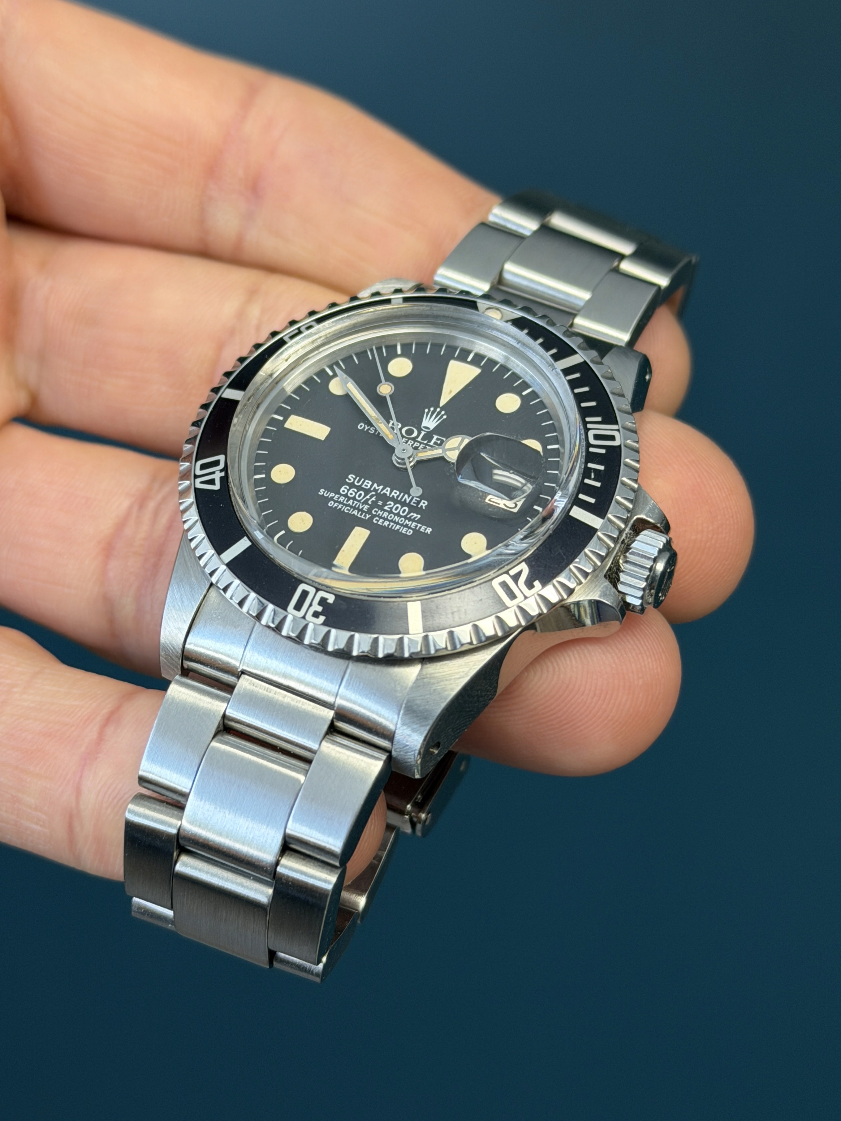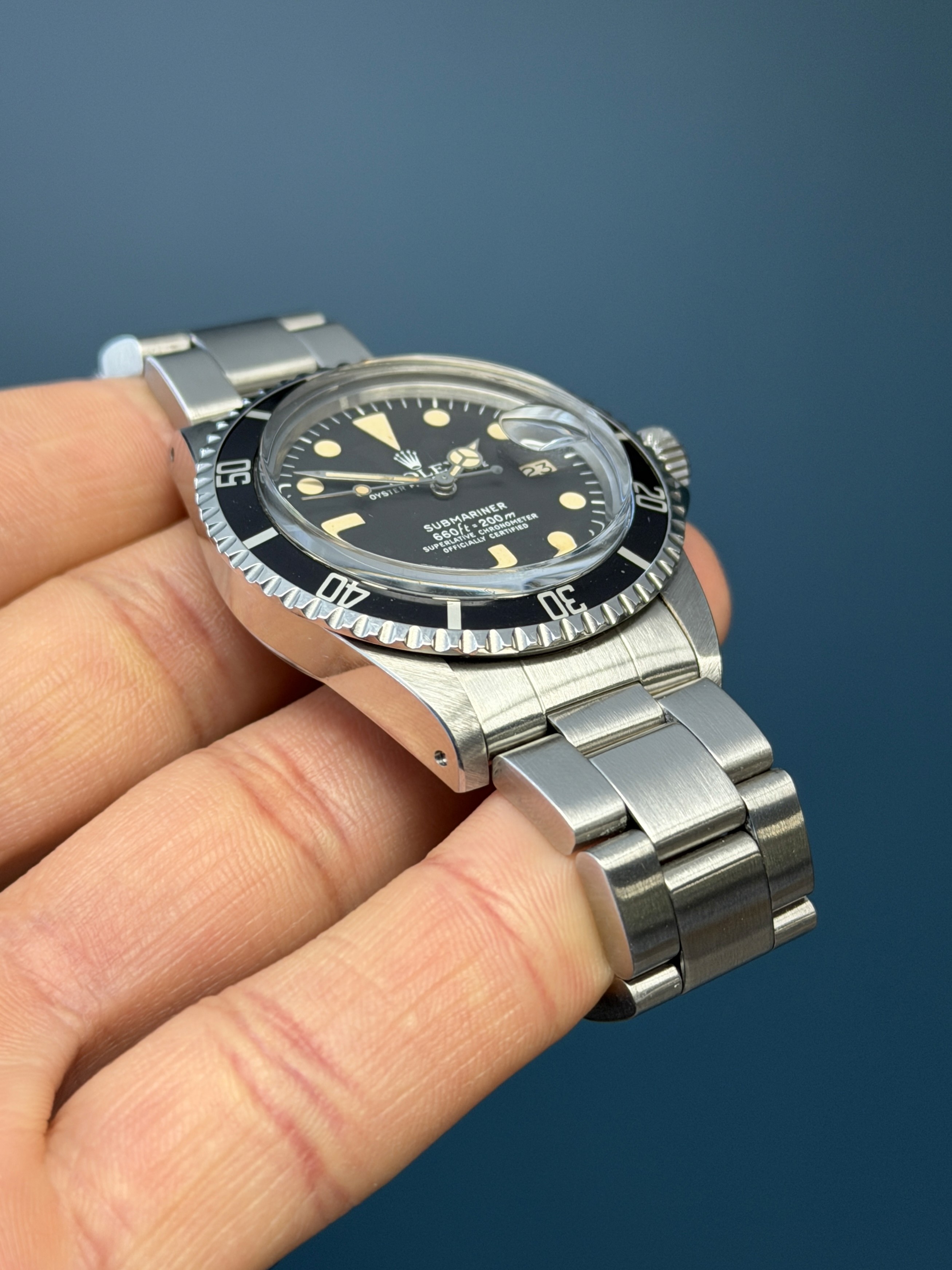 Today's example comes to us with an excellentMK1 dial with nice thick hour plots and matching patina. The case is excellent with sharp lugs. The insert is excellent. The 93150 bracelet with 580 end links has 11 links total along with its diver extension and shows no stretch. Now here's an excellent looking vintage submariner that wont kill your pockets for the price point.