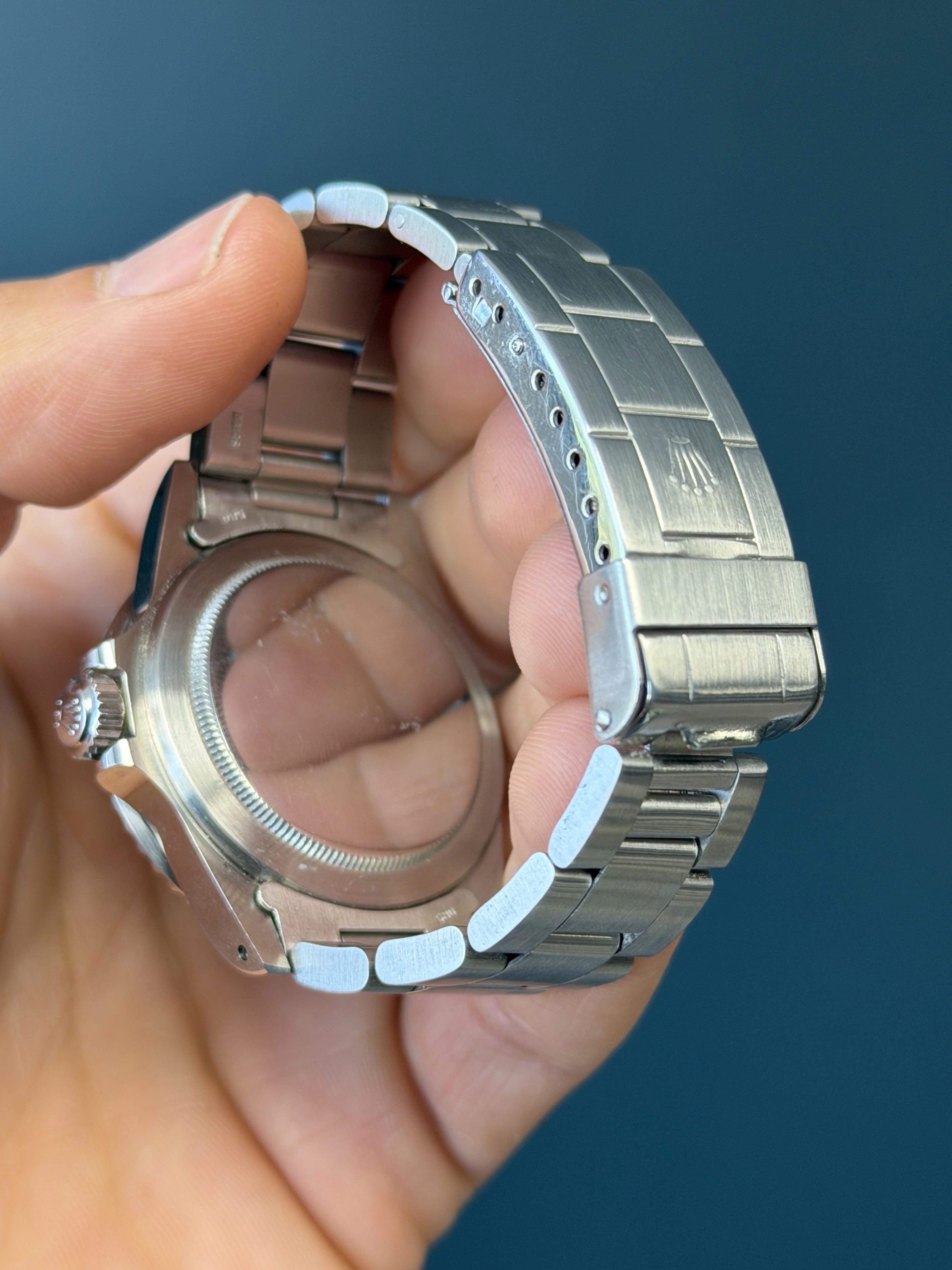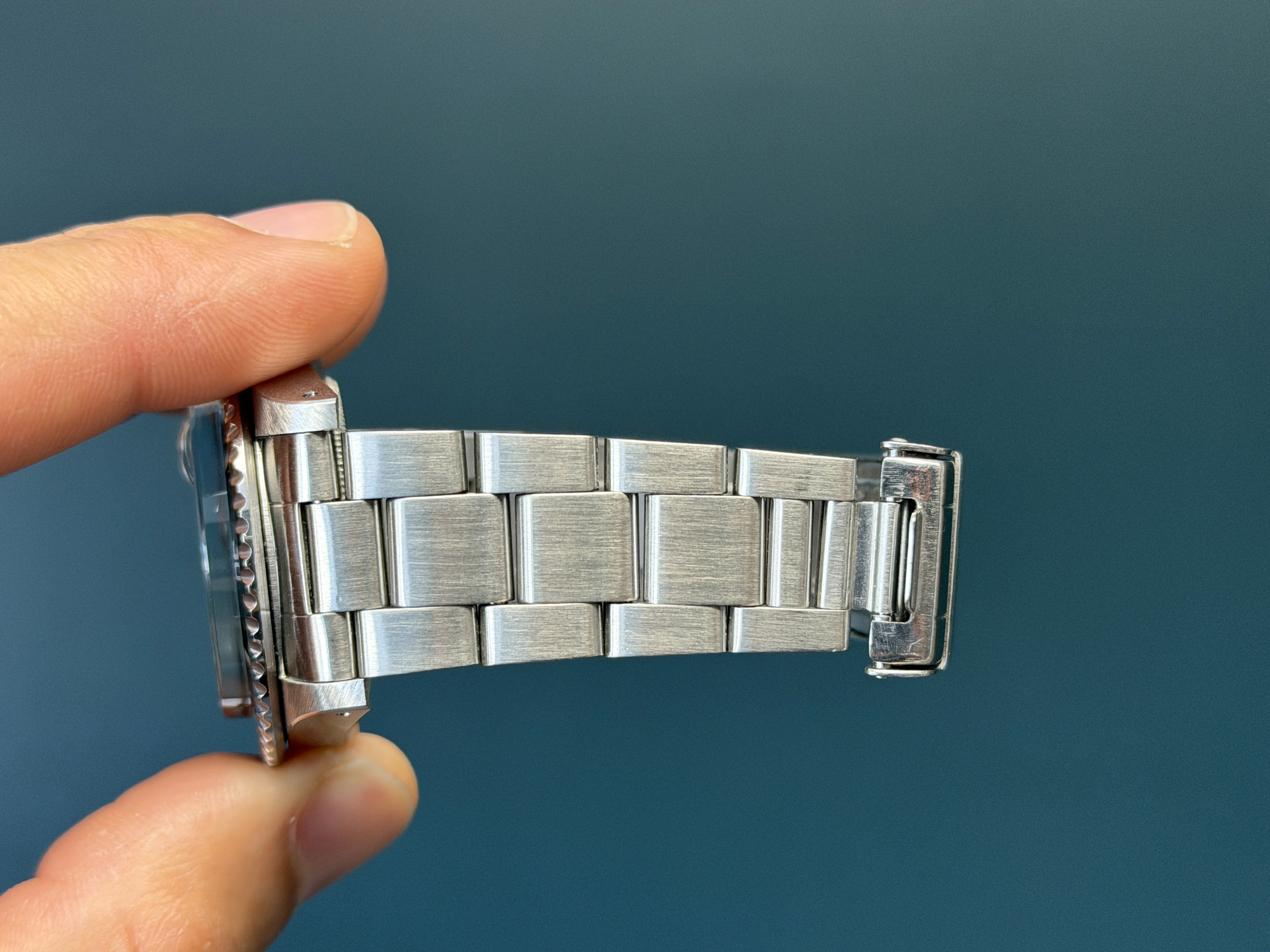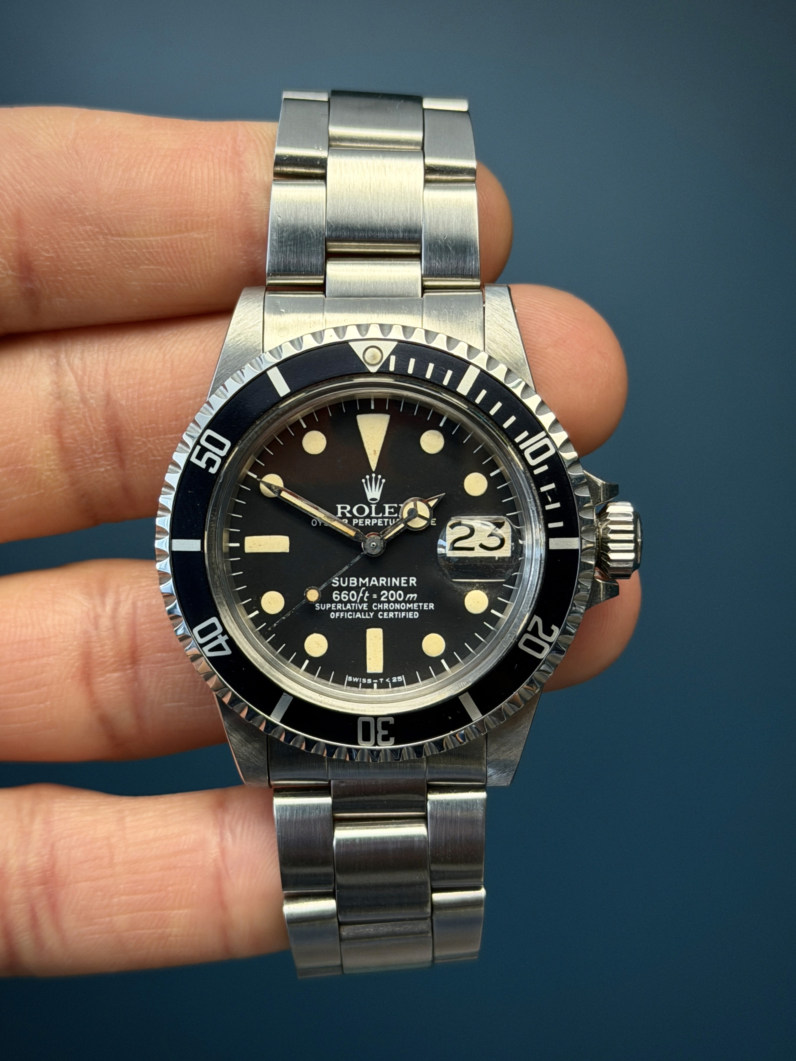Today's example comes to us with an excellentMK1 dial with nice thick hour plots and matching patina. The case is excellent with sharp lugs. The insert is excellent. The 93150 bracelet with 580 end links has 11 links total along with its diver extension and shows no stretch. Now here's an excellent looking vintage submariner that wont kill your pockets for the price point.