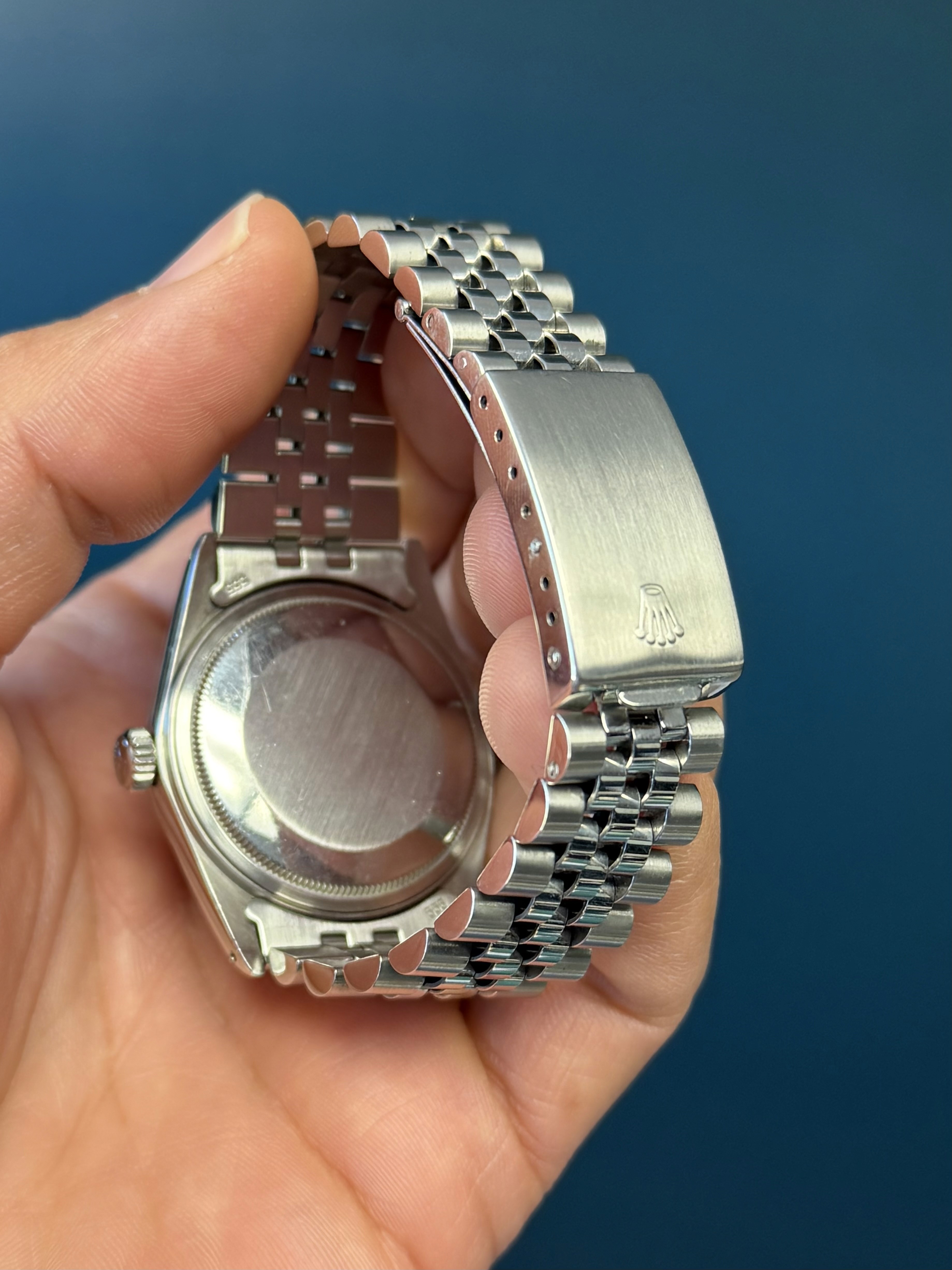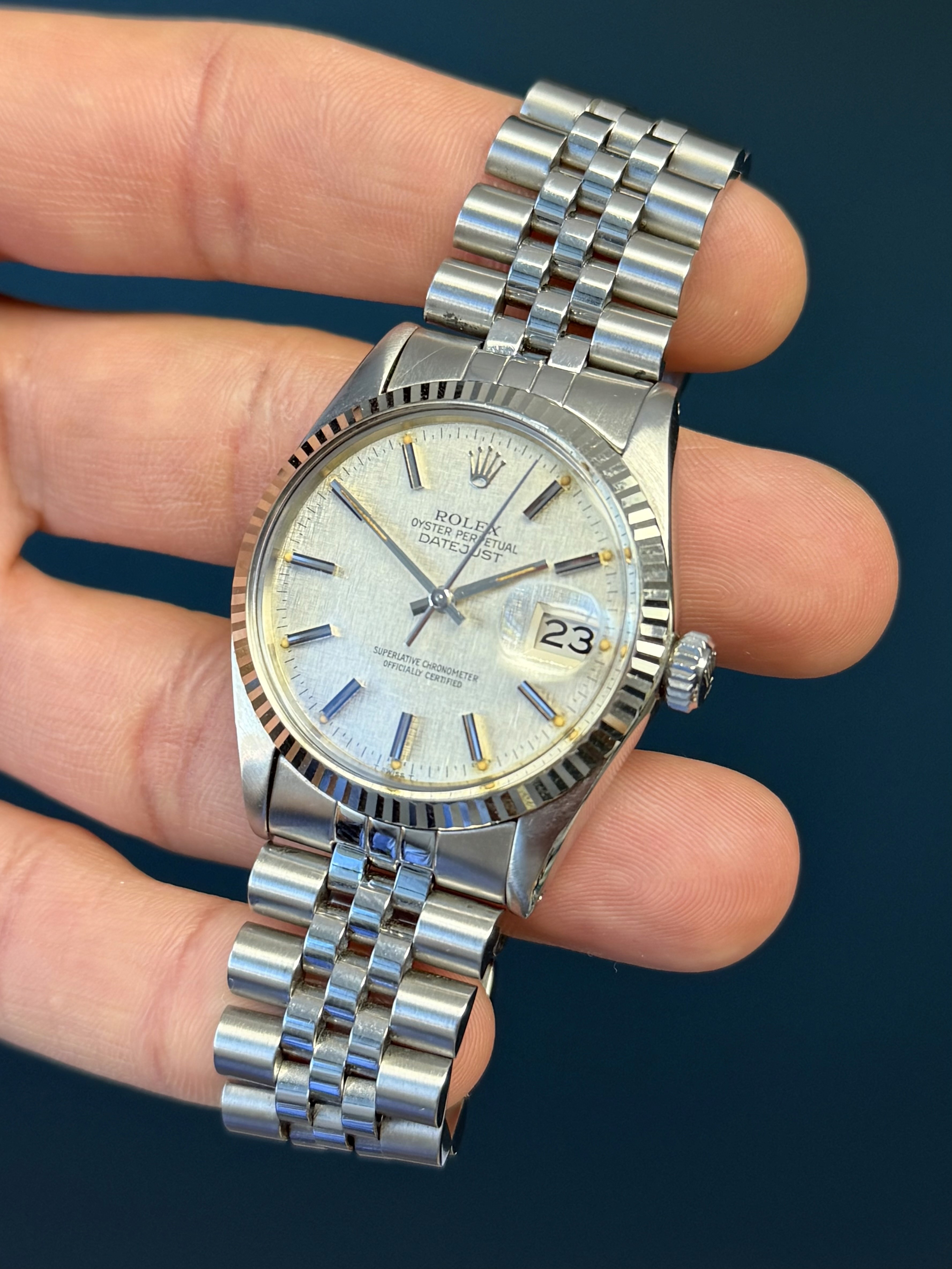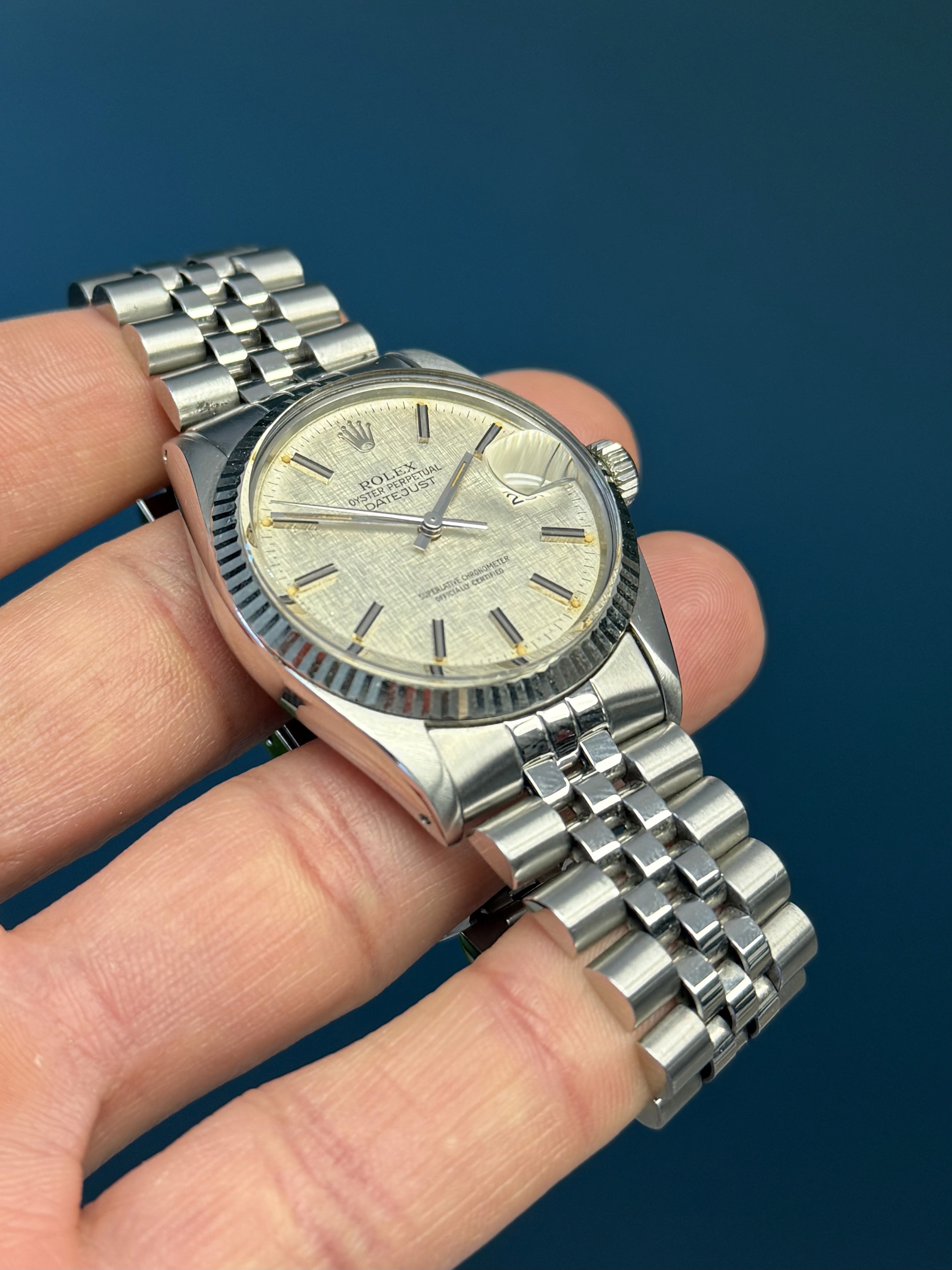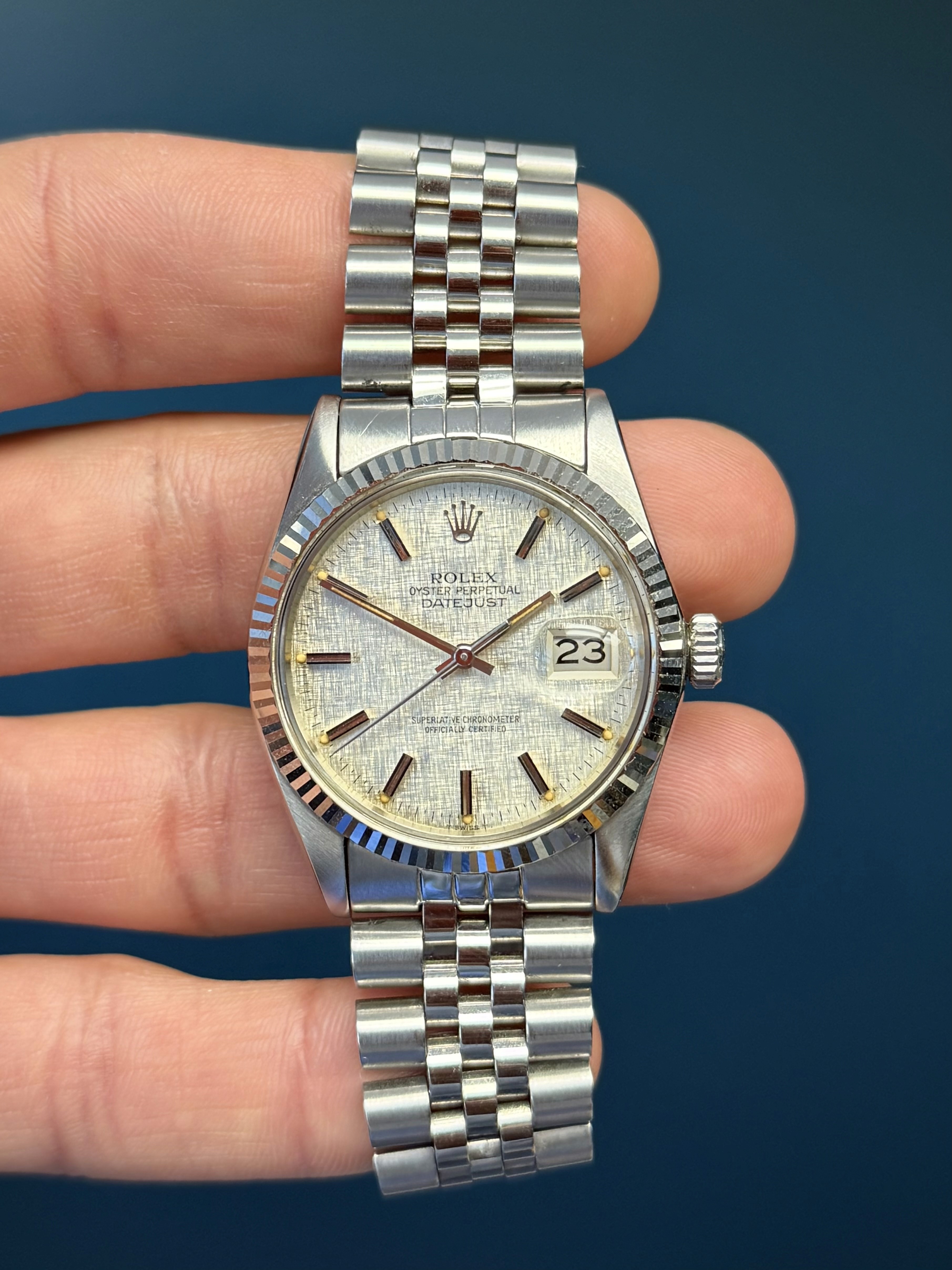 The vintage Rolex Datejust Reference 16014 with a rare linen dial is a highly collectible timepiece, combining classic design with a unique aesthetic. The 36mm stainless steel case features a fluted white gold bezel, embodying Rolex's signature blend of luxury and durability. Its standout feature is the rare linen-patterned dial, offering a textured visual effect that sets it apart from traditional dials, making it a true collector's piece. Powered by the reliable automatic Caliber 3035, it also includes a quick-set date function. This rare variation of the iconic Datejust is ideal for those seeking exclusivity and timeless elegance in their watch collection.