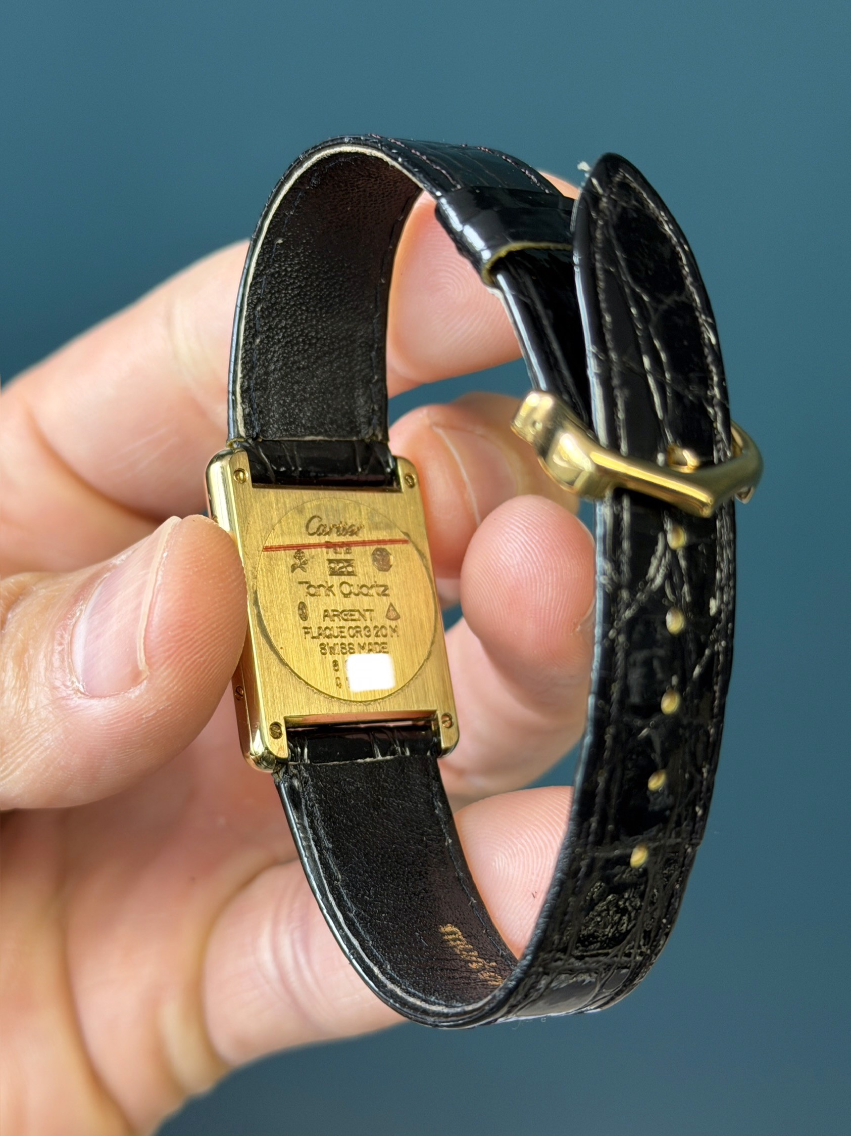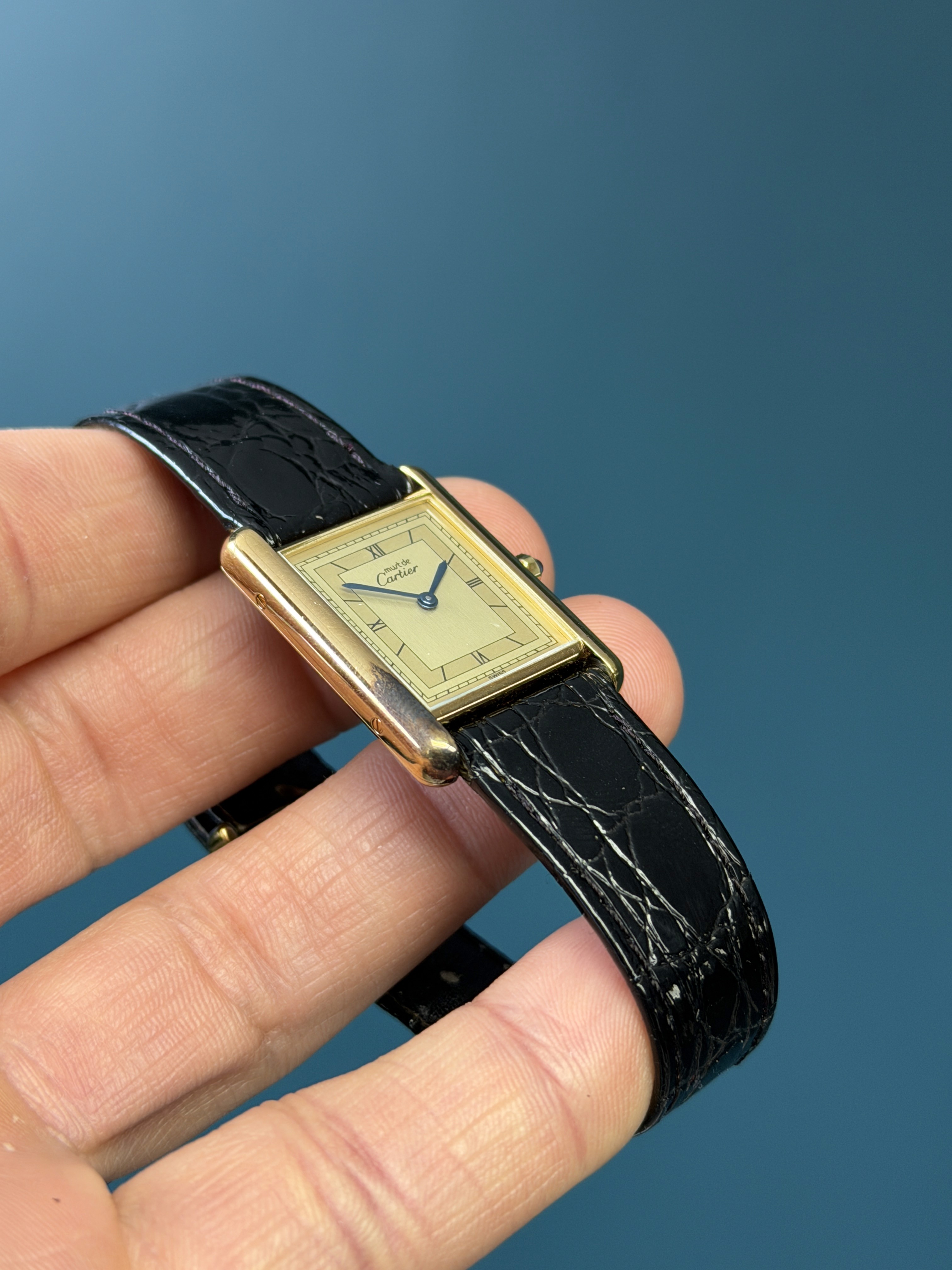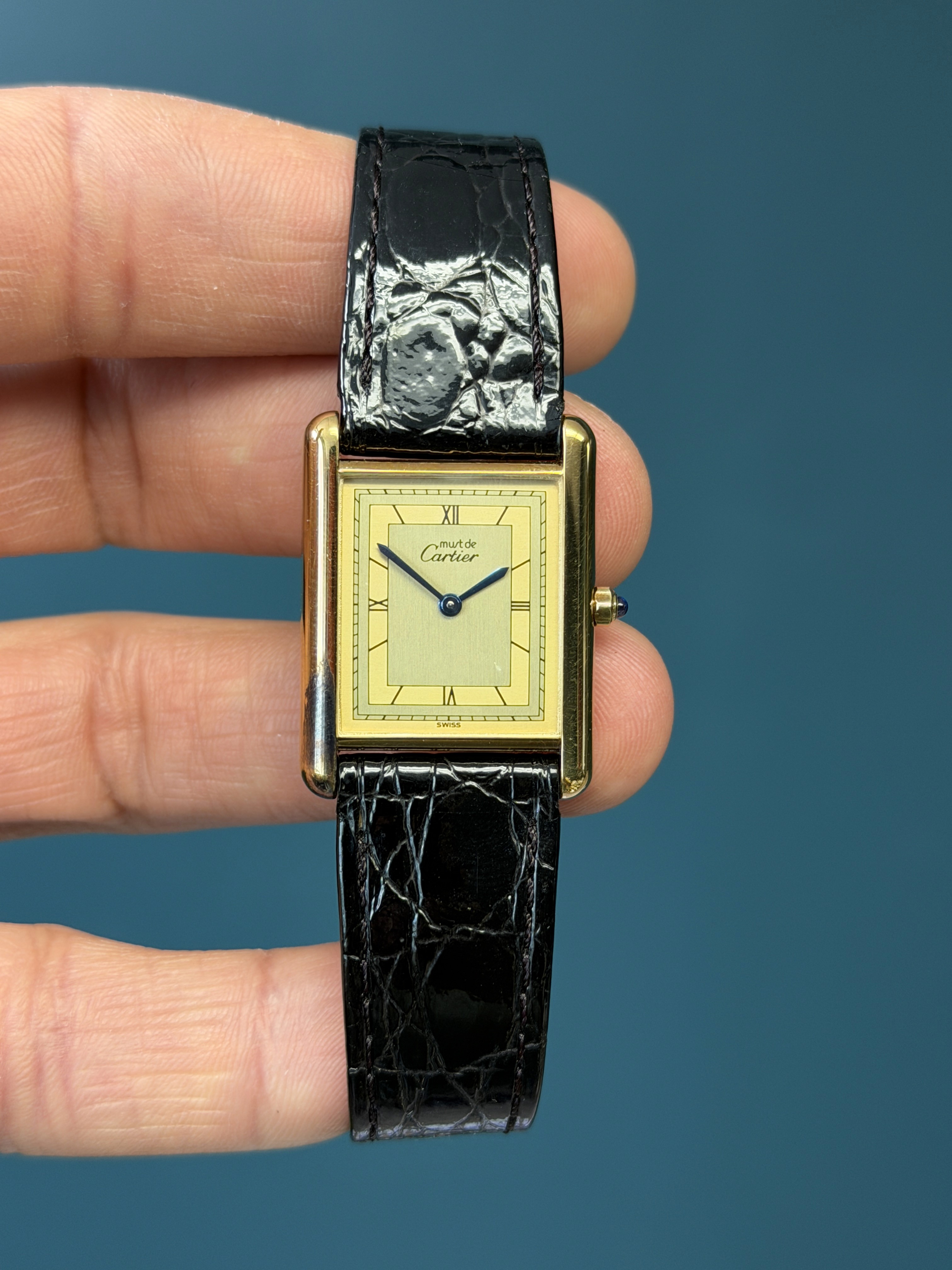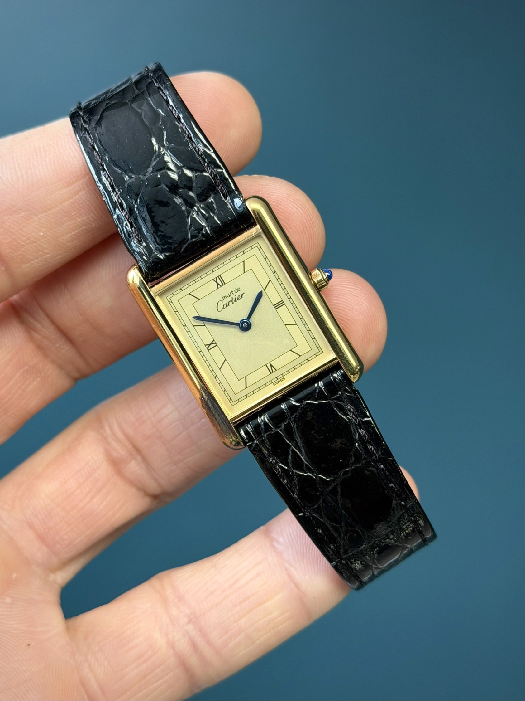 Introduced during the golden era of accessible luxury from Cartier, the Must de Cartier line brought the unmistakable Tank silhouette to a broader audience while maintaining the maison’s unmistakable aesthetic codes. This example embodies that heritage perfectly, with its classic rectangular case, clean dial design, and elegant proportions that have defined the Tank for generations.
