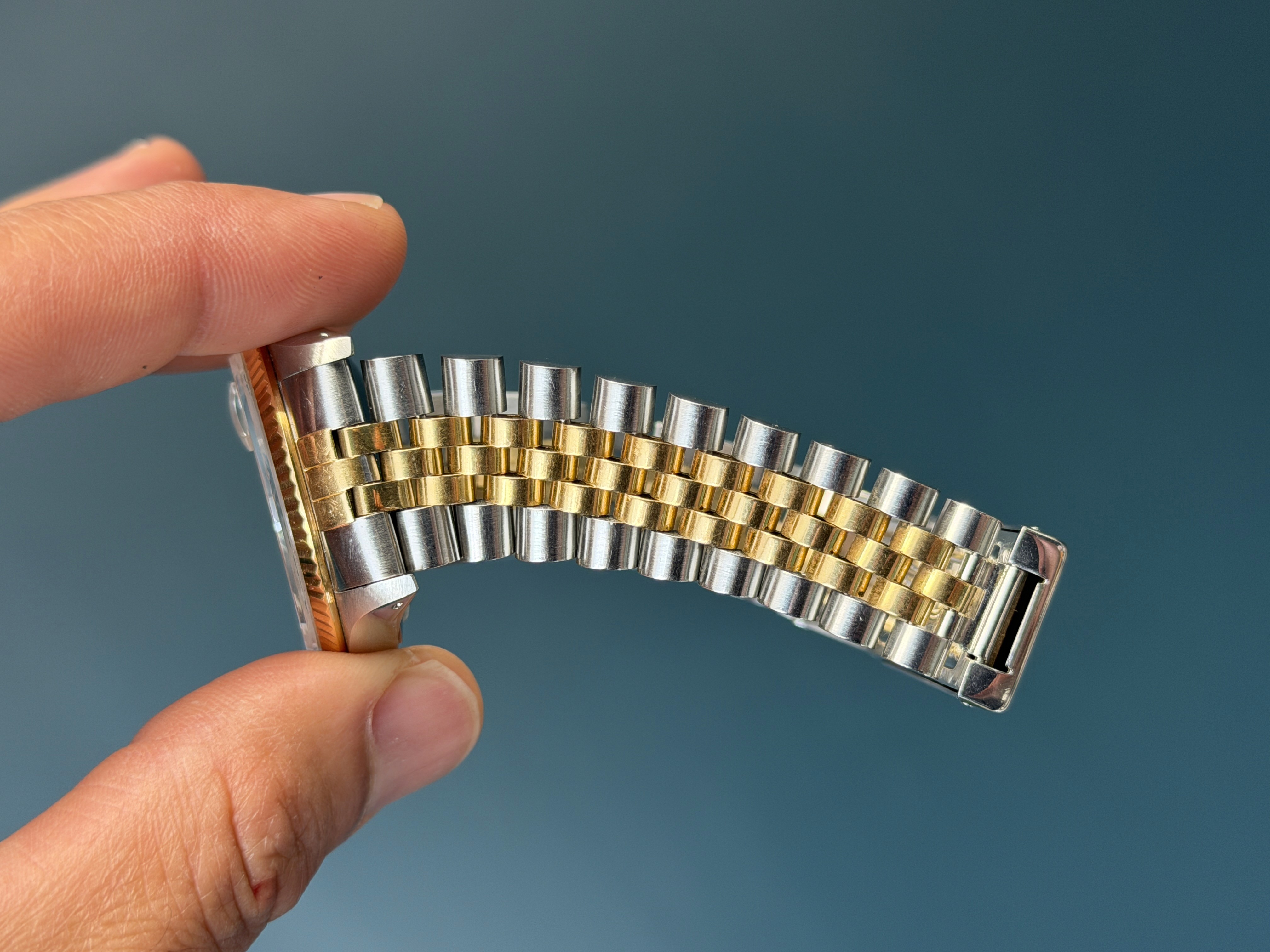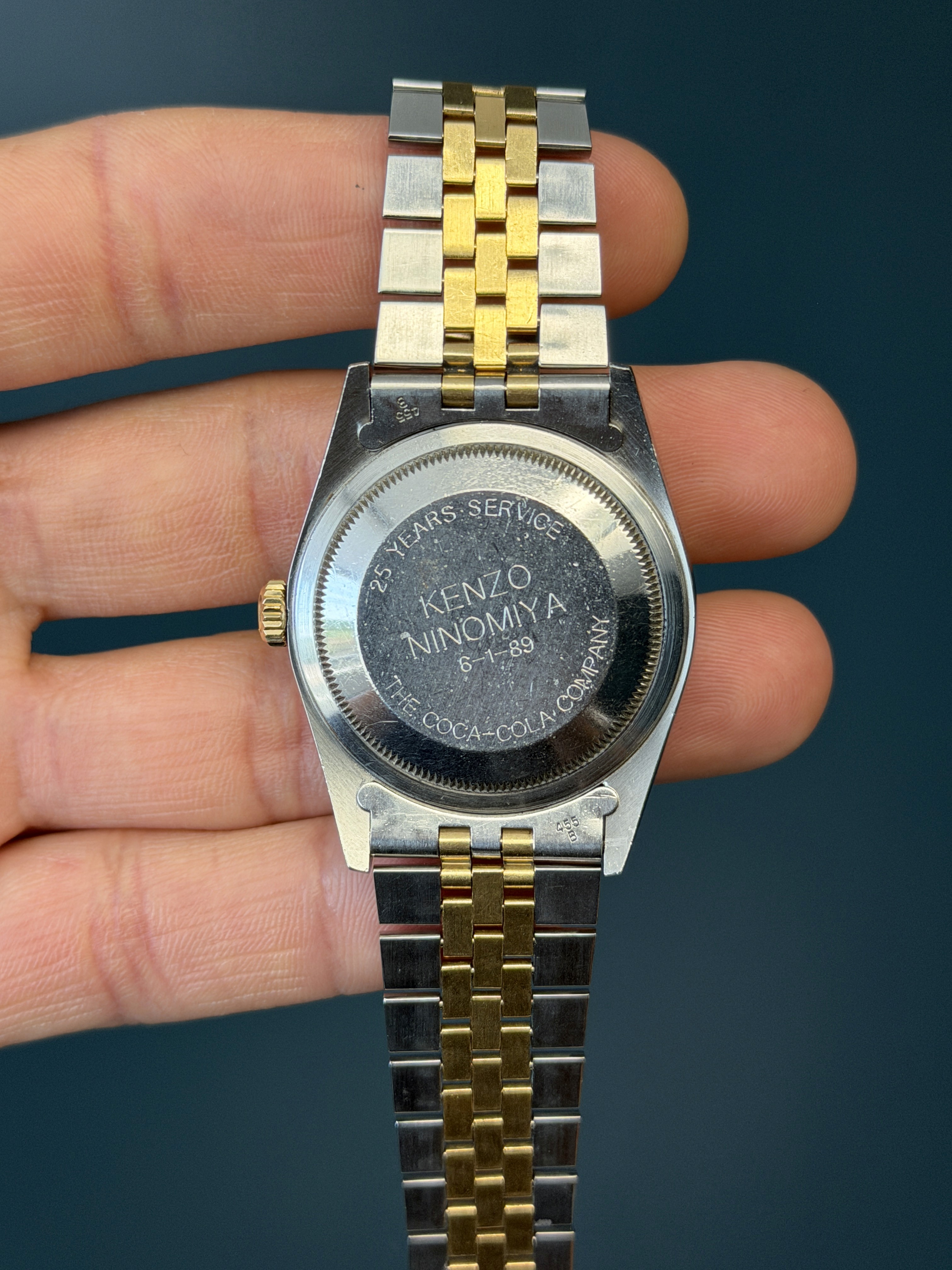This two-tone Date Just showcases a mint champ dial featuring a date display, exemplifying Rolex's commitment to precision and enduring style. This example is a Coca-Cola Company 25 years of Service watch which was given to employees for commitment of service to the company. This example comes to us unpolished with a razor sharp case. The Saphire crystal is free from wear partnered with its excellent yellow gold fluted bezel. The two-tone solid link jubilee bracelet has 5 removable screws and shows only minimal stretch. Watch is running and keeping time.
