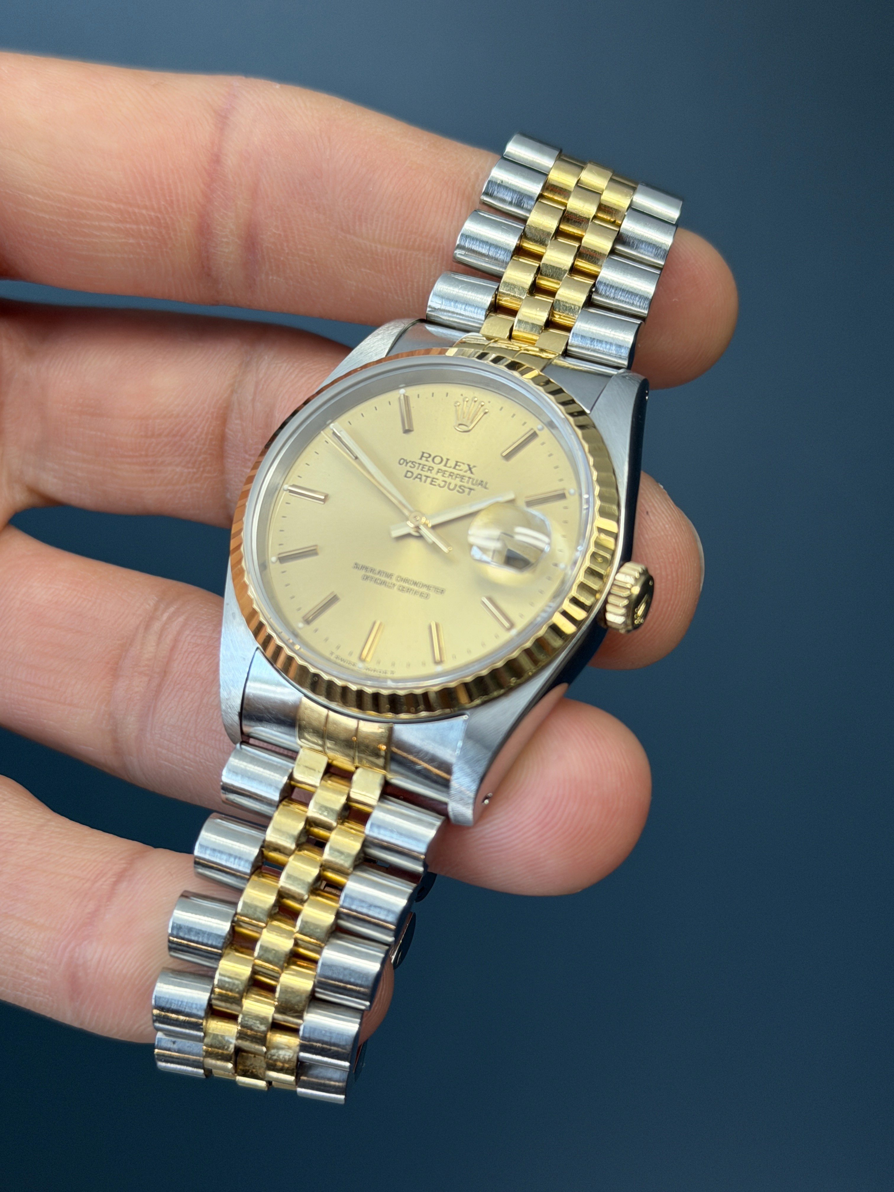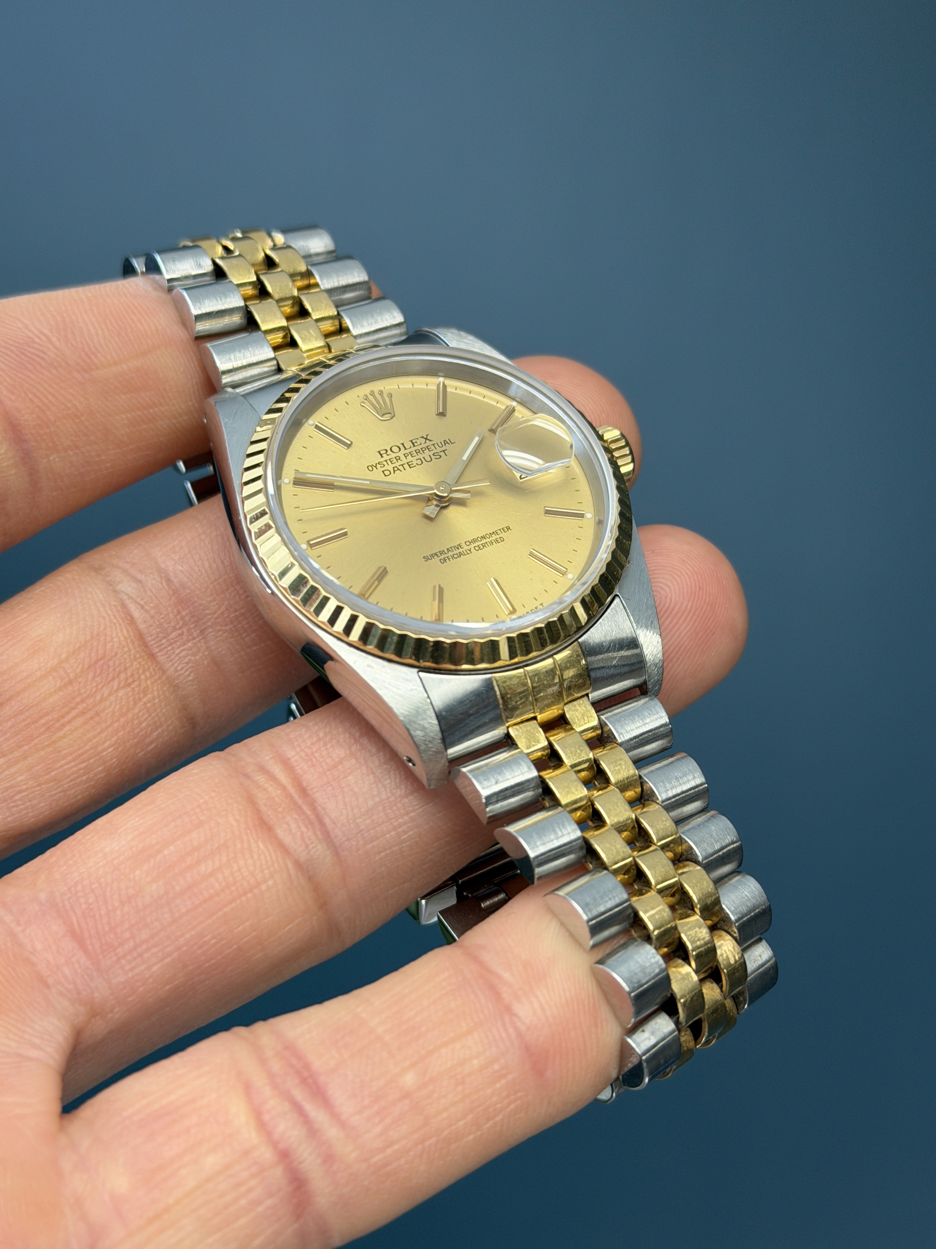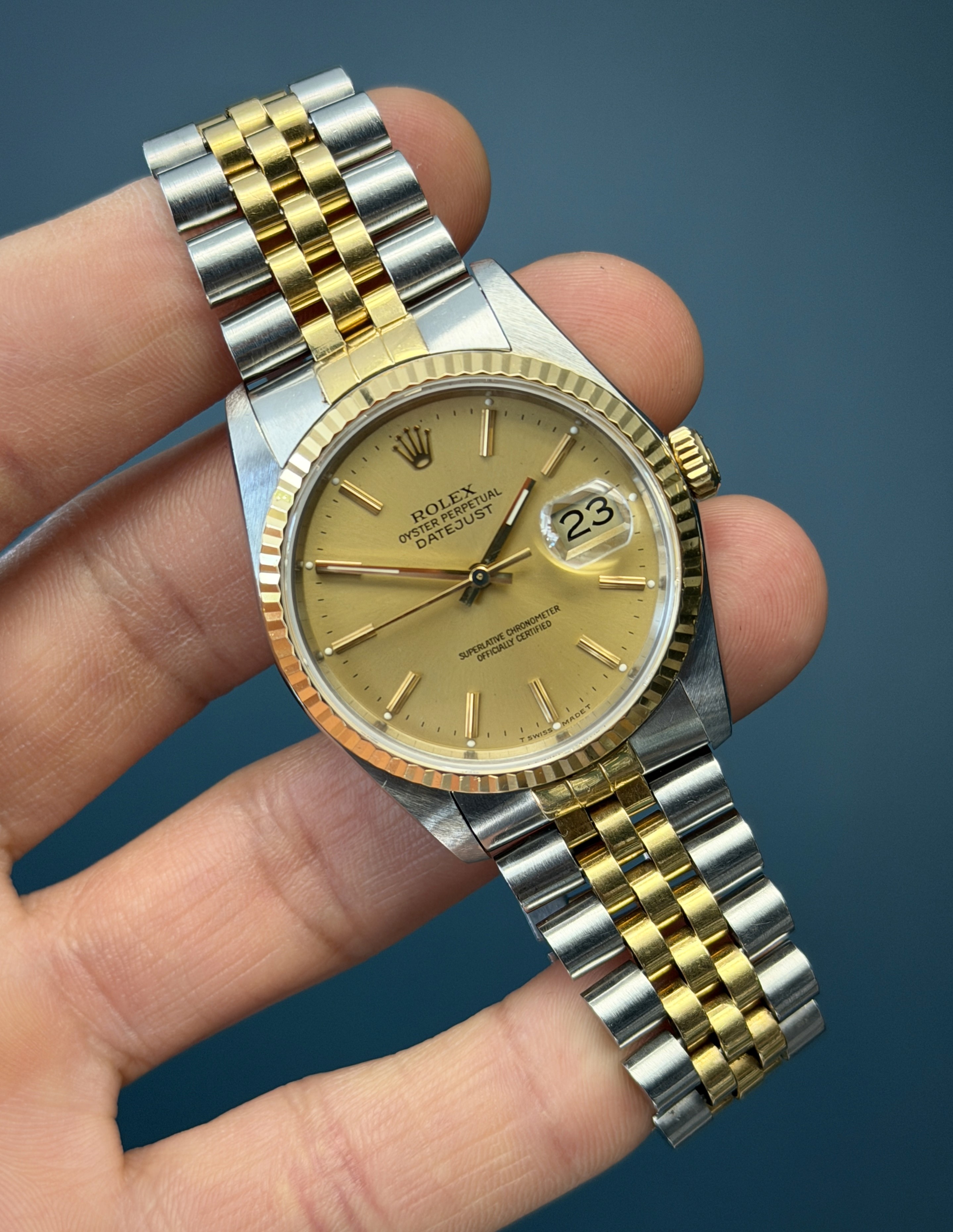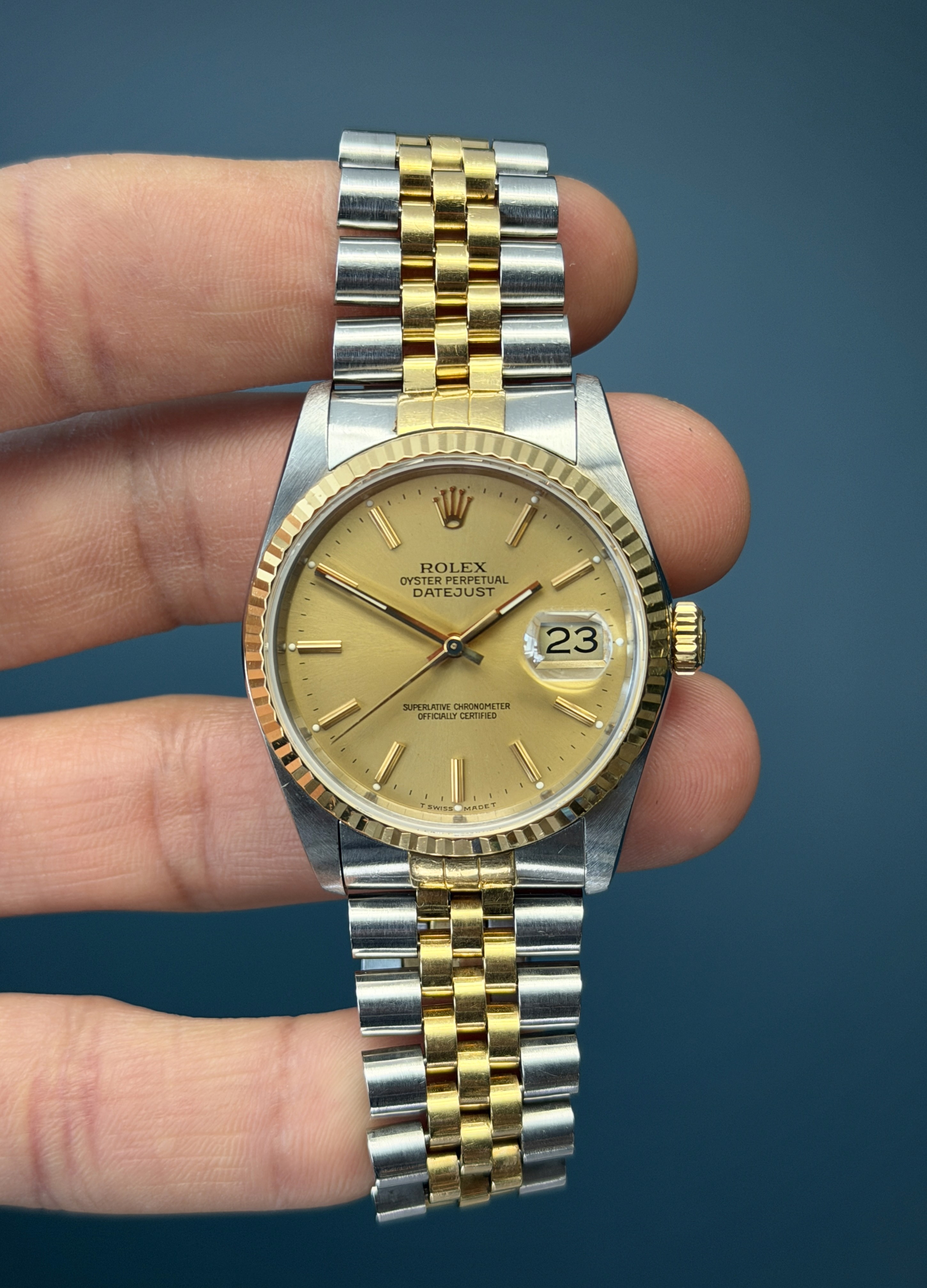 The Rolex Datejust Ref. 16233 is a timeless and elegant timepiece that epitomizes luxury and sophistication. This iconic wristwatch features a crisp champ dial, which adds a touch of opulence and refinement to its classic design. Encased in a beautifully polished stainless steel and 18k yellow gold combination, the watch seamlessly combines durability and style. With its signature Cyclops date magnification window and self-winding movement, the Rolex Datejust Ref. 16233 is not only a symbol of horological excellence but also a statement of timeless elegance for those who appreciate the finer things in life.
