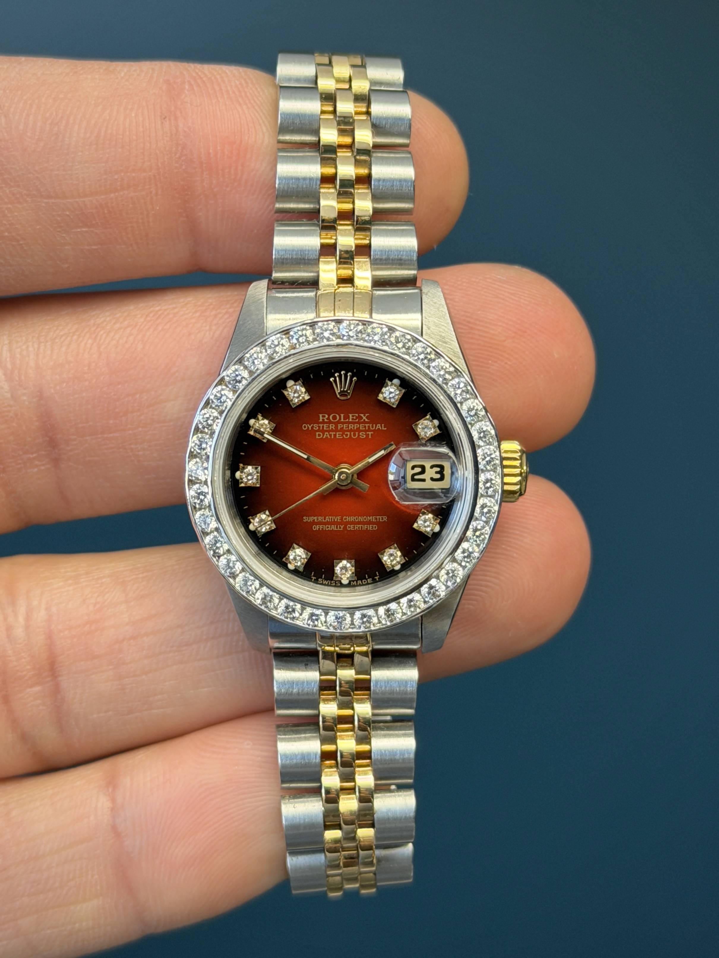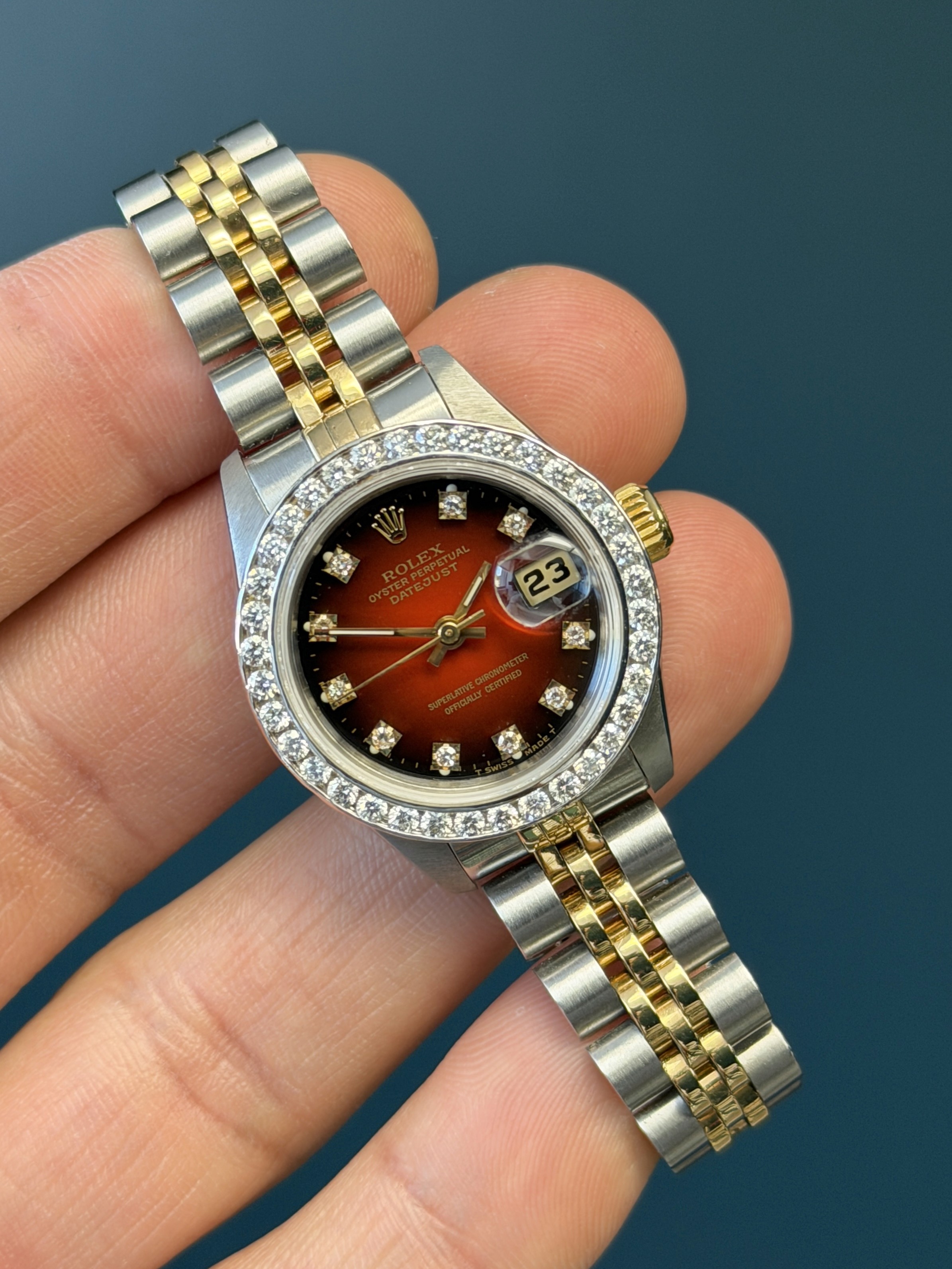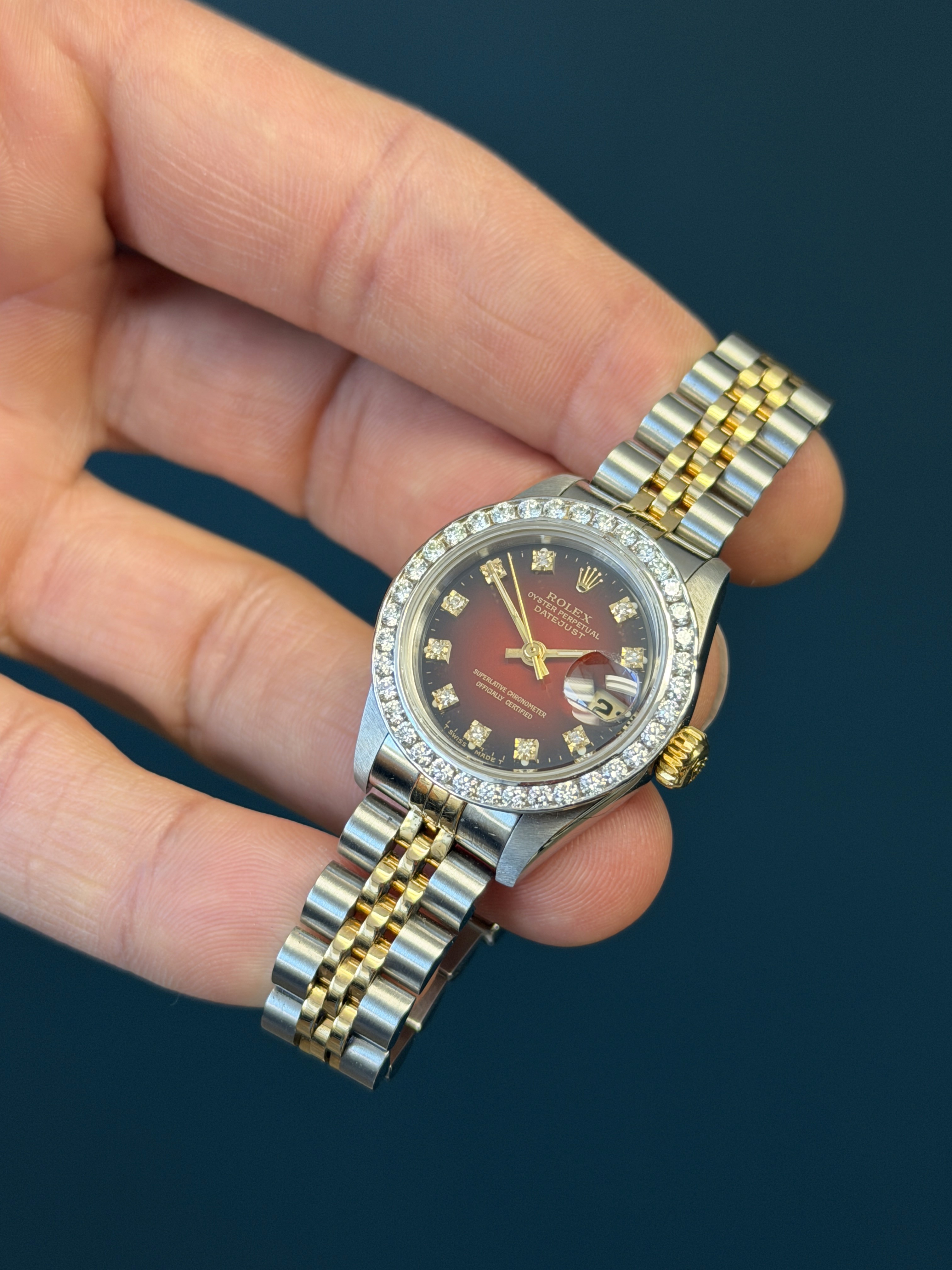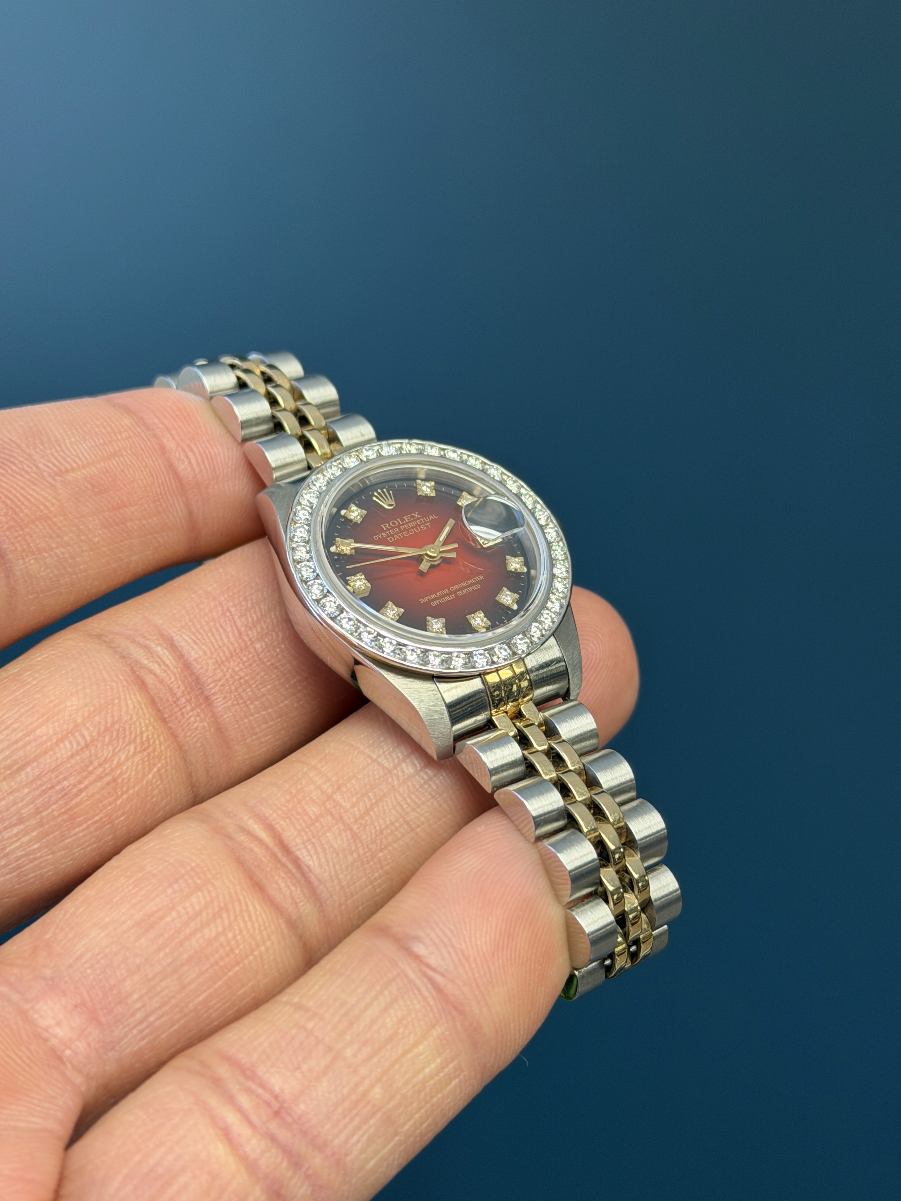 The highlight is a mint factory red vignette diamond dial—rich in tone with a captivating gradient effect—accented by brilliant diamond hour markers. A custom diamond bezel adds extra presence and sparkle, complementing the dial beautifully. The original two-tone Jubilee bracelet remains in top condition with no stretch and includes three removable links for sizing.
