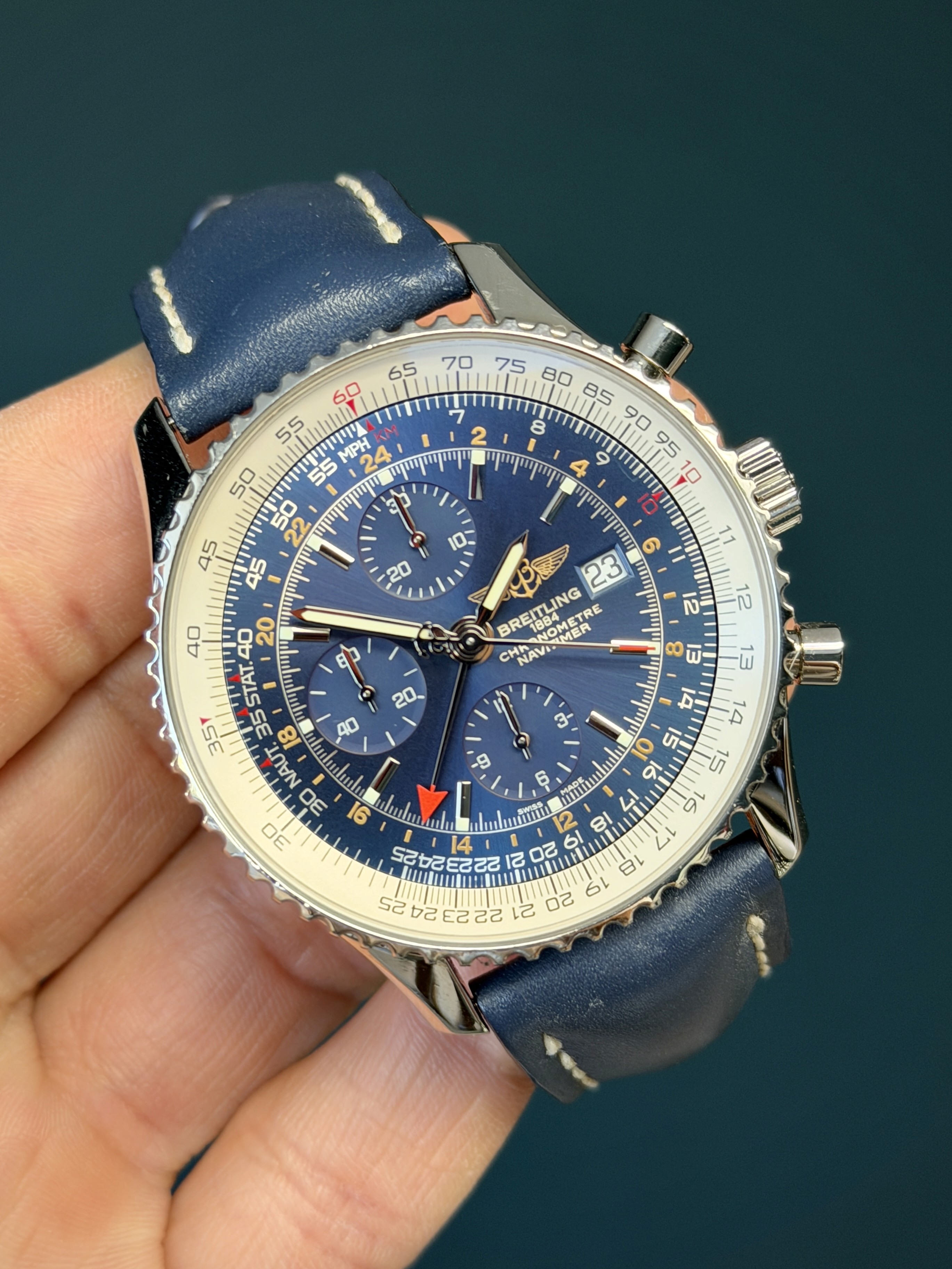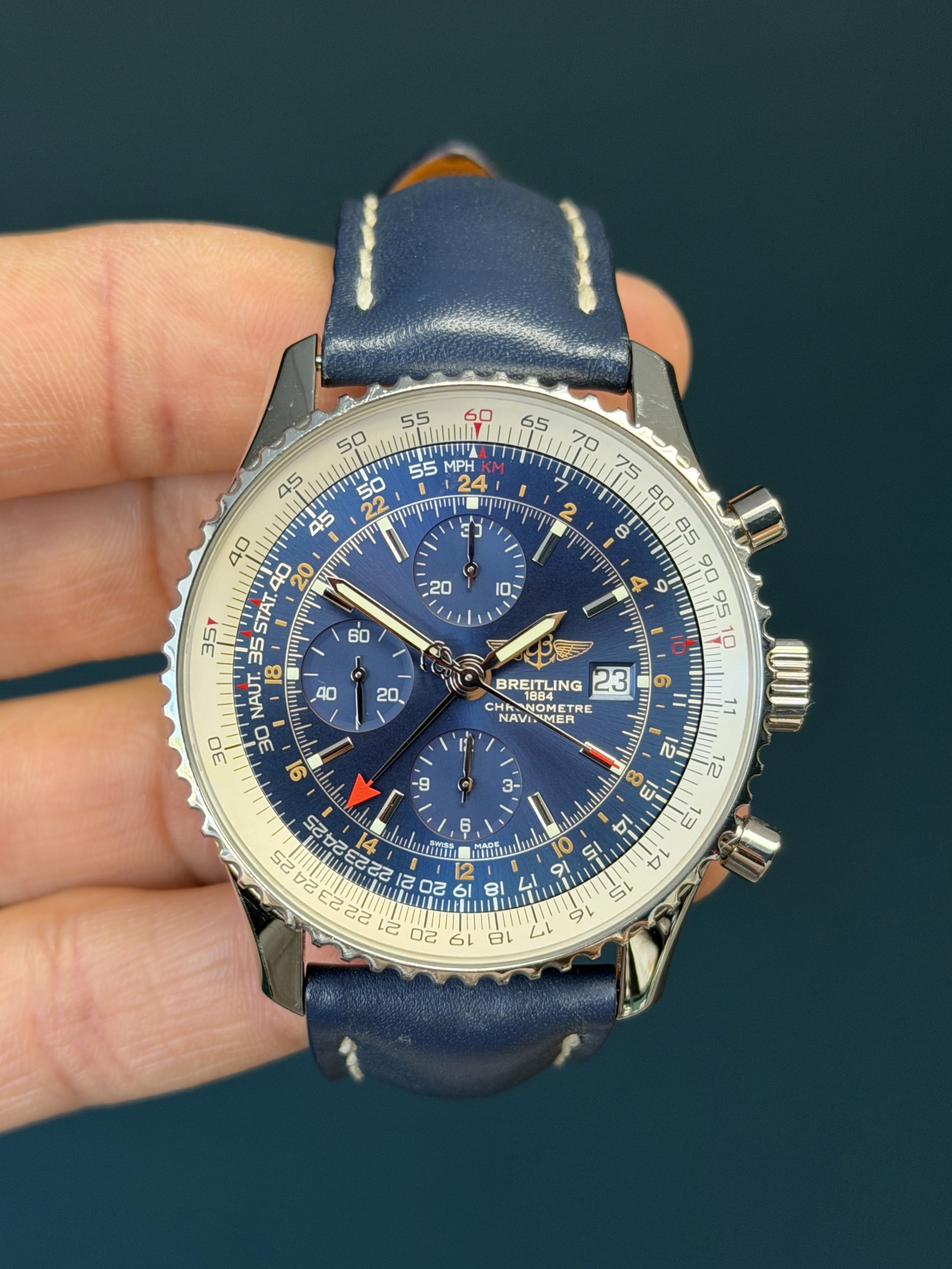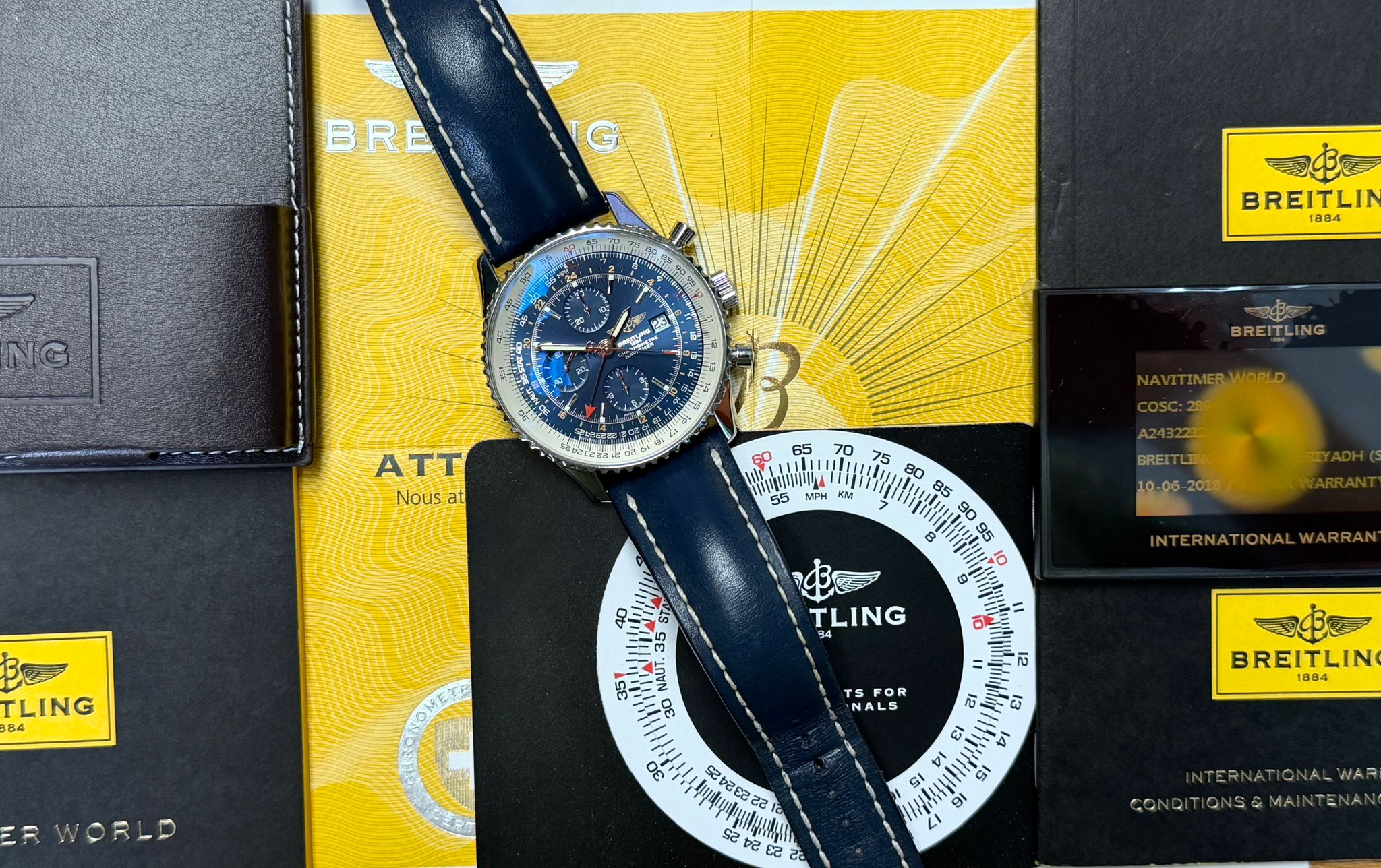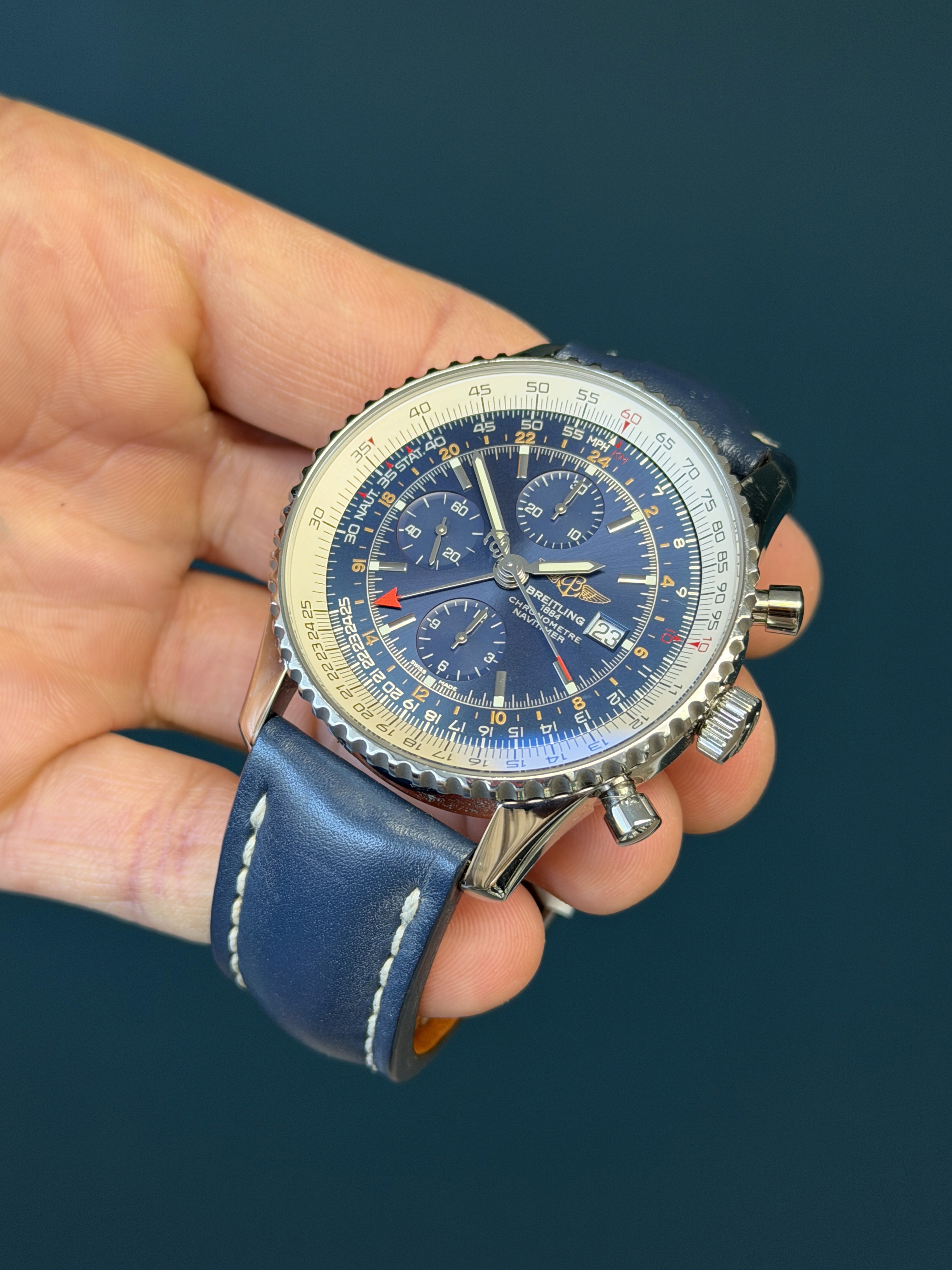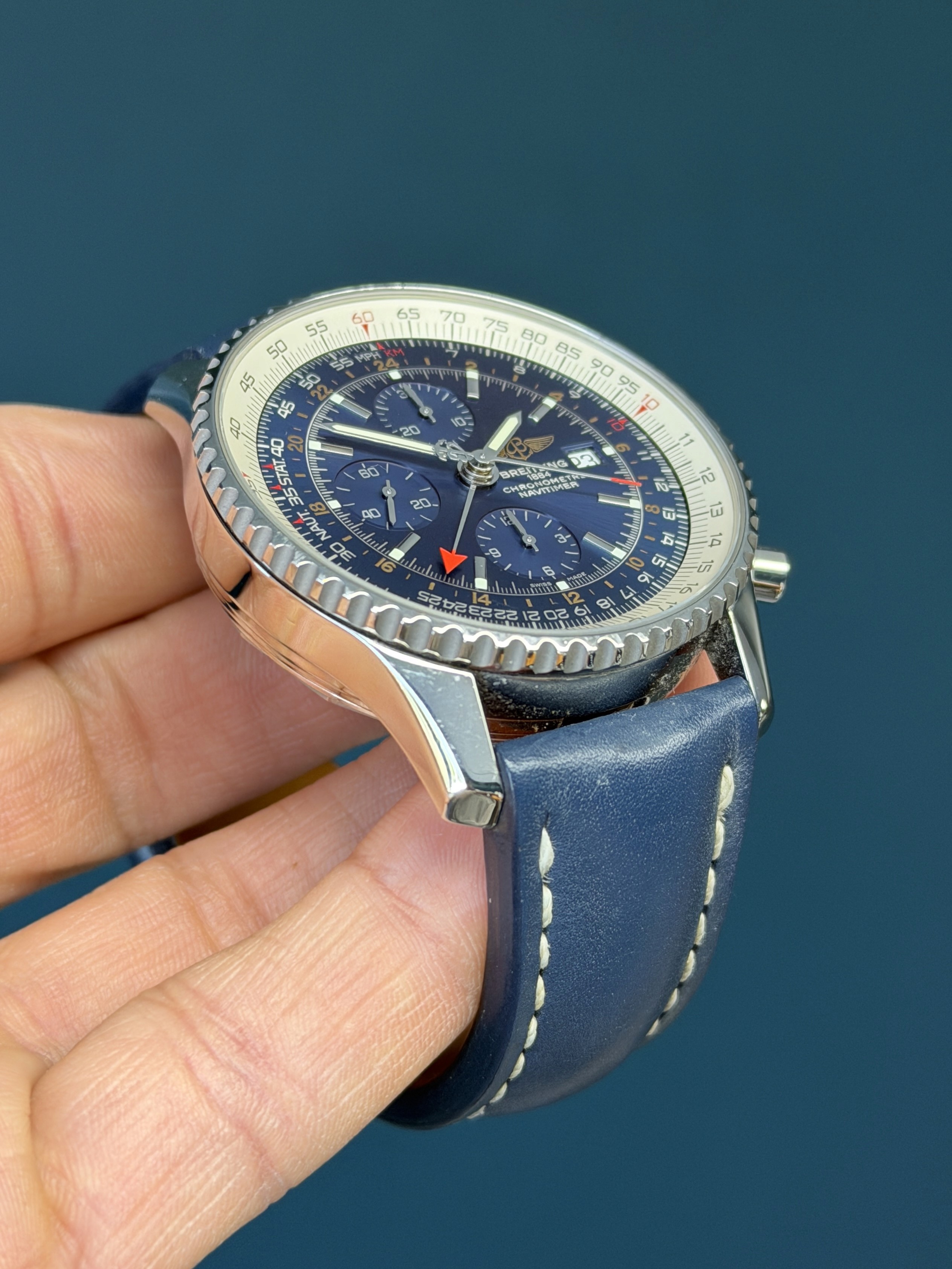 A timeless aviation classic with global capability, this Navitimer World GMT delivers both presence and performance in one distinguished package.
