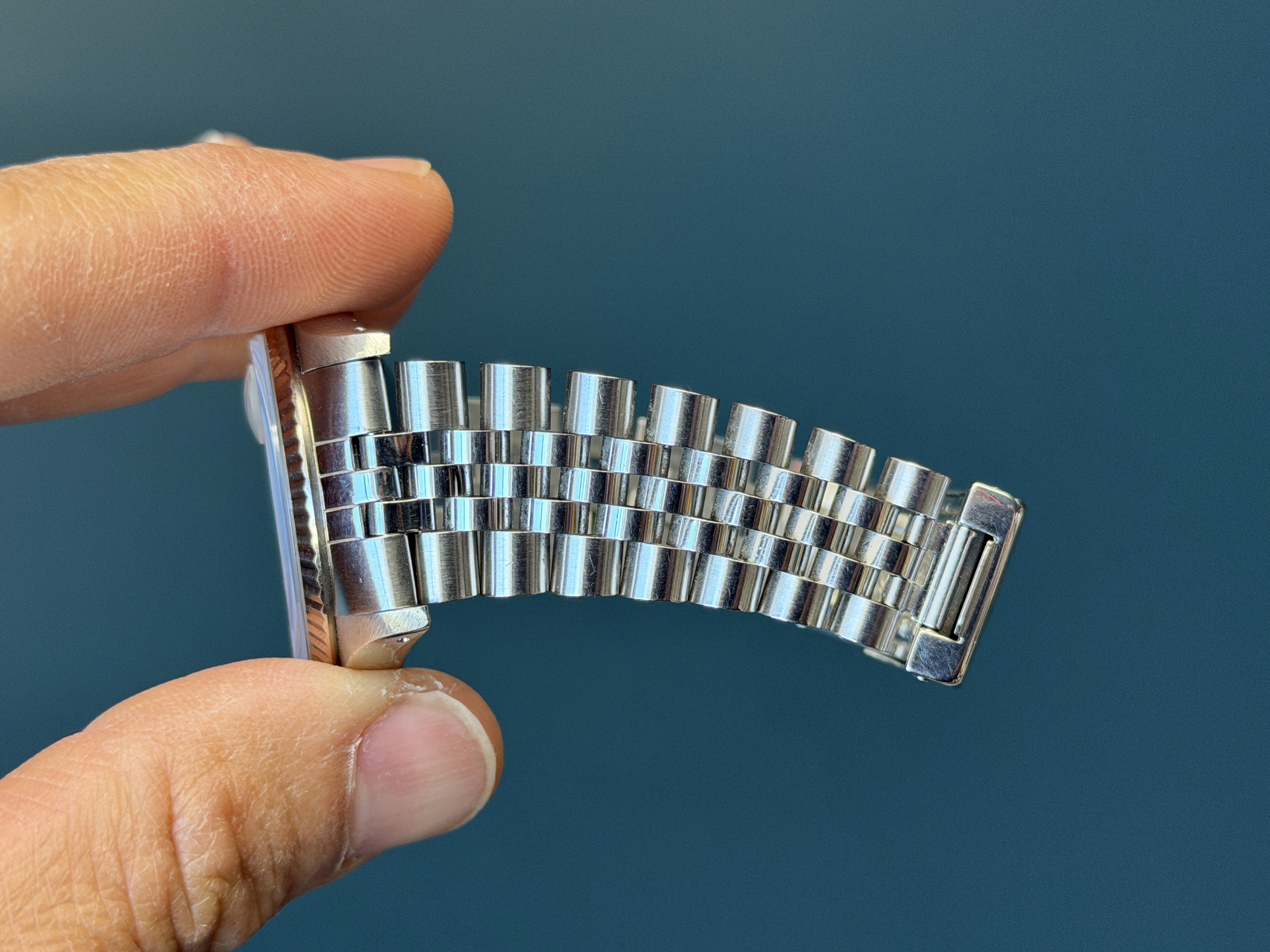 This example is in excellent condition. The case is sharp with sharp crisp lugs. The rare white Porcelain Roman dial is excellent showing no wear with beautiful white tones. The jubilee bracelet has 2 removable screws with no stretch. This example is running COSC and has an excellent aesthetic appearance in stud condition ready to go!