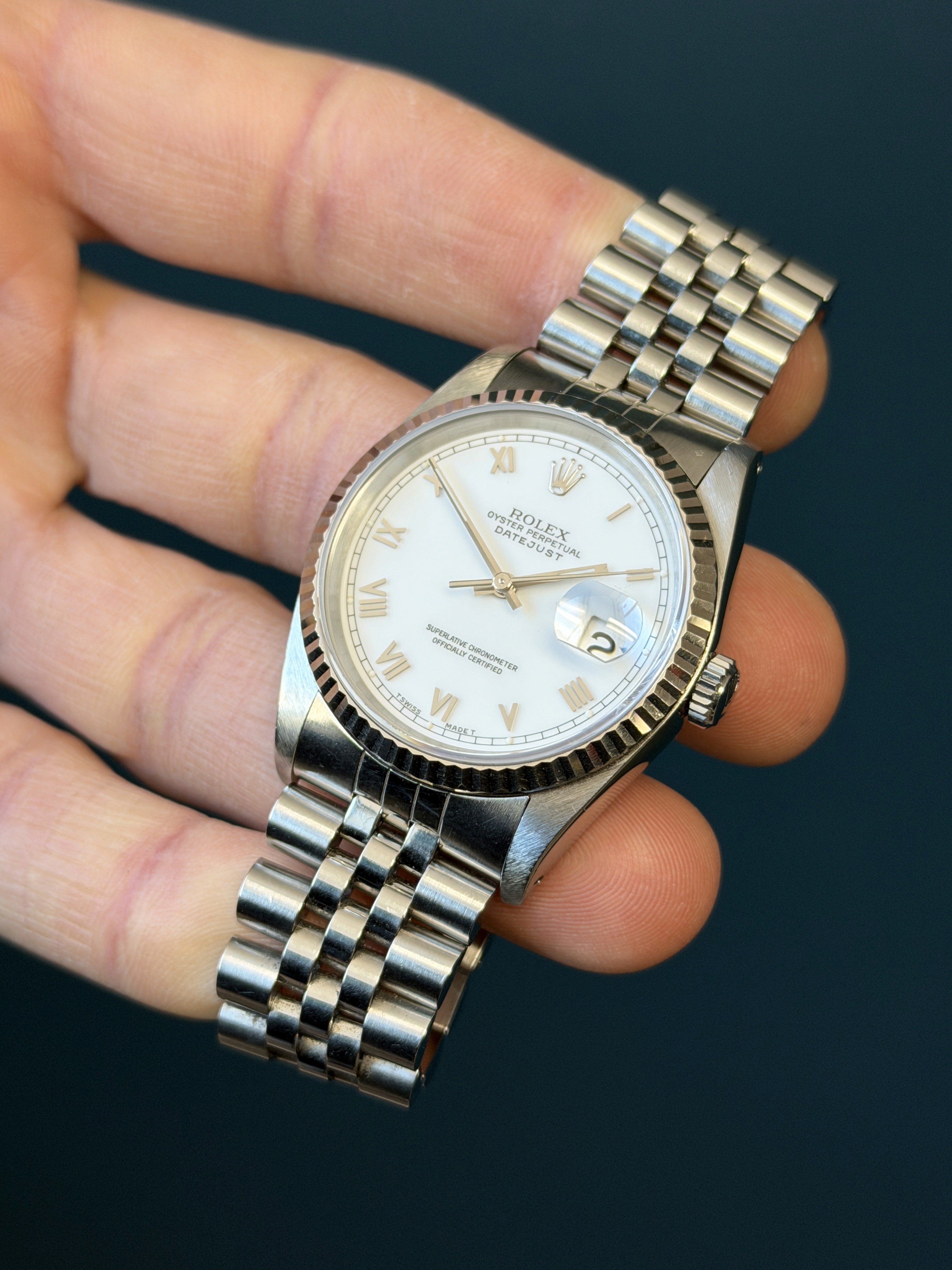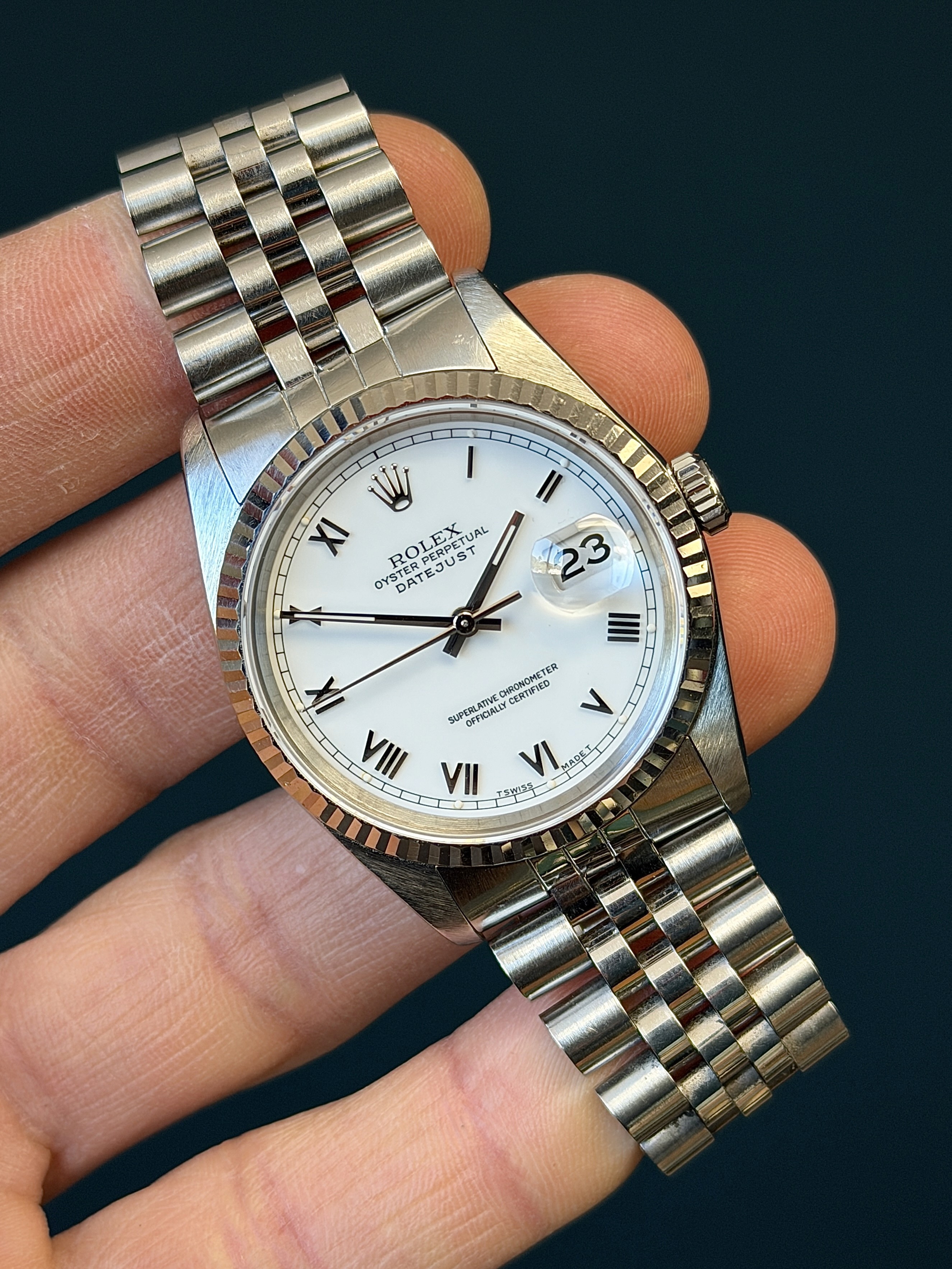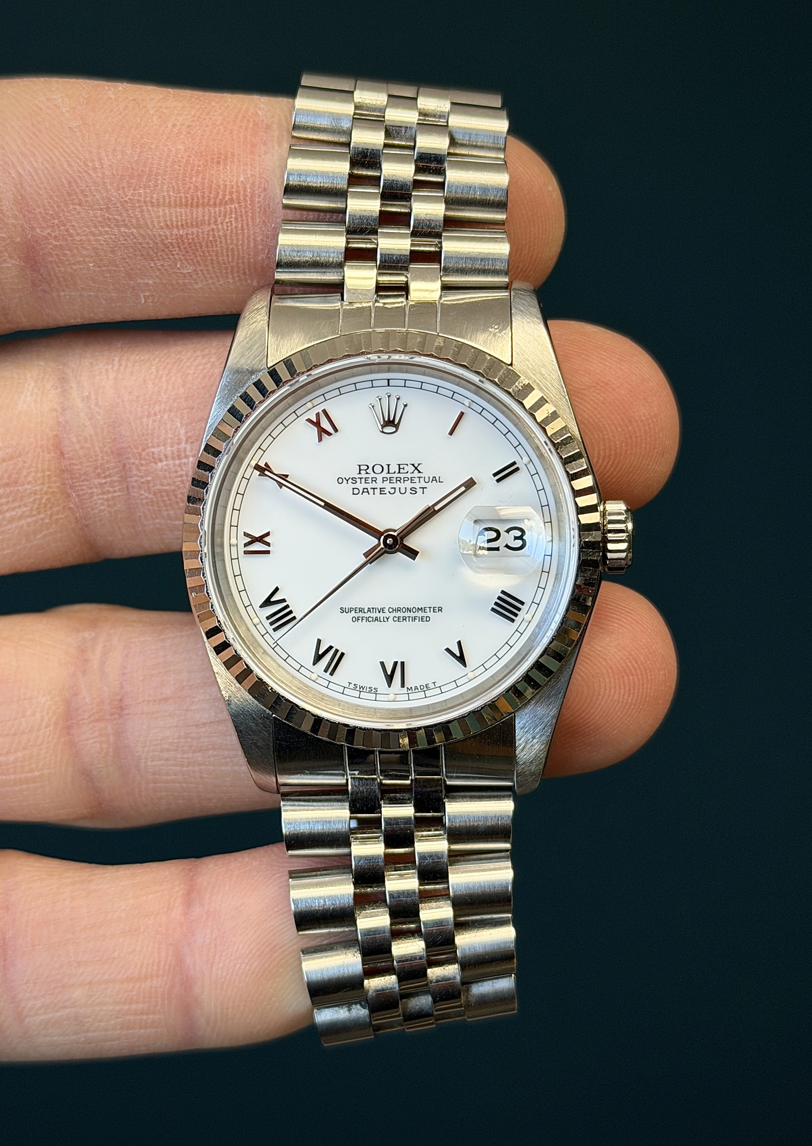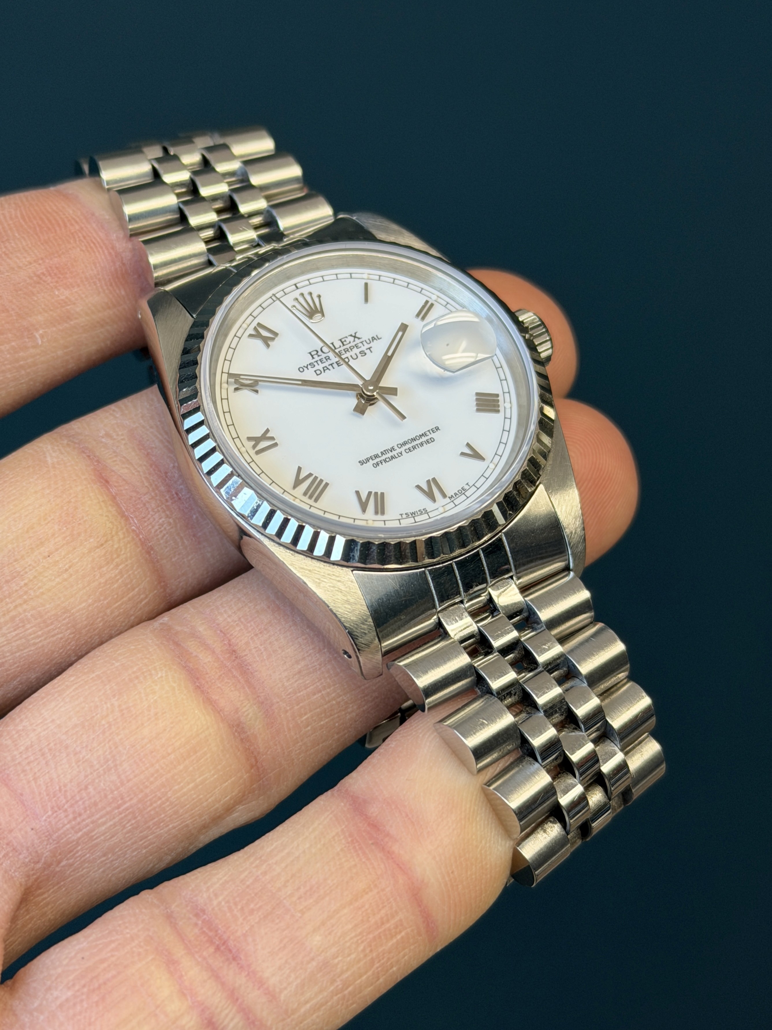 The Rolex Datejust reference 16234 is a timeless and iconic timepiece renowned for its elegant design and precision engineering. With a classic White gold bezel and holes stainless steel case measuring 36mm in diameter, this watch exudes understated luxury suitable for any occasion. Its dial features a rare Porcelain Roman dial and a date window at the 3 o'clock position, enhanced by the iconic Cyclops lens for magnified legibility. Powered by Rolex's reliable self-winding mechanical movement, the Datejust 16234 promises exceptional accuracy and durability. Finished with a stainless steel Jubilee bracelet , this watch epitomizes the perfect balance between sophistication and functionality, making it a cherished companion for all.