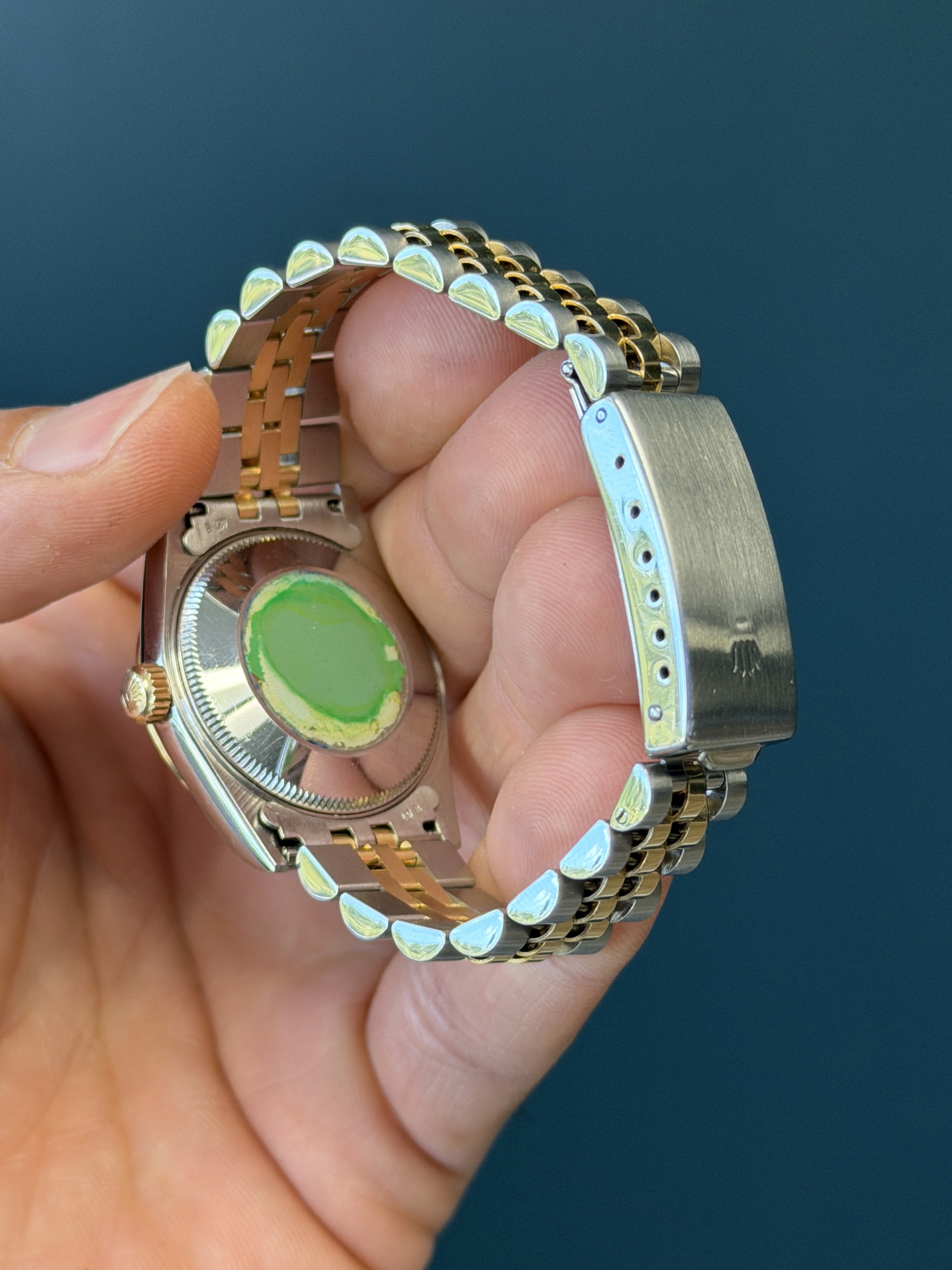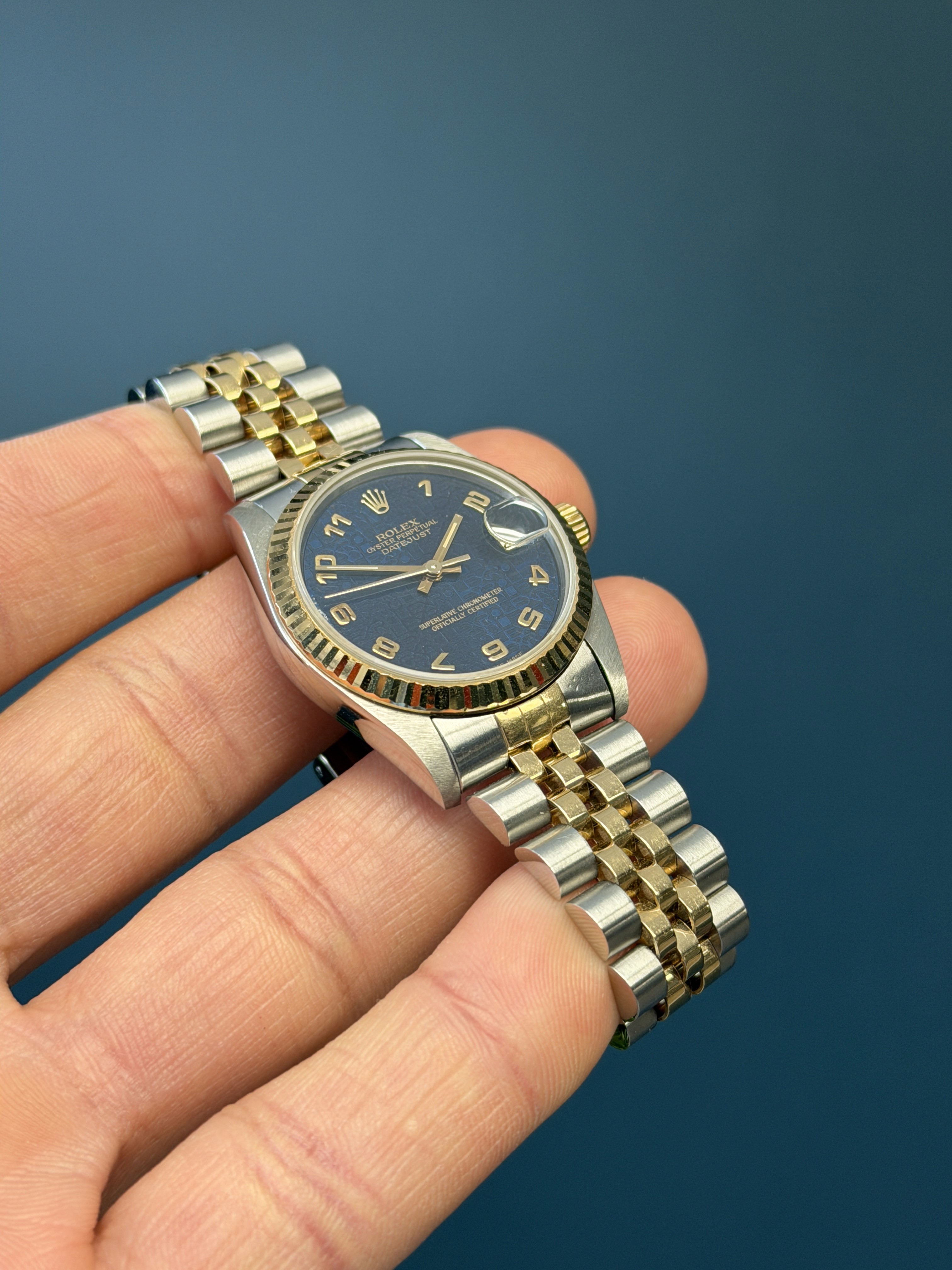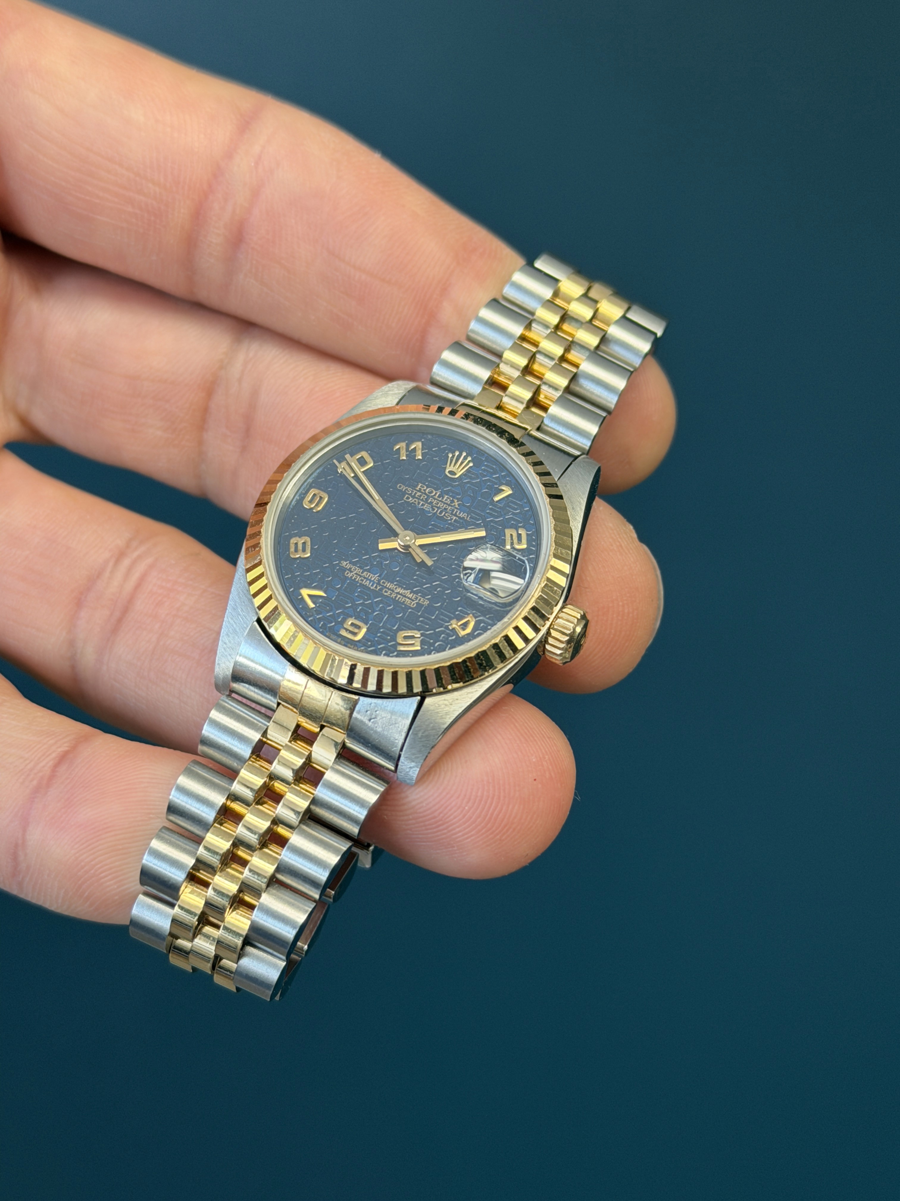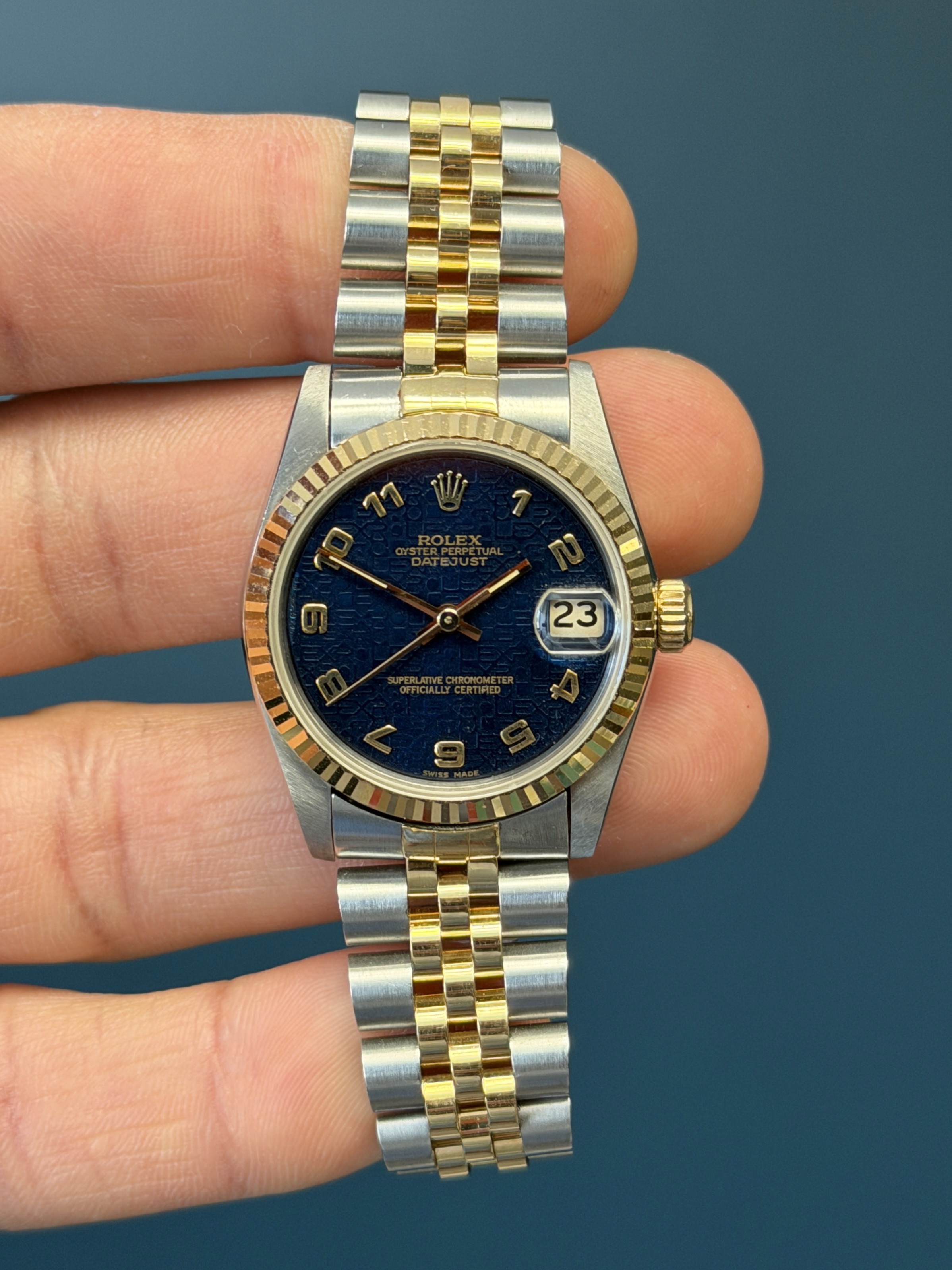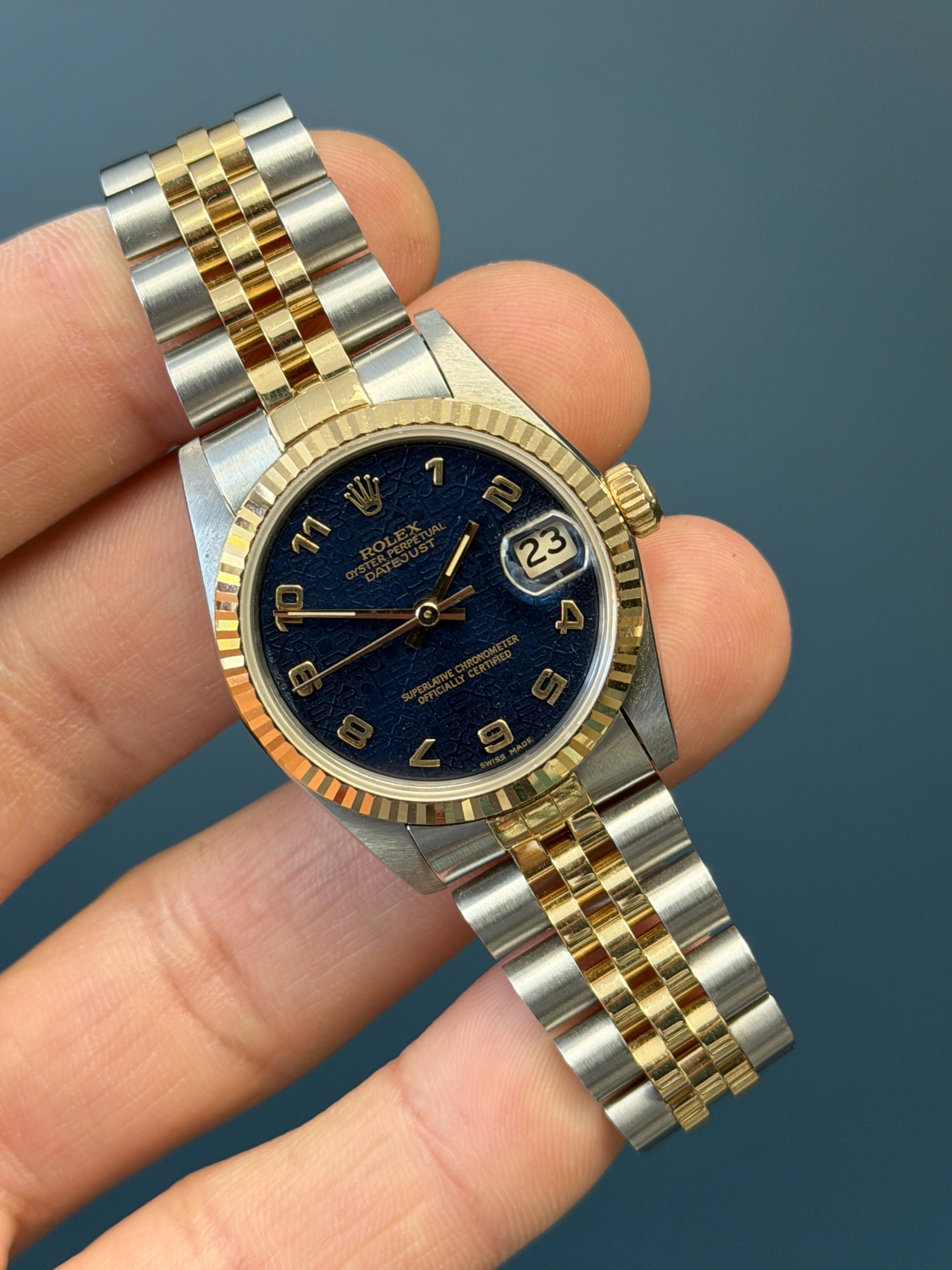 The Rolex Datejust Ref. 68273 is a timeless midsize classic, combining stainless steel and 18k yellow gold in Rolex’s signature Rolesor construction. Its 31mm Oyster case is complemented by a fluted gold bezel and the iconic Jubilee bracelet, offering both elegance and everyday comfort.