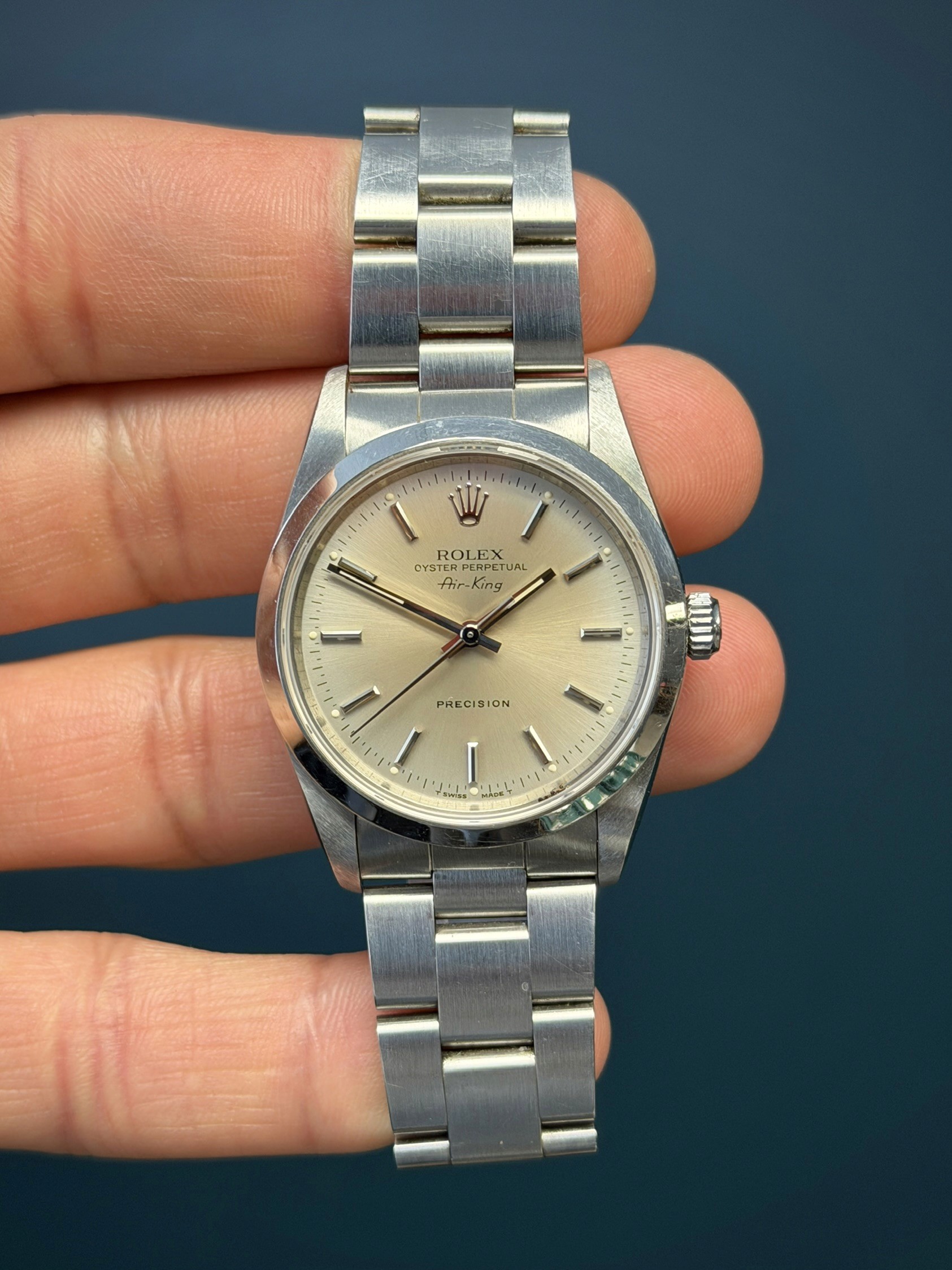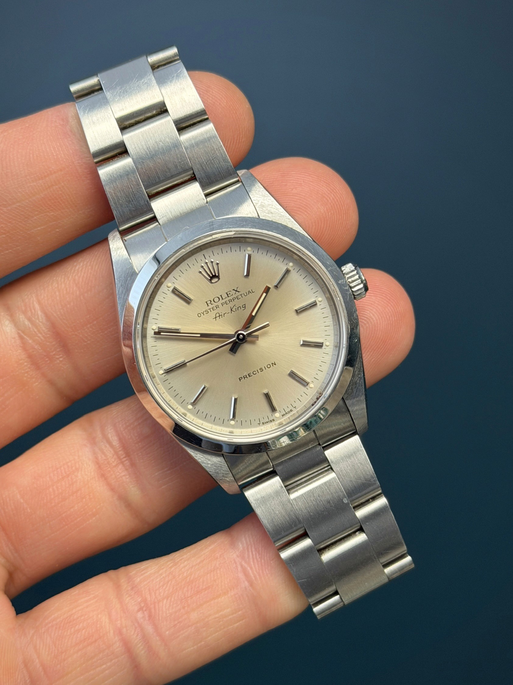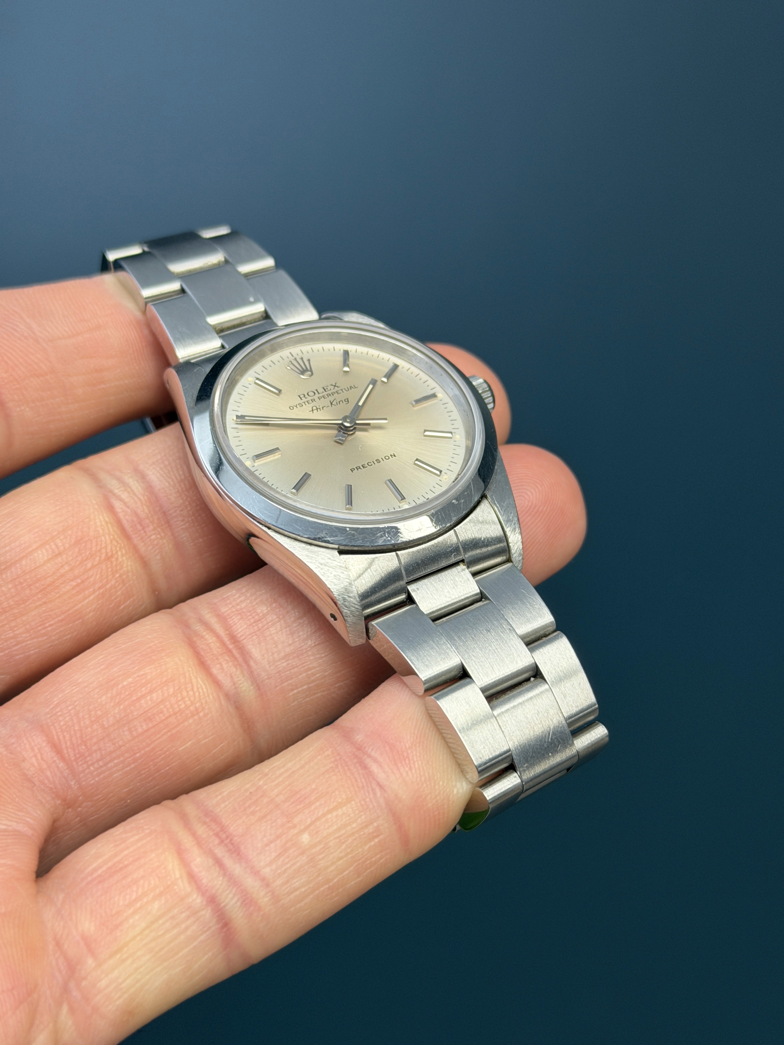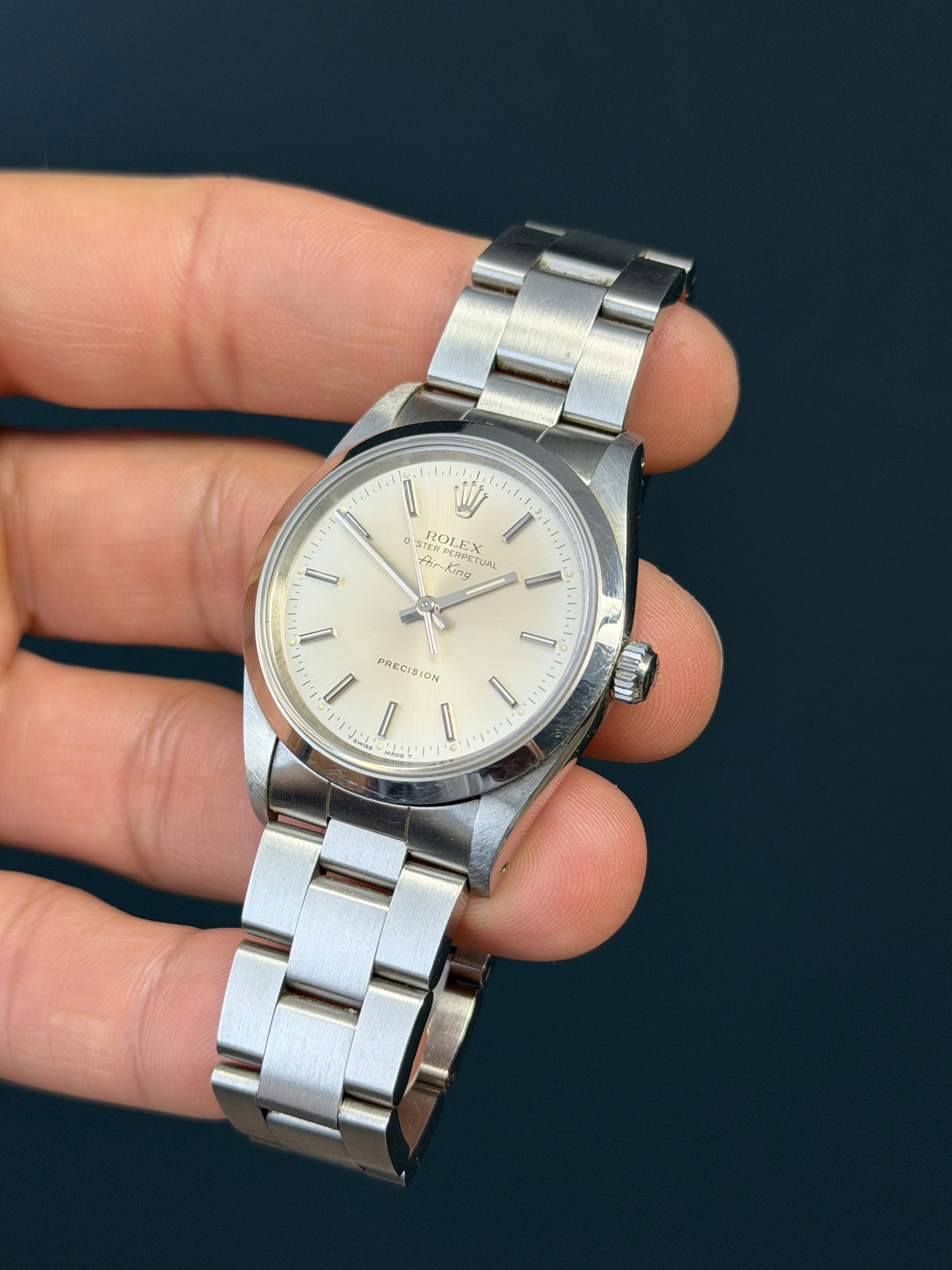 The Rolex Oyster Perpetual Air-King Reference 14000 with a Salmon pink toned tropical Dial is a stunning example of Rolex's commitment to timeless elegance and superior craftsmanship. This exquisite timepiece features a 34mm stainless steel case, perfectly balanced for both comfort and style. The unique tropical salmon-colored dial adds a touch of sophistication, beautifully contrasted by the sleek, minimalist design and luminous hour markers. Powered by the reliable Rolex Caliber 3000 automatic movement, the Air-King 14000 guarantees precise timekeeping and robust performance. The smooth bezel and classic Oyster bracelet enhance its refined aesthetic, making it suitable for any occasion. This particular model, with its rare and captivating tropical salmon toned dial, stands out as a distinctive and highly sought-after addition to any watch collection, embodying the perfect blend of tradition and modernity.