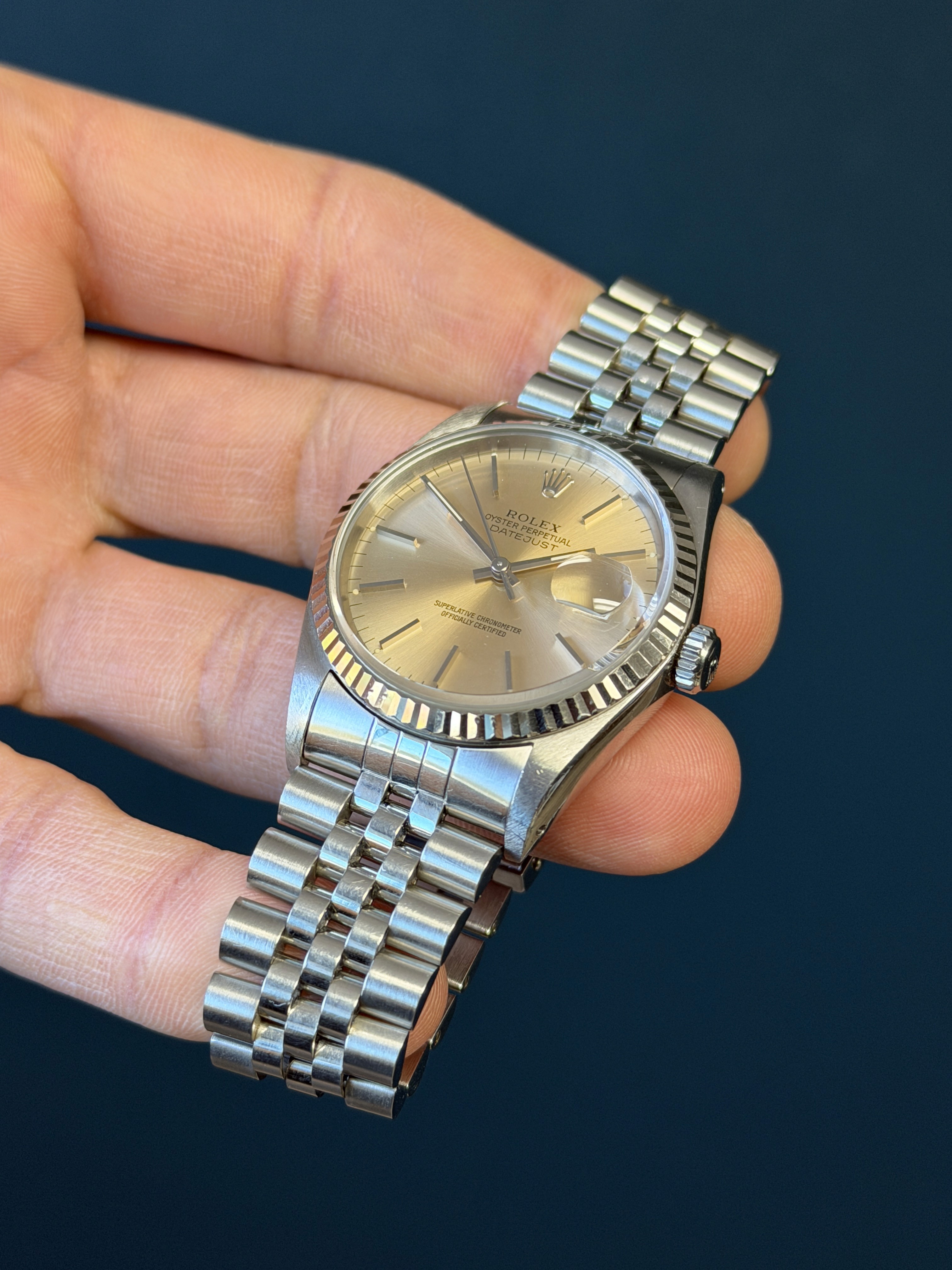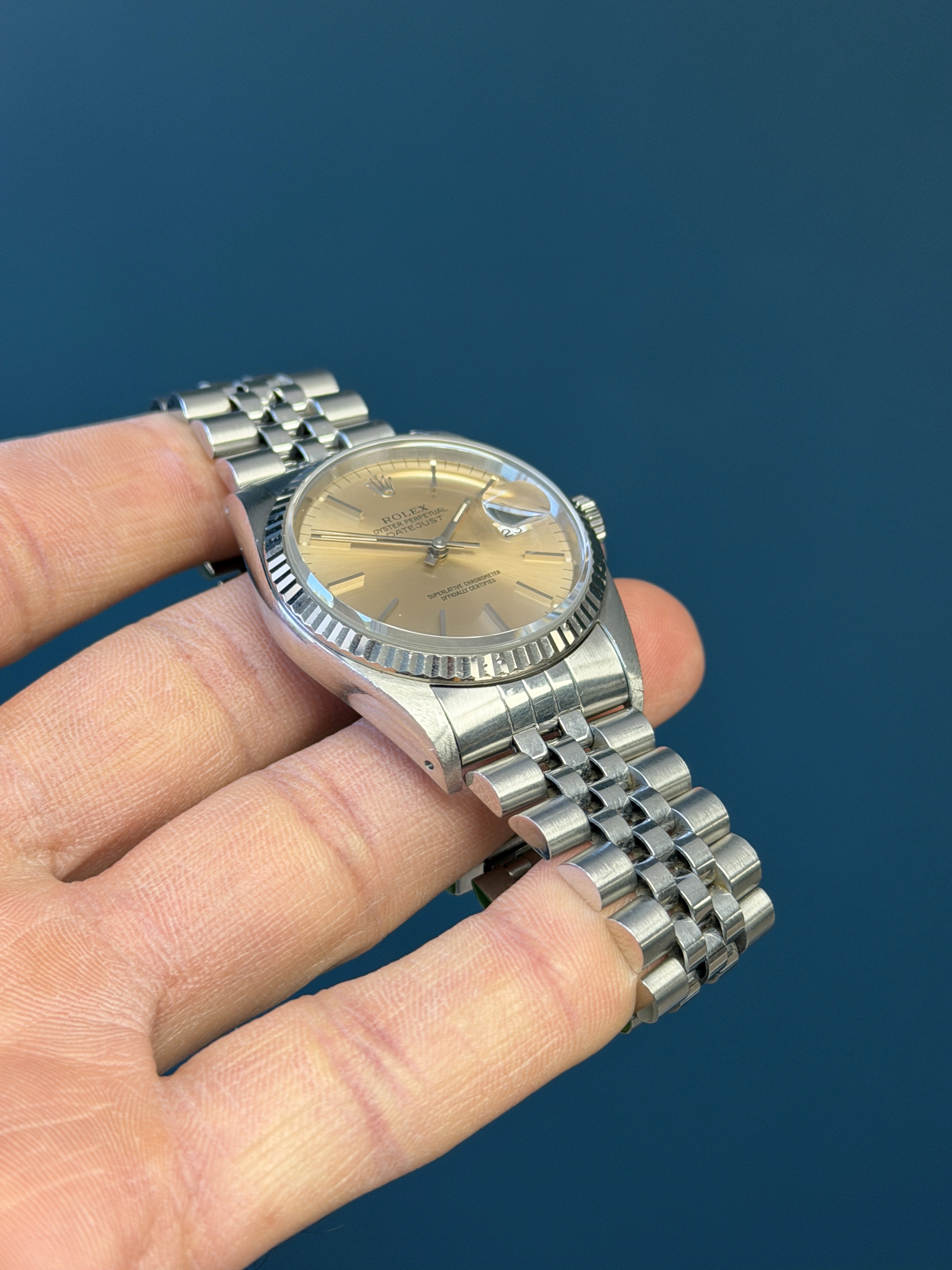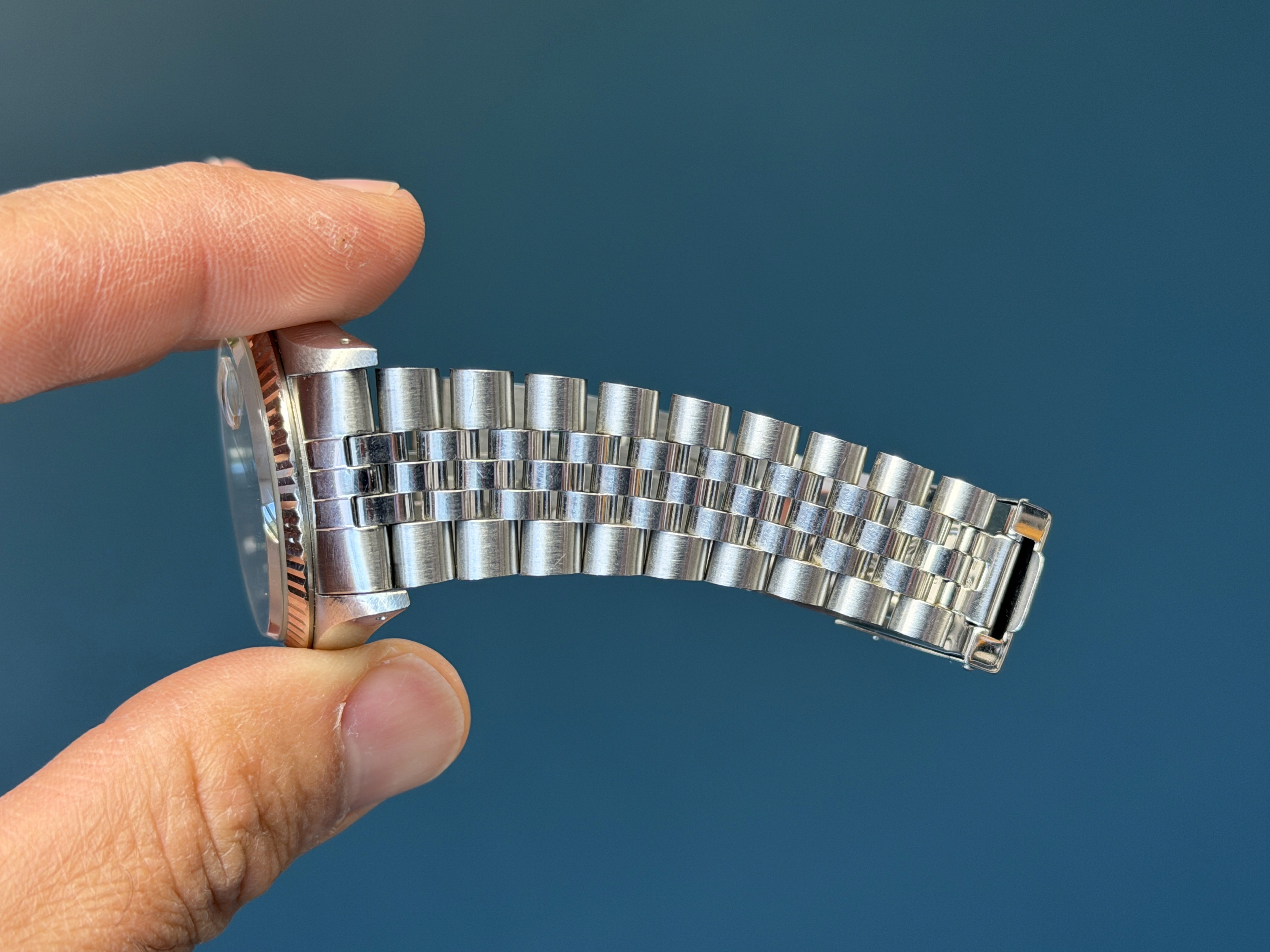 This example is in excellent condition with a sharp holes case with thick lugs. The "Pink" toned Tropical dial is excellent showing no wear, and presents even toning throughout. The jubilee bracelet is long and shows minimal stretch. This example is running COSC and has an excellent aesthetic appearance.