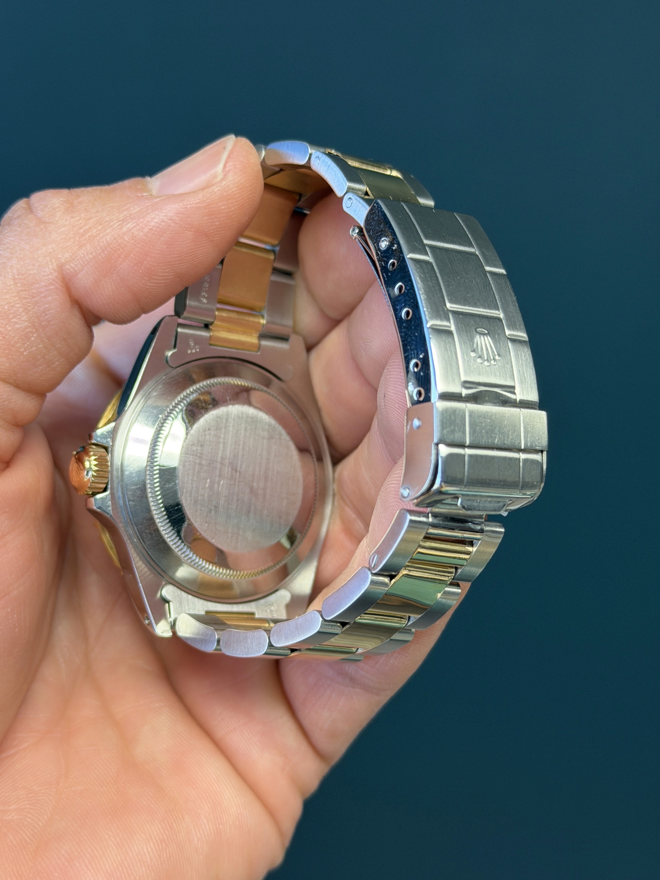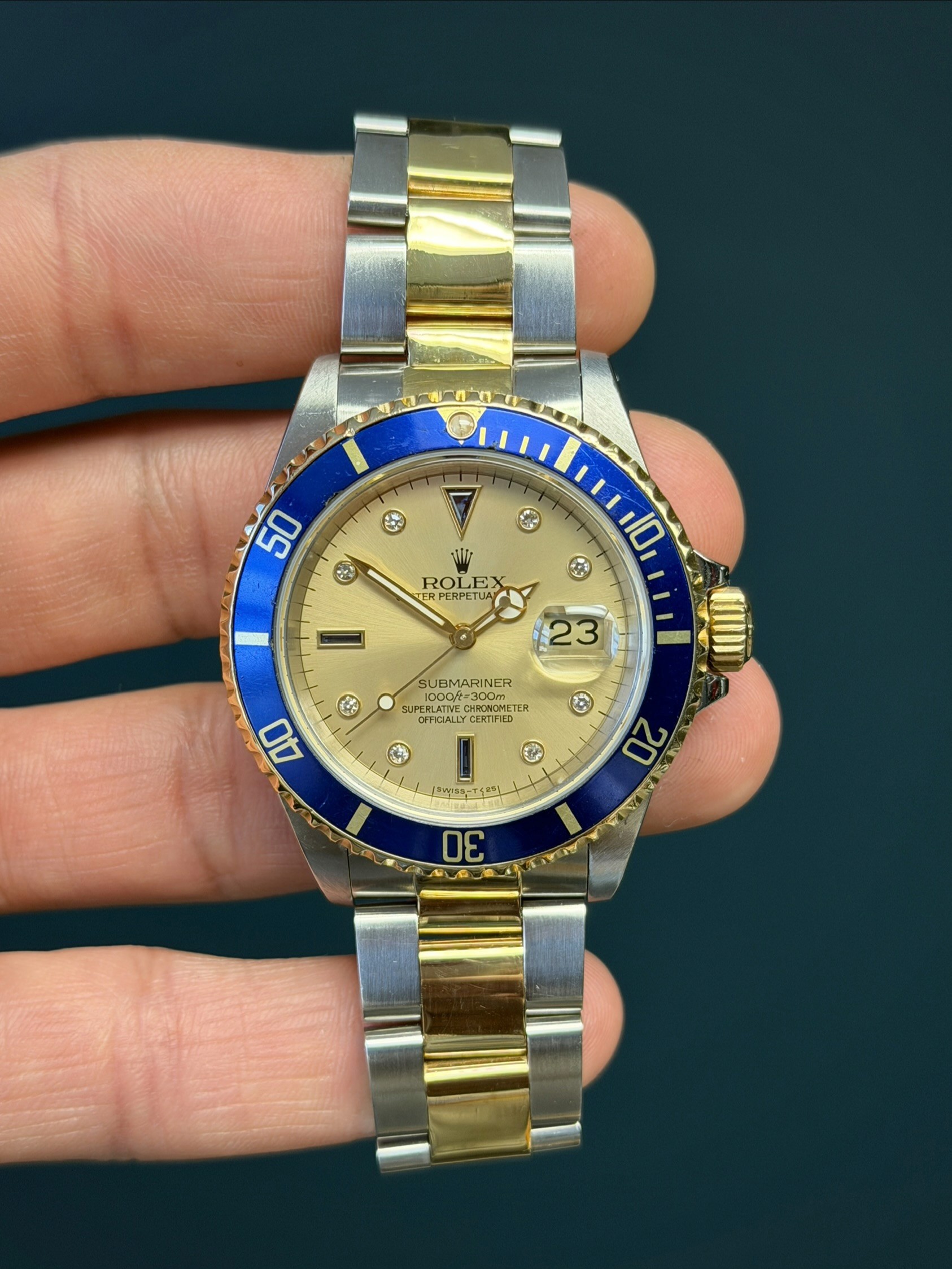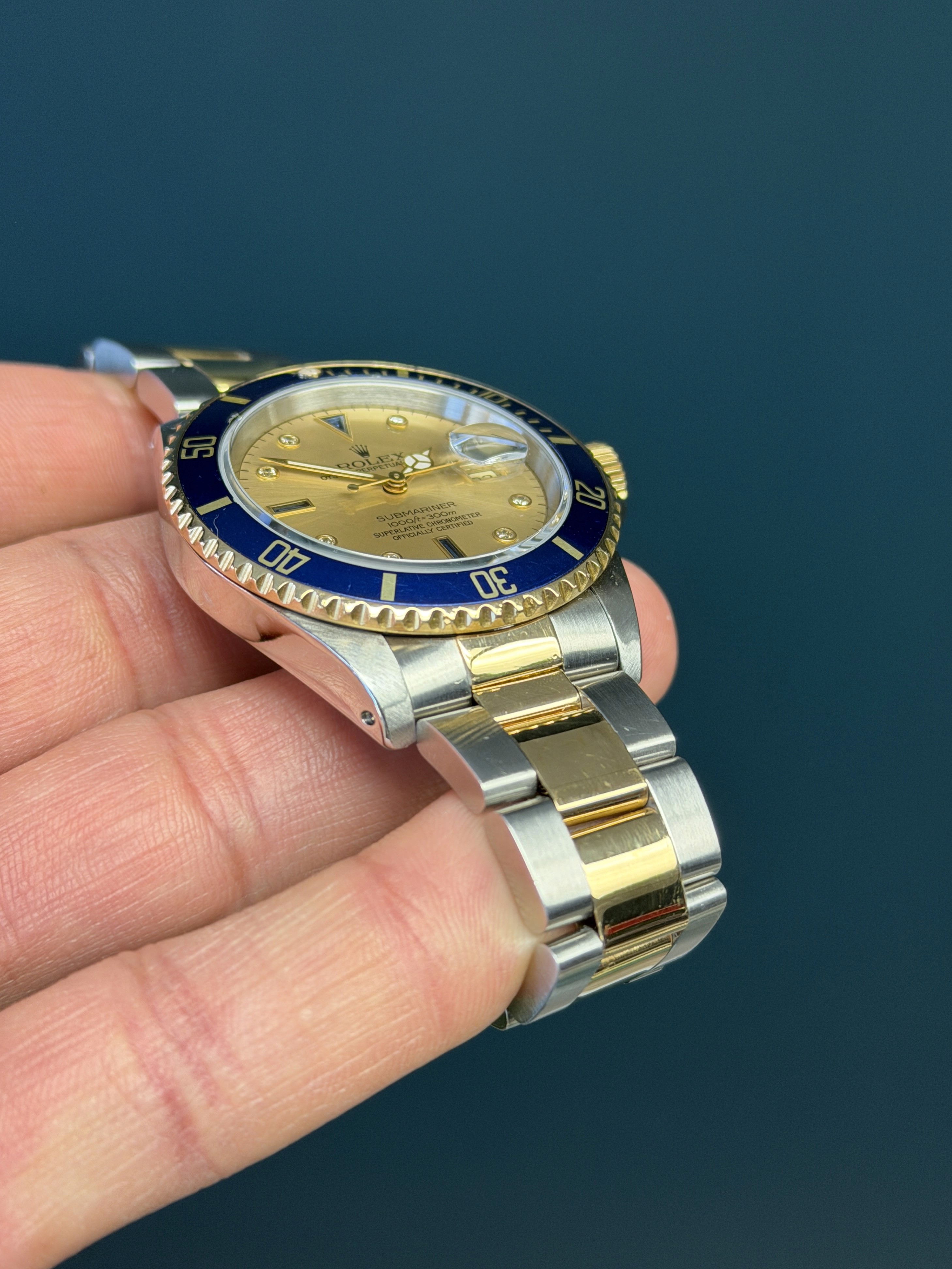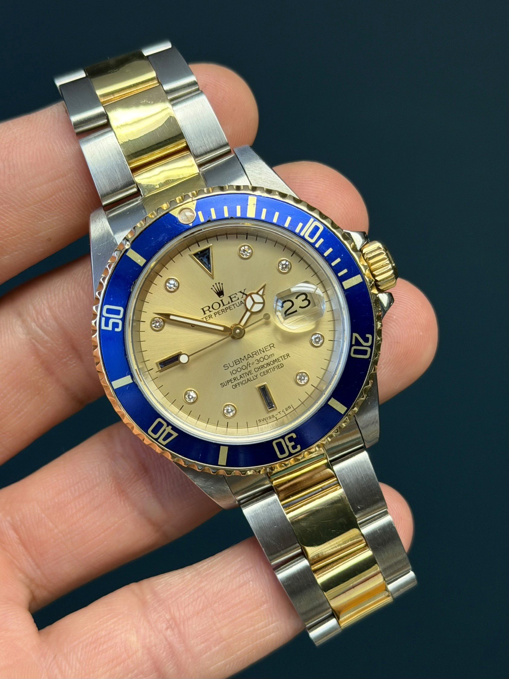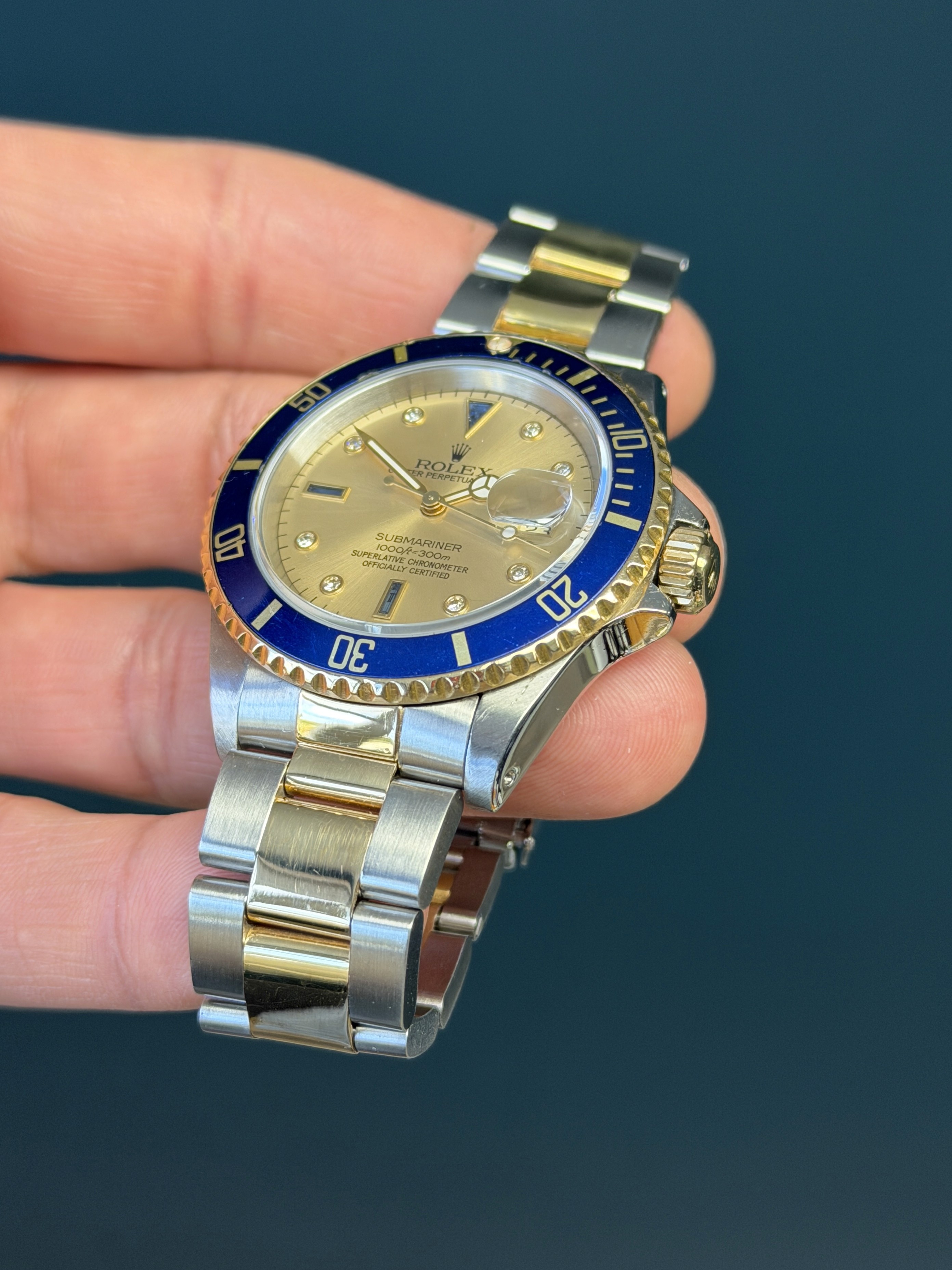 The Rolex Submariner Reference 16613 with a factory sapphire diamond Serti dial is a rare and striking blend of luxury and professional dive-watch heritage. Crafted in Rolex’s signature Rolesor construction of stainless steel and 18k yellow gold, it pairs a robust 40mm Oyster case with refined gold accents.