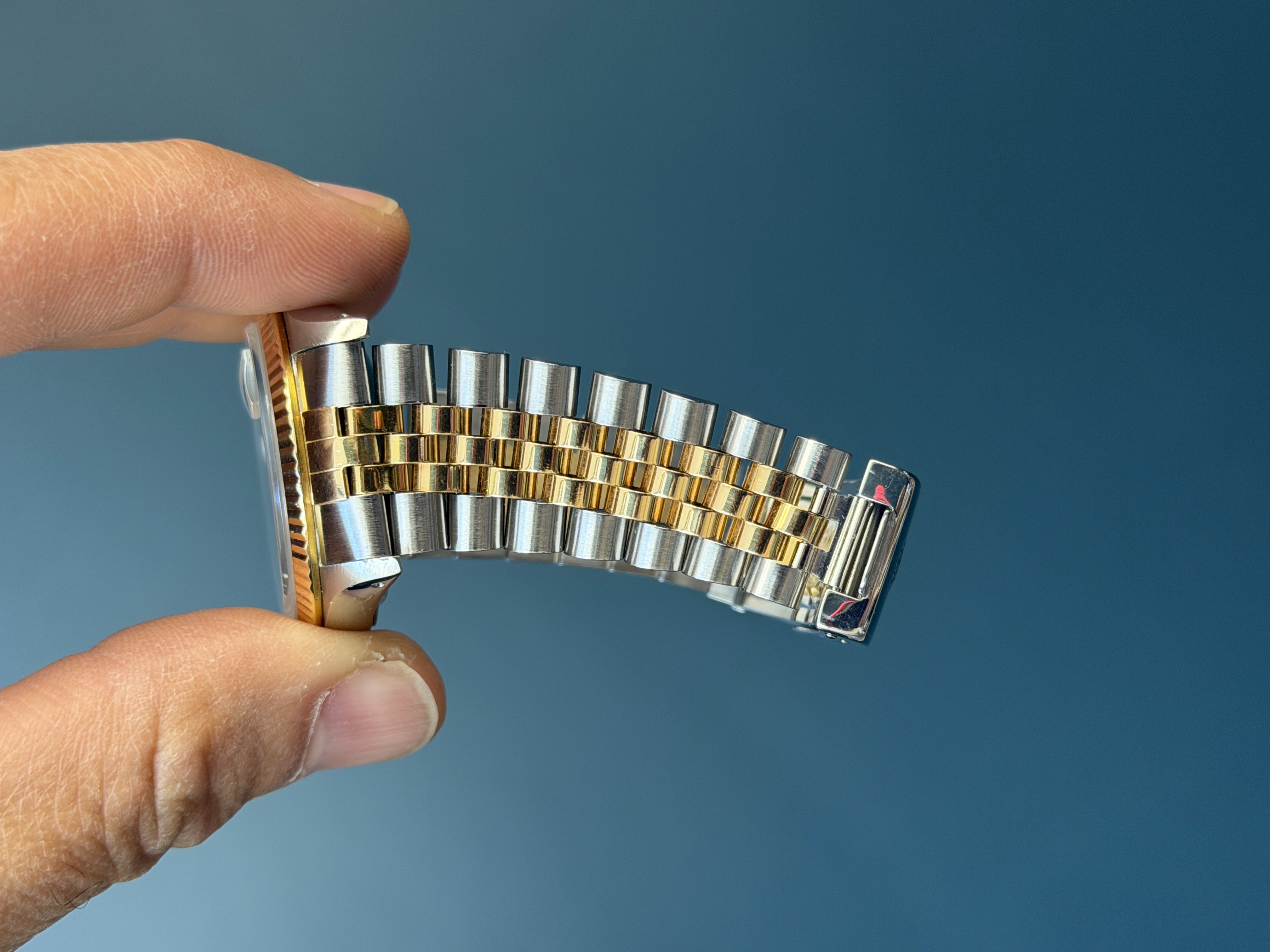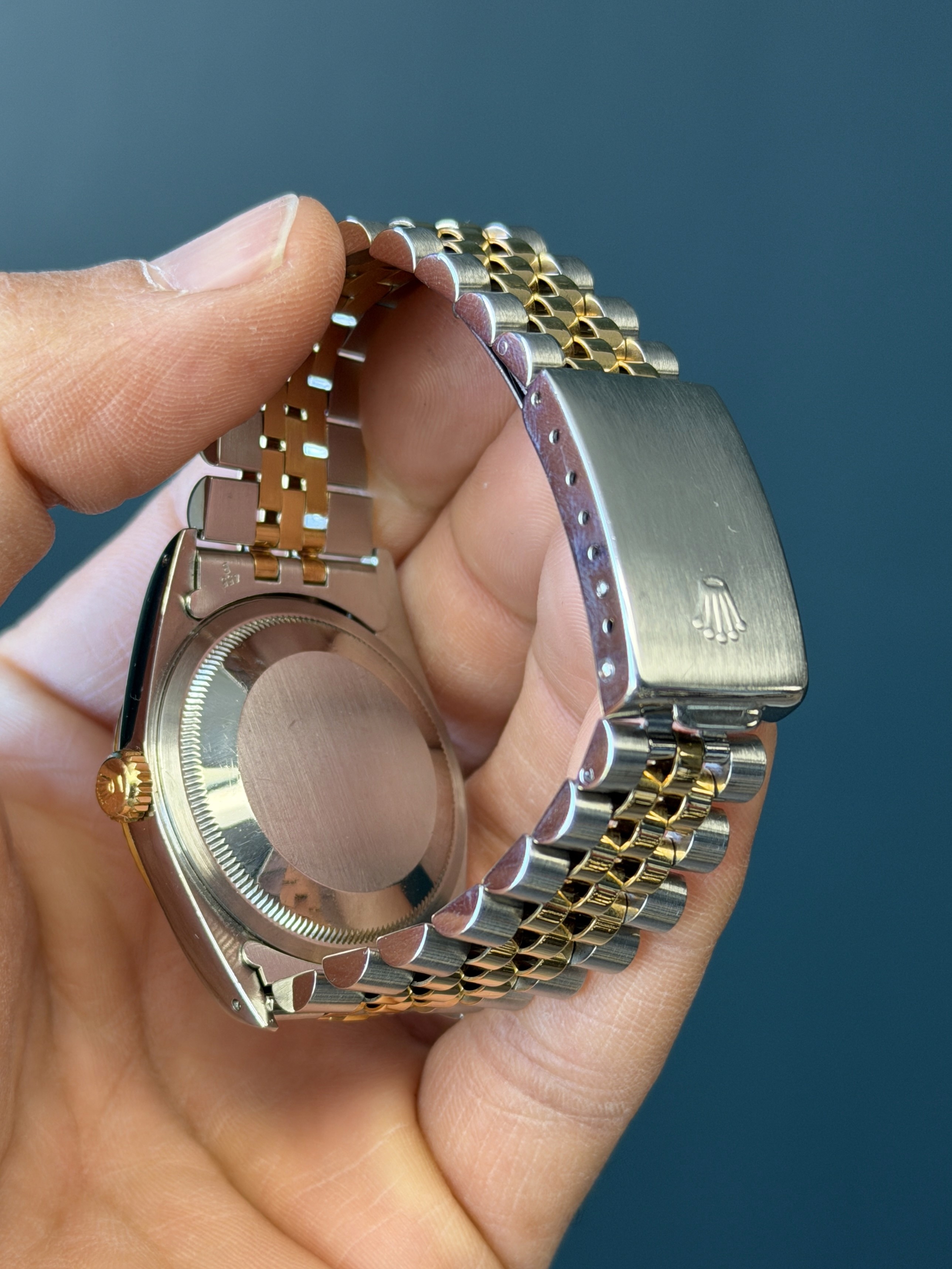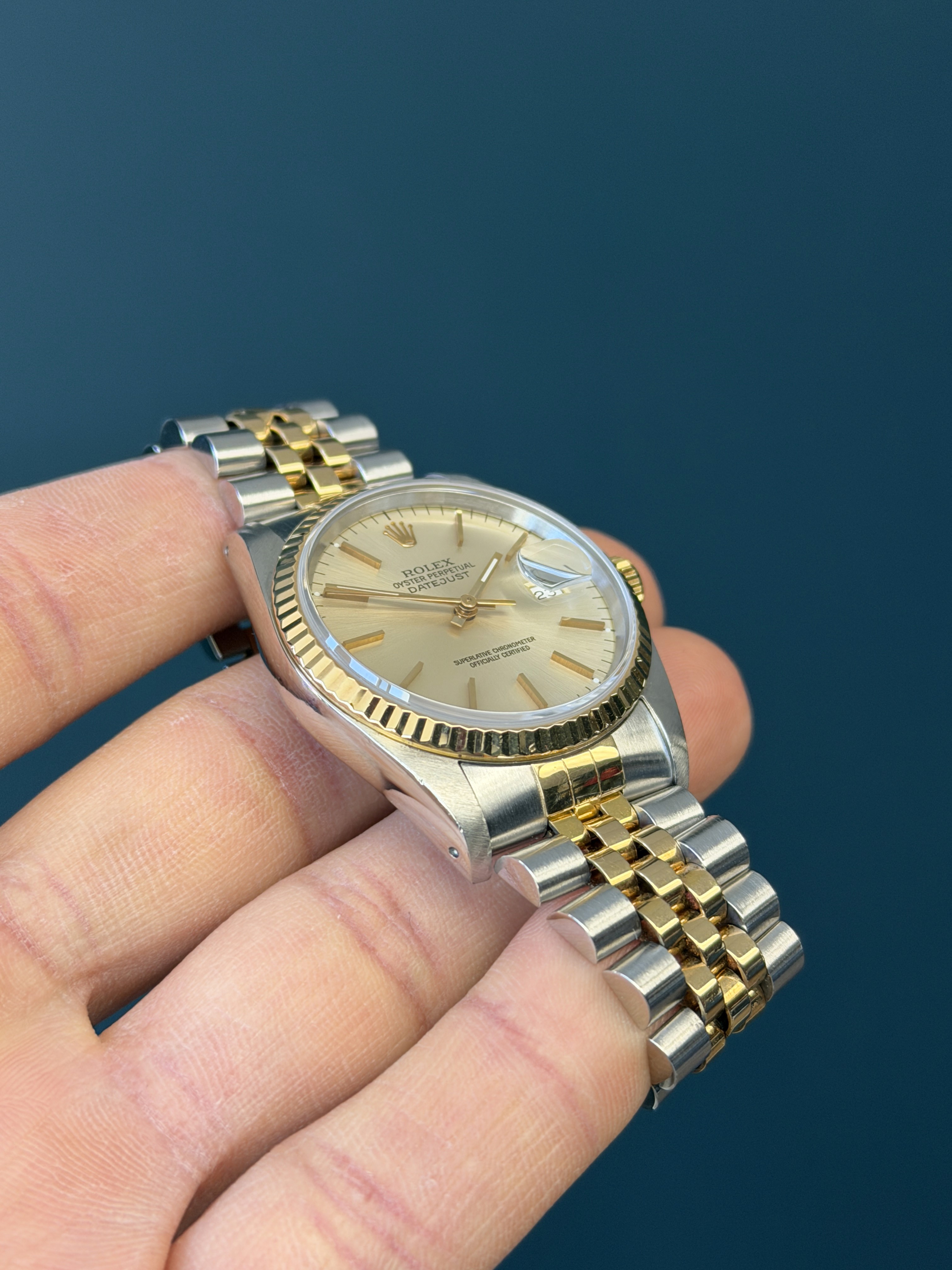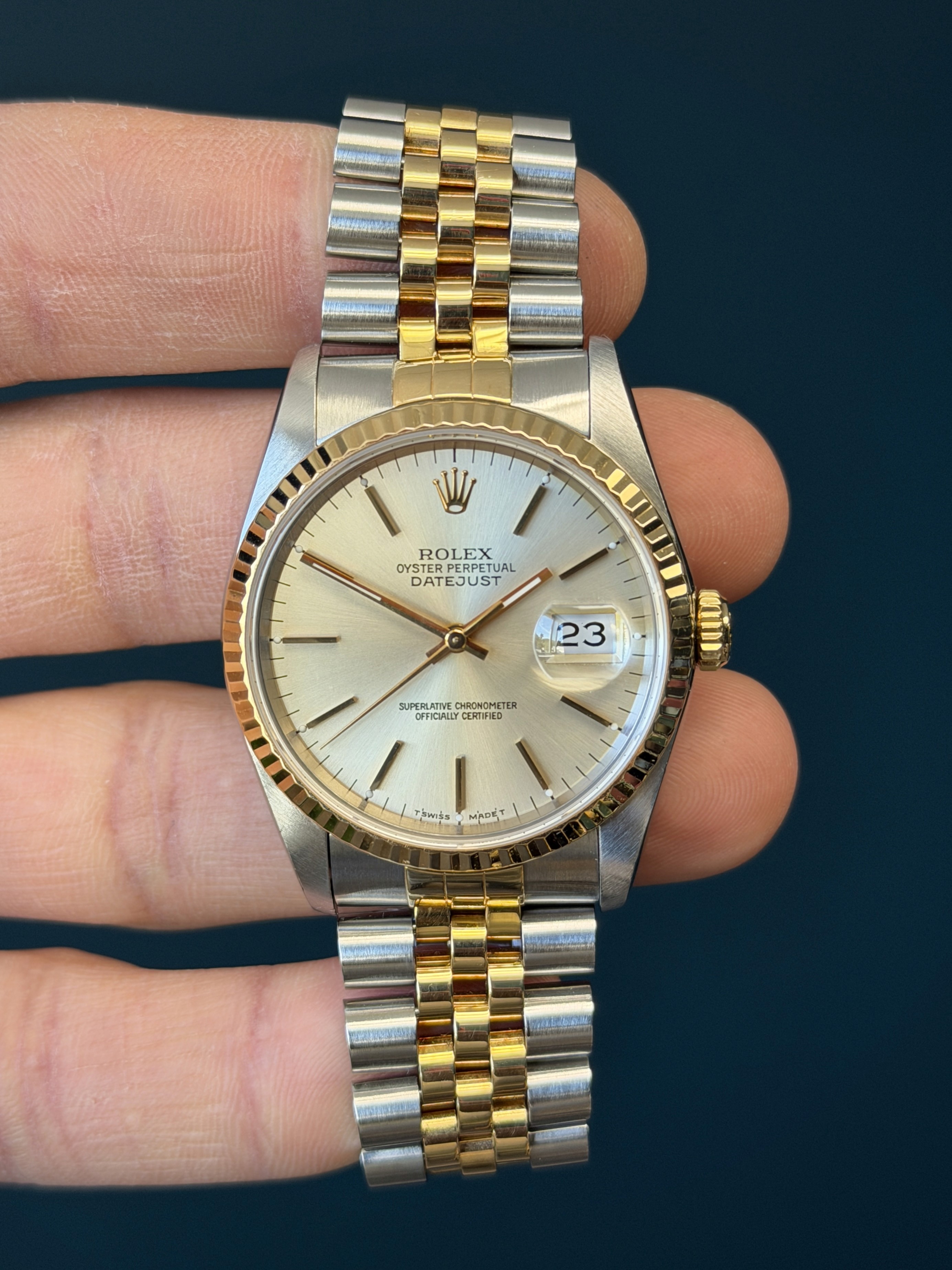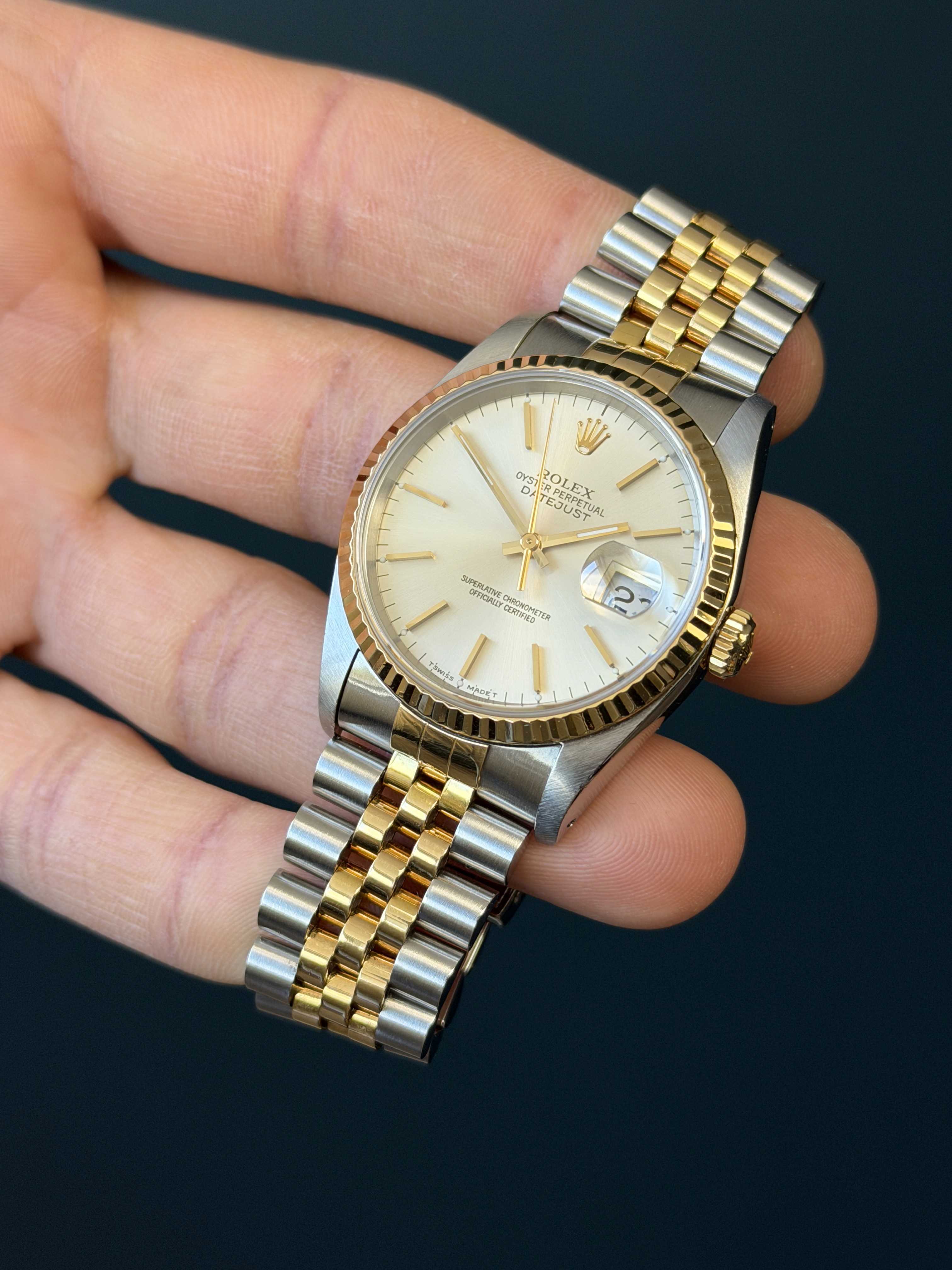 The Rolex Datejust Ref. 16233 is a timeless and elegant timepiece that epitomizes luxury and sophistication. This iconic wristwatch features a striking ivory Dial, which adds a touch of opulence and refinement to its classic design. The dial has an excellent sunburst finish that glisten and catch the light, exuding a sense of prestige. Encased in a beautifully polished stainless steel and 18k yellow gold combination, the watch seamlessly combines durability and style. With its signature Cyclops date magnification window and self-winding movement, the Rolex Datejust Ref. 16233G is not only a symbol of horological excellence but also a statement of timeless elegance for those who appreciate the finer things in life.