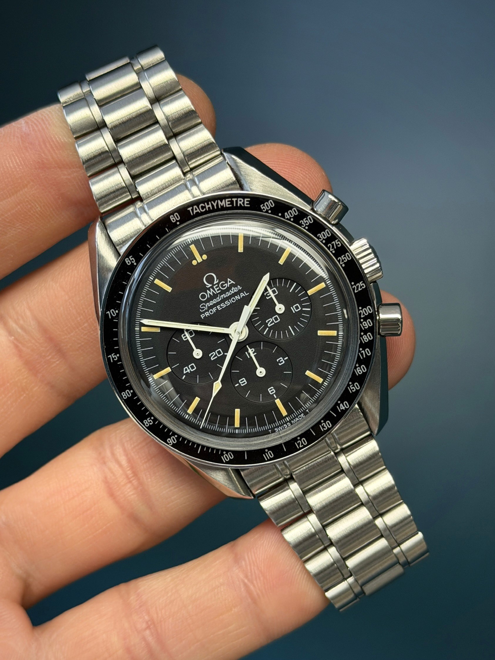 The Vintage Omega Speedmaster reference 3590.50 is a classic timepiece beloved by collectors and enthusiasts alike. This iconic chronograph, renowned for its association with NASA and space exploration, features a striking yellow patina that adds character and charm to its vintage appeal. The yellowed lume on the hands and hour markers not only accentuates its retro aesthetic but also signifies its age and history. With its reliable manual-wind movement, durable stainless steel construction, and timeless design, the Omega Speedmaster reference 3590.50 with Yellow Patina is a standout choice for those seeking a piece of horological history with a distinct vintage flair.