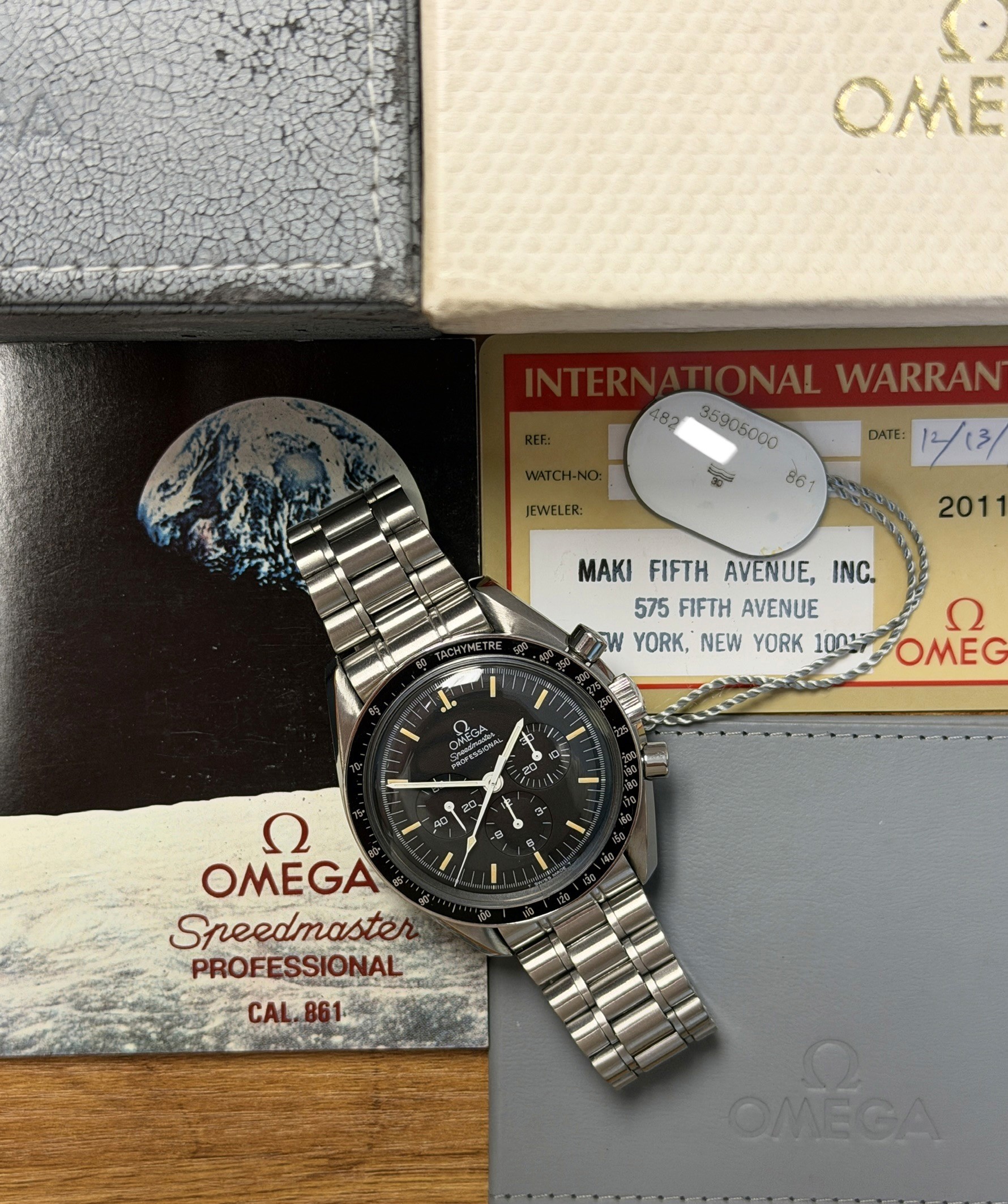 Today's example comes to us in excellent vintage condition as a full complete set. The dial is excellent with nice vibrant pumpkin matching patina. The case is excellent and even showing prominent bevels. The bracelet has 5 removable links and shows no stretch. The chronograph features are functioning as they should. This example comes as a full complete set with card dated 12/93, inner and outer boxes, wallet, and booklets. Here's your chance to own an excellent vintage speedy full set with a great look at a great price!