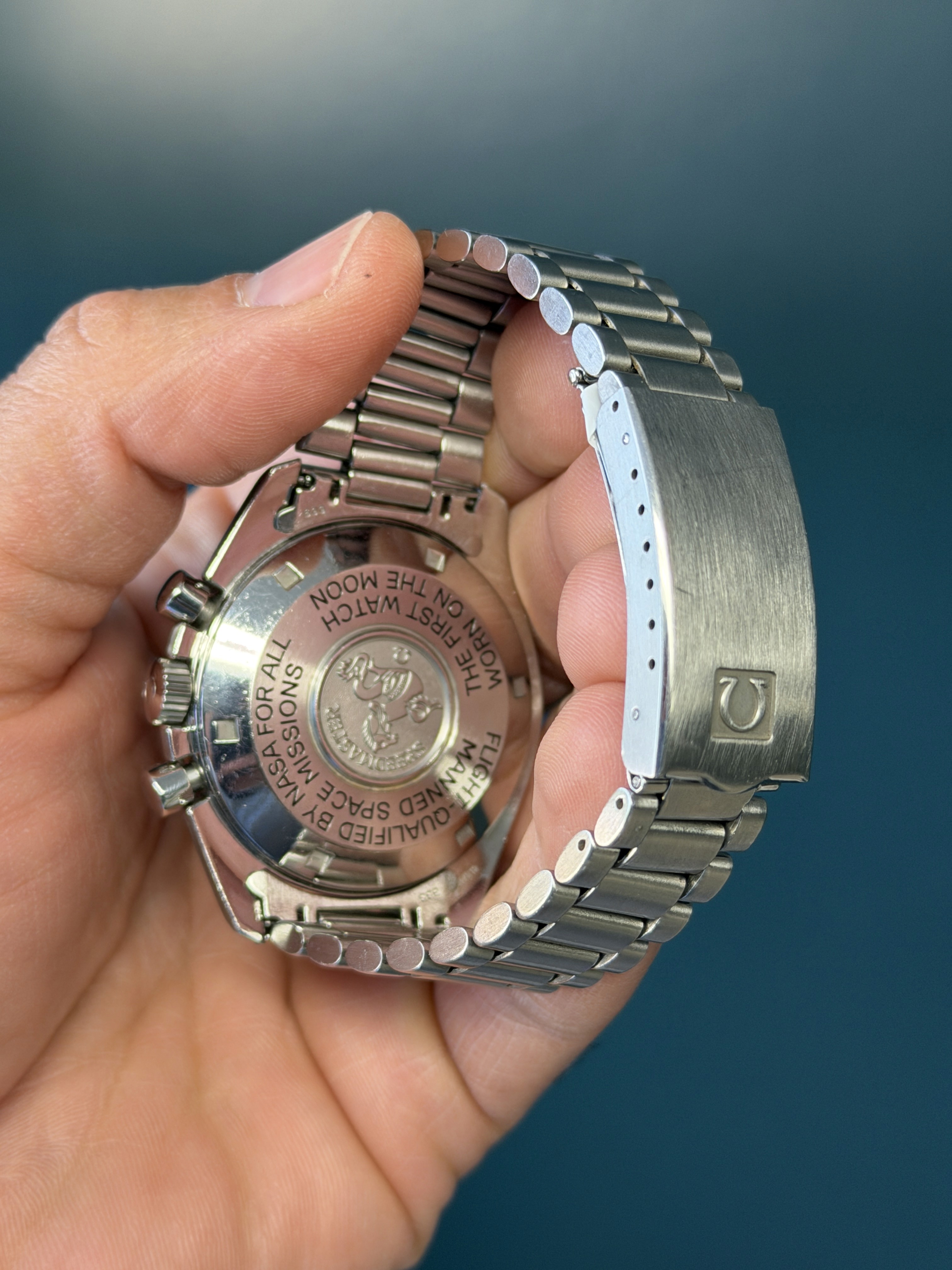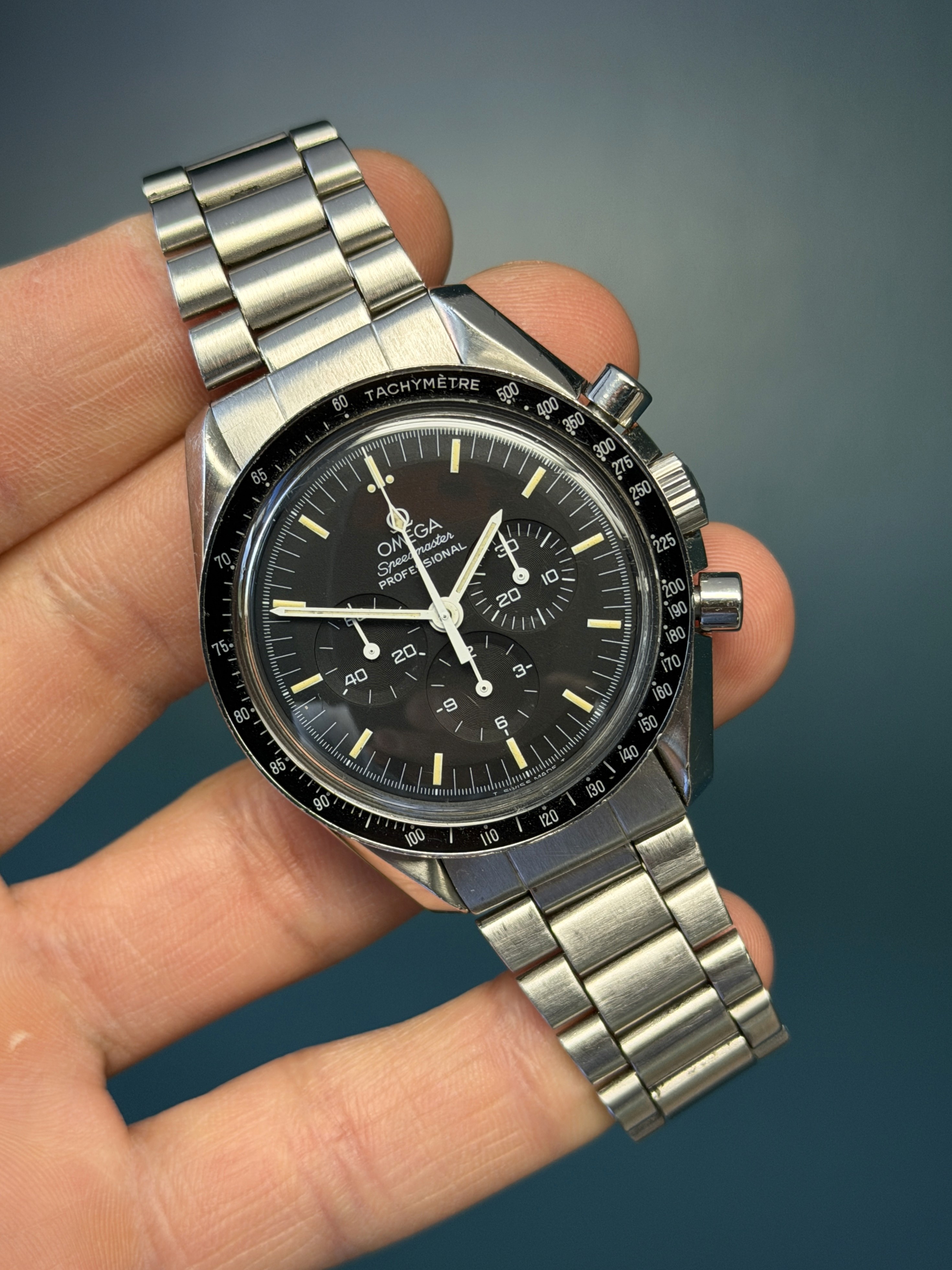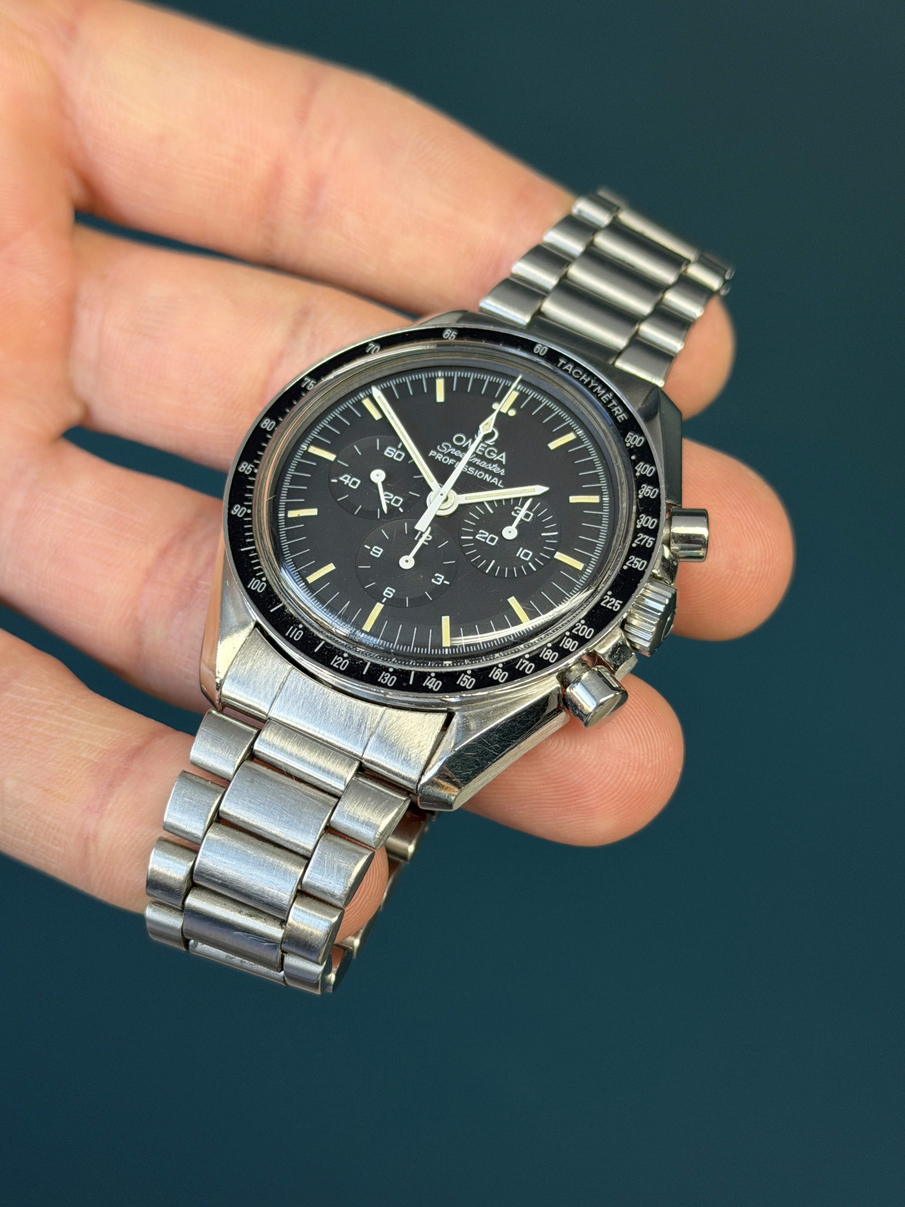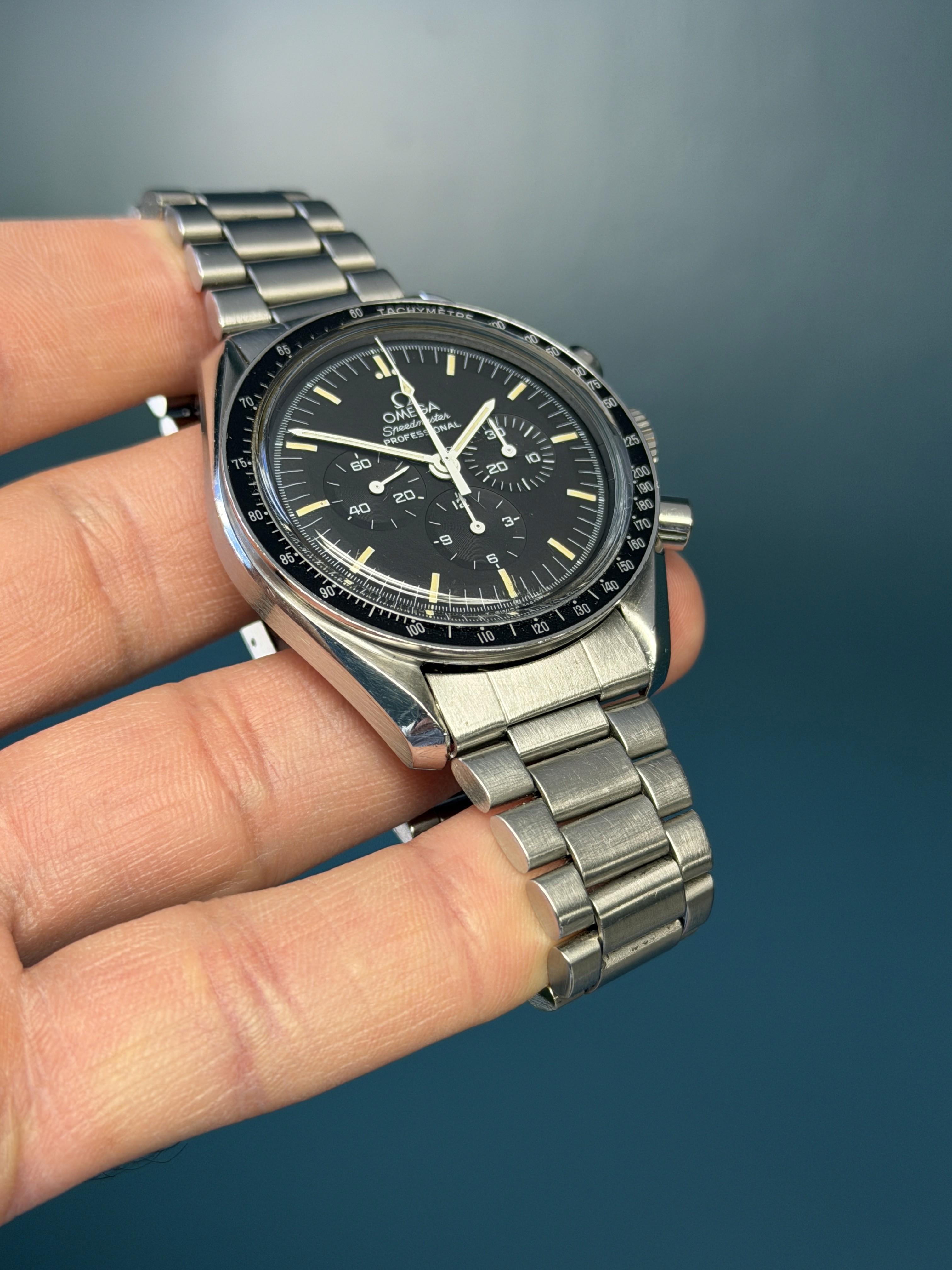 The Omega Speedmaster Professional Moonwatch reference 3570.50 is an iconic timepiece celebrated for its rich heritage and legendary status as the first watch worn on the moon. Featuring a sleek stainless steel case measuring 42mm in diameter, this chronograph is powered by the renowned manual-winding Caliber 861 movement, known for its reliability and precision. With its classic black dial adorned with luminous hands and matching yellow patina hour markers, along with its signature tachymeter bezel, the Speedmaster 3570.50 exudes timeless elegance and functionality. Renowned for its enduring design and association with NASA's space missions, this timepiece remains a symbol of innovation and adventure in horology.