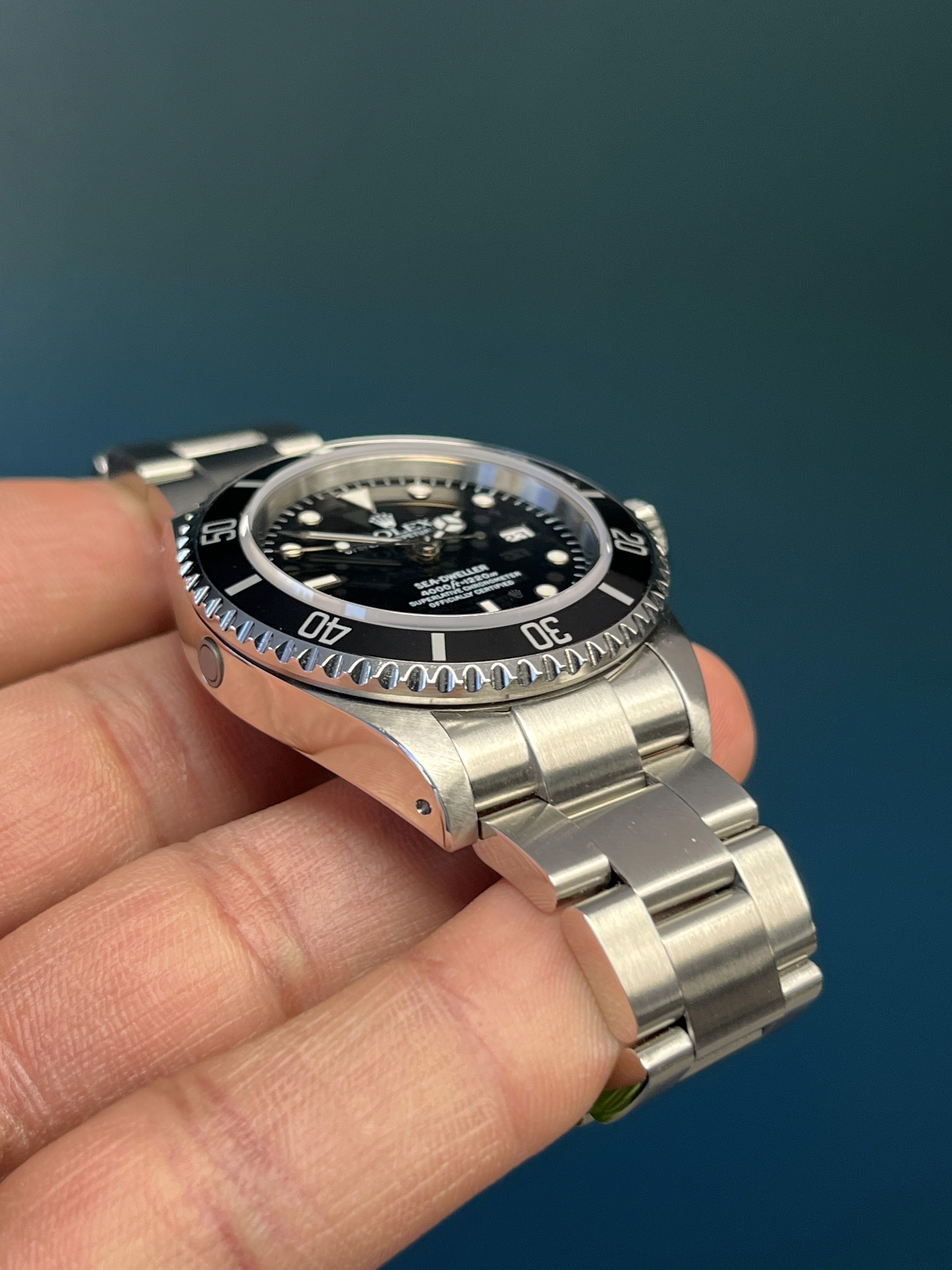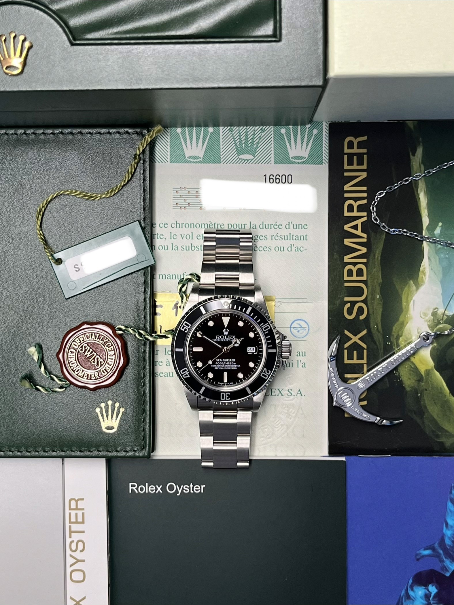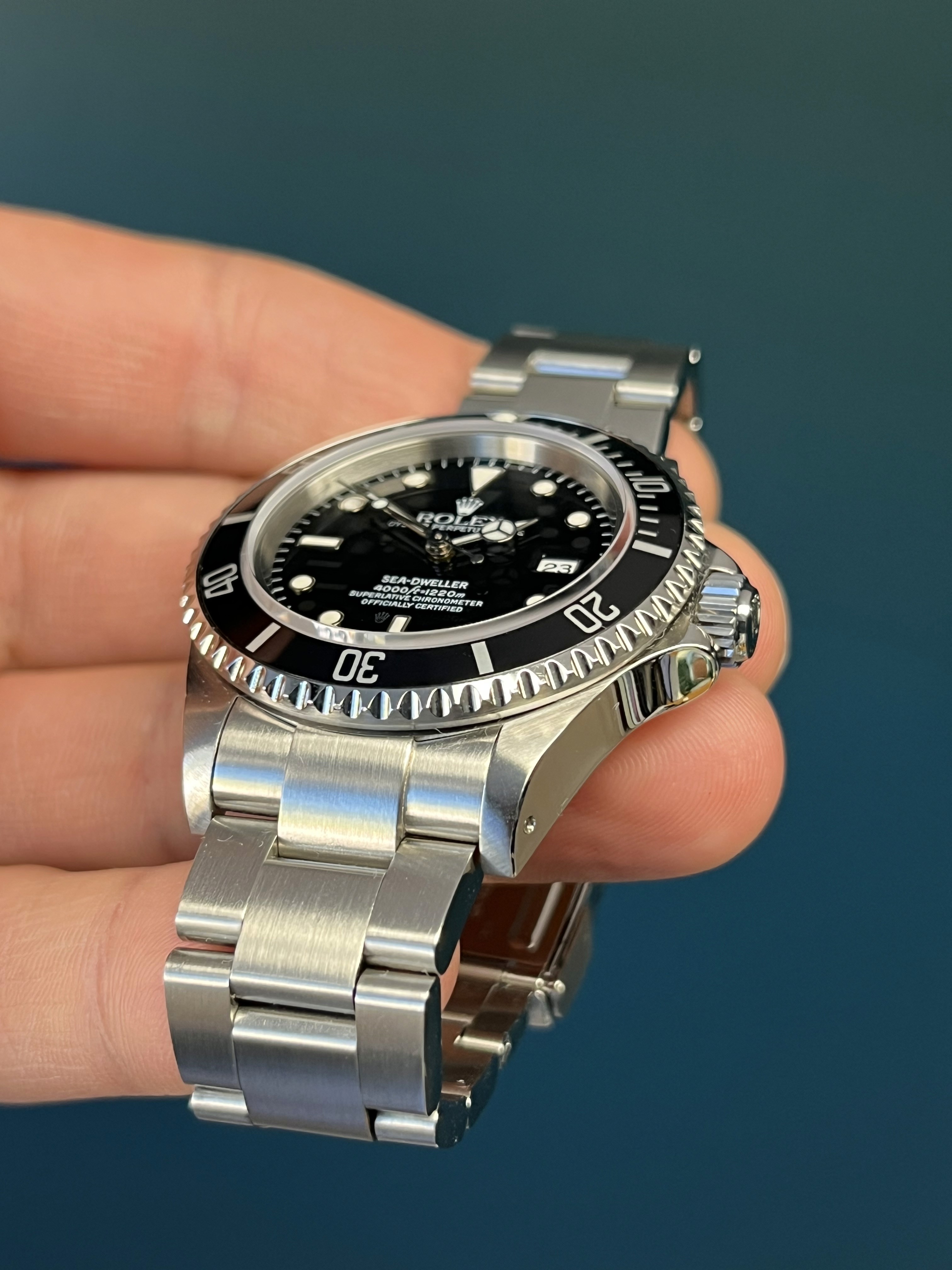 The Rolex Sea-Dweller Reference 16600, renowned for its robust design and advanced diving capabilities, is a timepiece that exudes timeless elegance and functionality. This particular model features the distinctive "holes" case design, providing a sleek and seamless appearance. Crafted with precision and attention to detail, the 16600 boasts a helium escape valve, ensuring its suitability for deep-sea exploration. The black dial with luminous hour markers and hands not only enhances readability in low-light conditions but also adds a touch of sophistication. With a water resistance of up to 1,220 meters (4,000 feet), this Sea-Dweller is not merely a watch; it is a reliable companion for those who seek adventure beneath the waves. Embodying Rolex's commitment to excellence, the Reference 16600 stands as a testament to the brand's rich heritage in the world of professional diving watches.