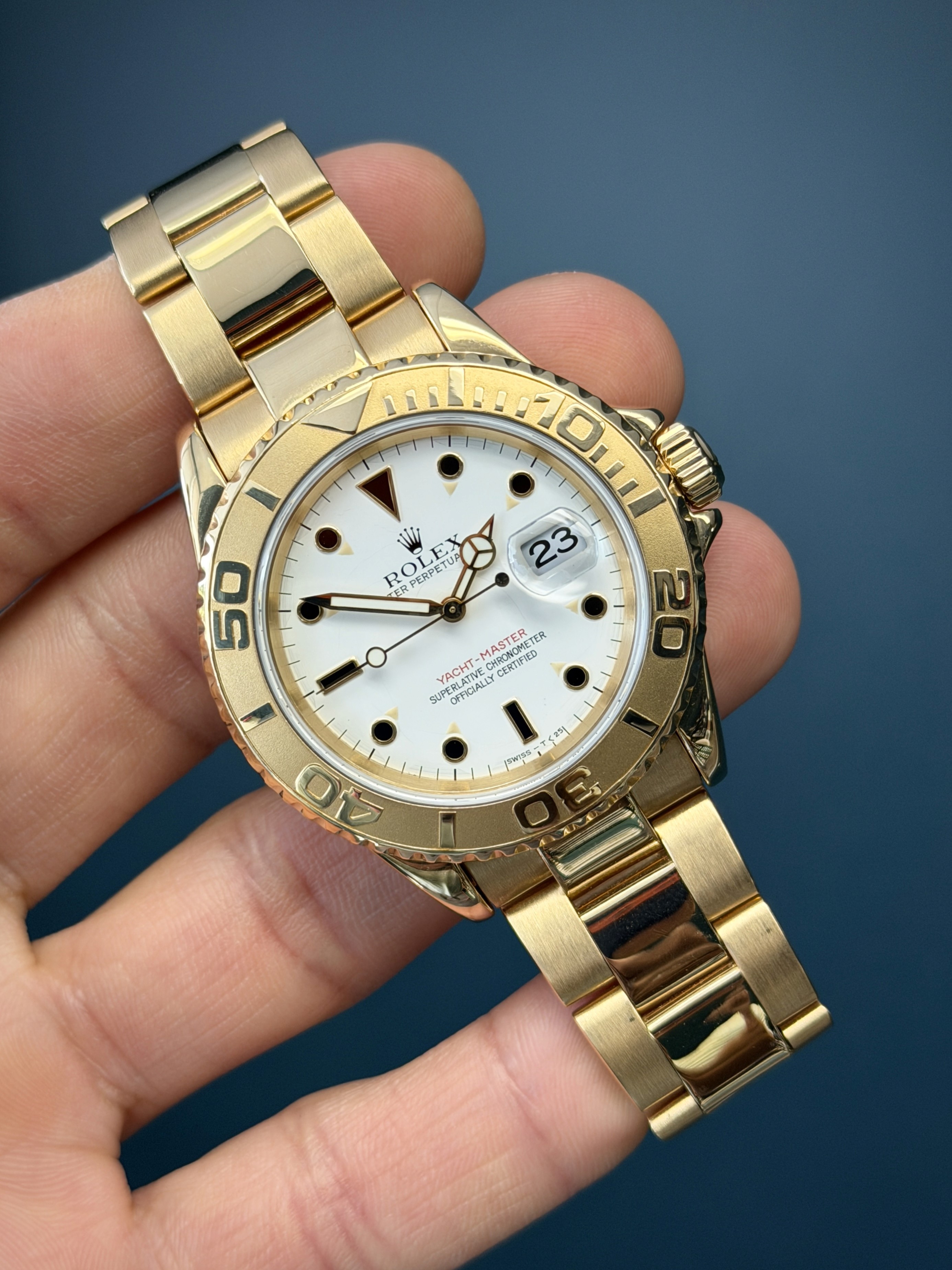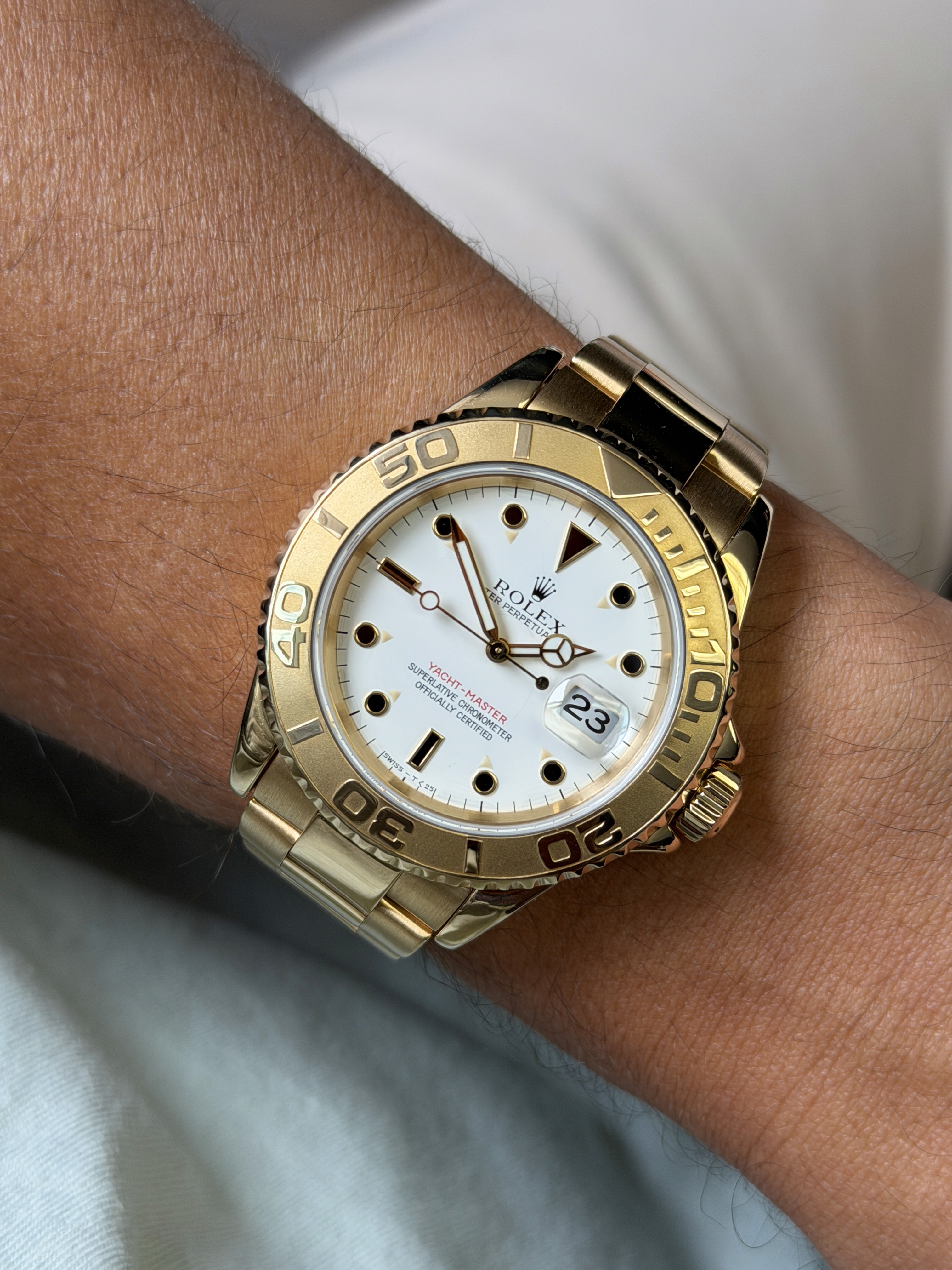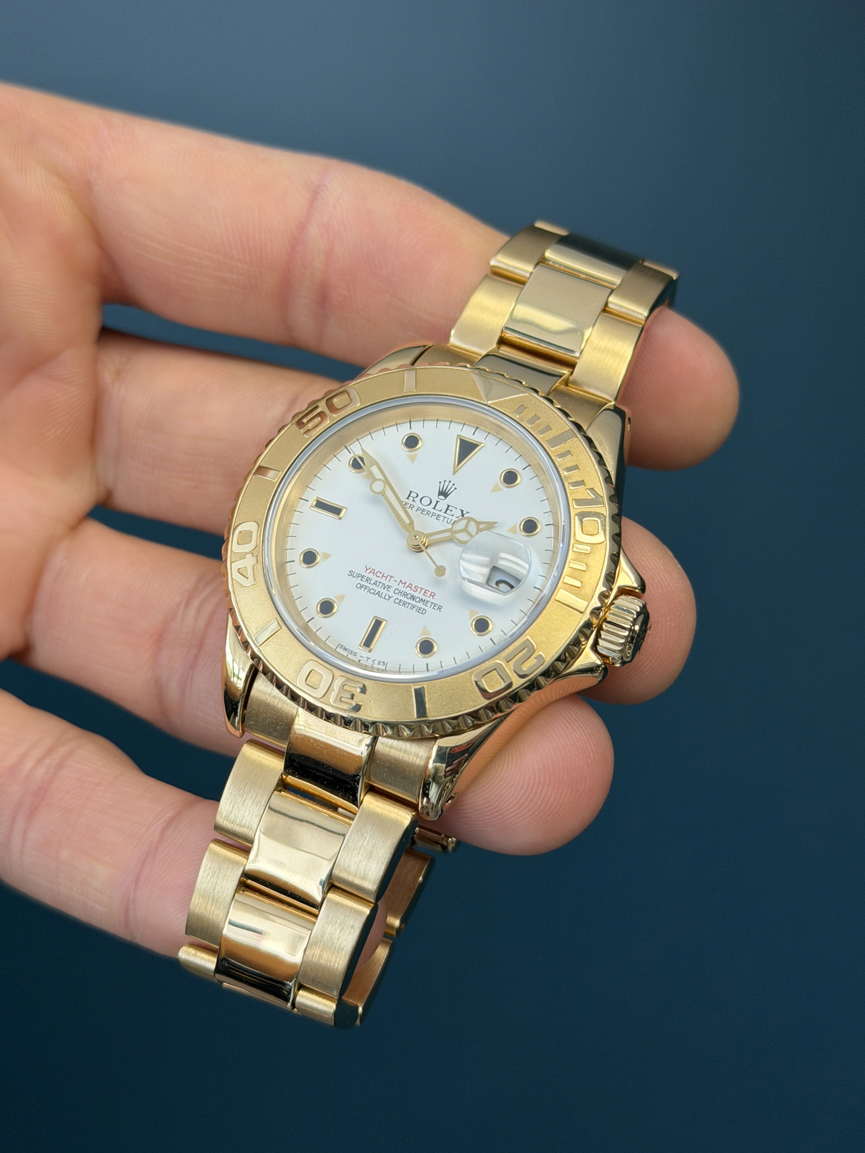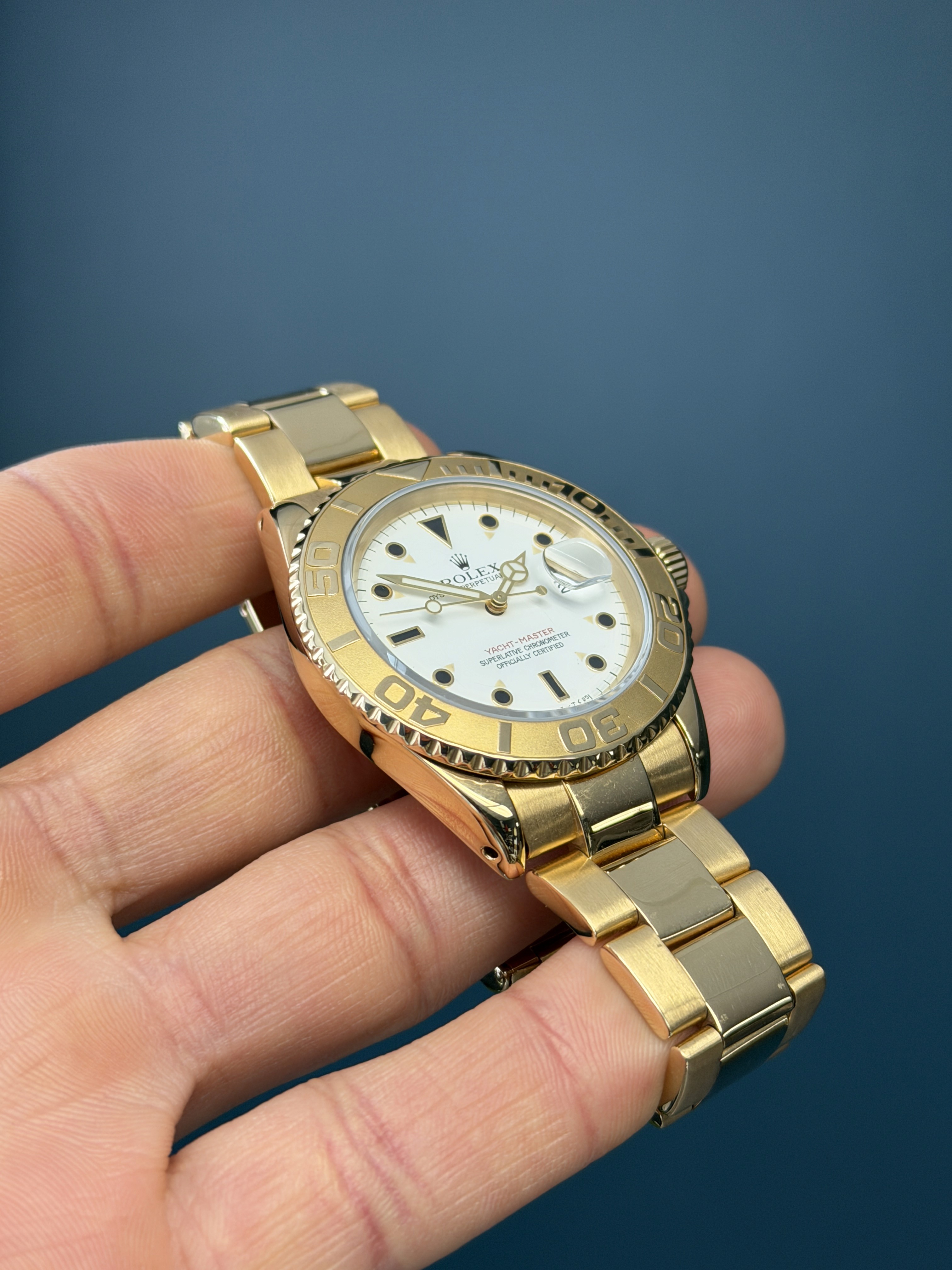 The Rolex Yacht Master reference 16628 in yellow gold with a white dial is a striking and luxurious take on one of the most iconic dive watches ever produced. Crafted entirely in 18k yellow gold, the 40mm Oyster case offers both robustness and unmistakable presence, paired with the signature unidirectional rotating bezel fitted with a gold insert for precise tming.