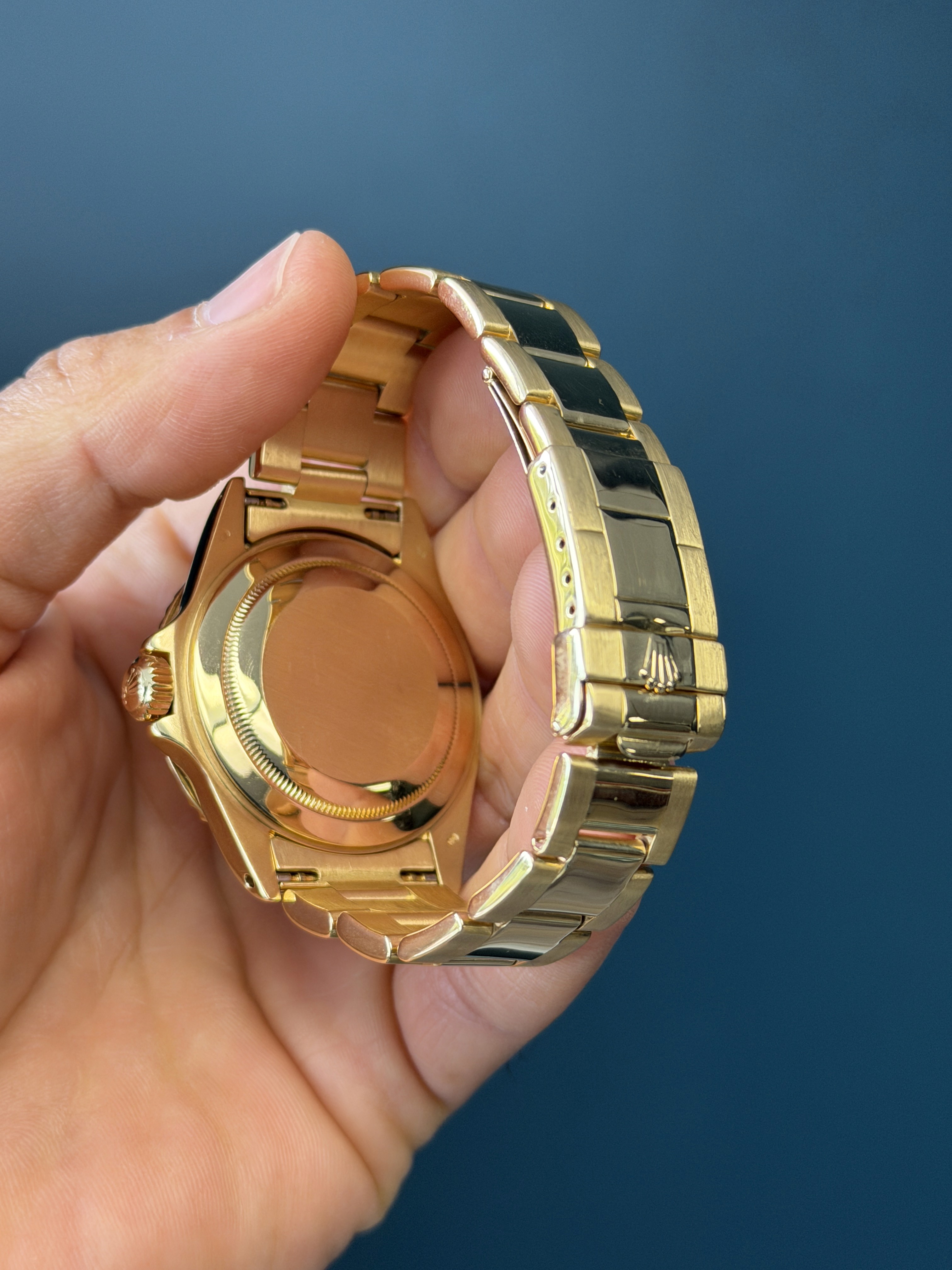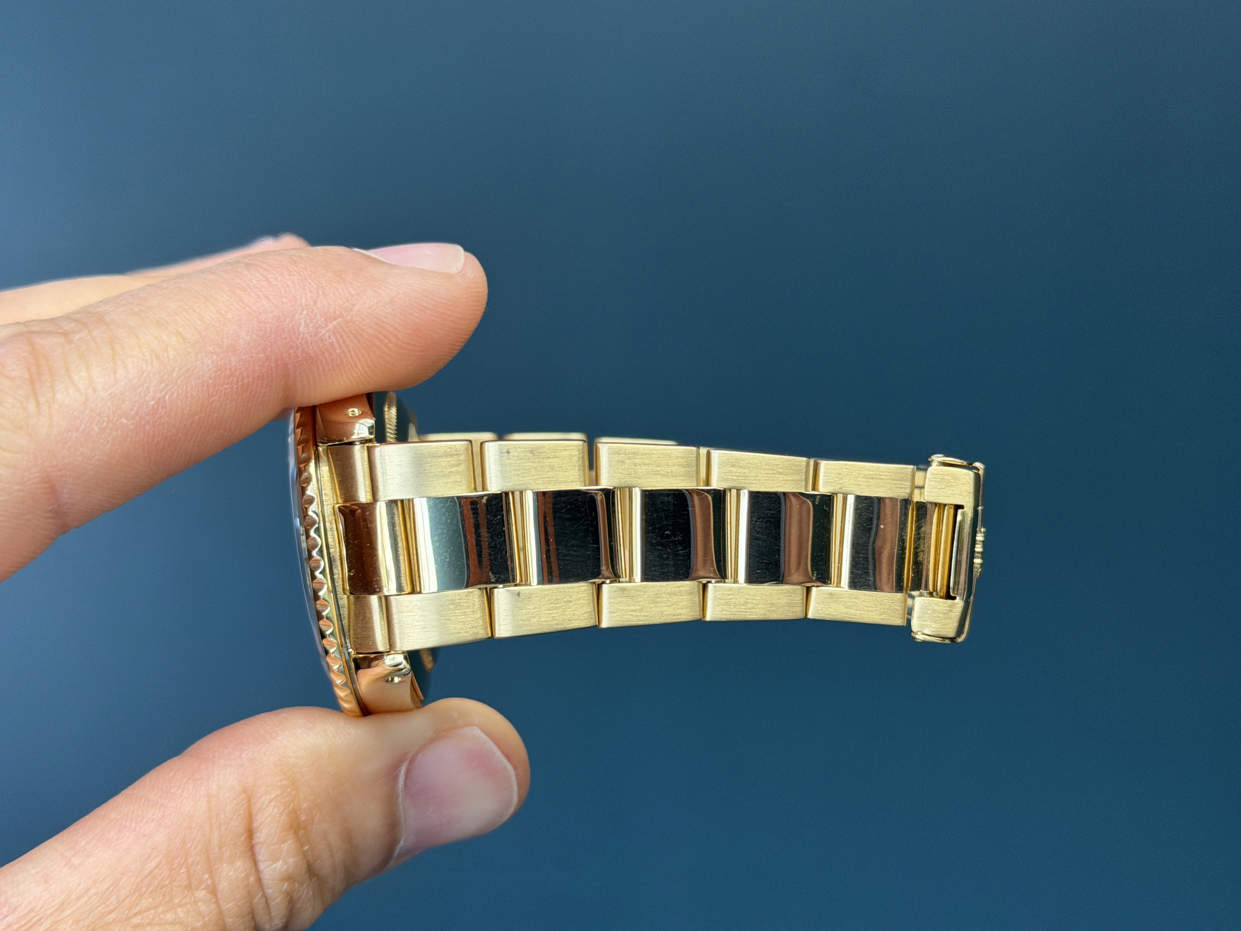 Powered by Rolex’s reliable automatic caliber 3135, the watch offers exceptional durability and chronometric precision. The solid-link Oyster bracelet has 12 links with no stretch, also in 18k yellow gold, is fitted with a folding Oysterlock clasp for security and comfort on the wrist.