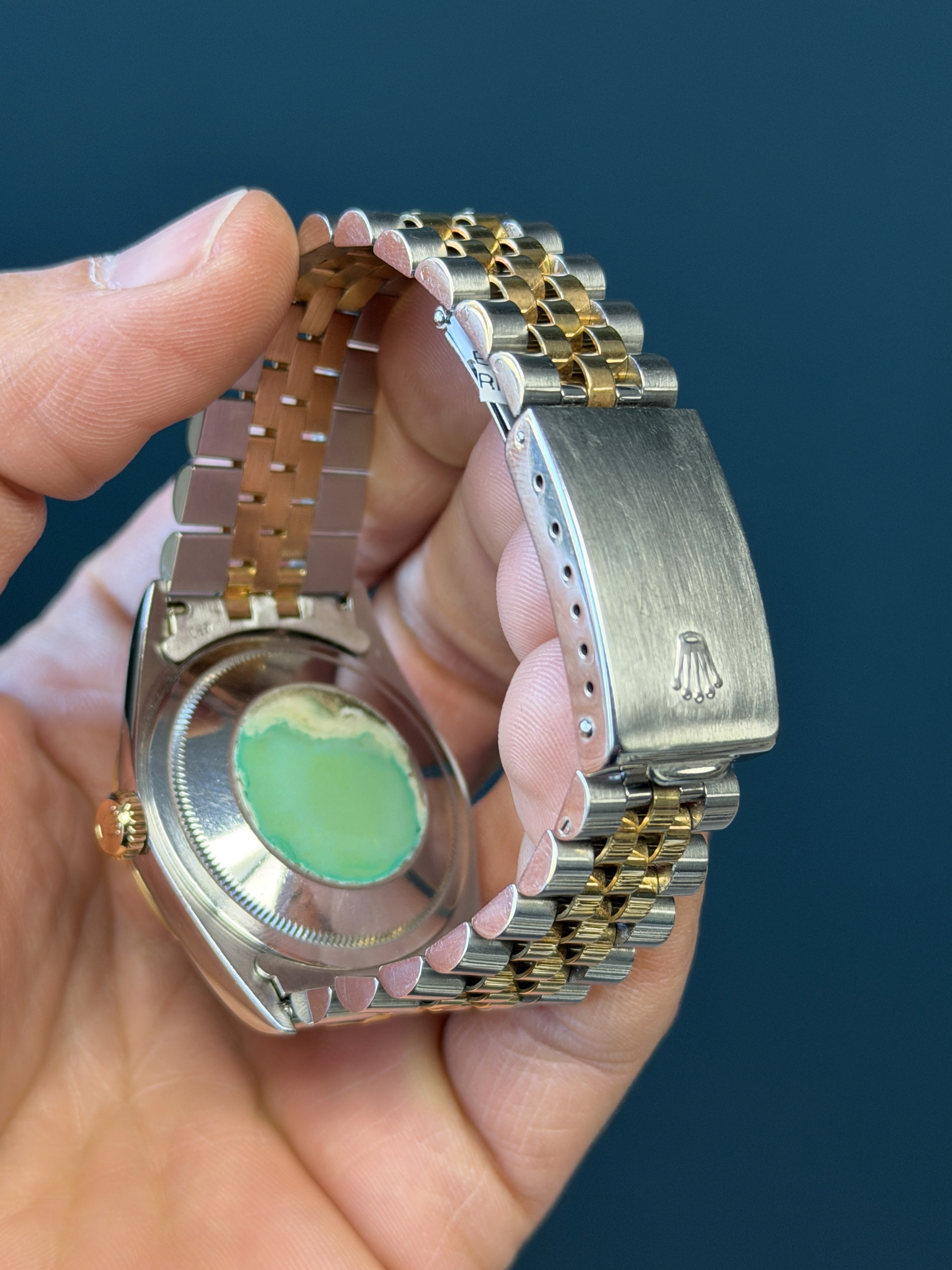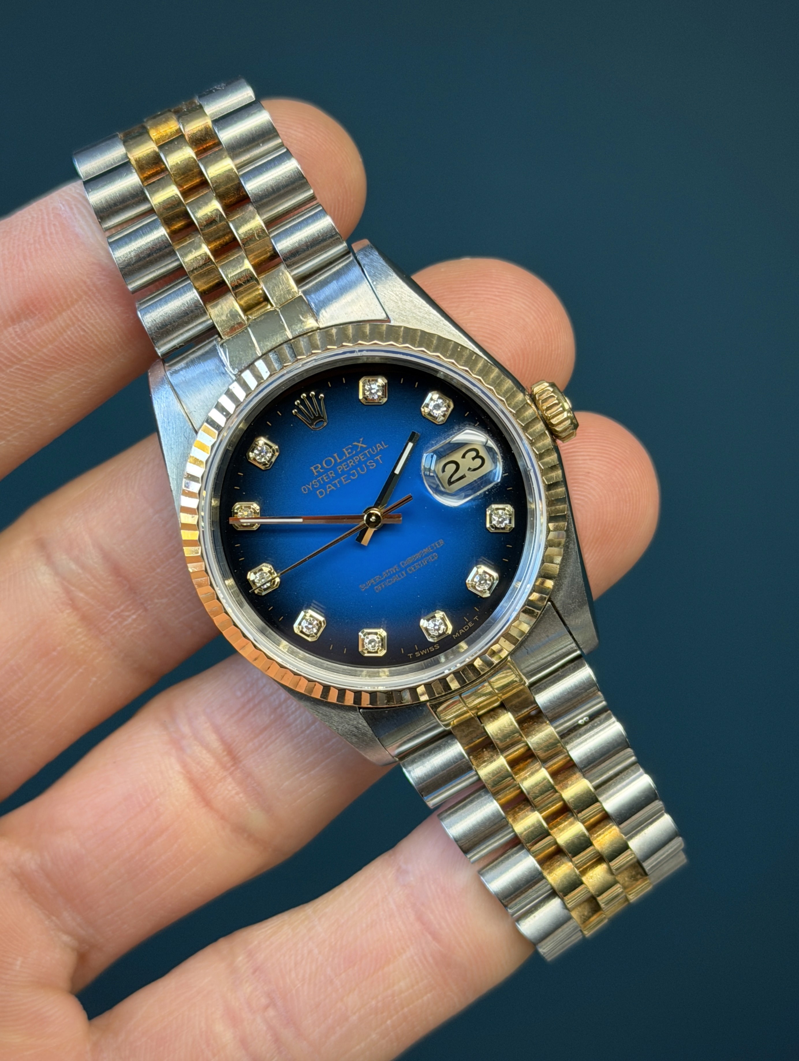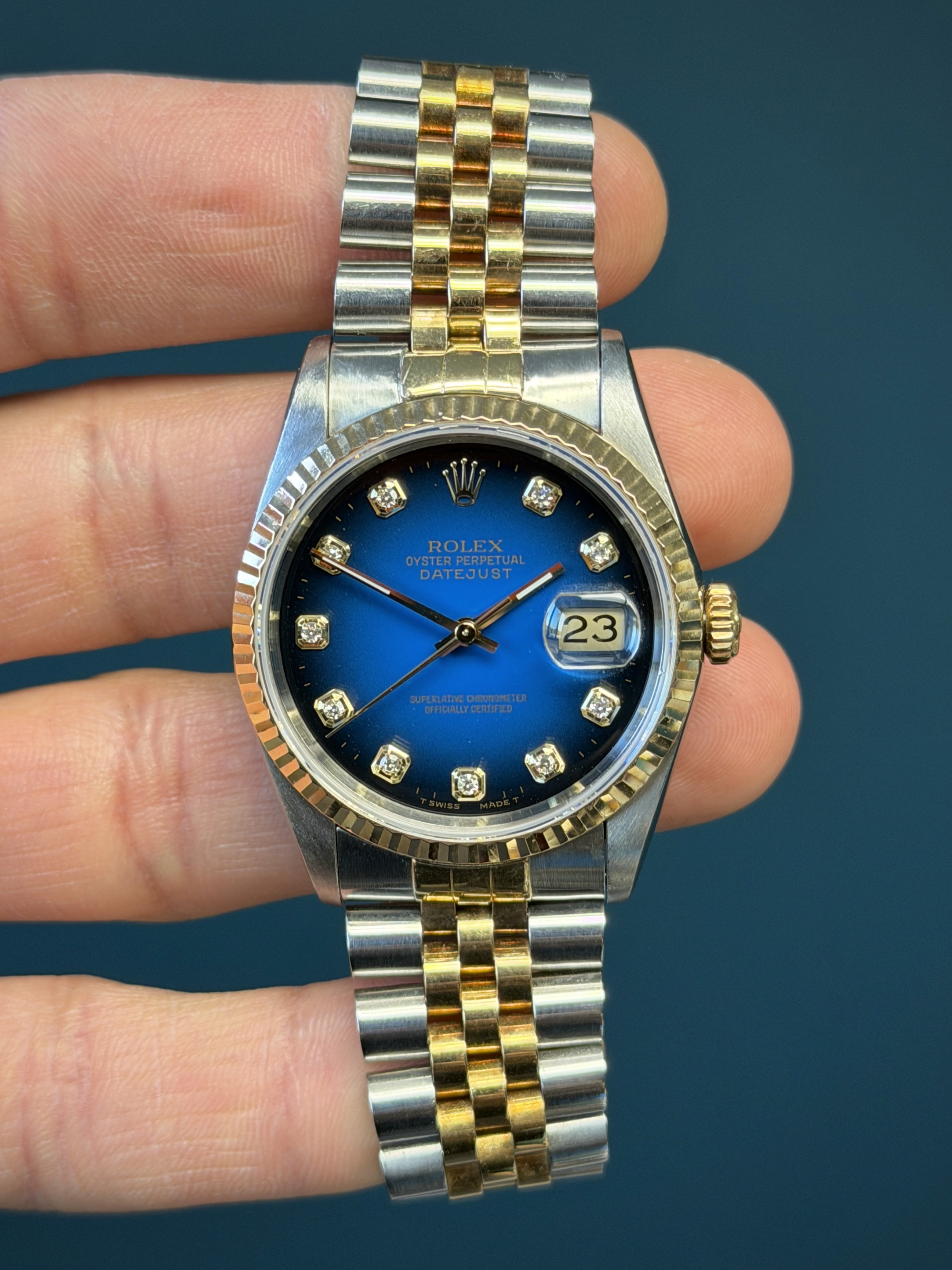 The Rolex Datejust Ref. 16233 is a timeless and elegant timepiece that epitomizes luxury and sophistication. This iconic wristwatch features a striking factory Blue Vignette Diamond dial, which adds a touch of opulence and refinement to its classic design. The dial has an excellent blue vignette diamond finish that glisten and catch the light, exuding a sense of prestige. Encased in a beautifully polished stainless steel and 18k yellow gold combination, the watch seamlessly combines durability and style. With its signature Cyclops date magnification window and self-winding movement, the Rolex Datejust Ref. 16233G is not only a symbol of horological excellence but also a statement of timeless elegance for those who appreciate the finer things in life.