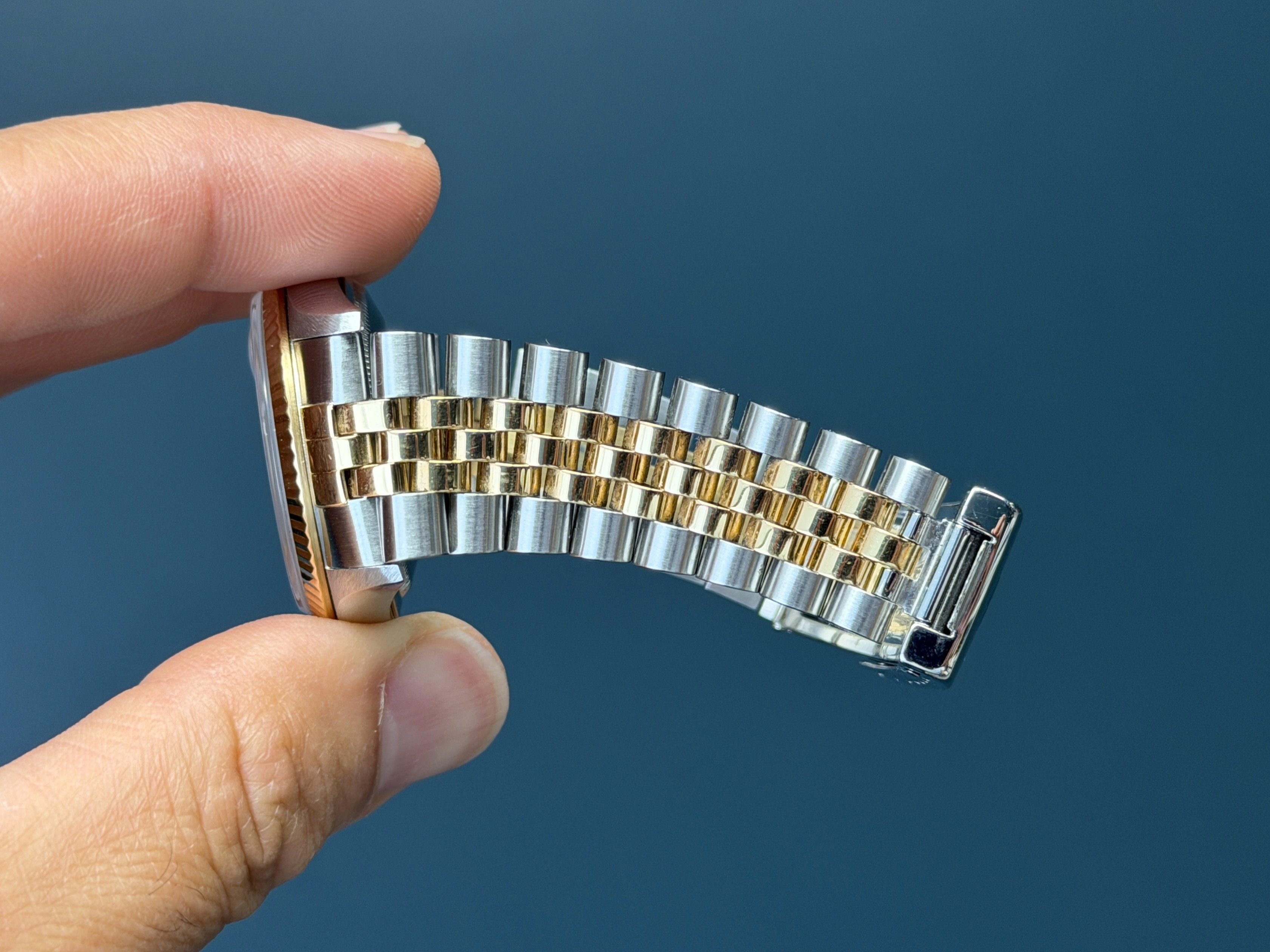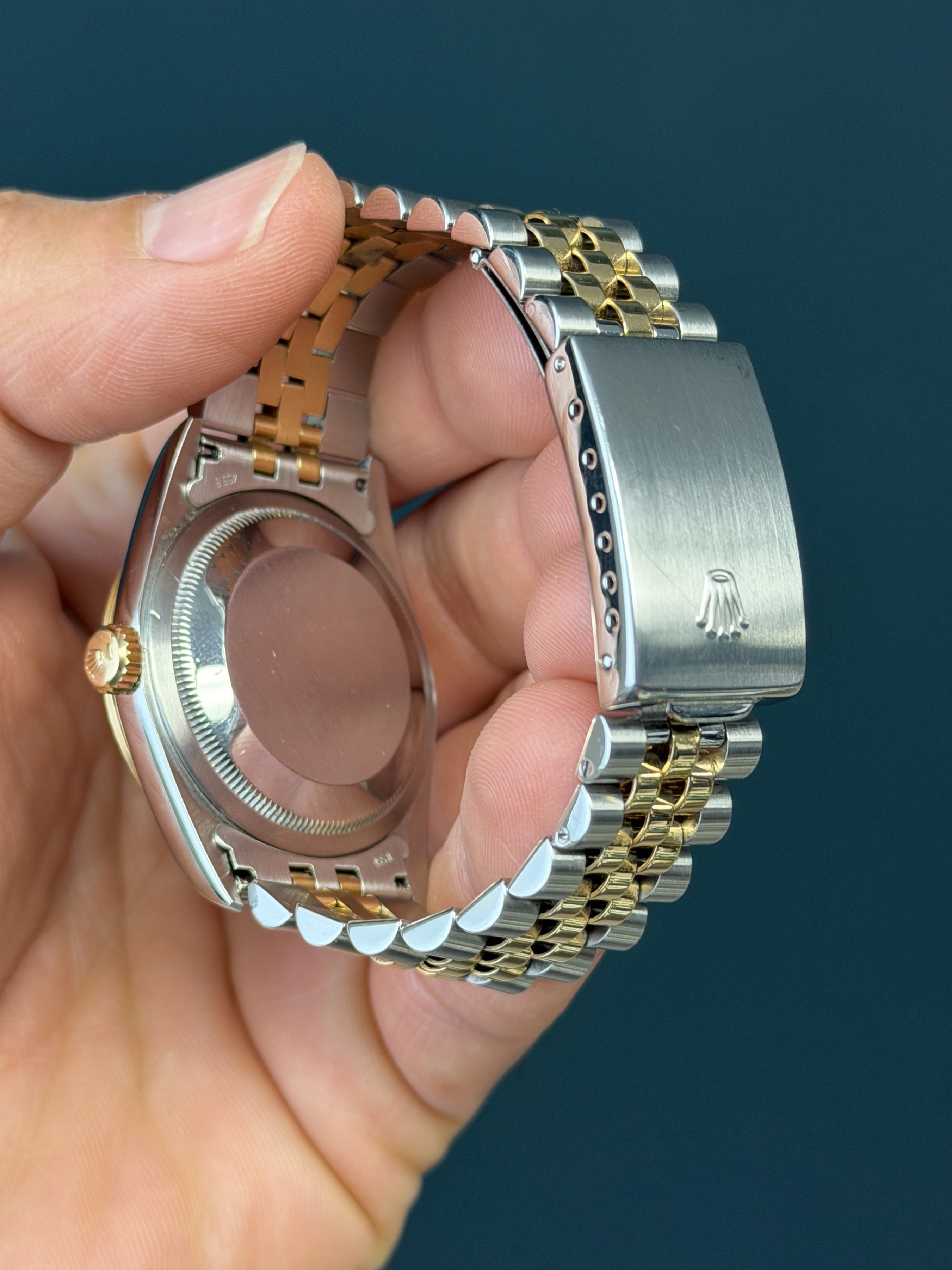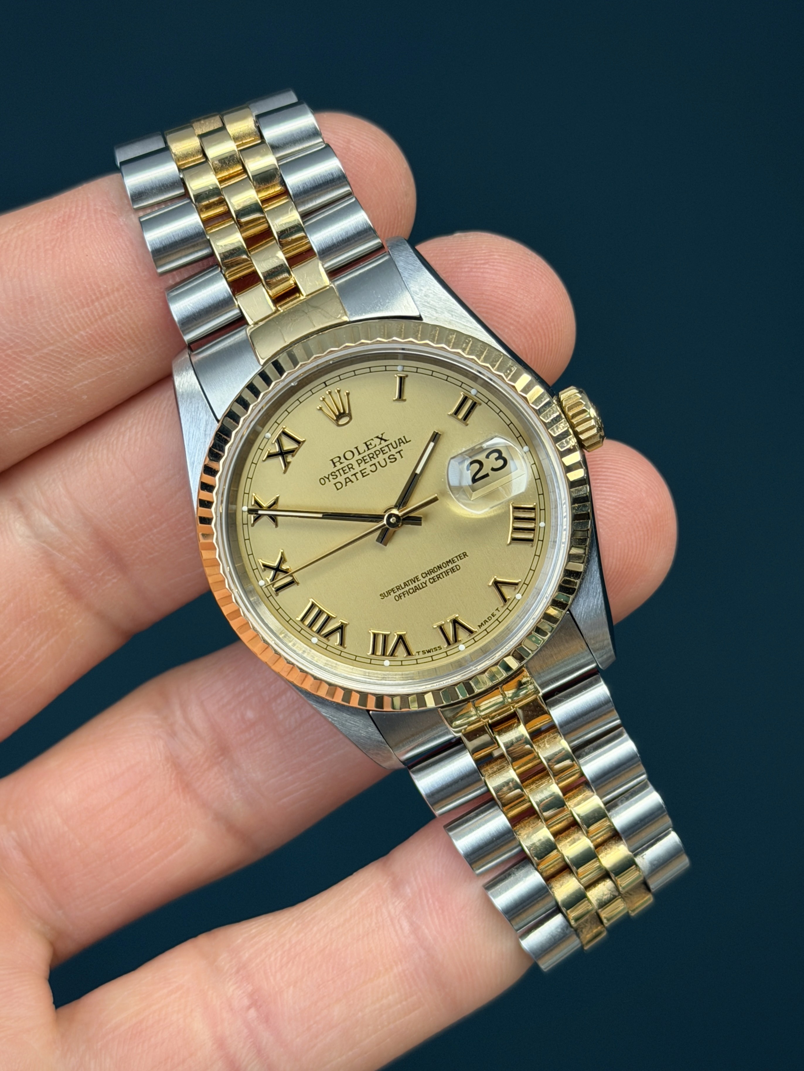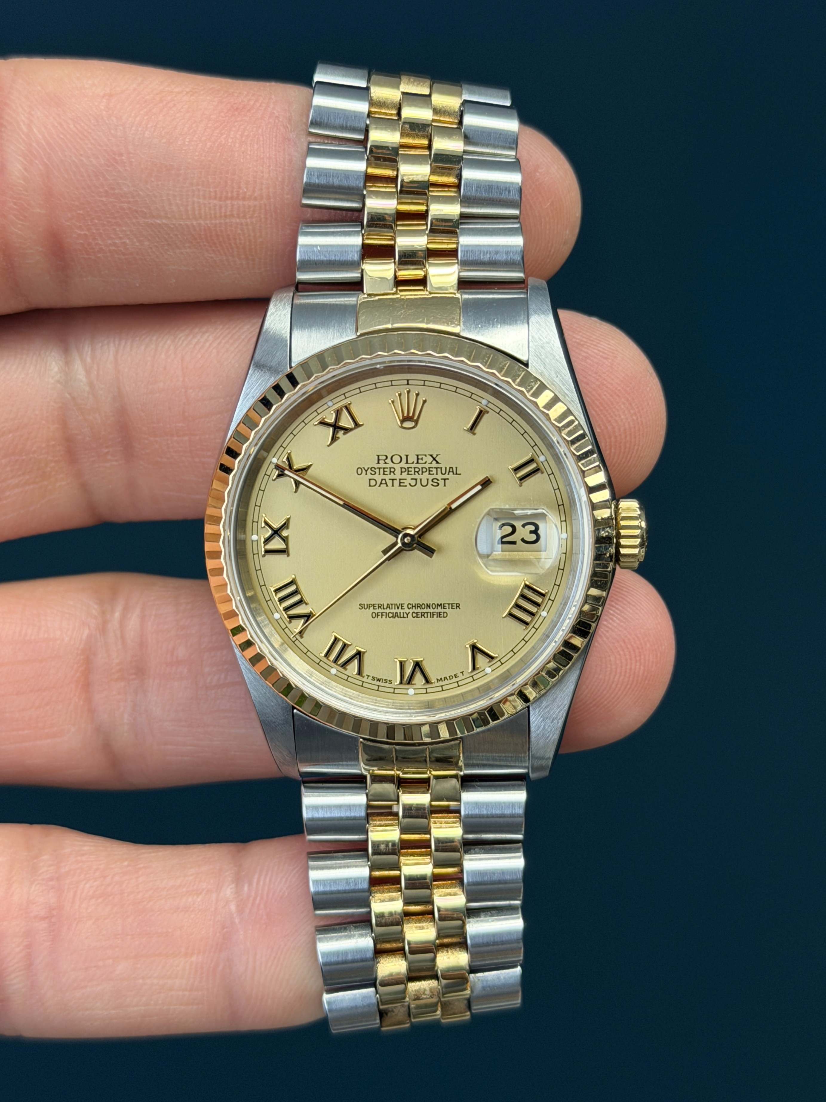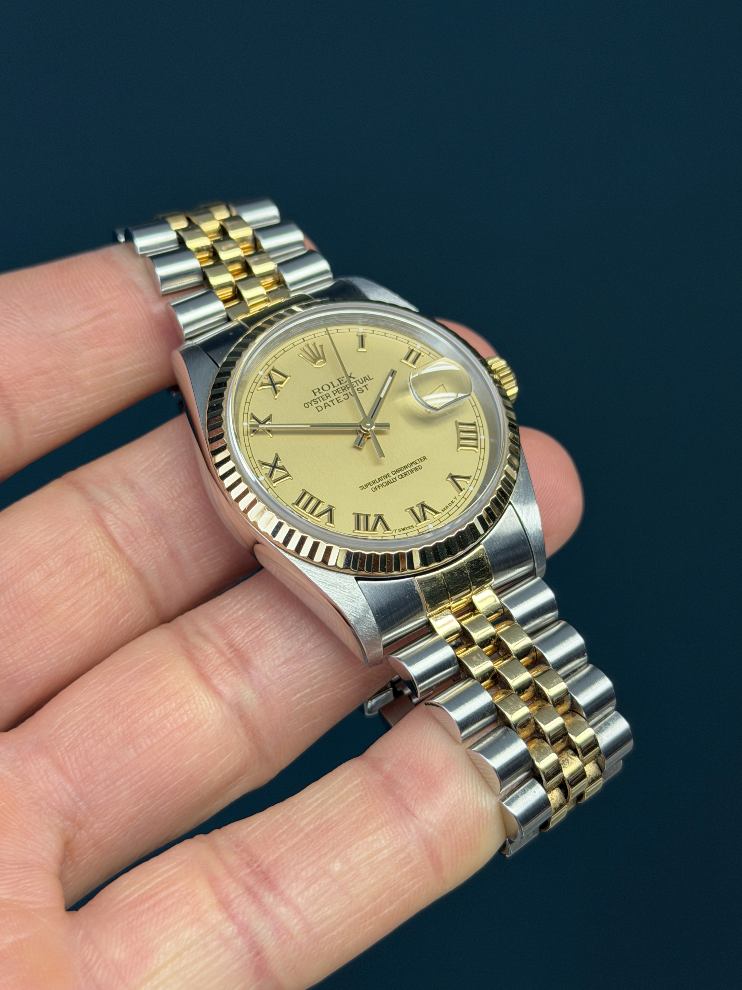 This two-tone Date Just showcases a excellent Champagne Roman dial with black enamel hr markers featuring a date display, exemplifying Rolex's commitment to precision and enduring style. The no holes case is razor sharp. The Saphire crystal is free from wear partnered with its excellent yellow gold fluted bezel. The dial is excellent. The two-tone solid link jubilee bracelet has 3 removable screws with no stretch. Watch is running and keeping time. What a stud of an example!