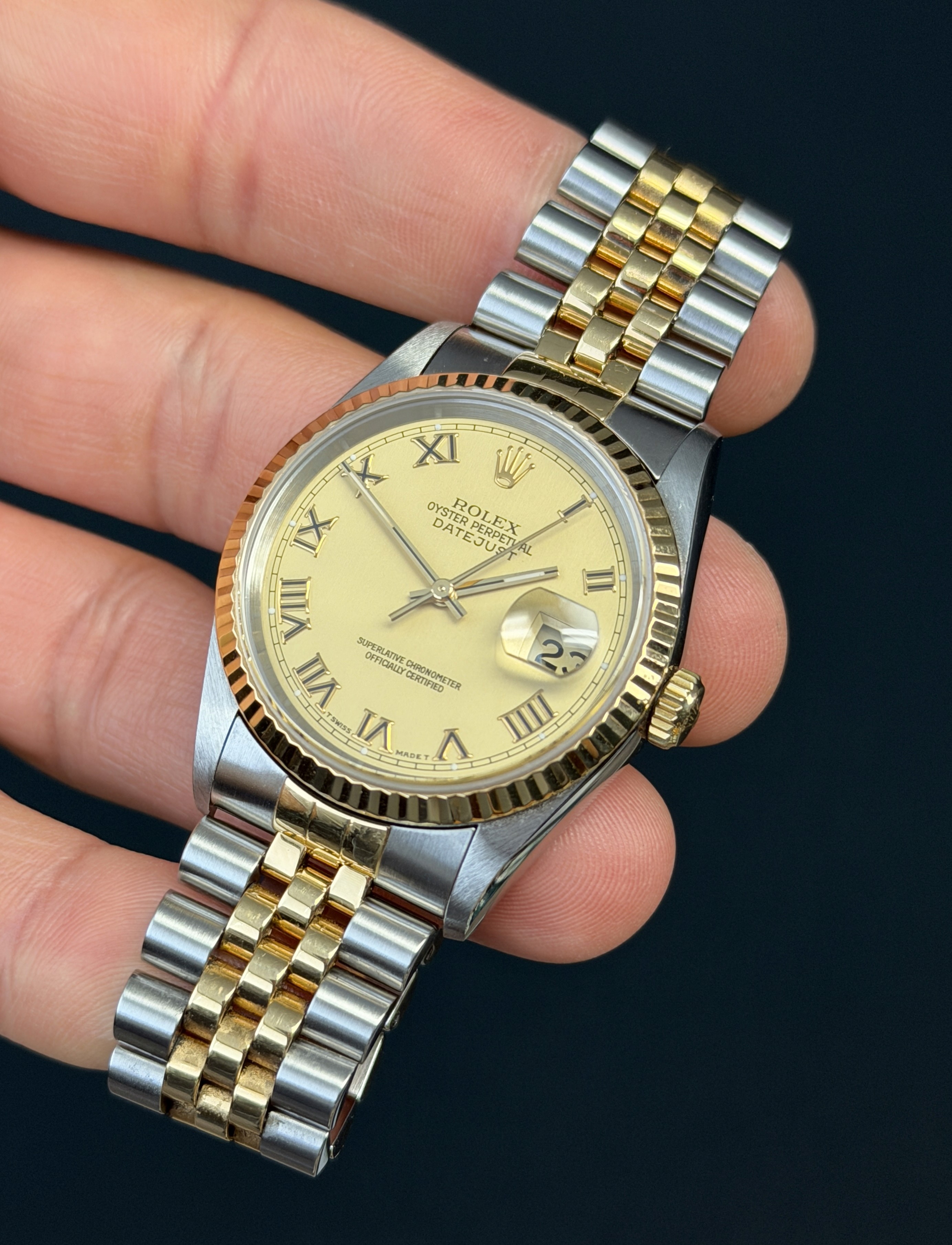 The Rolex Datejust Ref. 16233 is a timeless and elegant timepiece that epitomizes luxury and sophistication. This iconic wristwatch features a striking and rare champagne Roman Dial with black enamel on the hr markers, which adds a touch of opulence and refinement to its classic design. The dial is adorned with meticulously placed hour markers that glisten and catch the light, exuding a sense of prestige. Encased in a beautifully polished stainless steel and 18k yellow gold combination, the watch seamlessly combines durability and style. With its signature Cyclops date magnification window and self-winding movement, the Rolex Datejust Ref. 16233 is not only a symbol of horological excellence but also a statement of timeless elegance for those who appreciate the finer things in life.