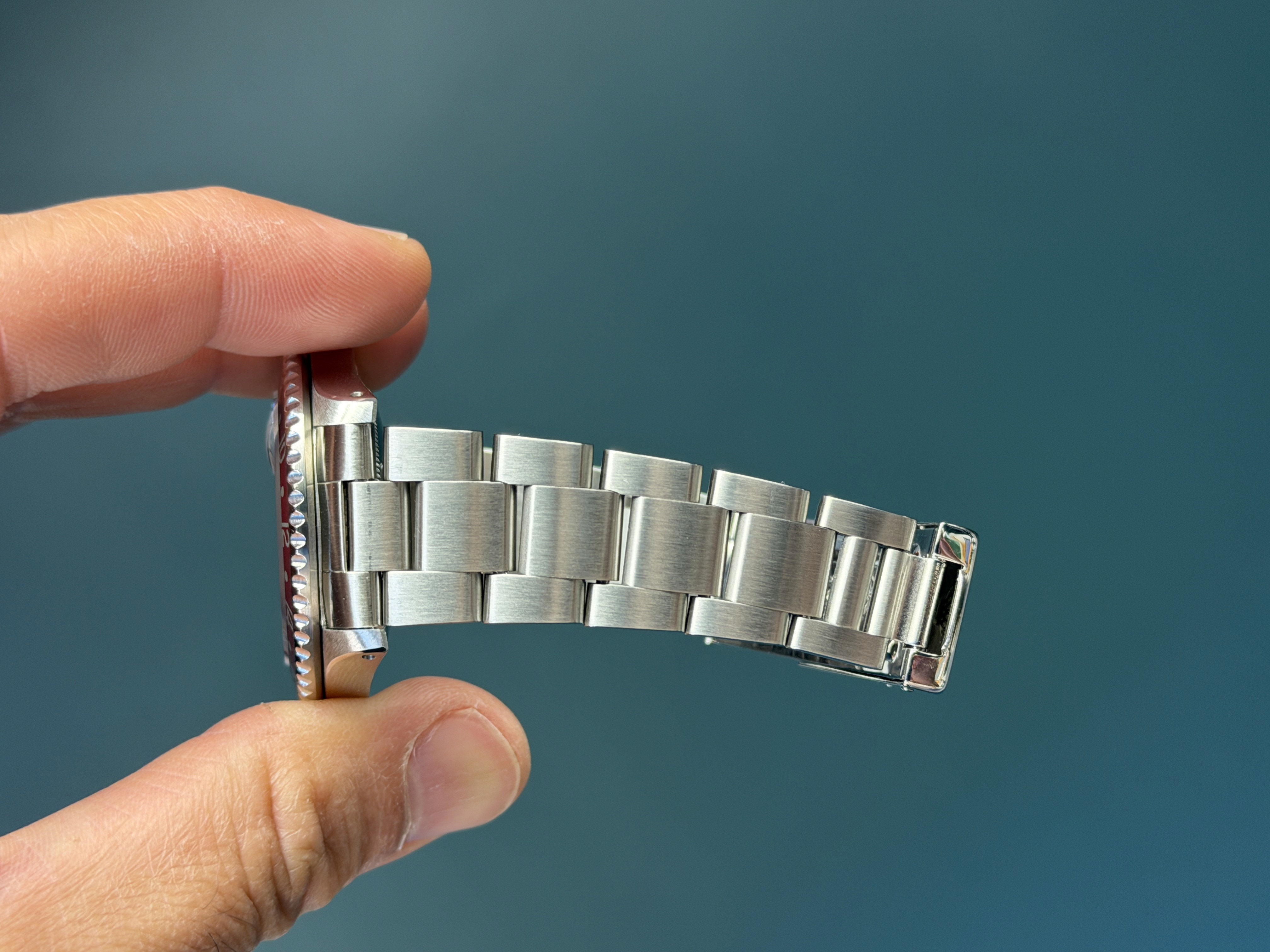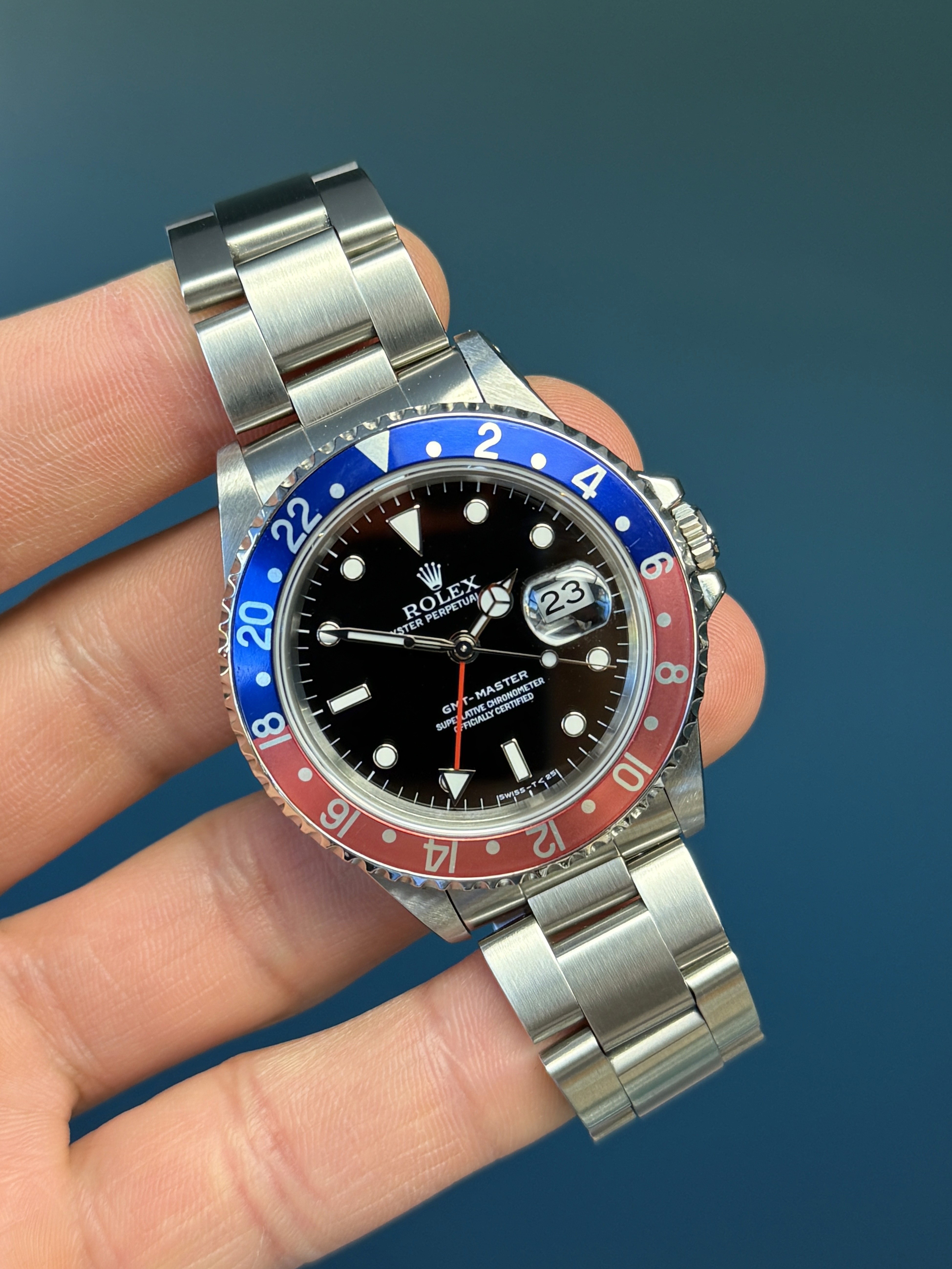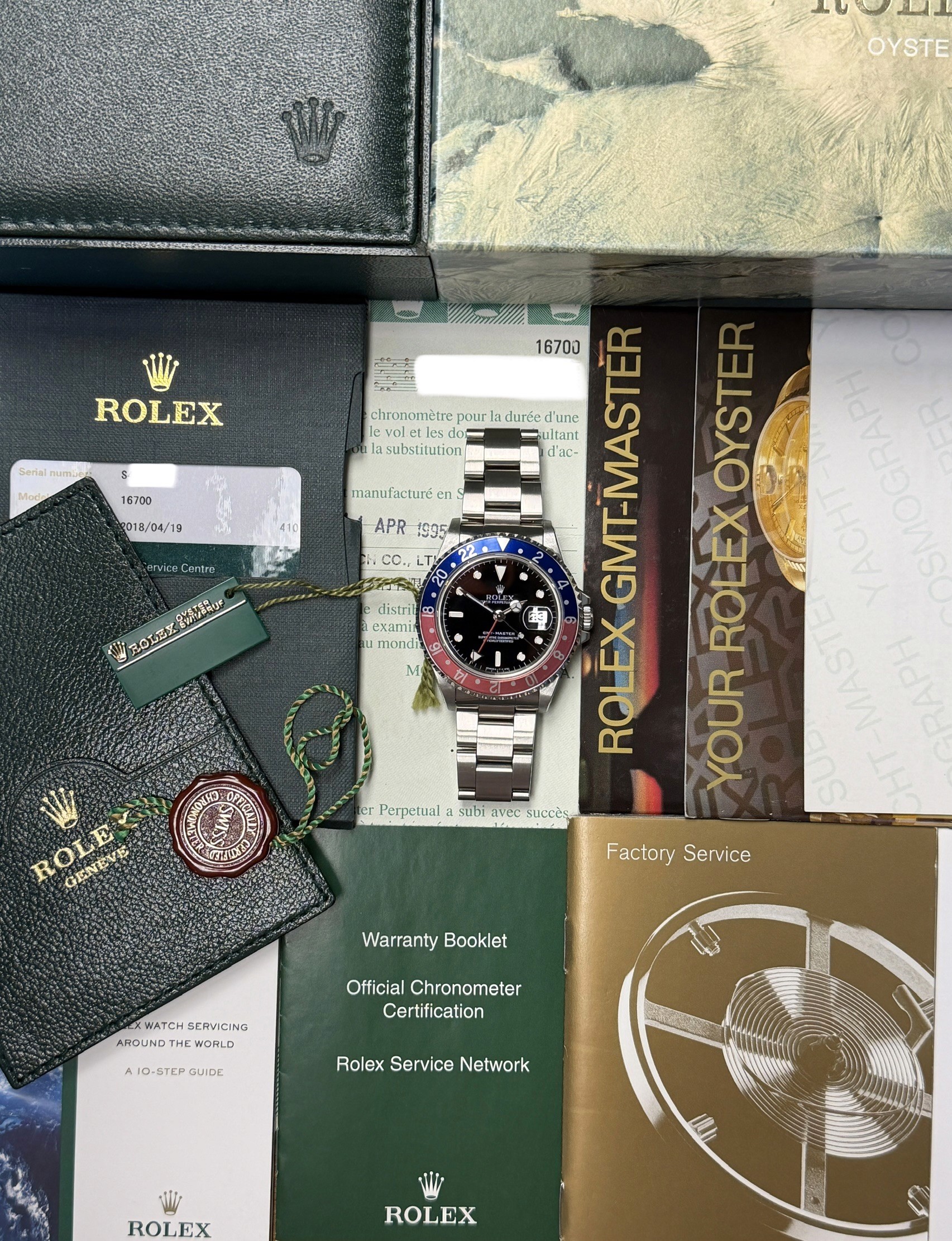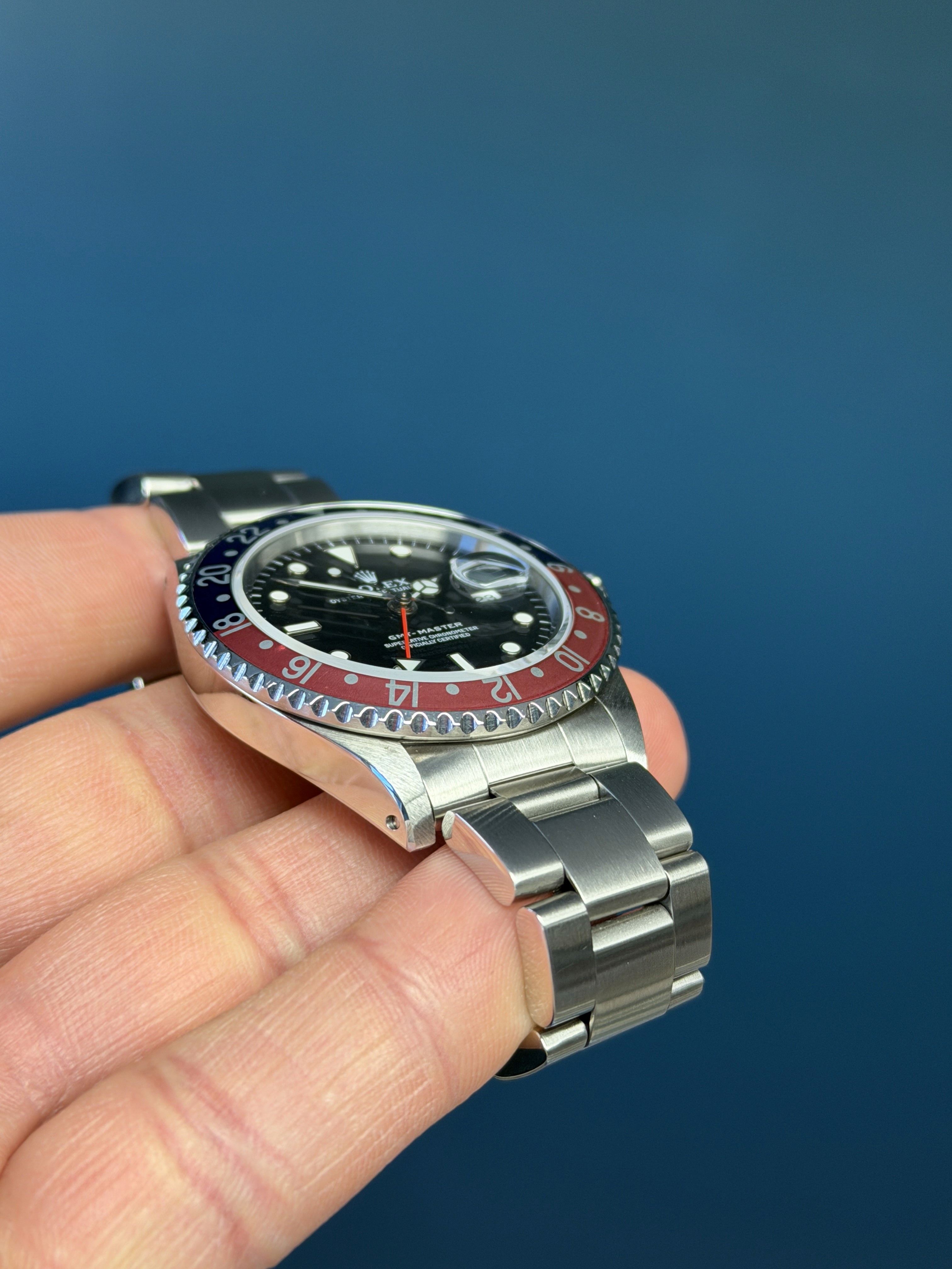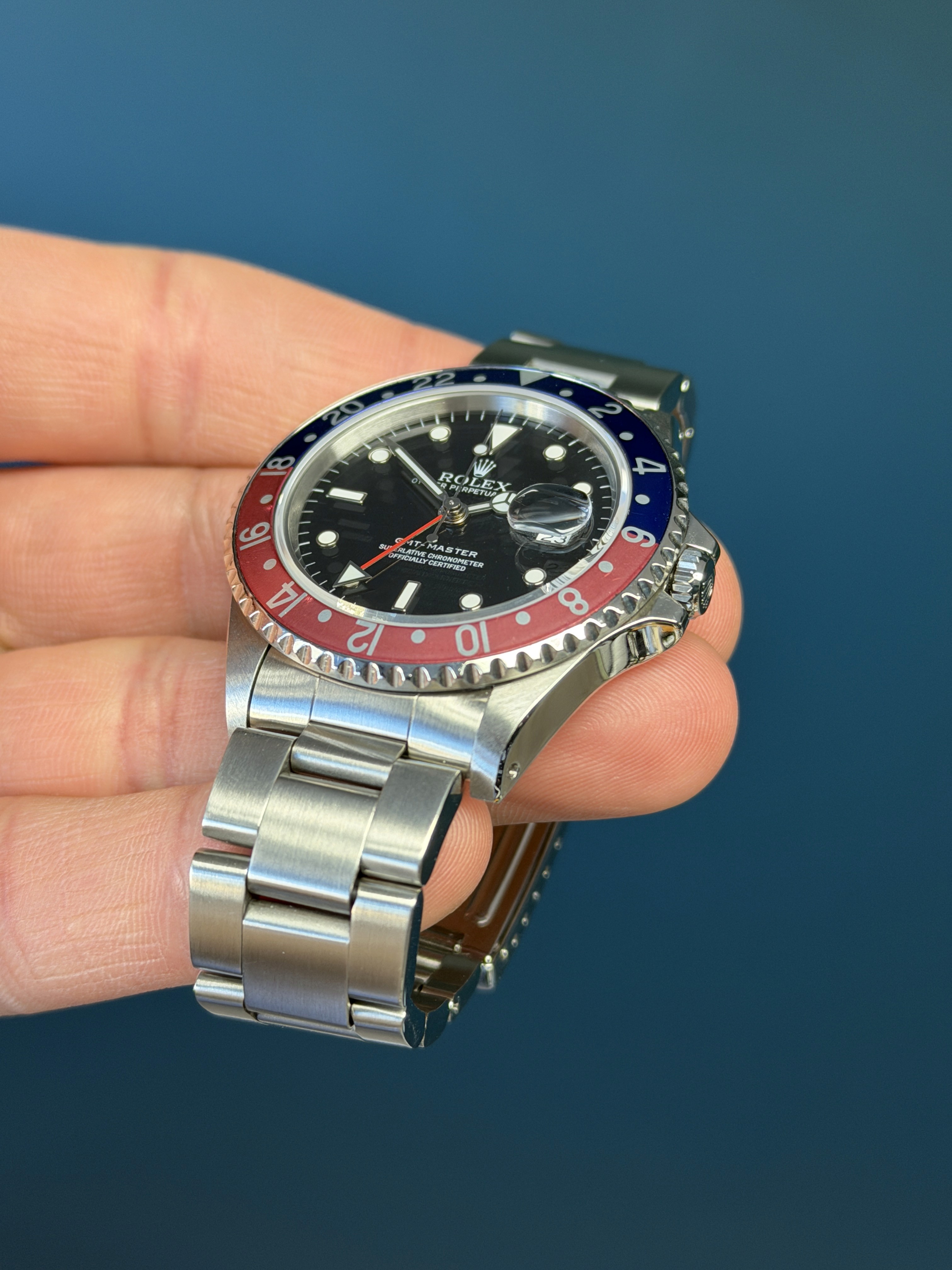 Today's example is in excellent mint retail ready condition and is accompanied by its full complete set. Papers on this set are dated 4/1995. The Pepsi insert is excellent. The dial is excellent showing warm matching patina throughout. The case has razor sharp lugs. The bracelet has 12 links and shows no stretch. Also comes with Rolex Service Center card dated 4/19/18 and running COSC. Here is an excellent vintage Pepsi GMT with a great look, lots of character and all the goodies.