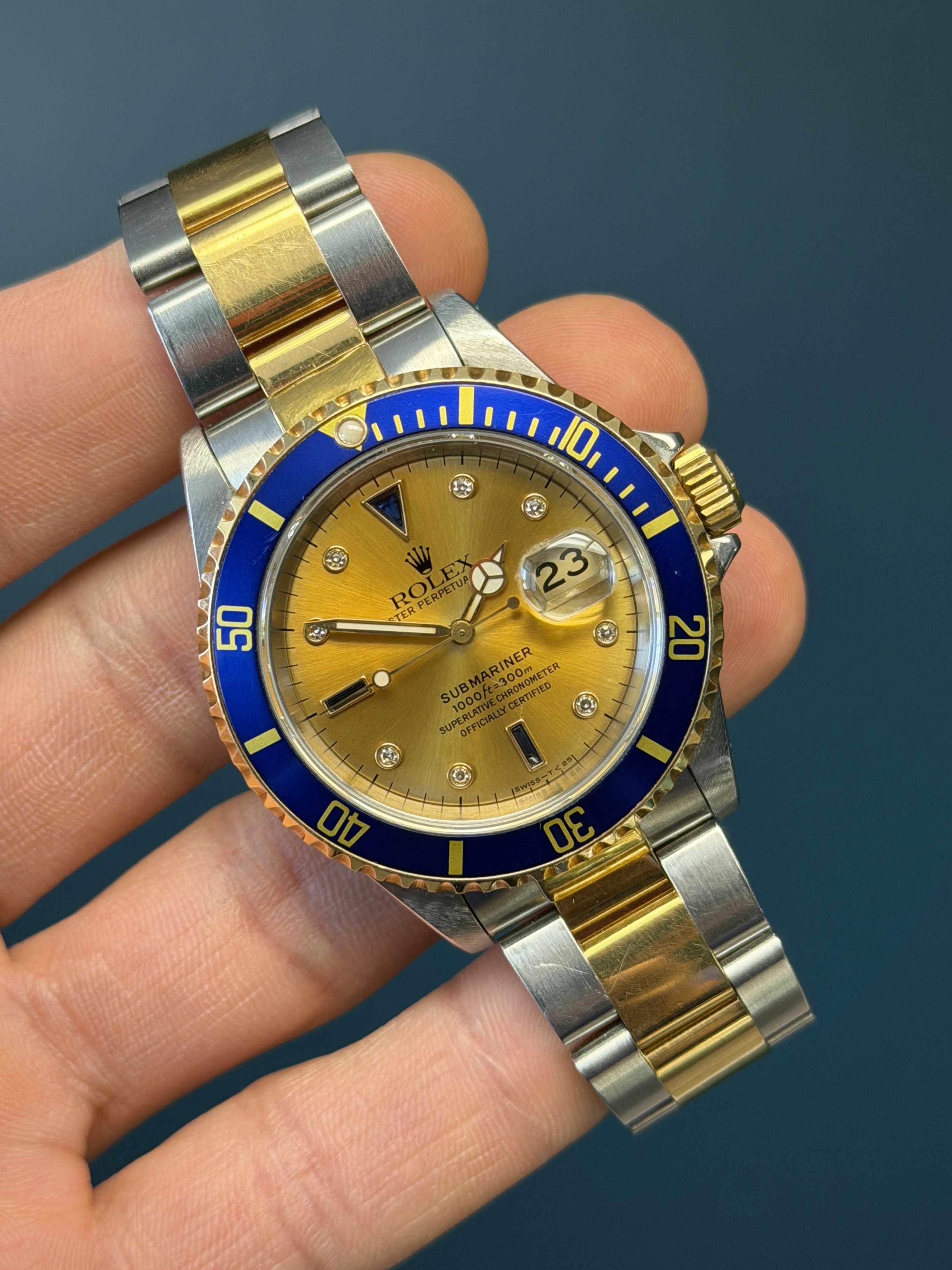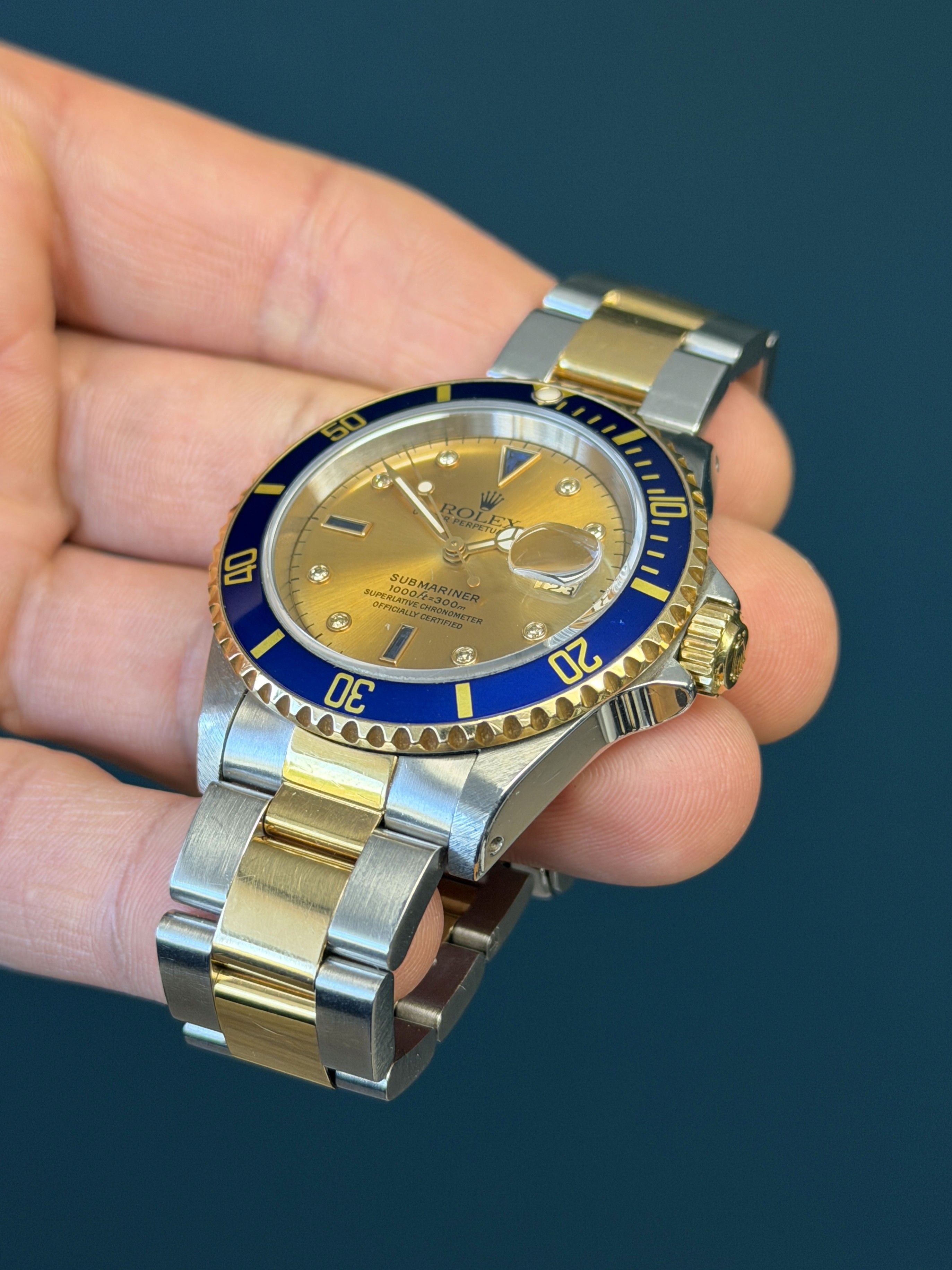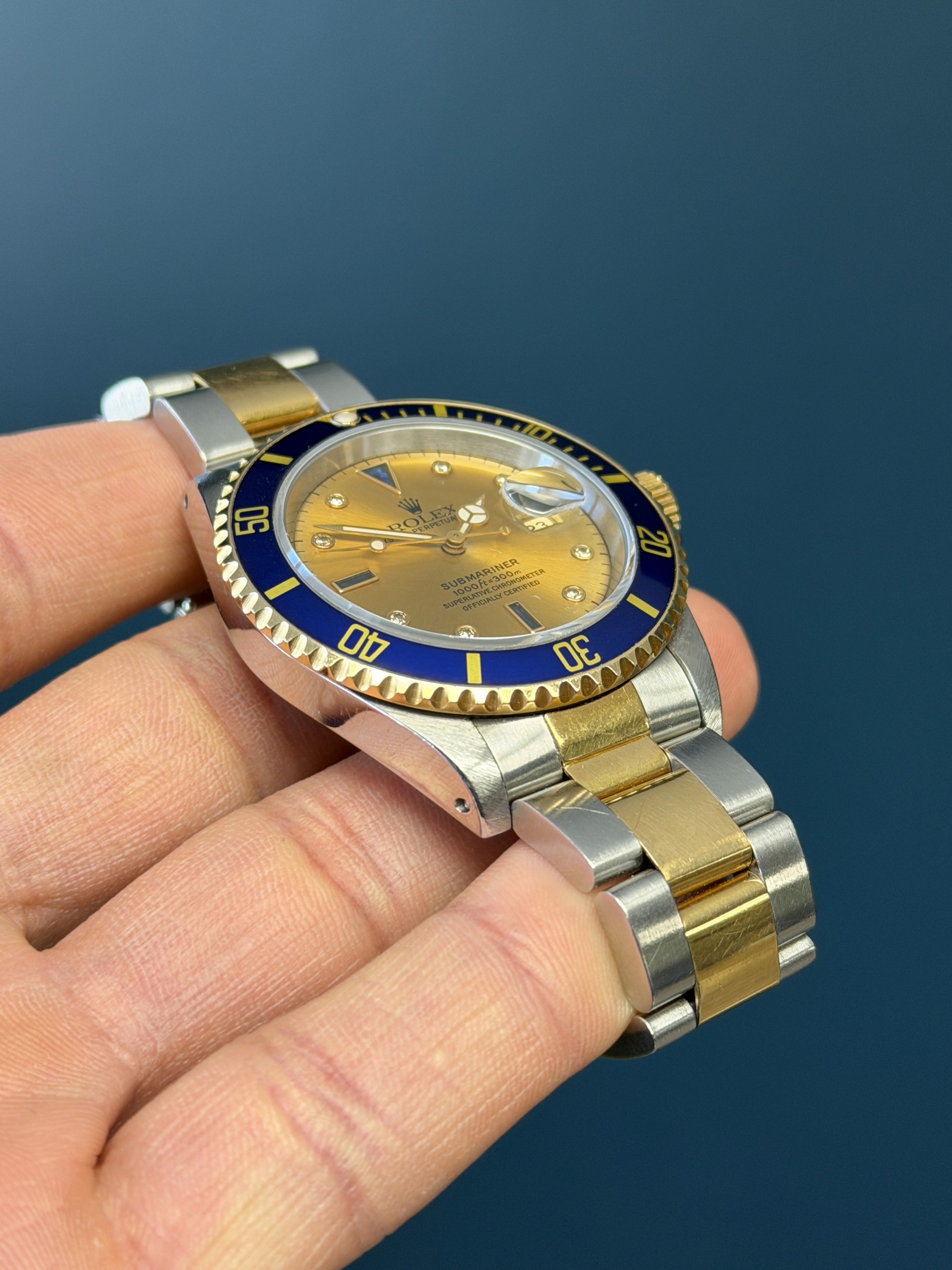 The Rolex Submariner Reference 16613 with a rare Tropical toned factory sapphire diamond Serti dial is a rare and striking blend of luxury and professional dive-watch heritage. Crafted in Rolex’s signature Rolesor construction of stainless steel and 18k yellow gold, it pairs a robust 40mm Oyster case with refined gold accents.