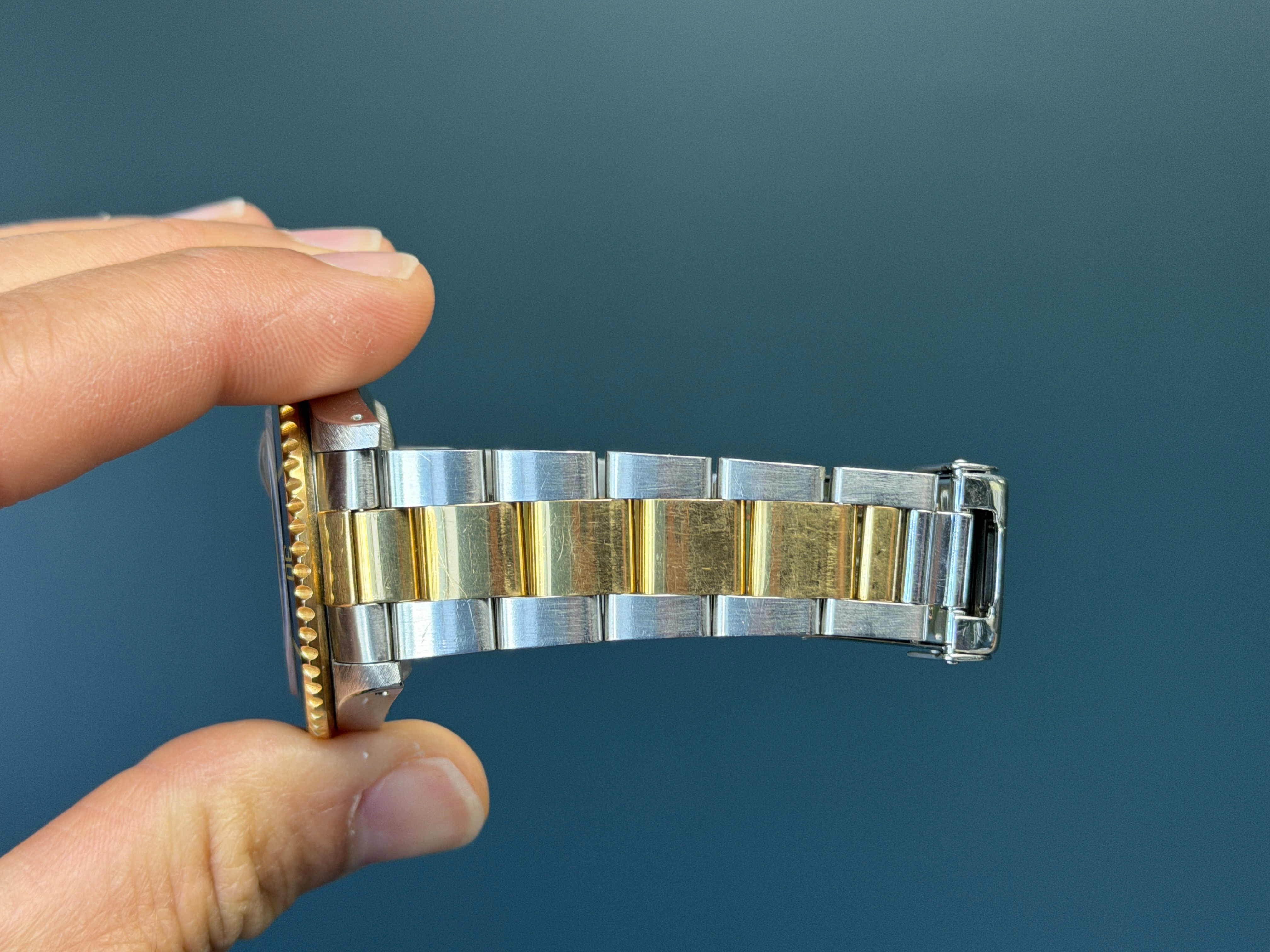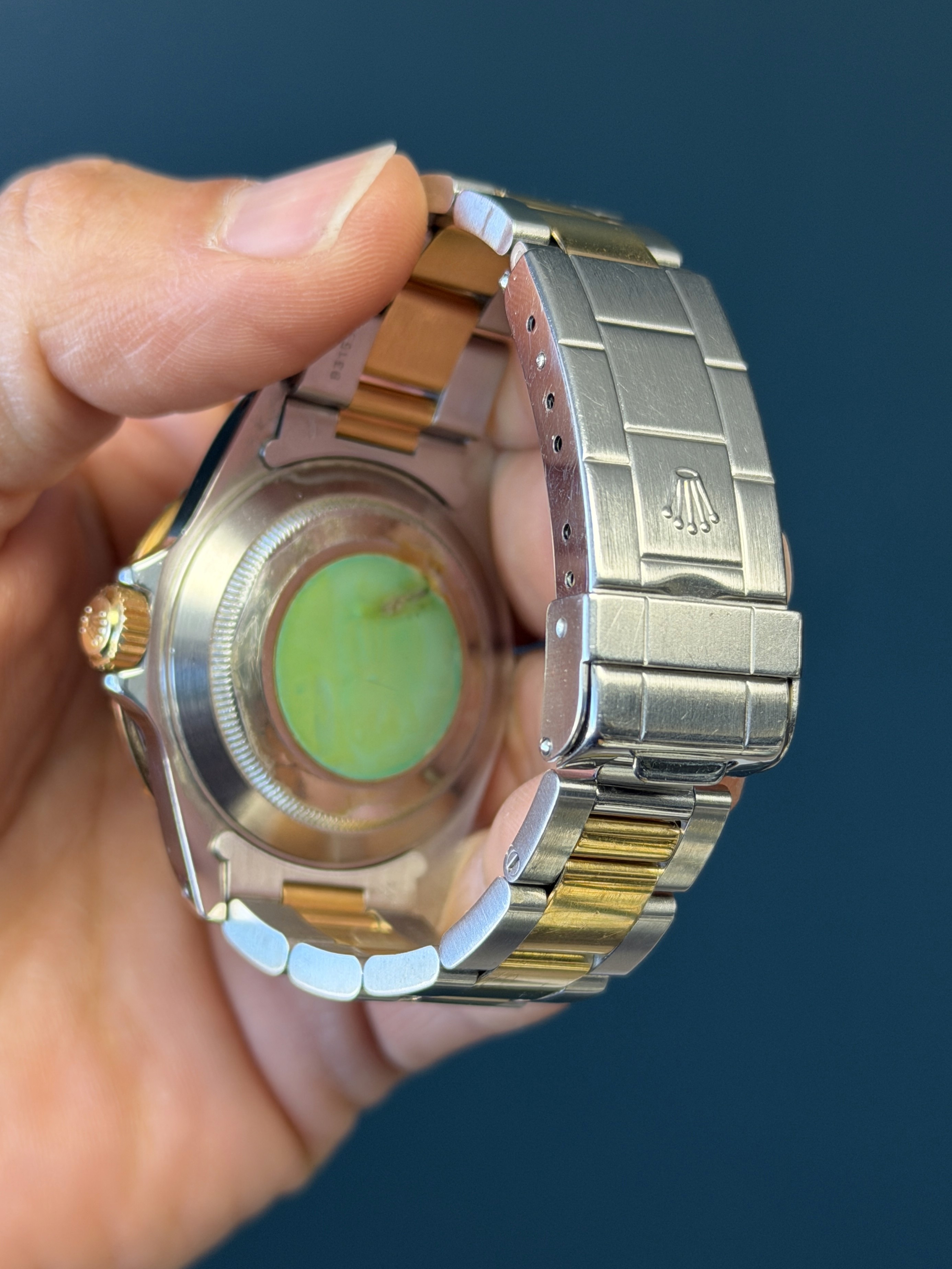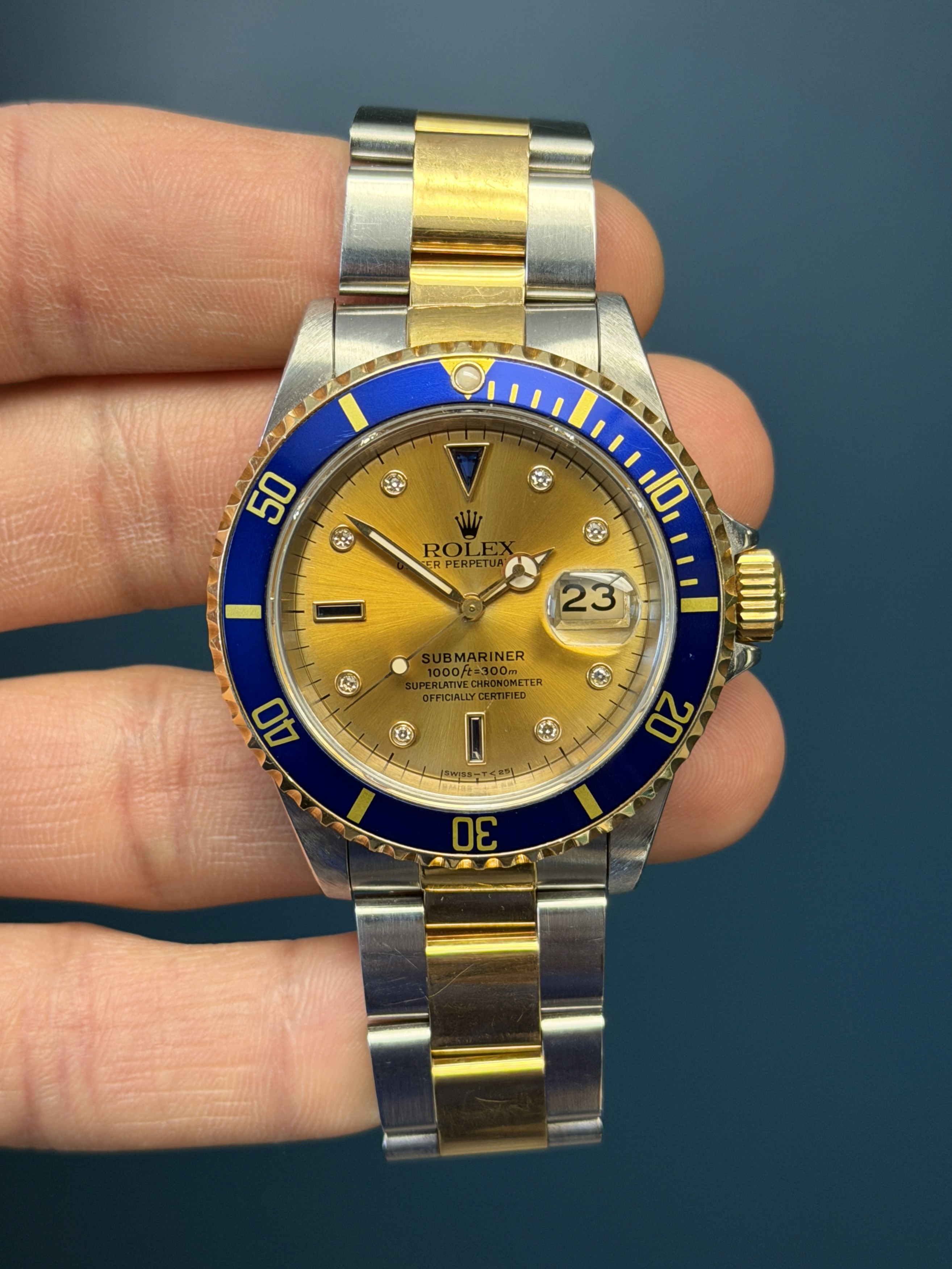 The Rolex Submariner Reference 16613 with a rare Tropical toned factory sapphire diamond Serti dial is a rare and striking blend of luxury and professional dive-watch heritage. Crafted in Rolex’s signature Rolesor construction of stainless steel and 18k yellow gold, it pairs a robust 40mm Oyster case with refined gold accents.