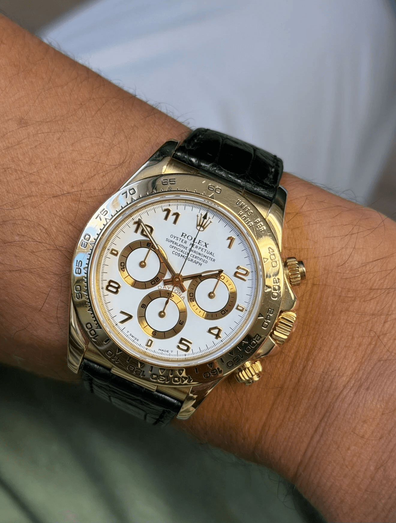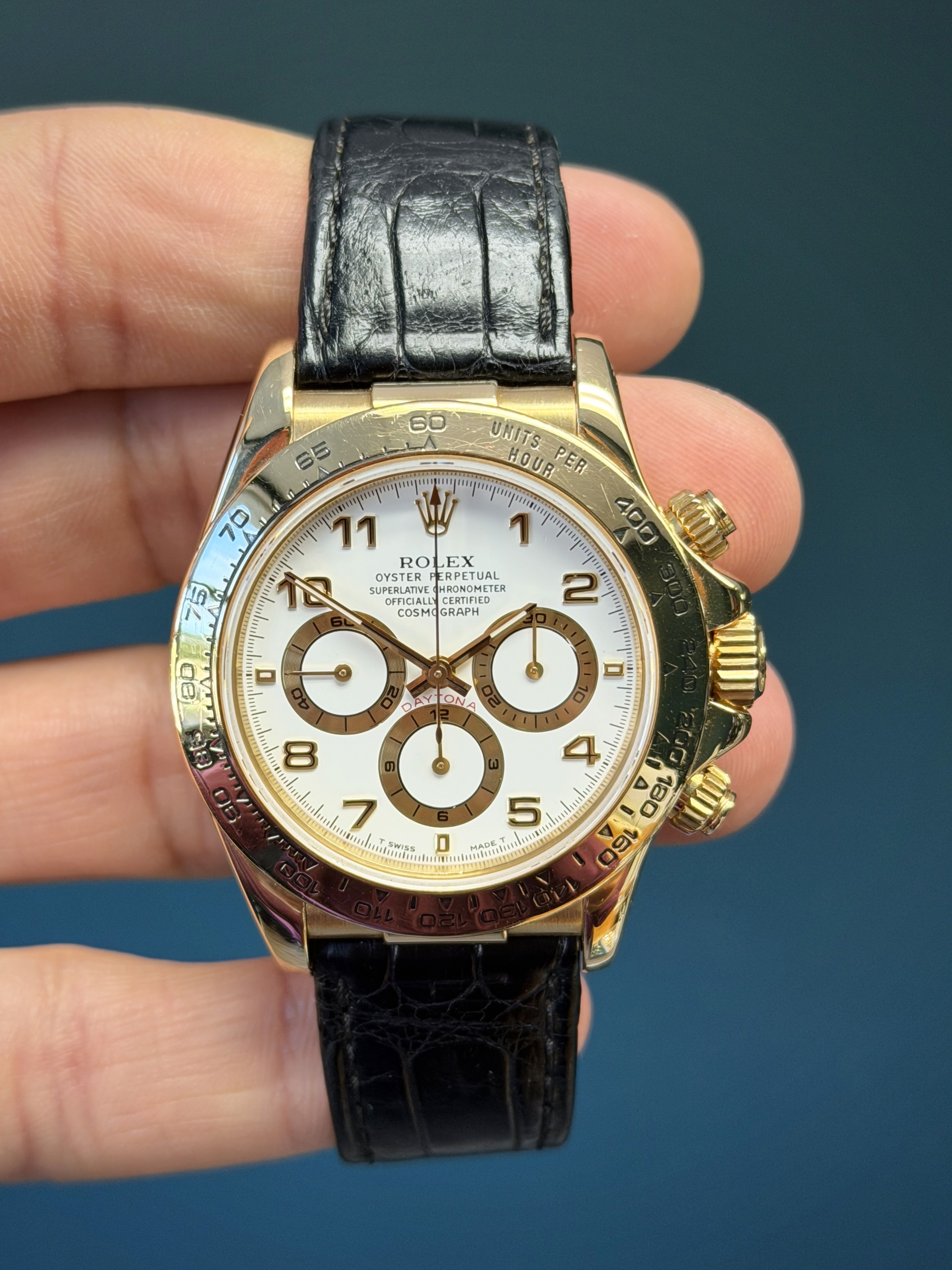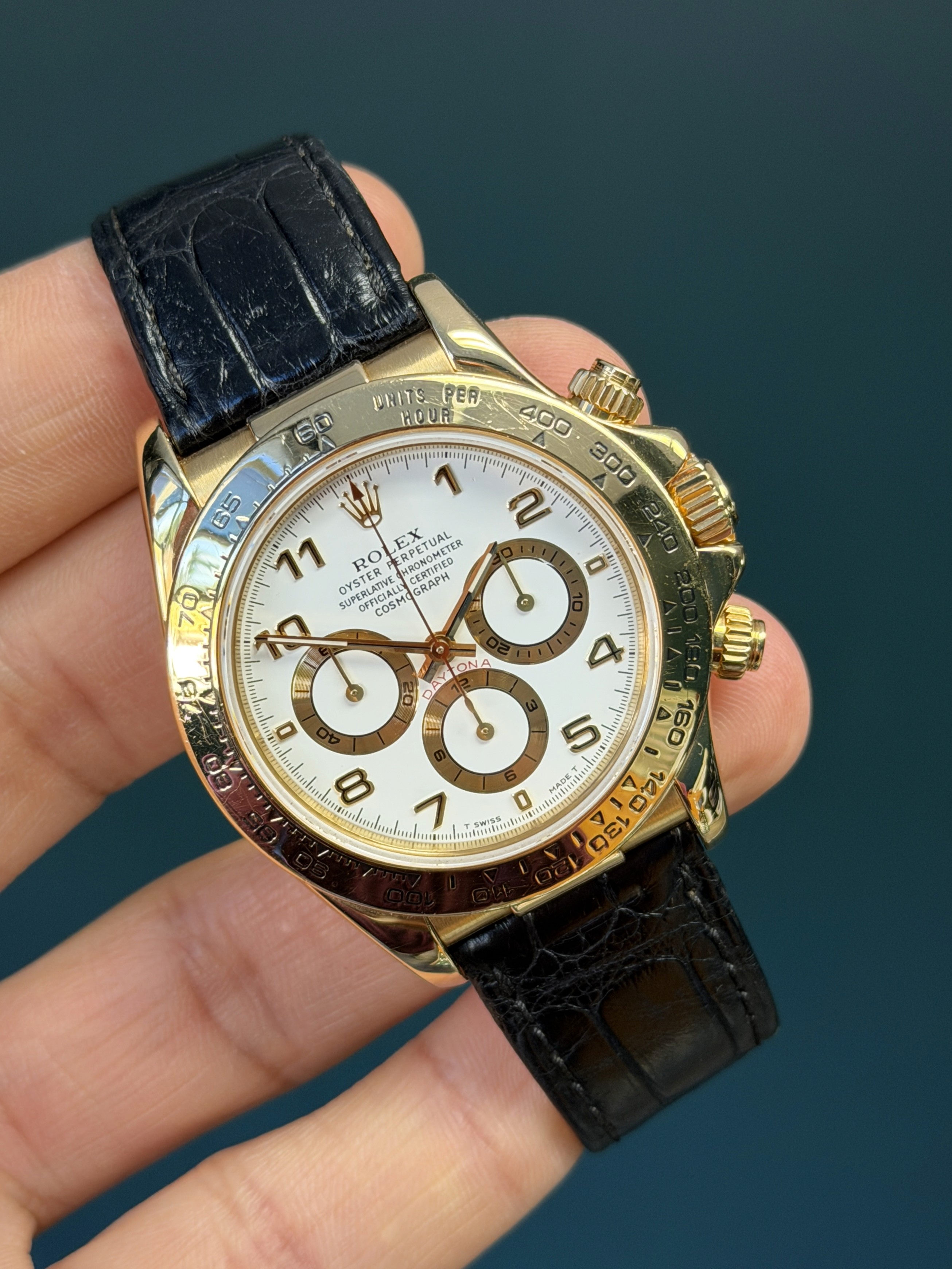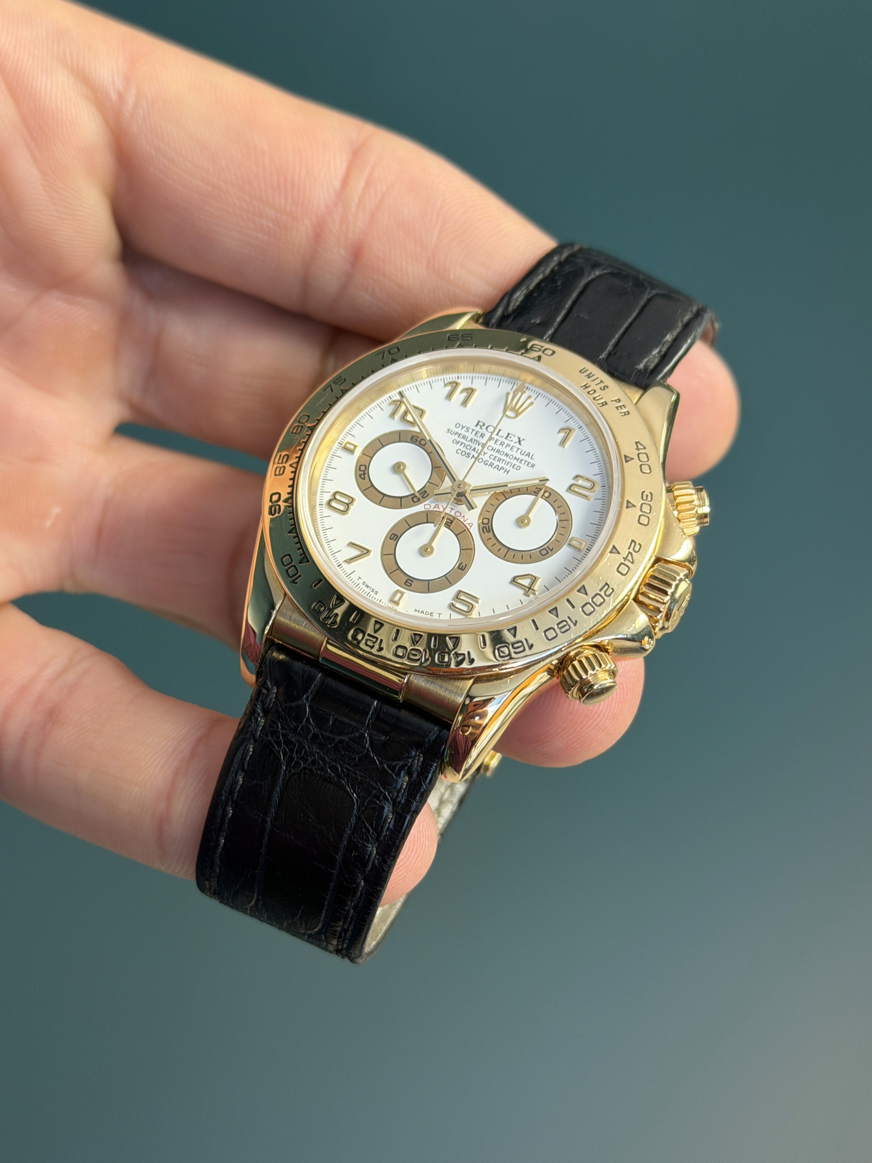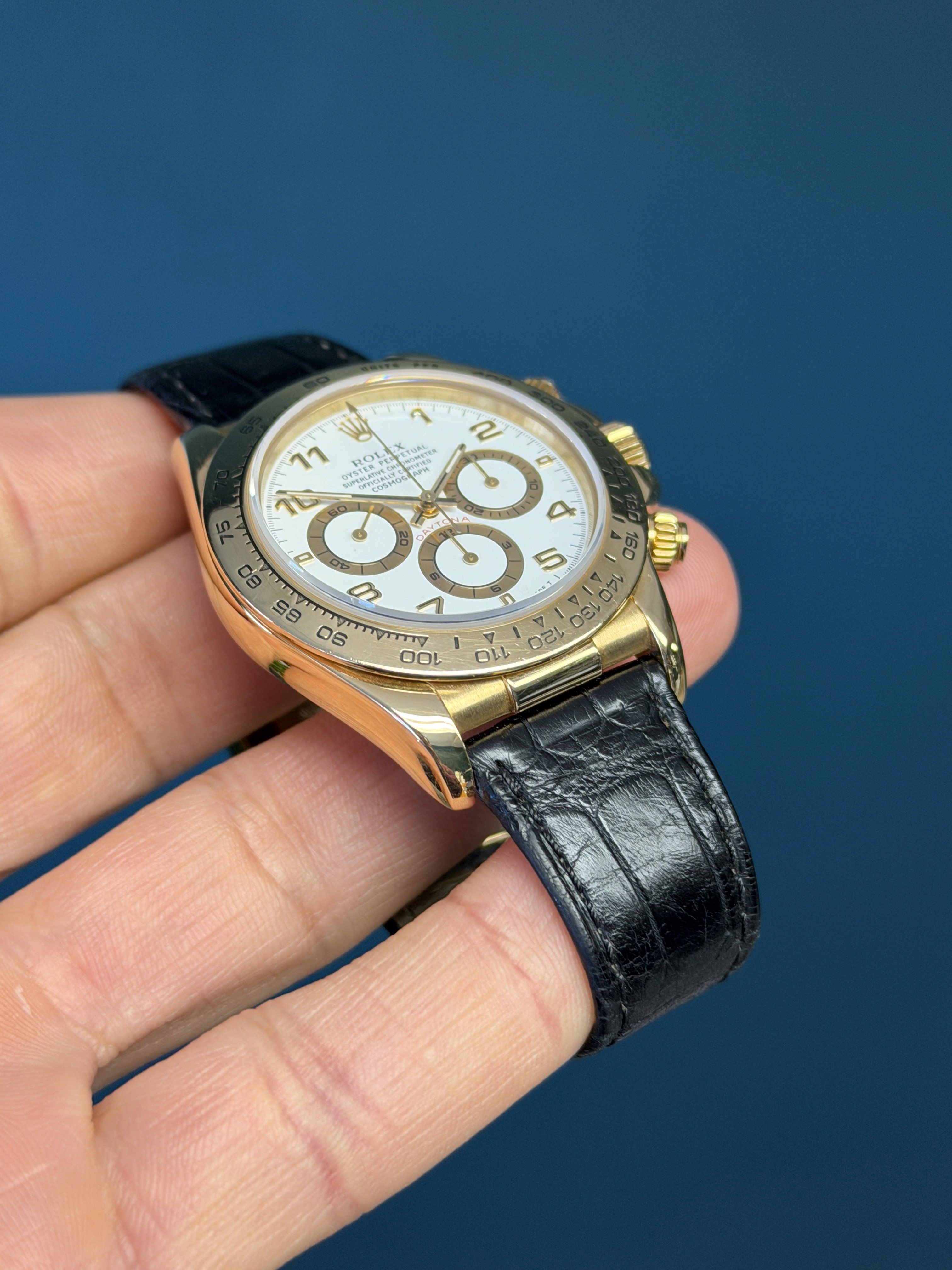 This example is fitted with the striking white Arabic numeral dial, one of the most desirable and visually distinctive configurations offered for the 16518. The crisp white dial provides a bold contrast against the warm yellow gold case, while the applied Arabic numerals and contrasting sub-dials deliver exceptional legibility and a dynamic, sporty aesthetic rarely seen on gold Daytonas. The tachymeter scale on the bezel reinforces the model’s racing heritage.