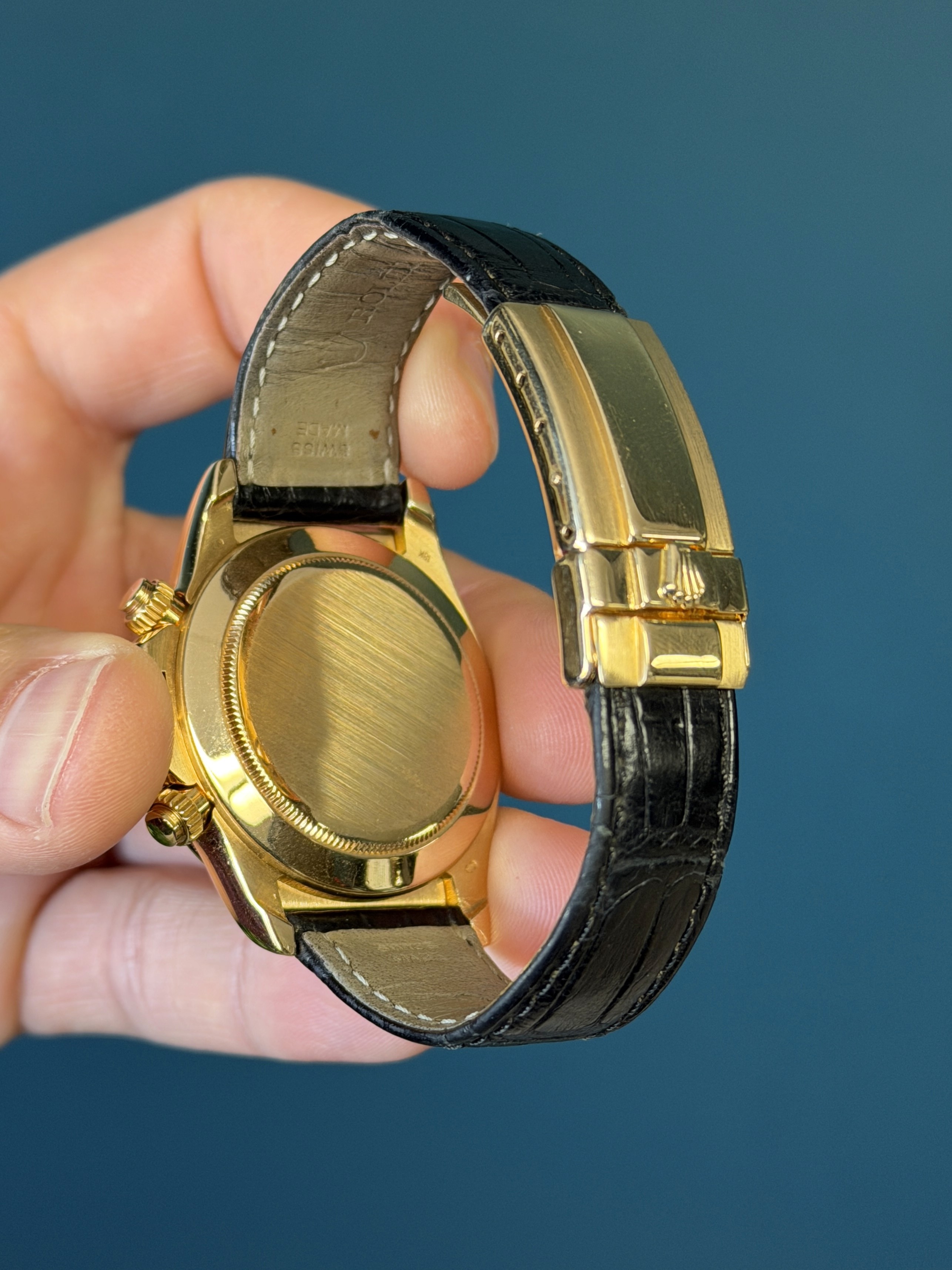 The Rolex Zenith Daytona Reference 16518 is a highly coveted expression of the iconic Daytona, distinguished by its luxurious construction and legendary movement. Crafted in 18k yellow gold, this reference belongs to the celebrated Zenith-era Daytonas, powered by the revered automatic chronograph caliber that helped define an entire generation of Rolex sports watches.