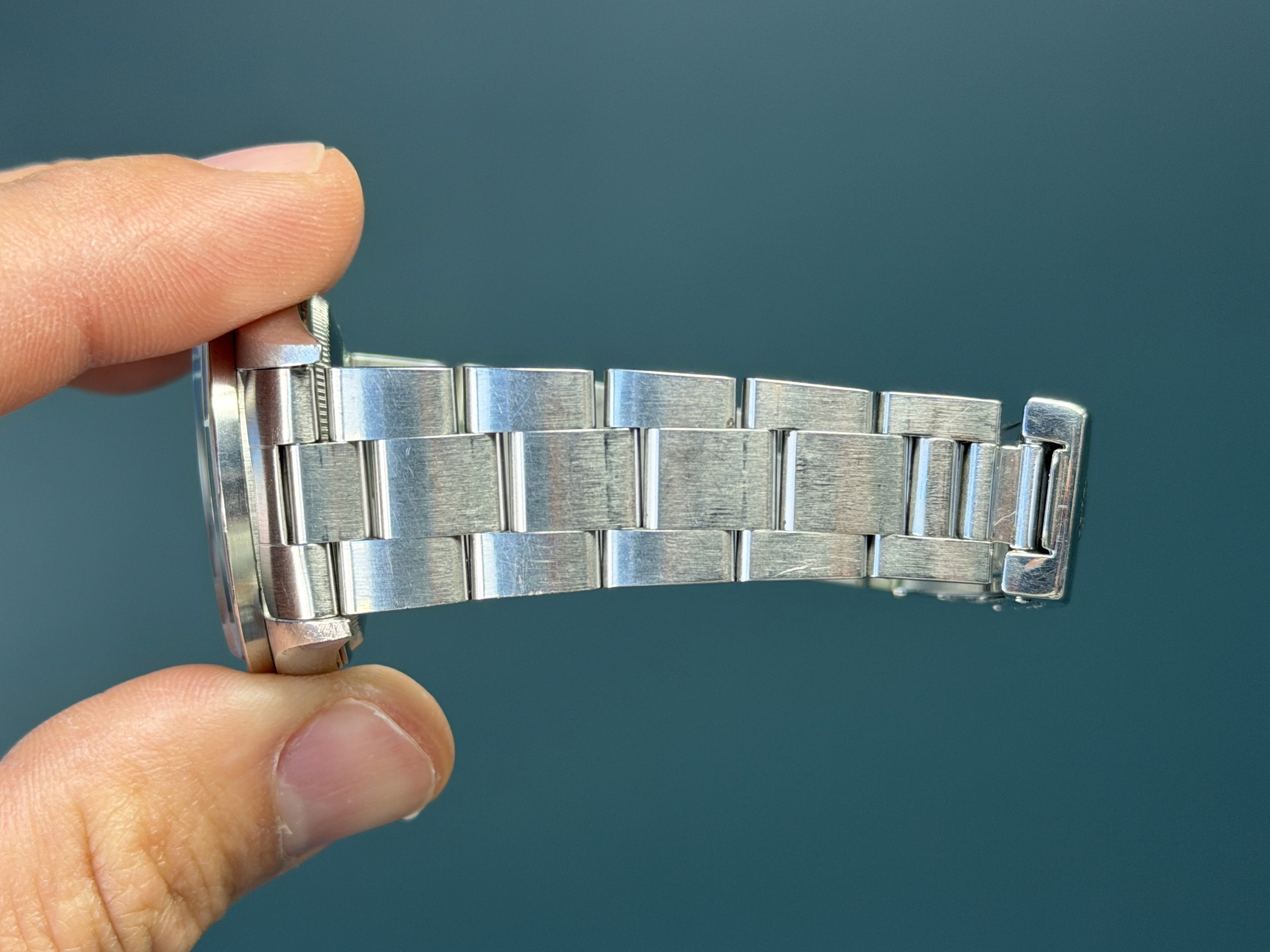 Today's example comes to us a full set dated 11/96 and is in excellent condition. The no holes case and engine-turn bezel are sharp and unpolished. The cream tropical dial has excellent color charm. The bracelet has 12 links and shows no stretch. An excellent example in its reference class accompanied by its full complete set ready to go.
