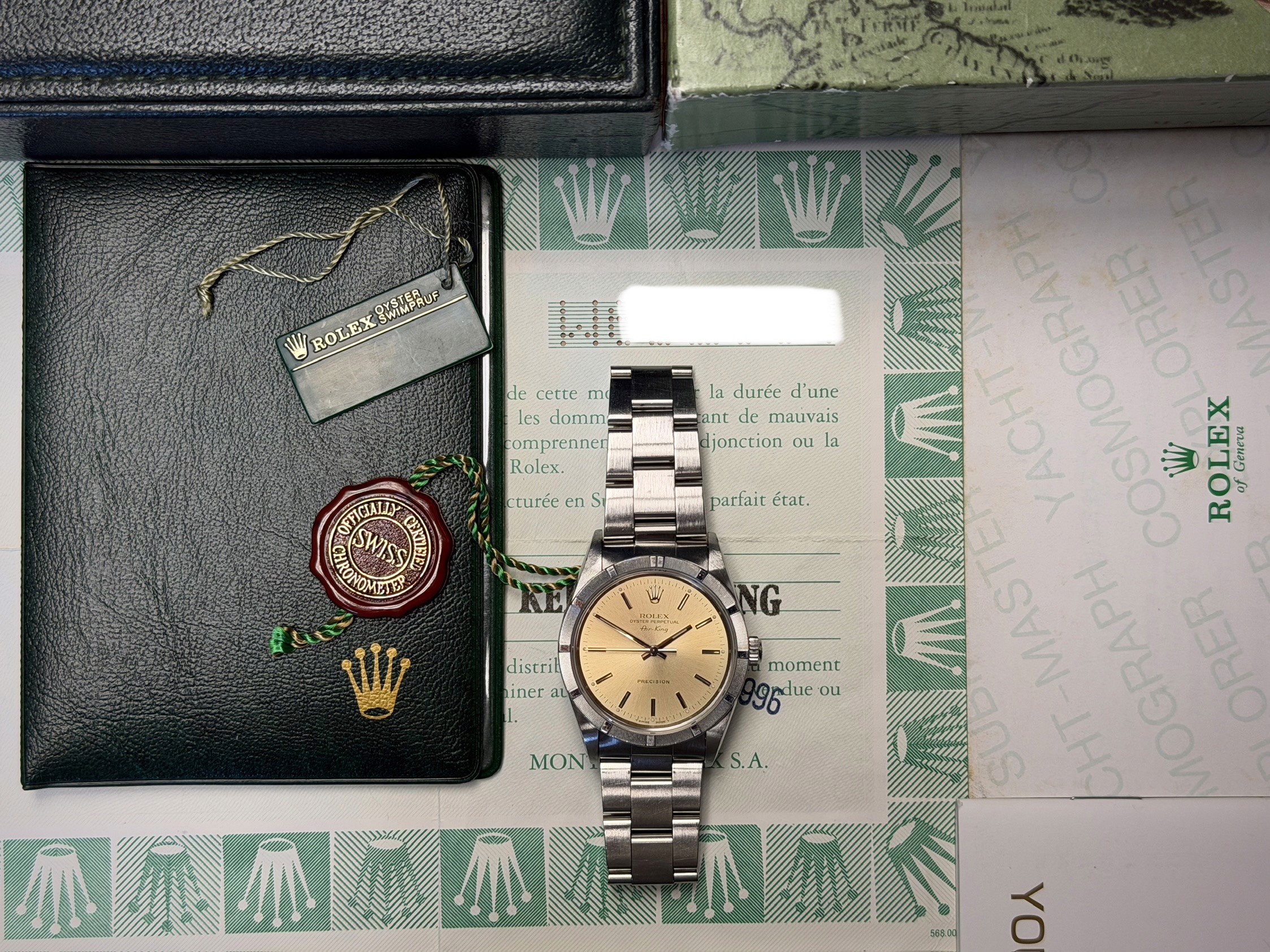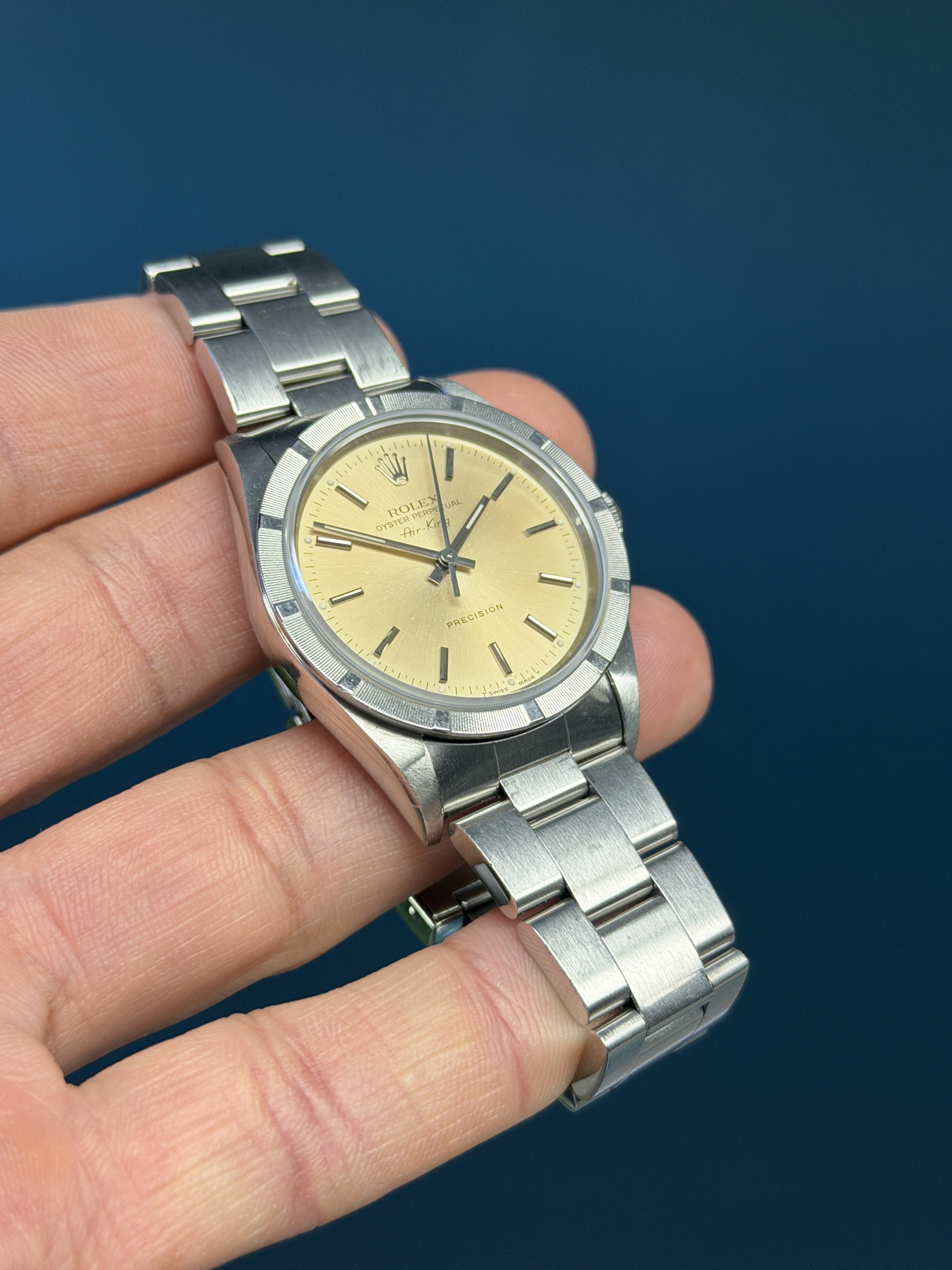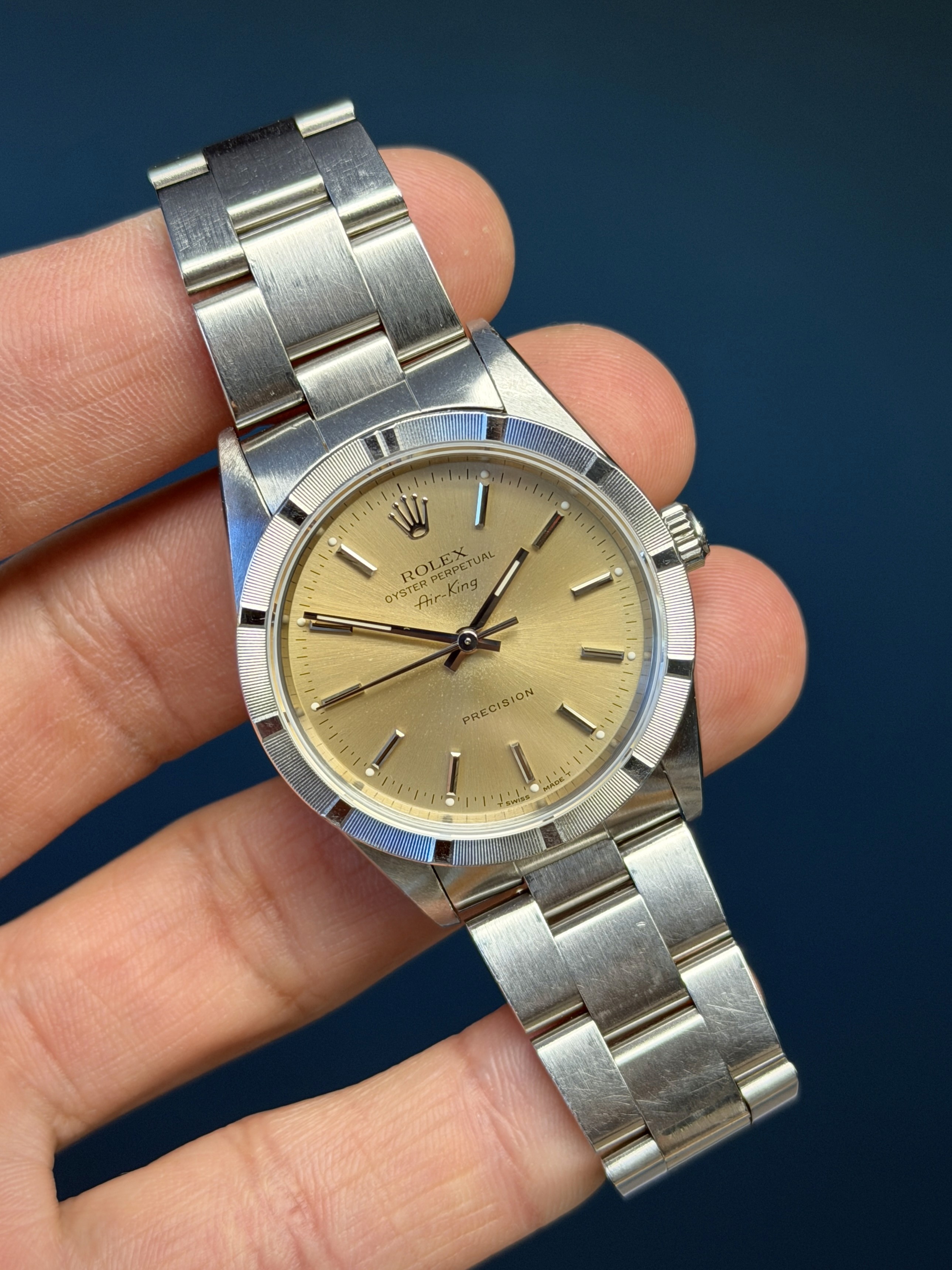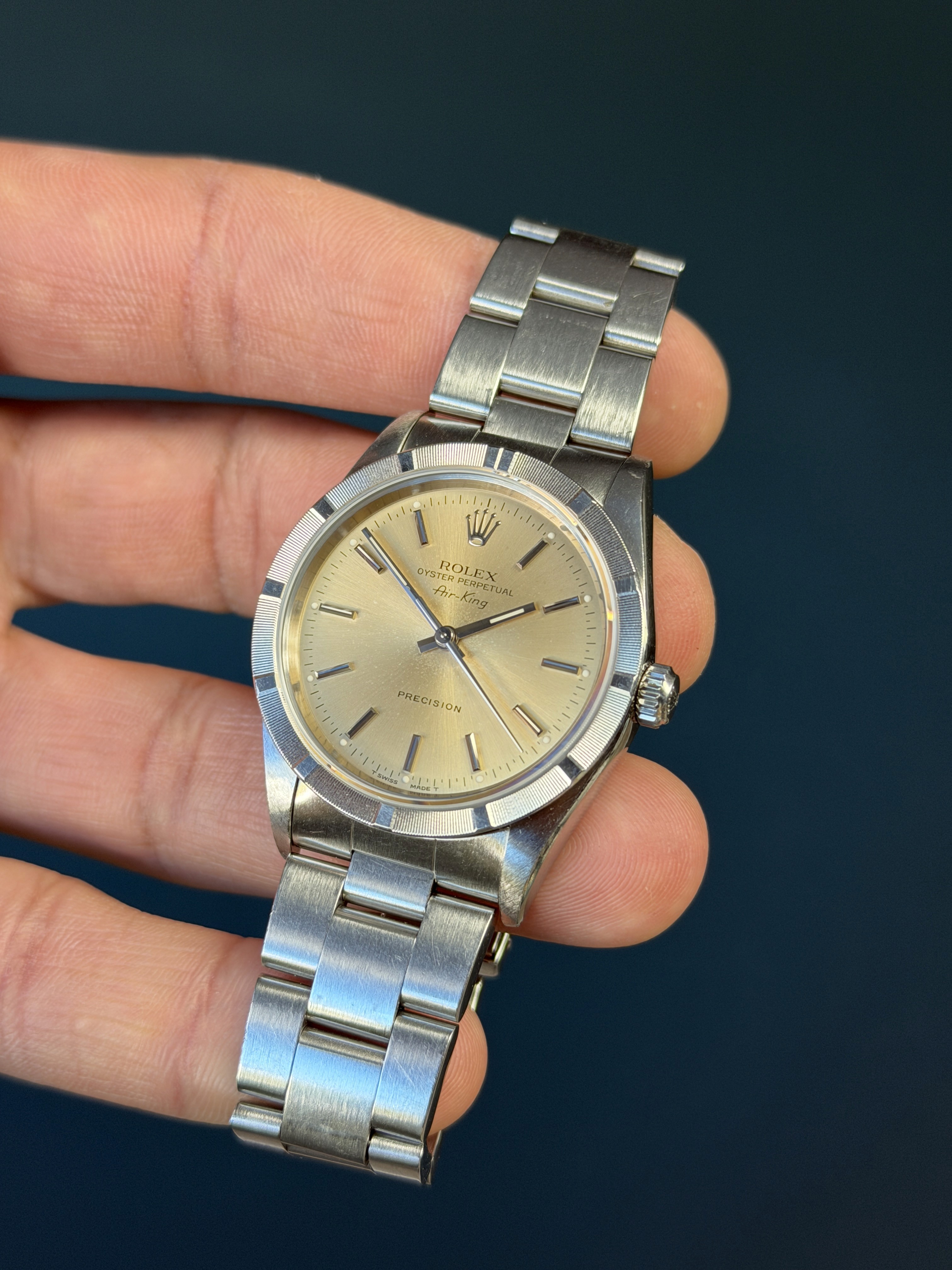 The Rolex Air King Reference 14010 with a cream tropical dial is a distinctive and elegant timepiece that seamlessly merges classic design with modern aesthetics. The watch features a stainless steel case with a diameter of 34mm, showcasing Rolex's commitment to precision craftsmanship and enduring style. The standout element is its cream tropical colored dial, a unique and eye-catching choice that adds a touch of warmth and sophistication. The dial is adorned with luminous hour markers and hands, ensuring excellent legibility in any lighting condition. Powered by the reliable Rolex Caliber 3130 movement, the Air King 14010 promises accurate timekeeping and durability. With its balanced blend of vintage charm and contemporary flair, this Rolex timepiece stands as a testament to the brand's timeless appeal and unwavering commitment to quality.