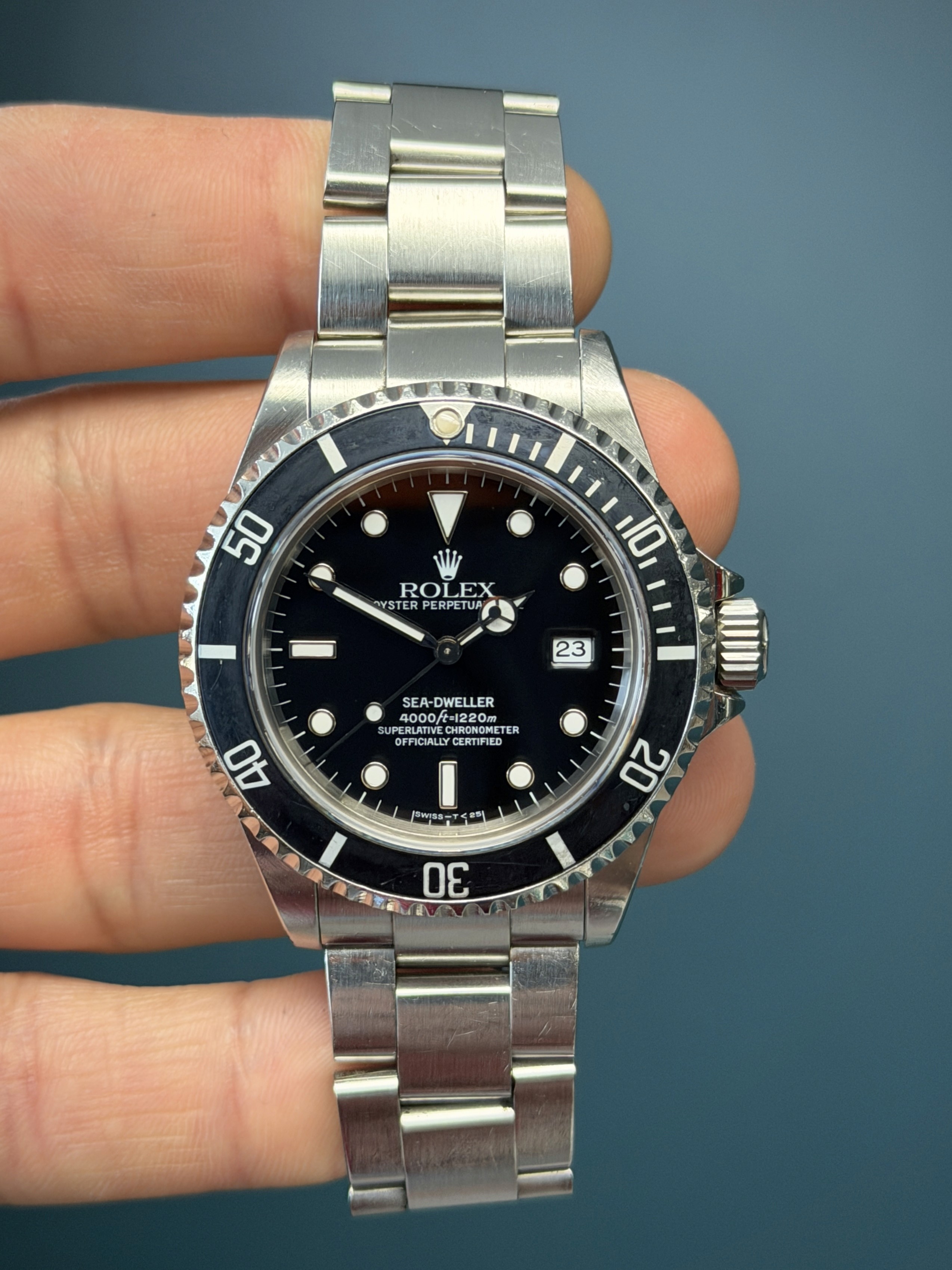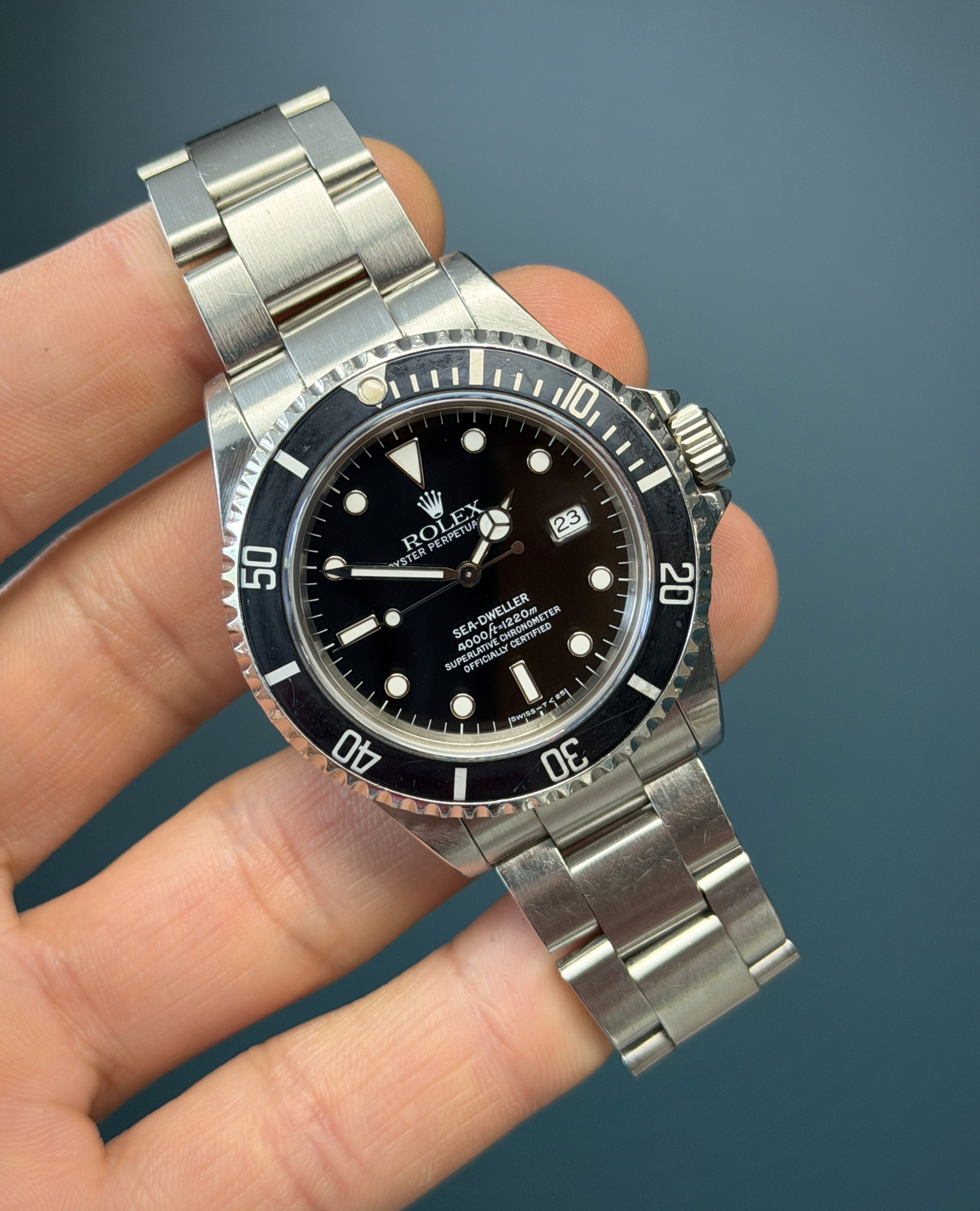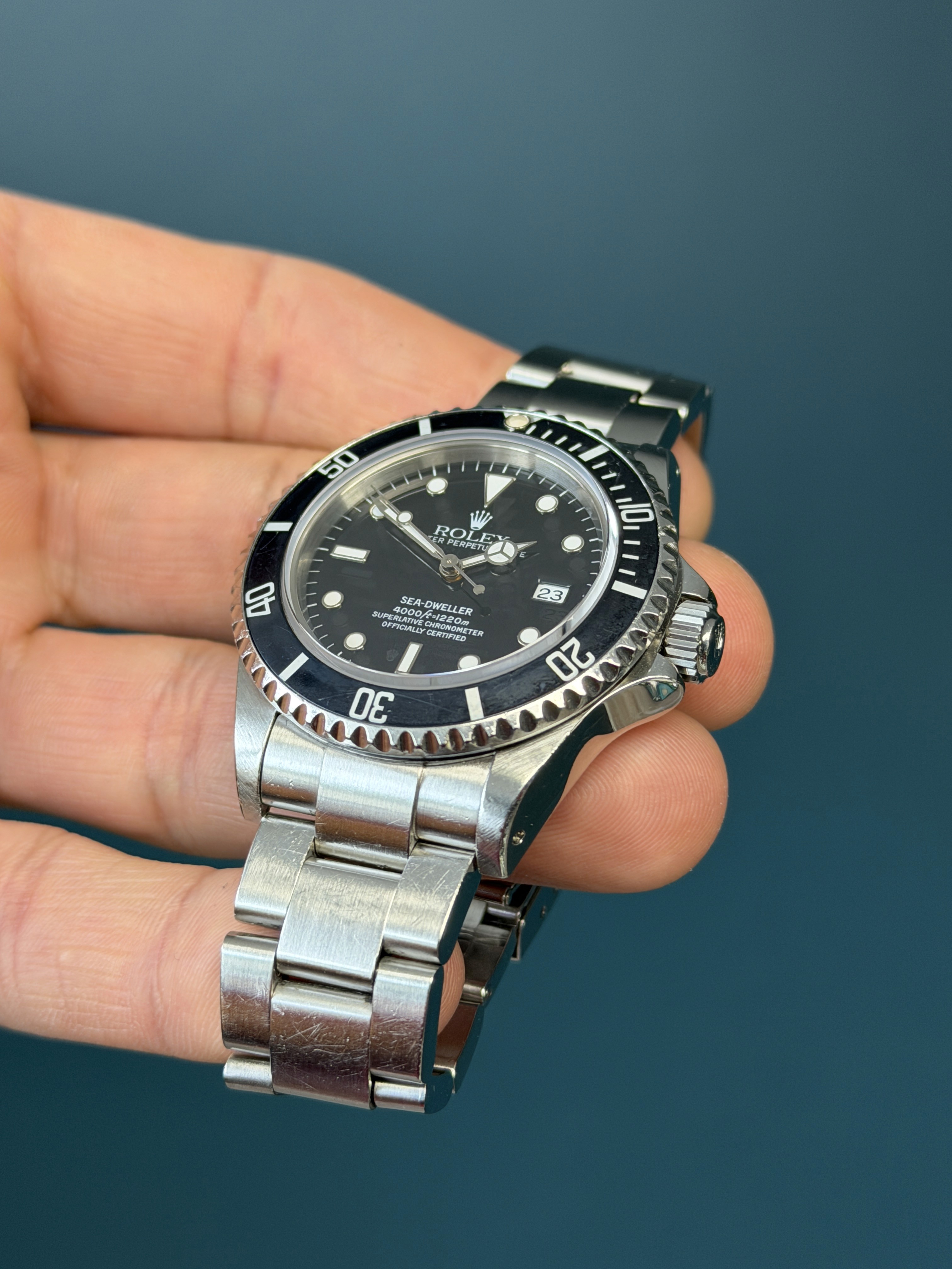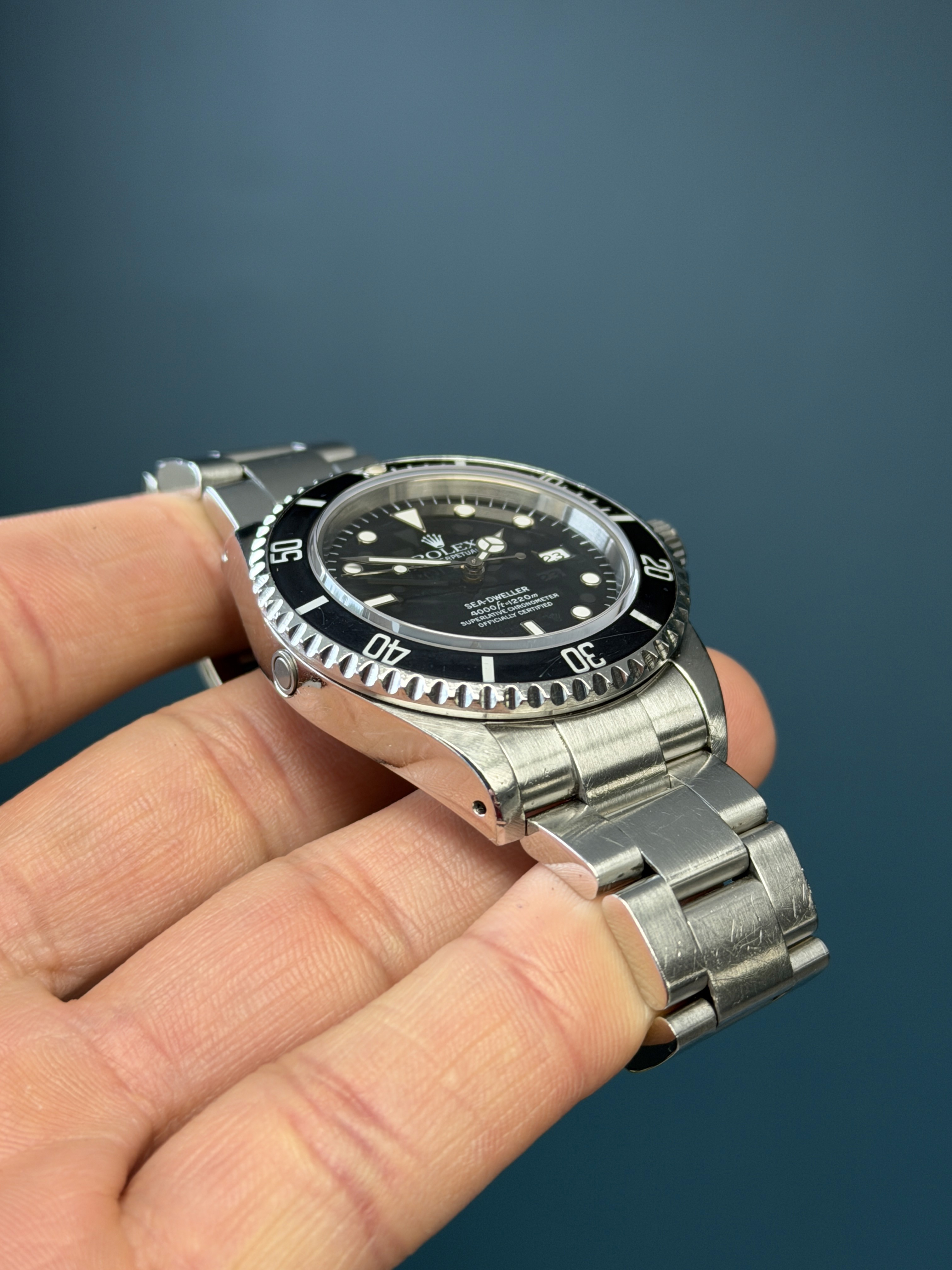 The Rolex Sea-Dweller Reference 16600 with papers from 1998 is a highly sought-after professional dive watch that combines rugged functionality with classic Rolex design. Crafted from stainless steel, the 40mm Oyster case is equipped with a helium escape valve, allowing the watch to withstand extreme depths of up to 4,000 feet (1,220 meters), making it a favorite among deep-sea divers. The black dial, featuring luminous hour markers and hands, offers exceptional legibility in low-light conditions, while the unidirectional rotating bezel allows precise timing of dive durations. Powered by the reliable Rolex Caliber 3135 automatic movement, the Sea-Dweller 16600 ensures accurate timekeeping and a robust power reserve. The watch is completed with a stainless steel Oyster bracelet, known for its durability and comfort. The Sea-Dweller is not just a tool watch but a collector’s piece, representing Rolex’s enduring legacy in the world of professional diving.