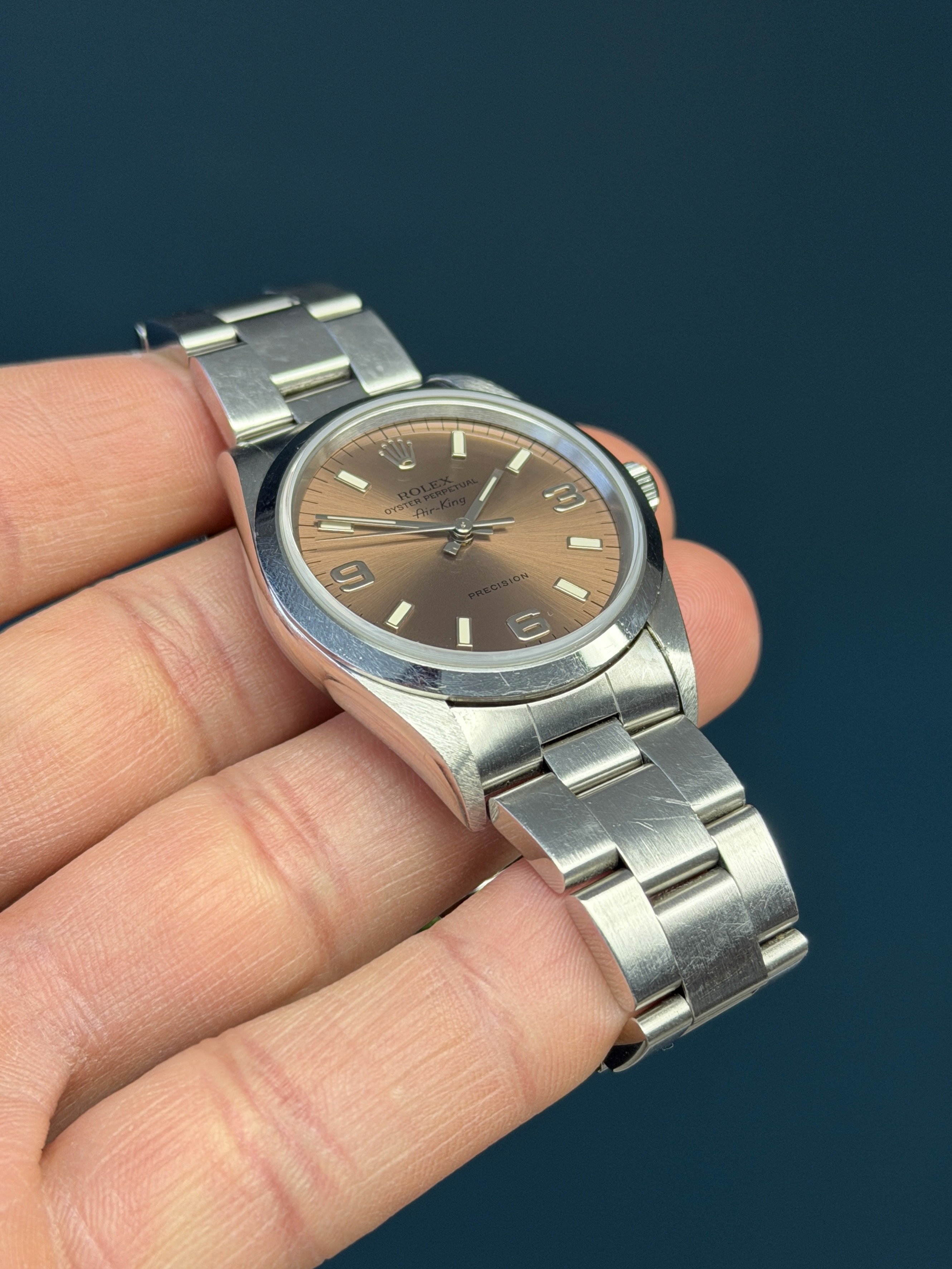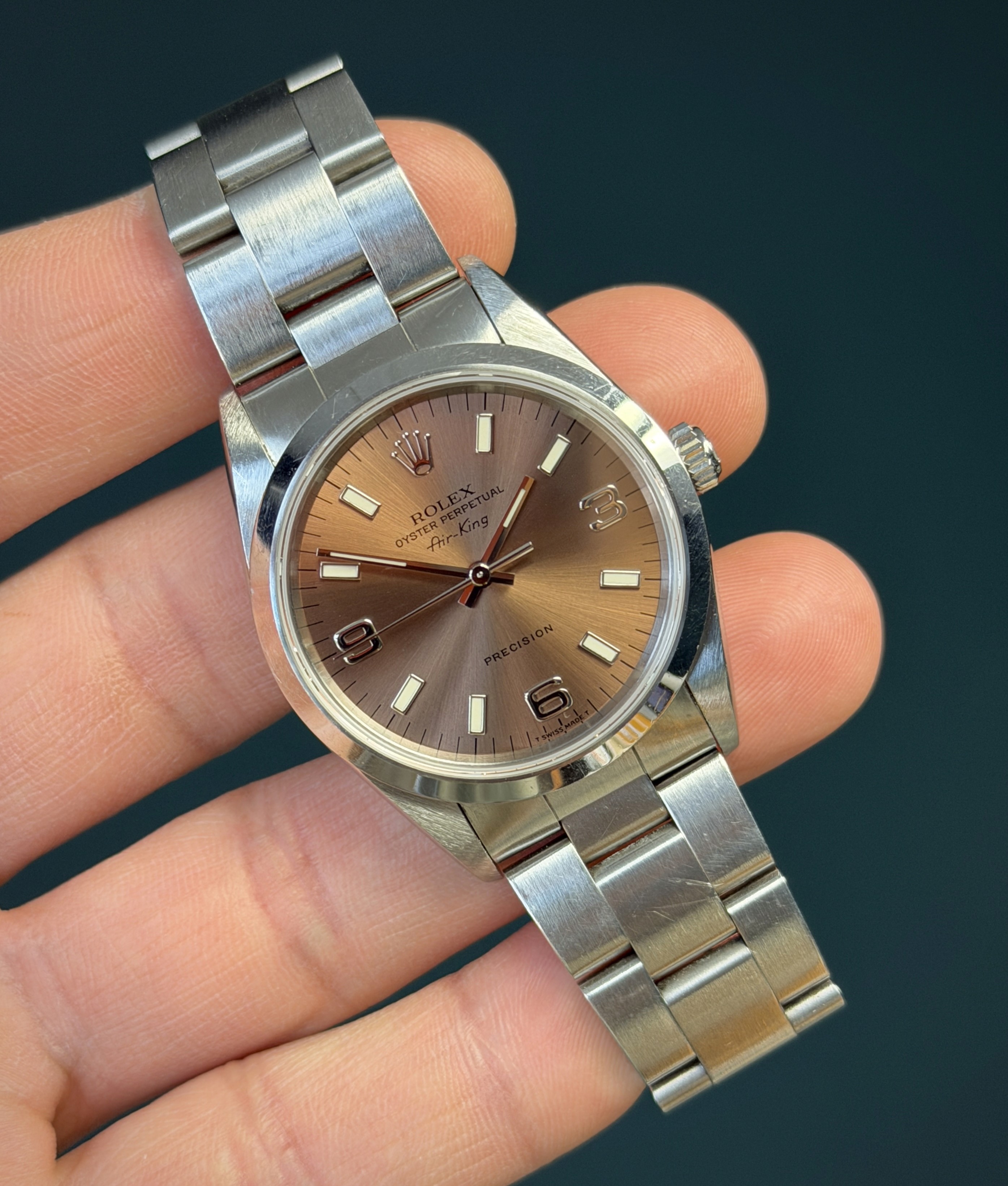 The Rolex Oyster Perpetual Air-King Reference 14000 with a Pink Salmon Dial is a stunning example of Rolex's commitment to timeless elegance and superior craftsmanship. This exquisite timepiece features a 34mm stainless steel case, perfectly balanced for both comfort and style. The unique Salmon-colored dial adds a touch of sophistication, beautifully contrasted by the sleek, minimalist design and luminous hour markers. Powered by the reliable Rolex Caliber 3000 automatic movement, the Air-King 14000 guarantees precise timekeeping and robust performance. The smooth bezel and classic Oyster bracelet enhance its refined aesthetic, making it suitable for any occasion. This particular model, with its rare and captivating salmon dial, stands out as a distinctive and highly sought-after addition to any watch collection, embodying the perfect blend of tradition and modernity.