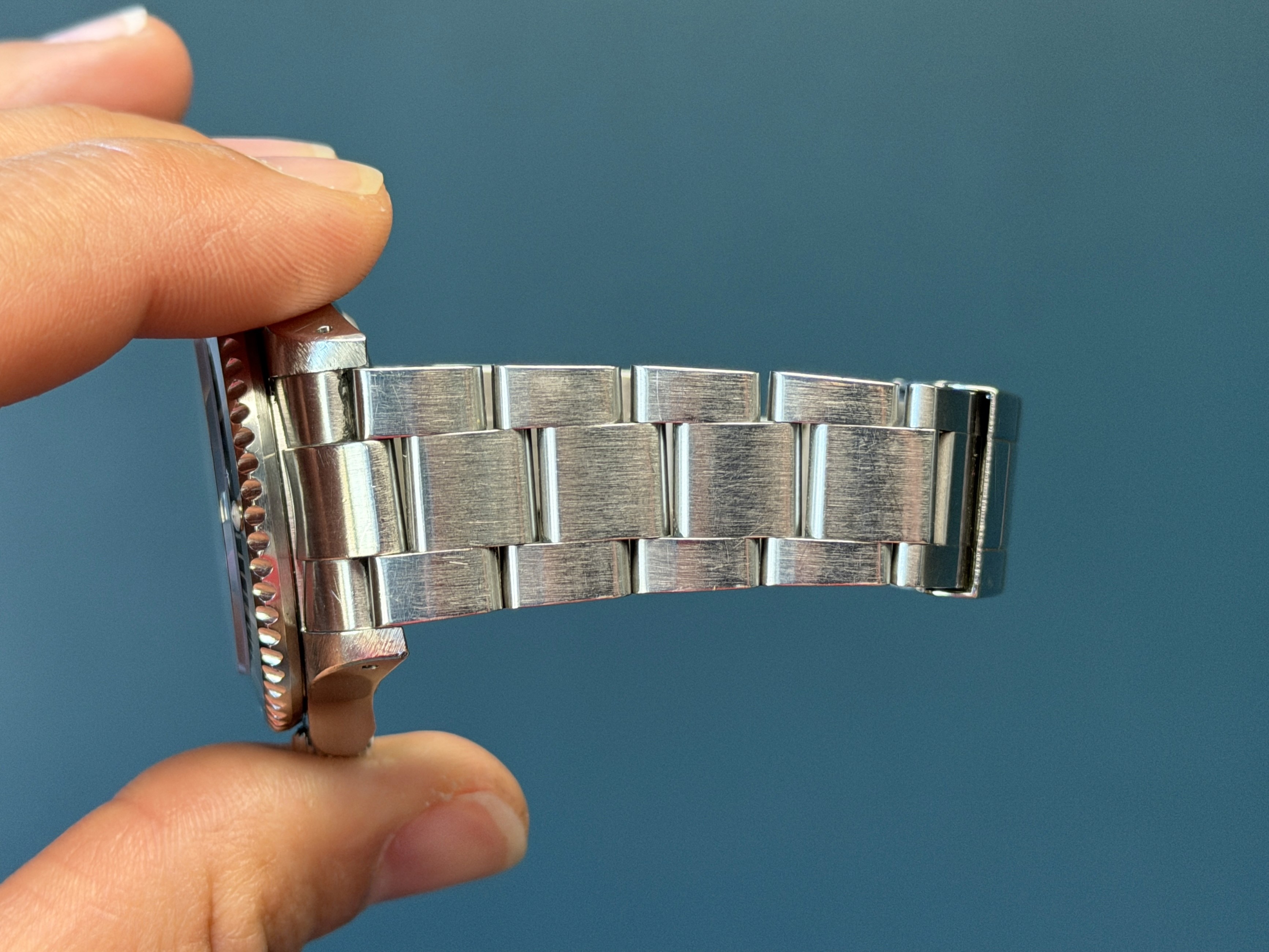 Today's example comes to us as a full set with punched papers dated 4/17/99. The case is excellent showing sharp chamfers. The Solid End Link Bracelet has 12 total links and shows very minimal stretch. The Swiss only dial is excellent. Watch is running COSC ready to go.