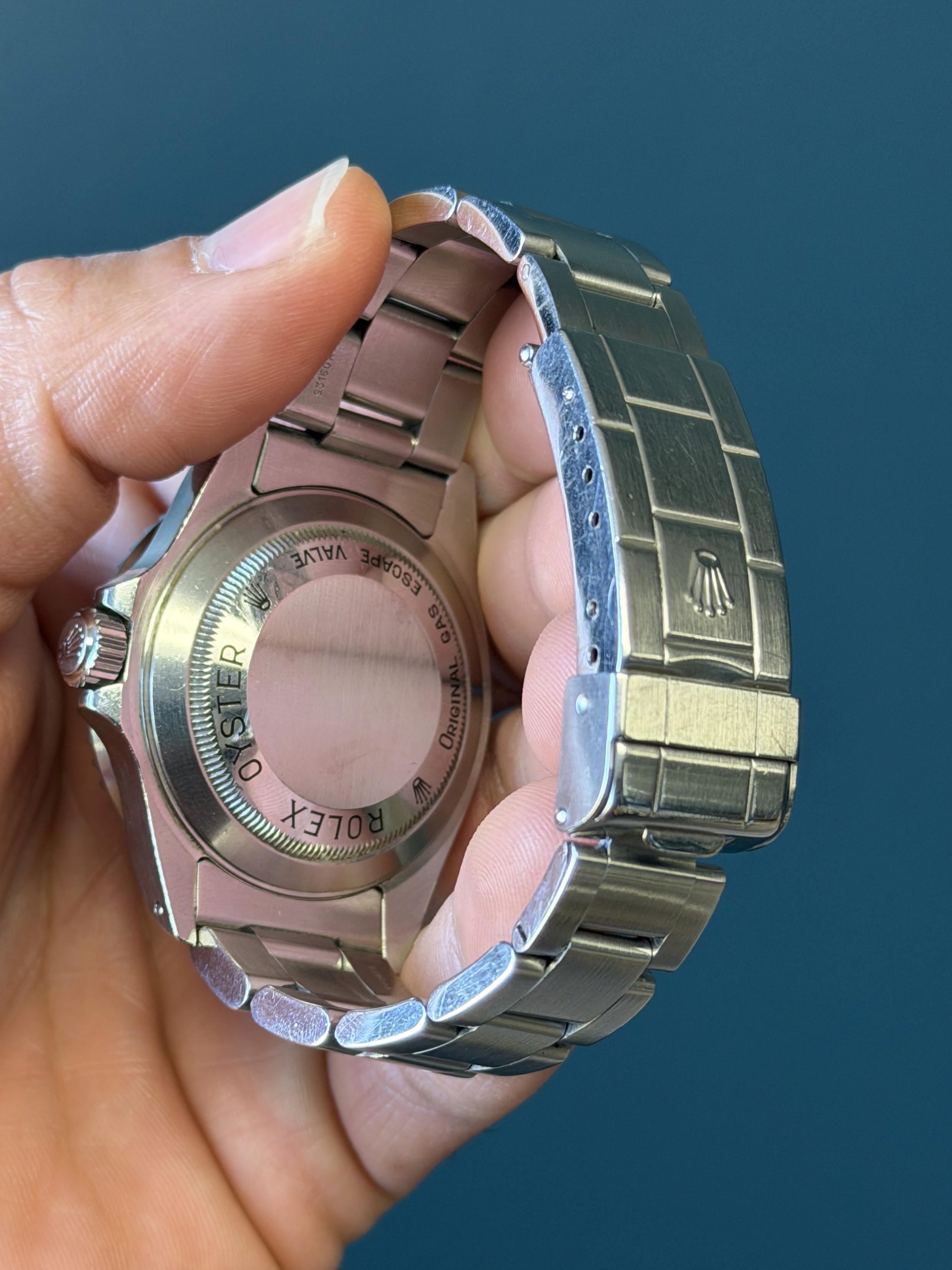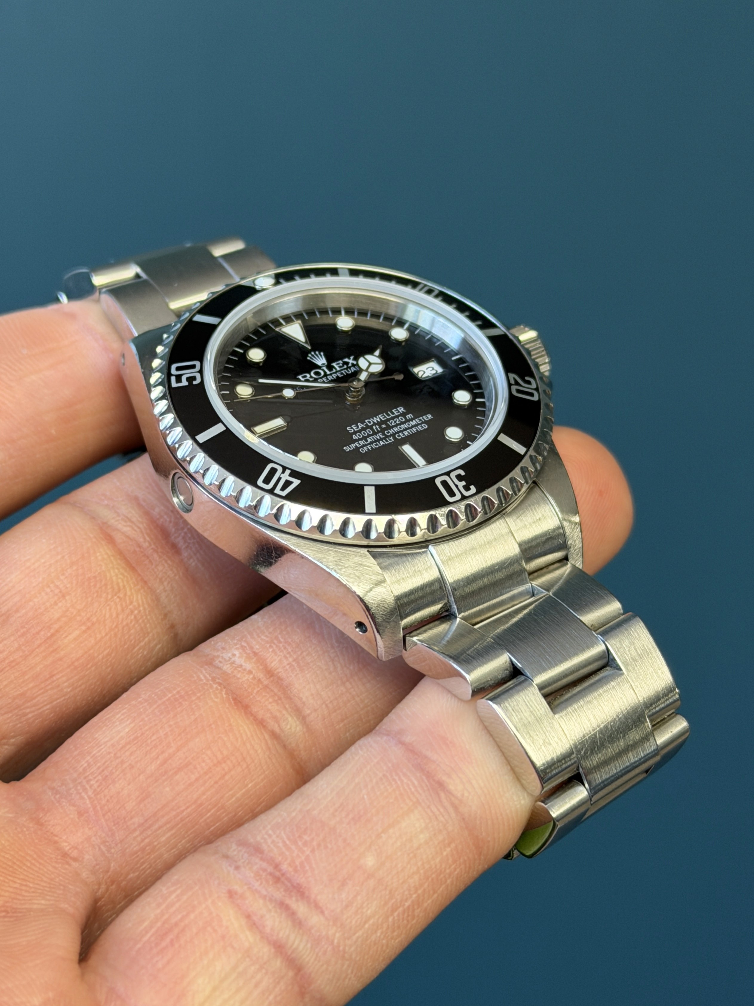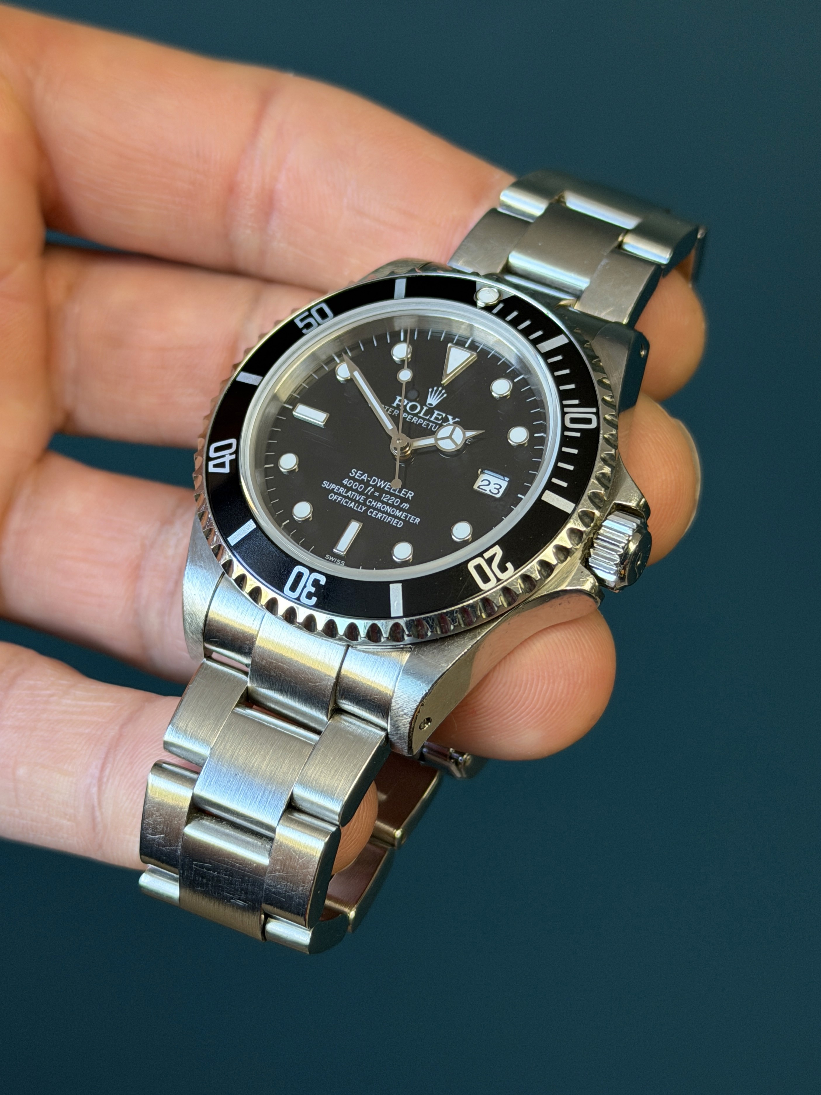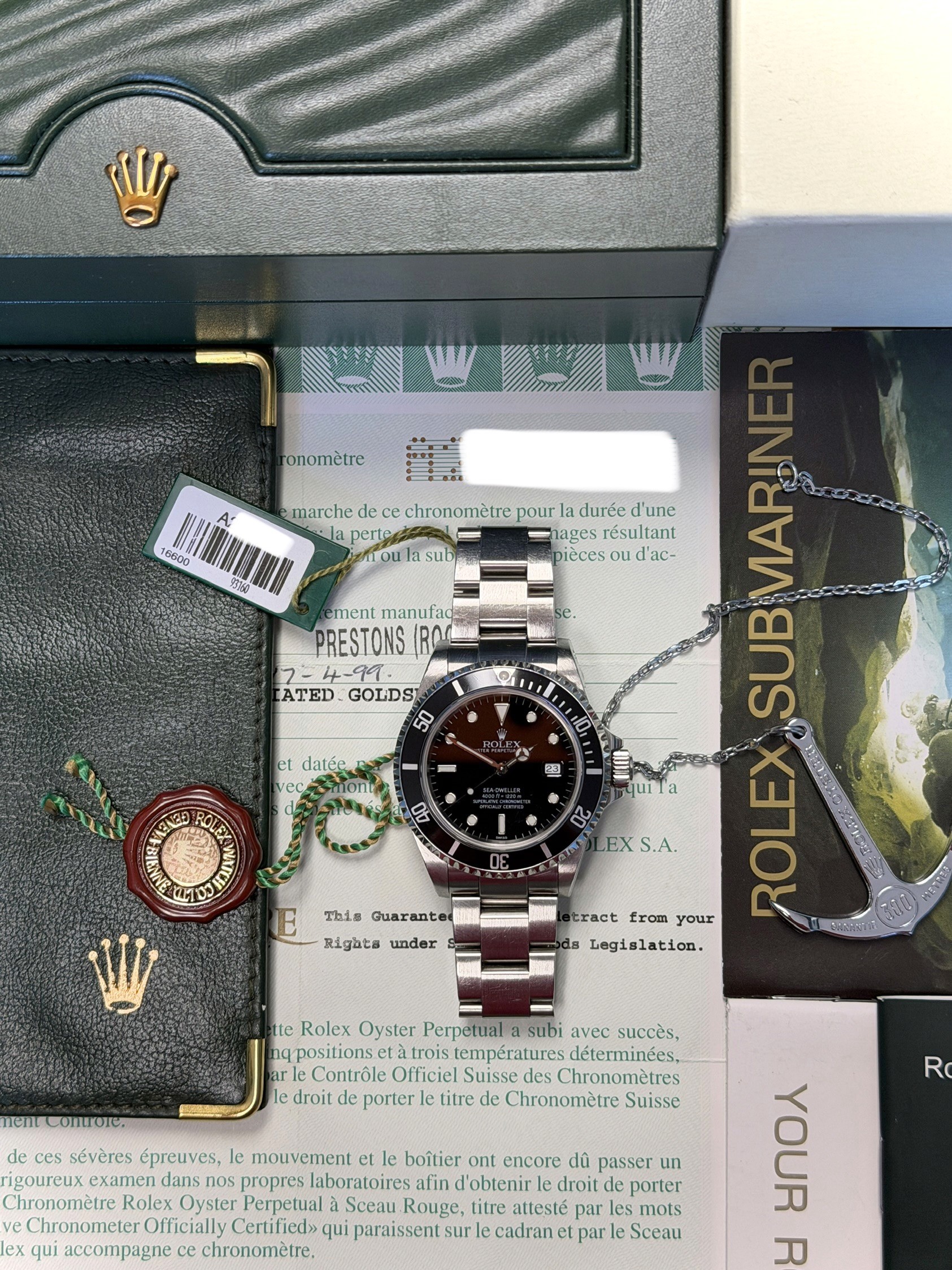 The Rolex Sea-Dweller Reference 16600 with papers from 1999 is a highly sought-after professional dive watch that combines rugged functionality with classic Rolex design. Crafted from stainless steel, the 40mm Oyster case is equipped with a helium escape valve, allowing the watch to withstand extreme depths of up to 4,000 feet (1,220 meters), making it a favorite among deep-sea divers. The black dial, featuring luminous hour markers and hands, offers exceptional legibility in low-light conditions, while the unidirectional rotating bezel allows precise timing of dive durations. Powered by the reliable Rolex Caliber 3135 automatic movement, the Sea-Dweller 16600 ensures accurate timekeeping and a robust power reserve. The watch is completed with a stainless steel Oyster bracelet, known for its durability and comfort. Accompanied by its original papers from 1999, this Sea-Dweller is not just a tool watch but a collector’s piece, representing Rolex’s enduring legacy in the world of professional diving.