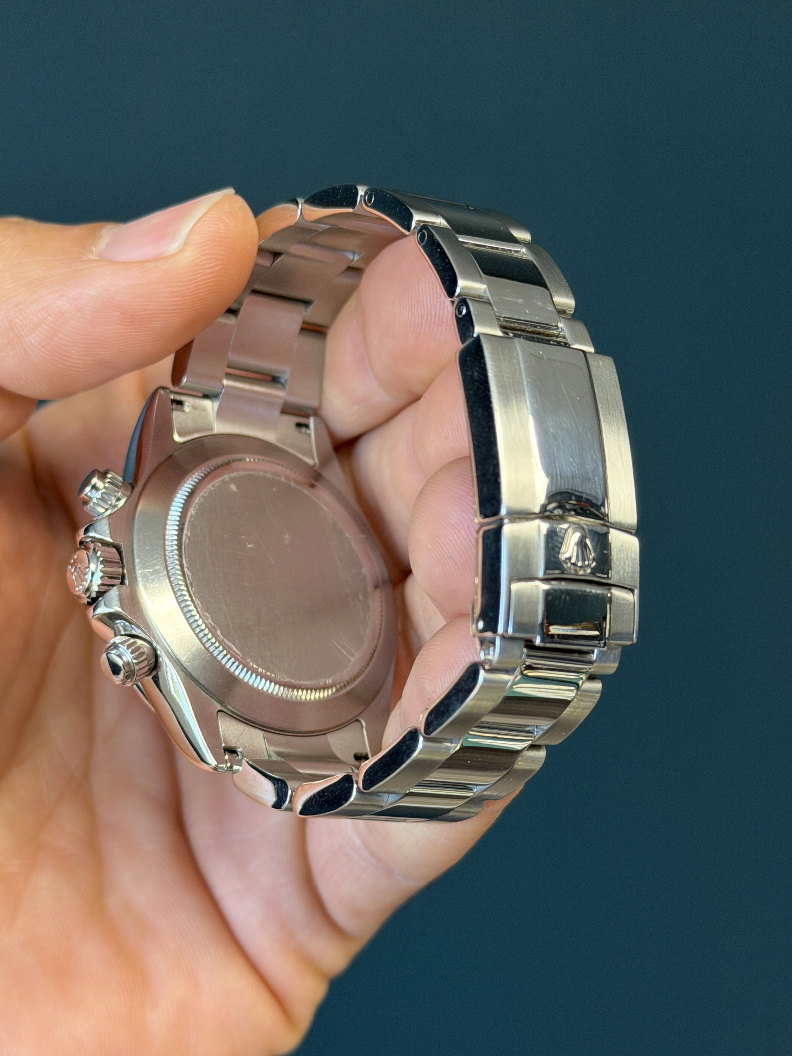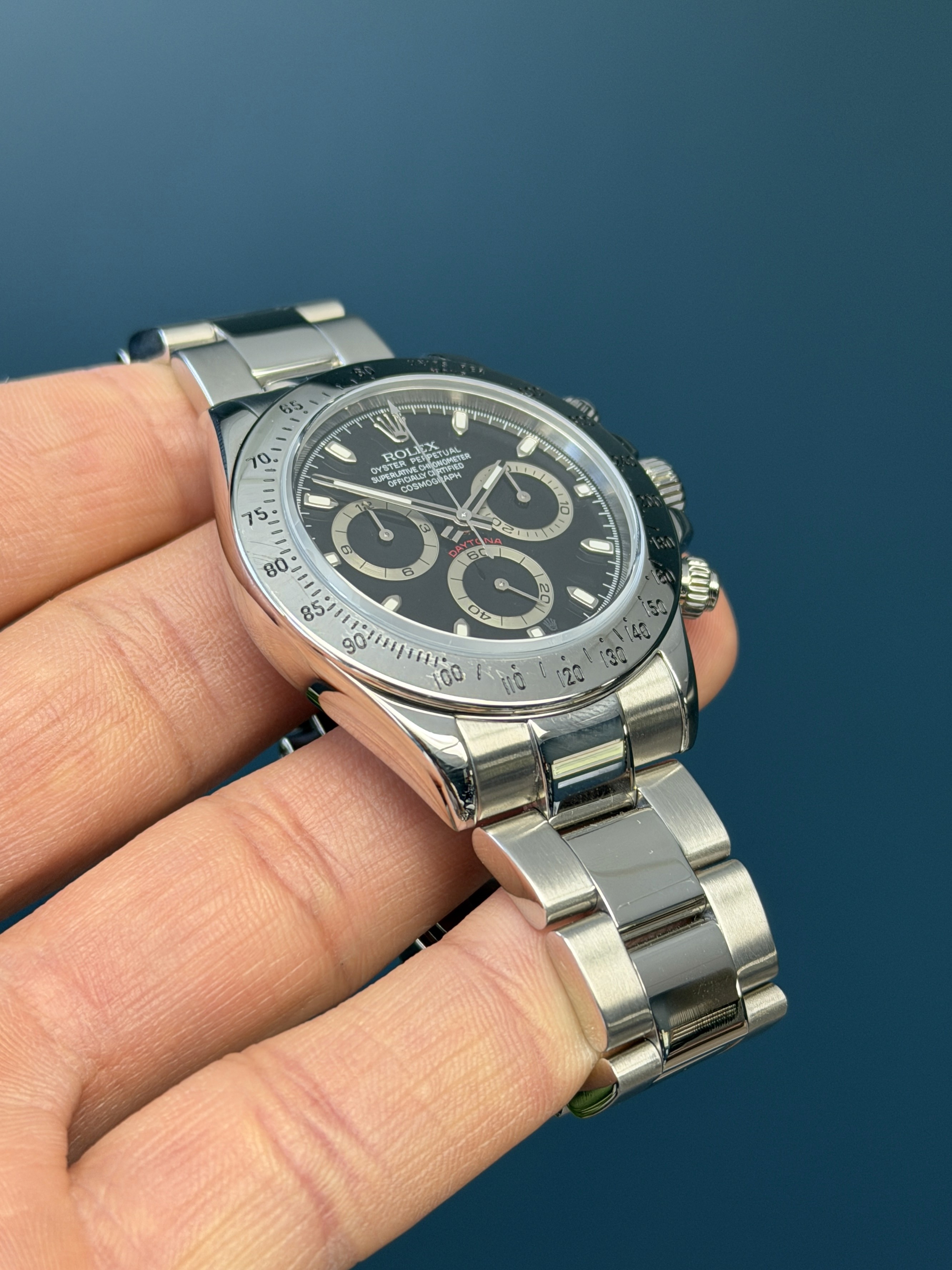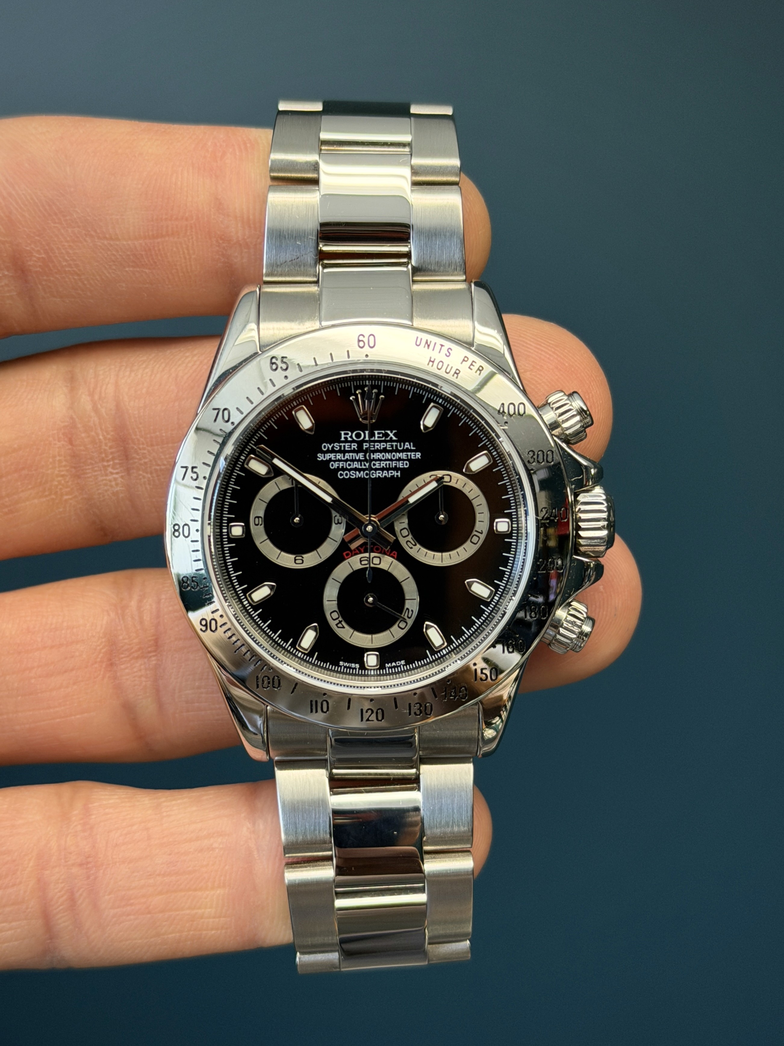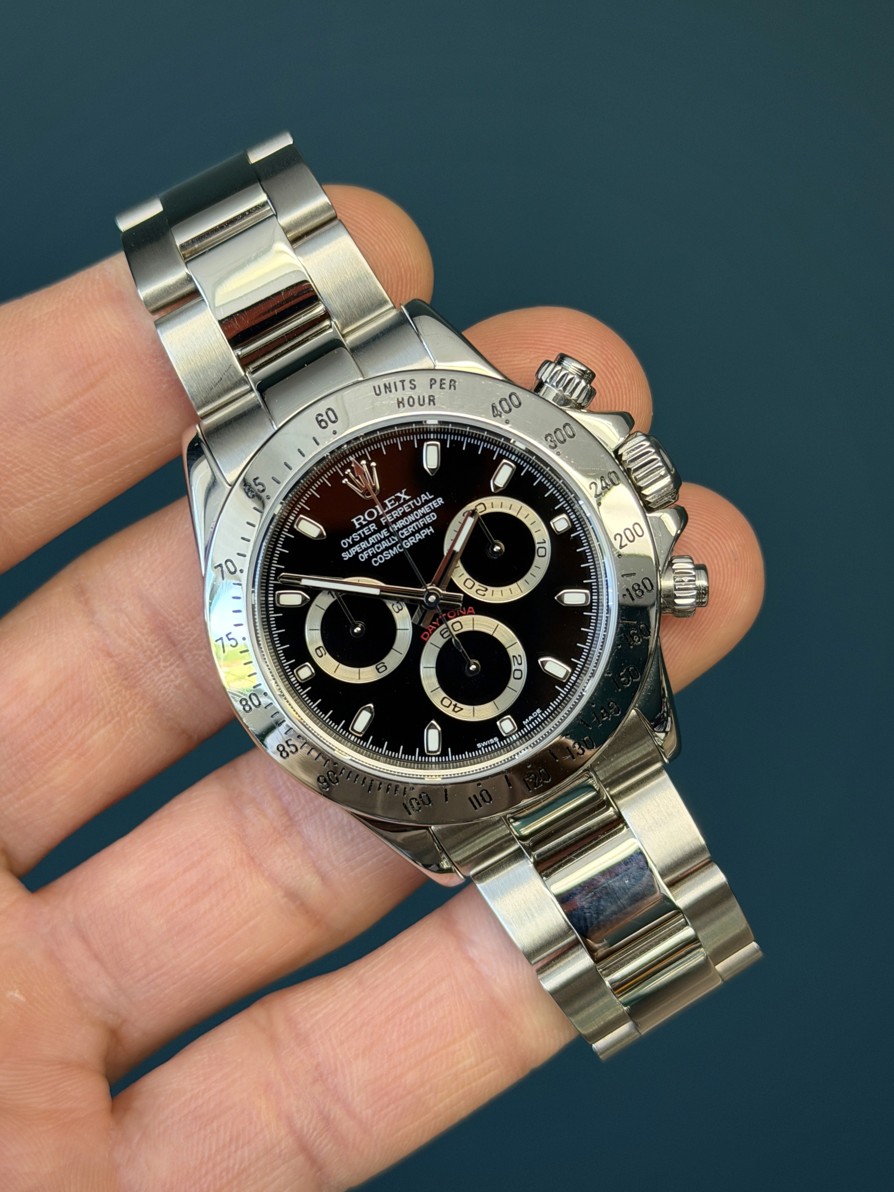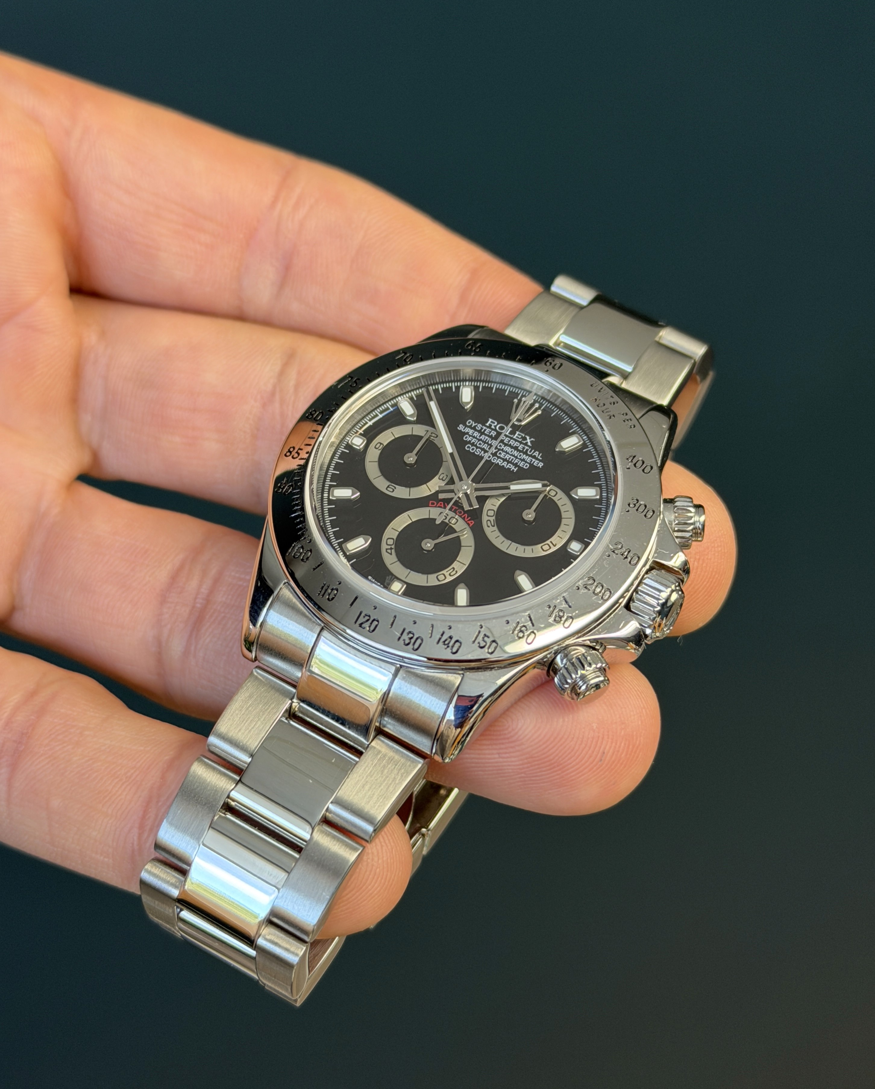 The Rolex Daytona Reference 116520 is a masterpiece of horological engineering and design, celebrated for its precision, durability, and timeless appeal. Featuring a robust 40mm stainless steel Oyster case, this iconic chronograph is both elegant and sporty, designed to withstand the rigors of professional racing. The black dial is adorned with luminescent hour markers and hands, along with three sub-dials for measuring elapsed time. Powered by the in-house Rolex Caliber 4130 automatic movement, the Daytona 116520 ensures exceptional accuracy and reliability, boasting a power reserve of approximately 72 hours. The tachymetric scale on the bezel allows for precise speed calculations, making it a favorite among motorsport enthusiasts. Completed with a sturdy stainless steel Oyster bracelet featuring the Oysterlock clasp, the Rolex Daytona 116520 is a symbol of excellence and prestige, perfect for those who appreciate both functionality and luxurious design.