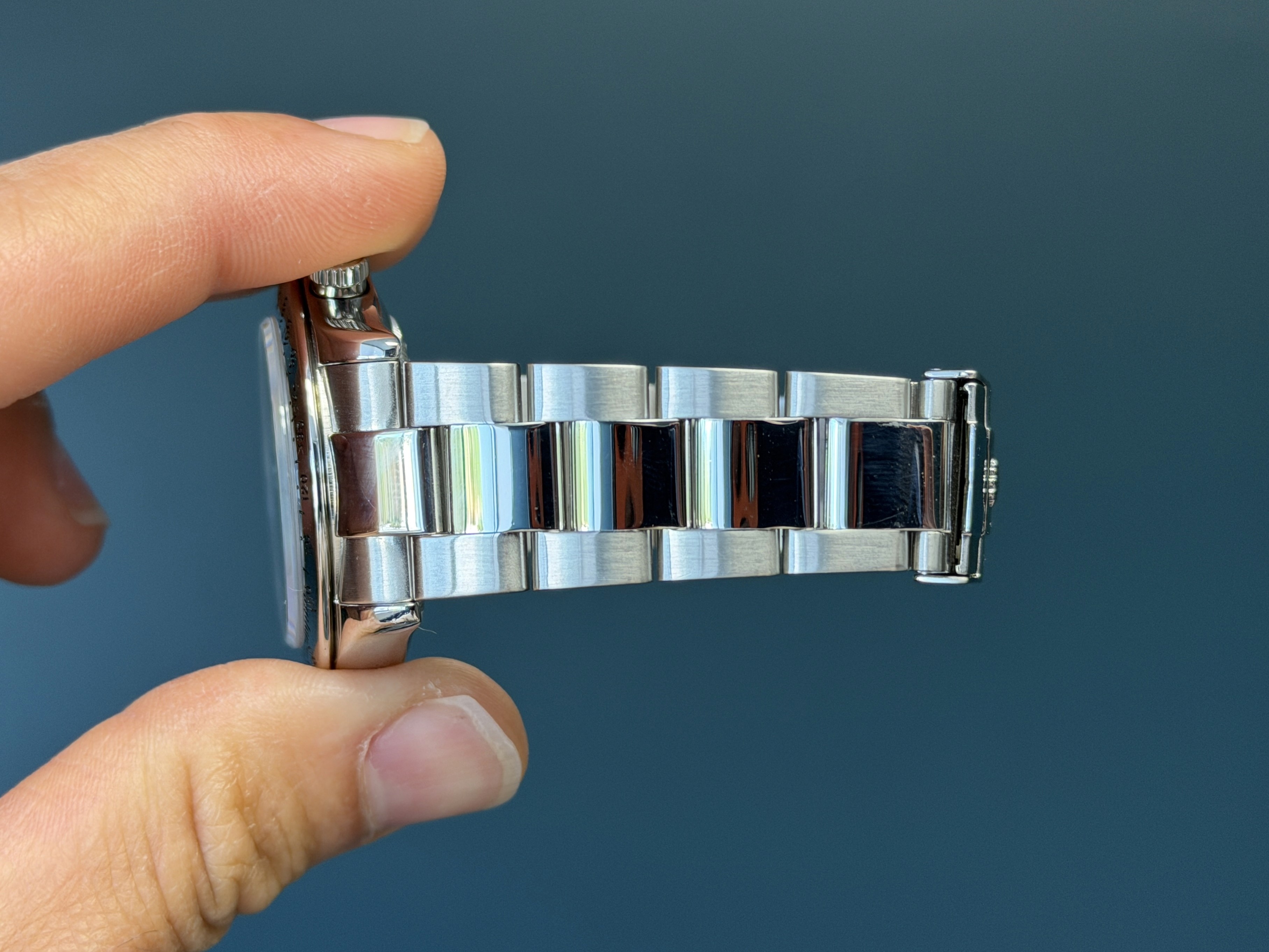 Today's example comes to us in excellent pre-owned condition. The bracelet has 11.5 links and shows no stretch. The case is thick and excellent. The bezel has all of its enamel and is sharp and crisp. The watch is keeping excellent time and the chronograph feature functions as it should.