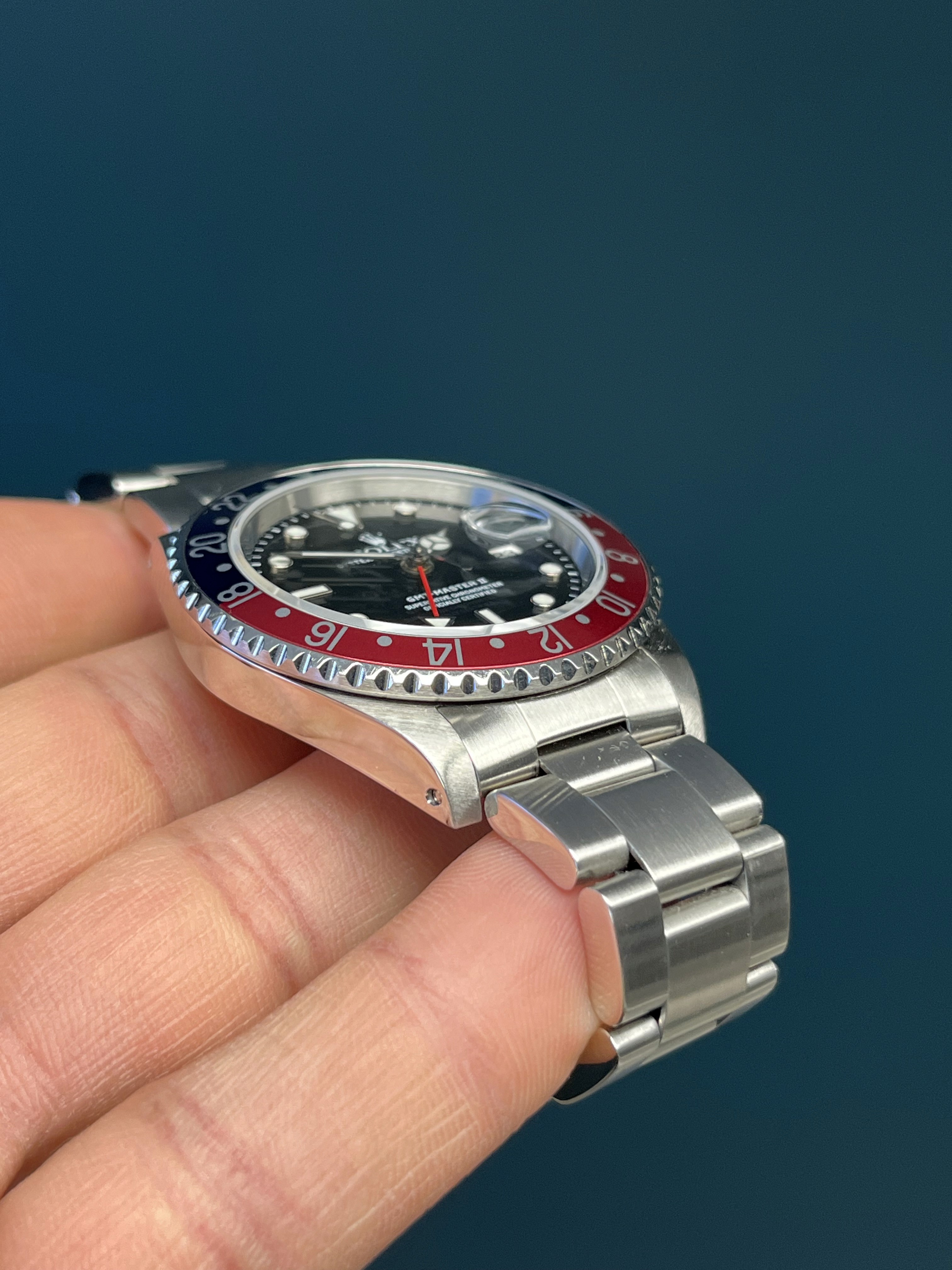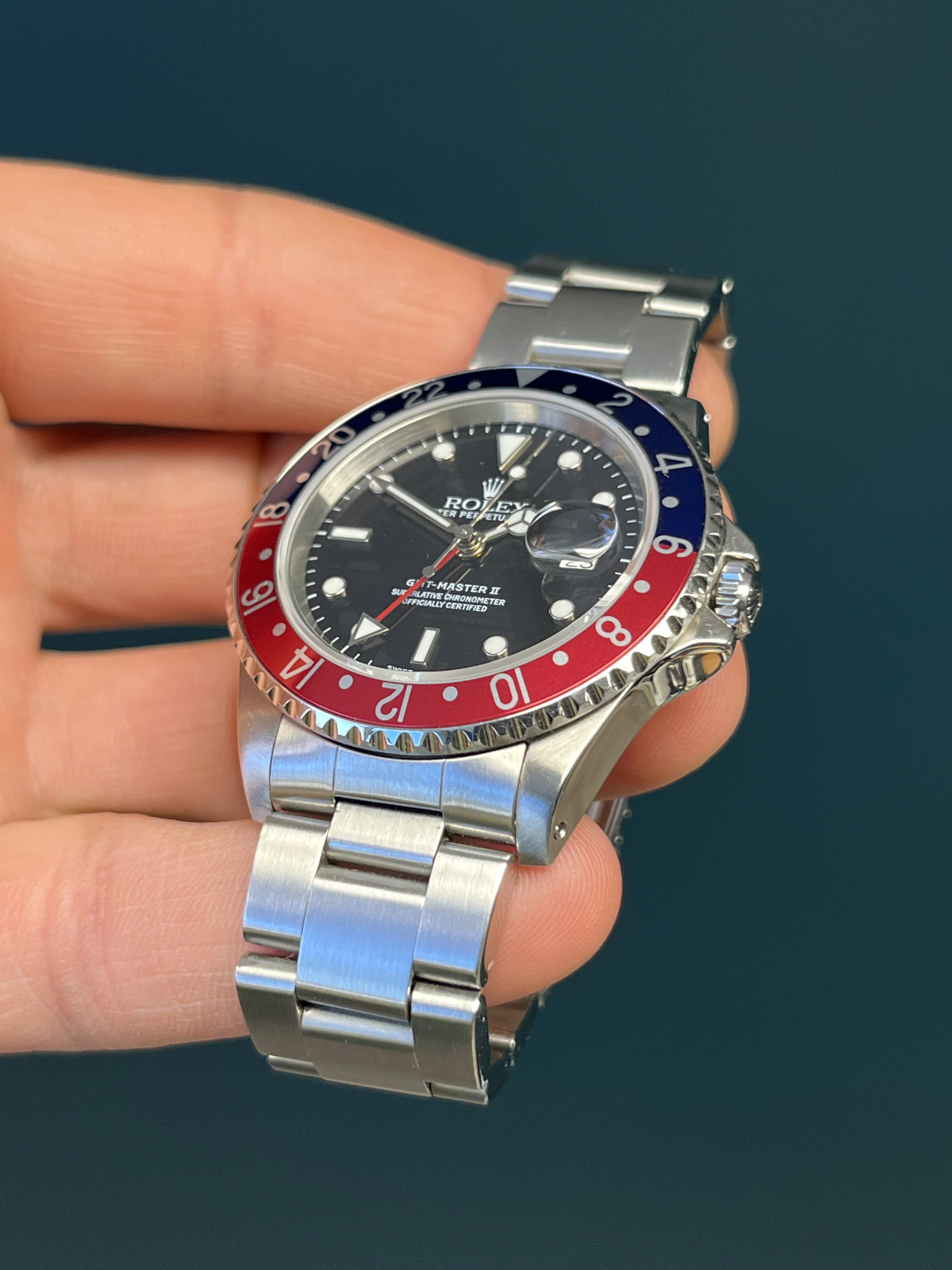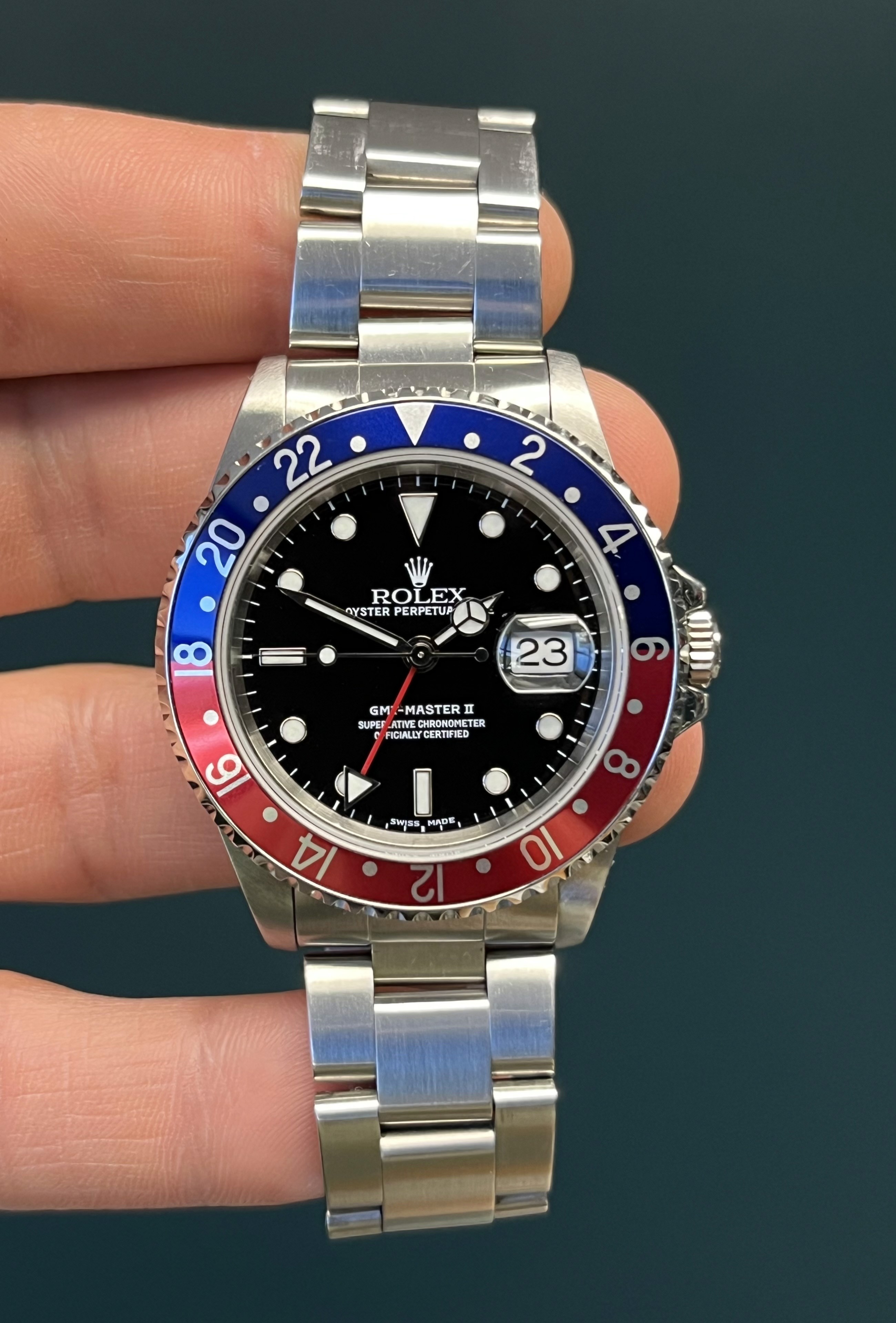 The Rolex Reference 16710 Pepsi GMT is a timeless and iconic timepiece that embodies the rich heritage of Rolex craftsmanship. Introduced in the late 1980s and produced until the mid-2000s, this GMT-Master II model features a striking blue and red "pepsi" bezel, adding a touch of boldness to its classic design. Over the years, the watch has developed a charming patina on its bezel, a natural aging process that enhances its vintage appeal. The patina, often visible on the luminous markers and hands, speaks to the watch's history and the countless journeys it has witnessed. This subtle aging process adds character and uniqueness to each piece, making the Reference 16710 a sought-after collector's item for enthusiasts who appreciate both the functionality and the nostalgic beauty of a well-worn Rolex.