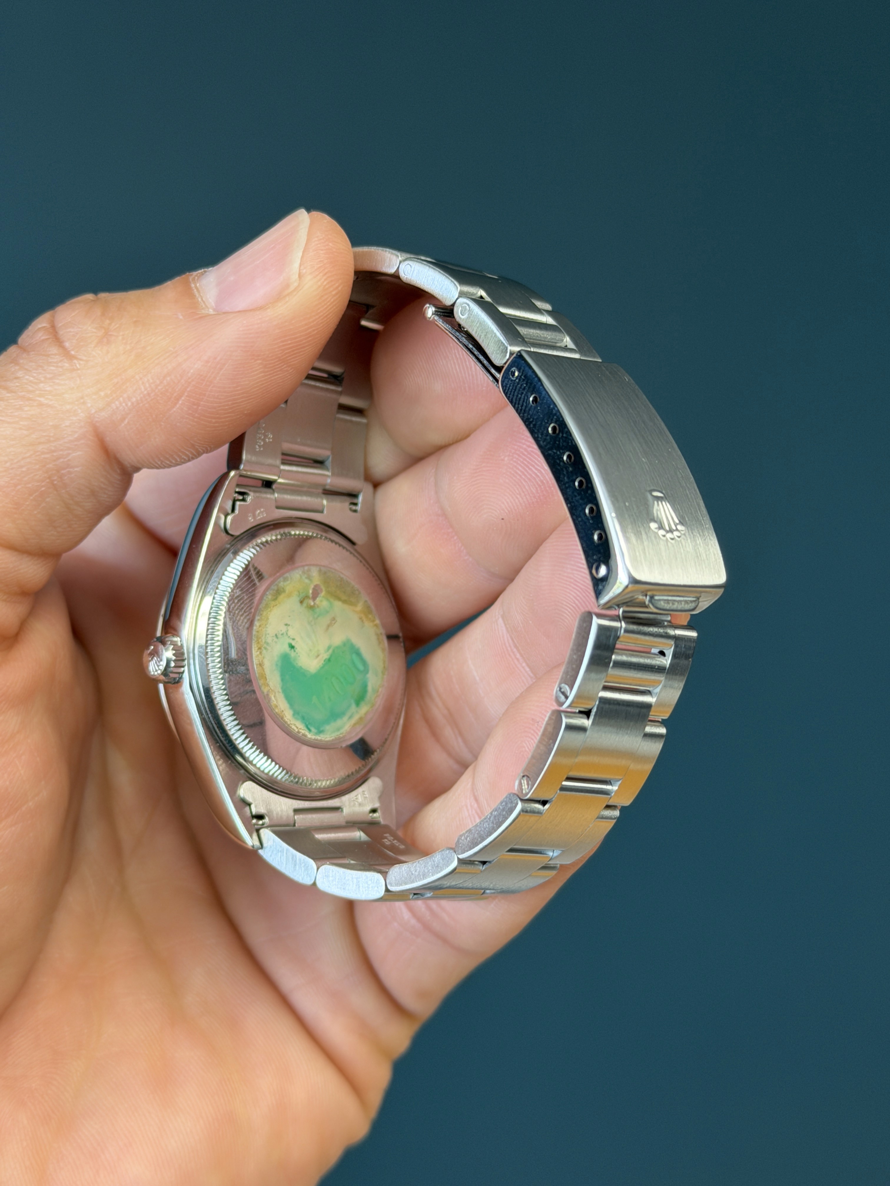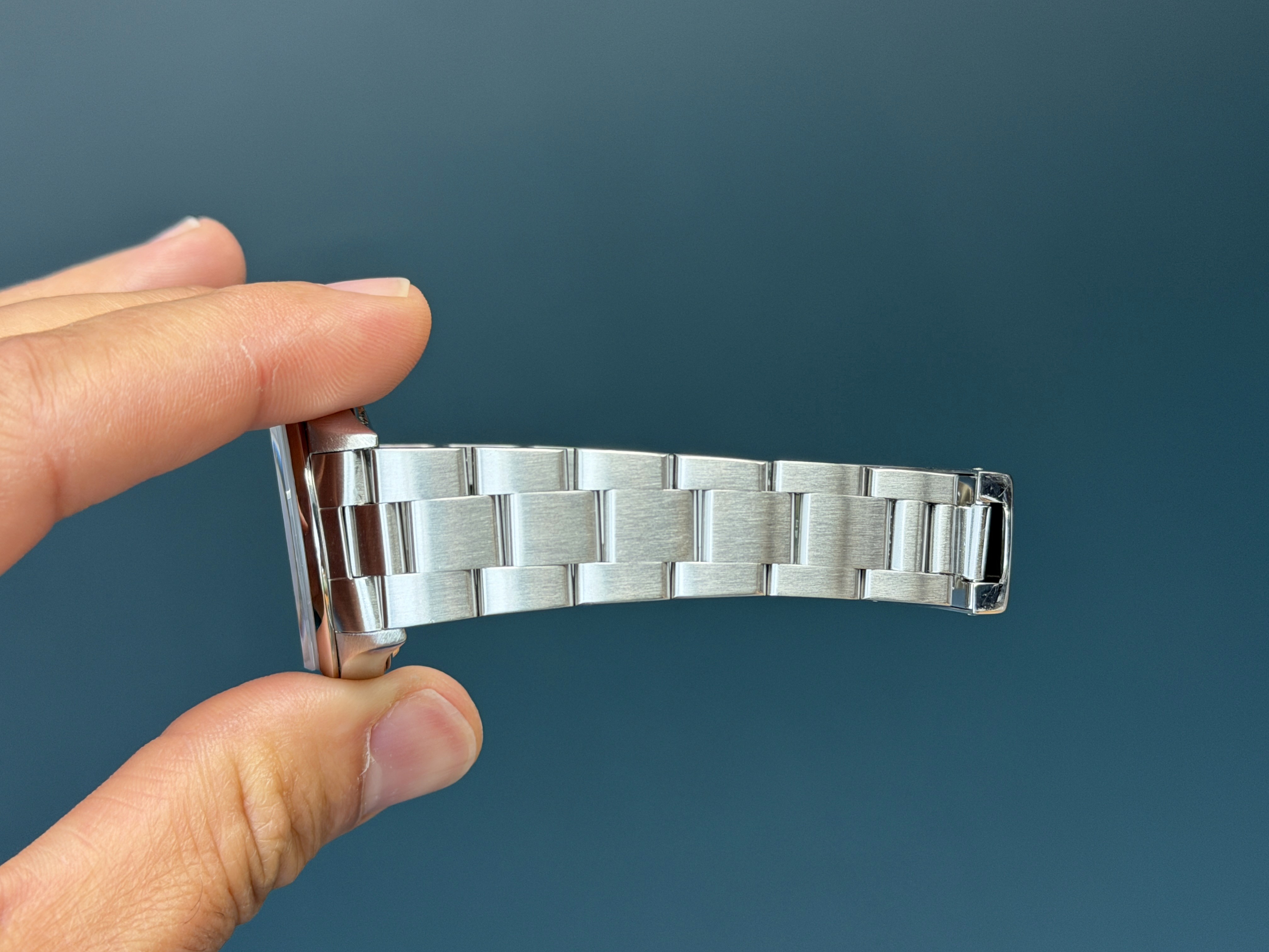 Today's example comes as watch only and is in mint retail ready condition. The no holes case is excellent. The 3-6-9 Blue dial is mint and shows no visible wear. The bracelet has 12 inks and shows no stretch.