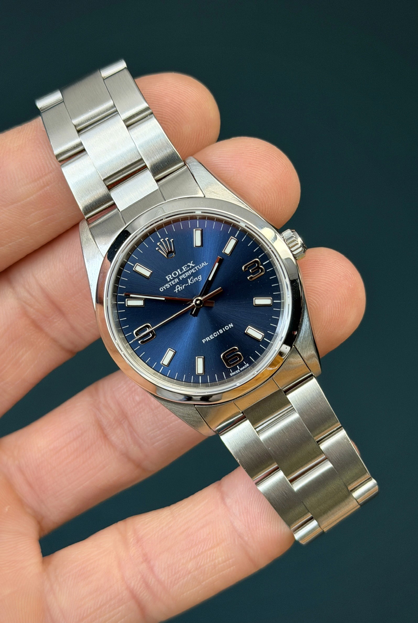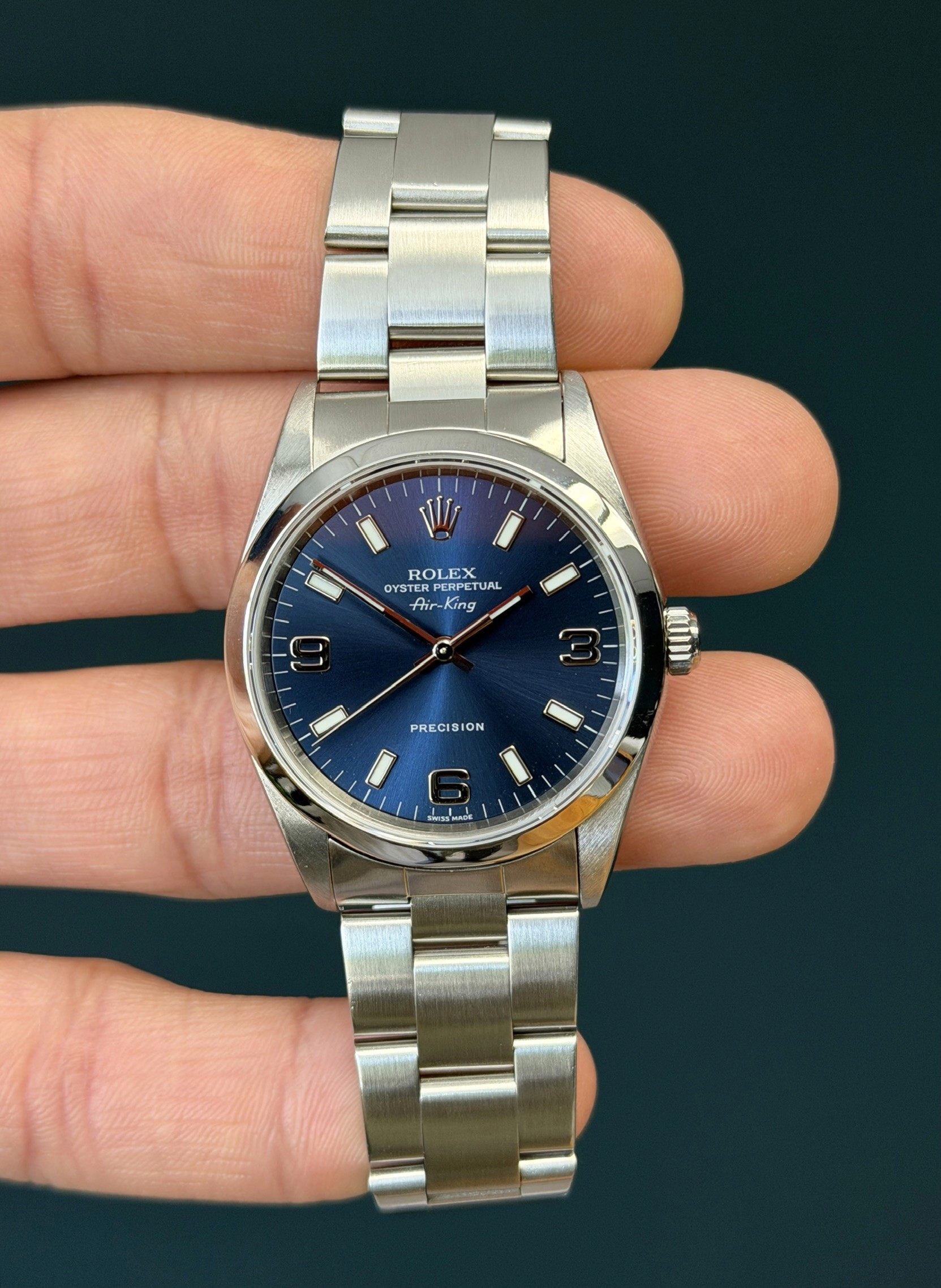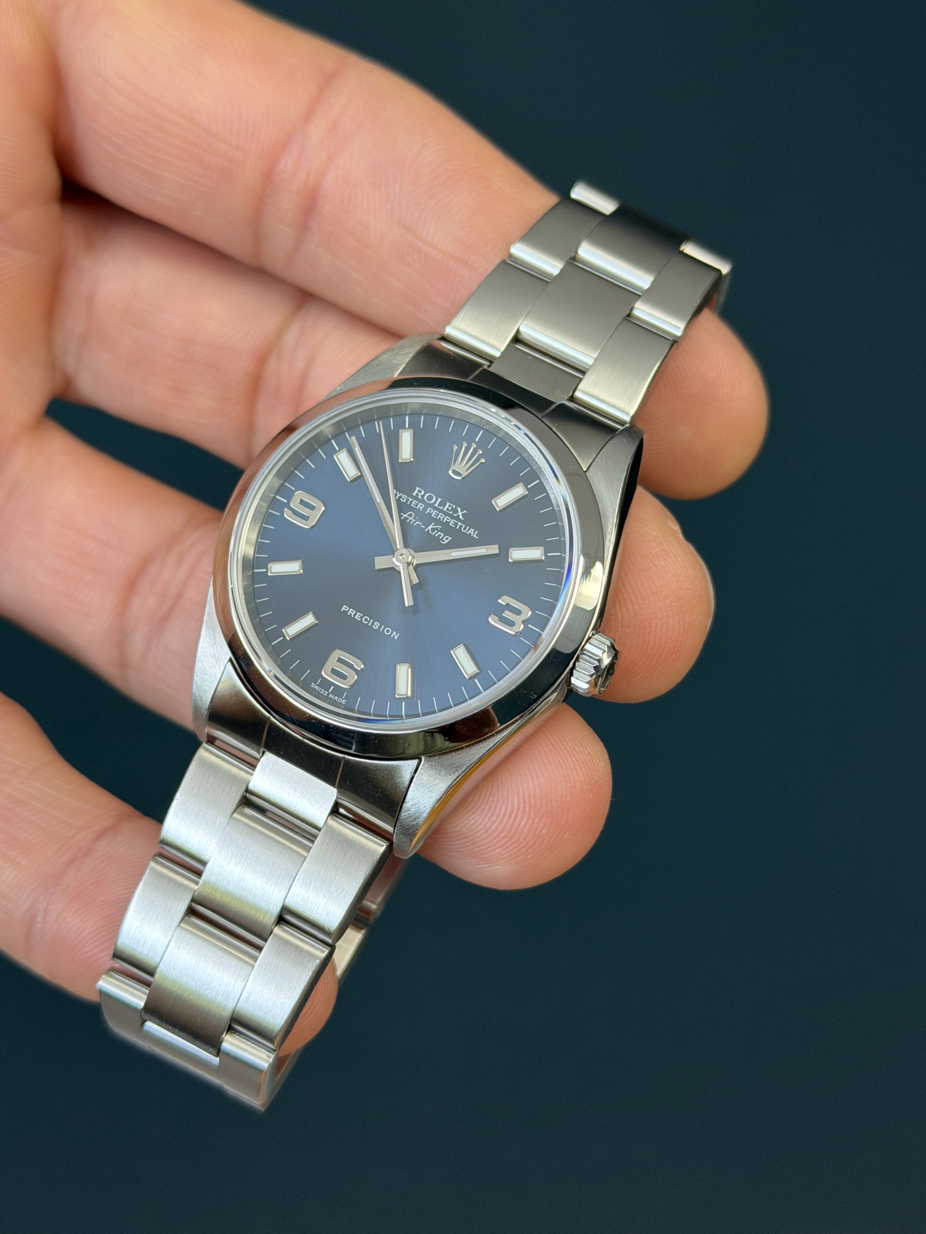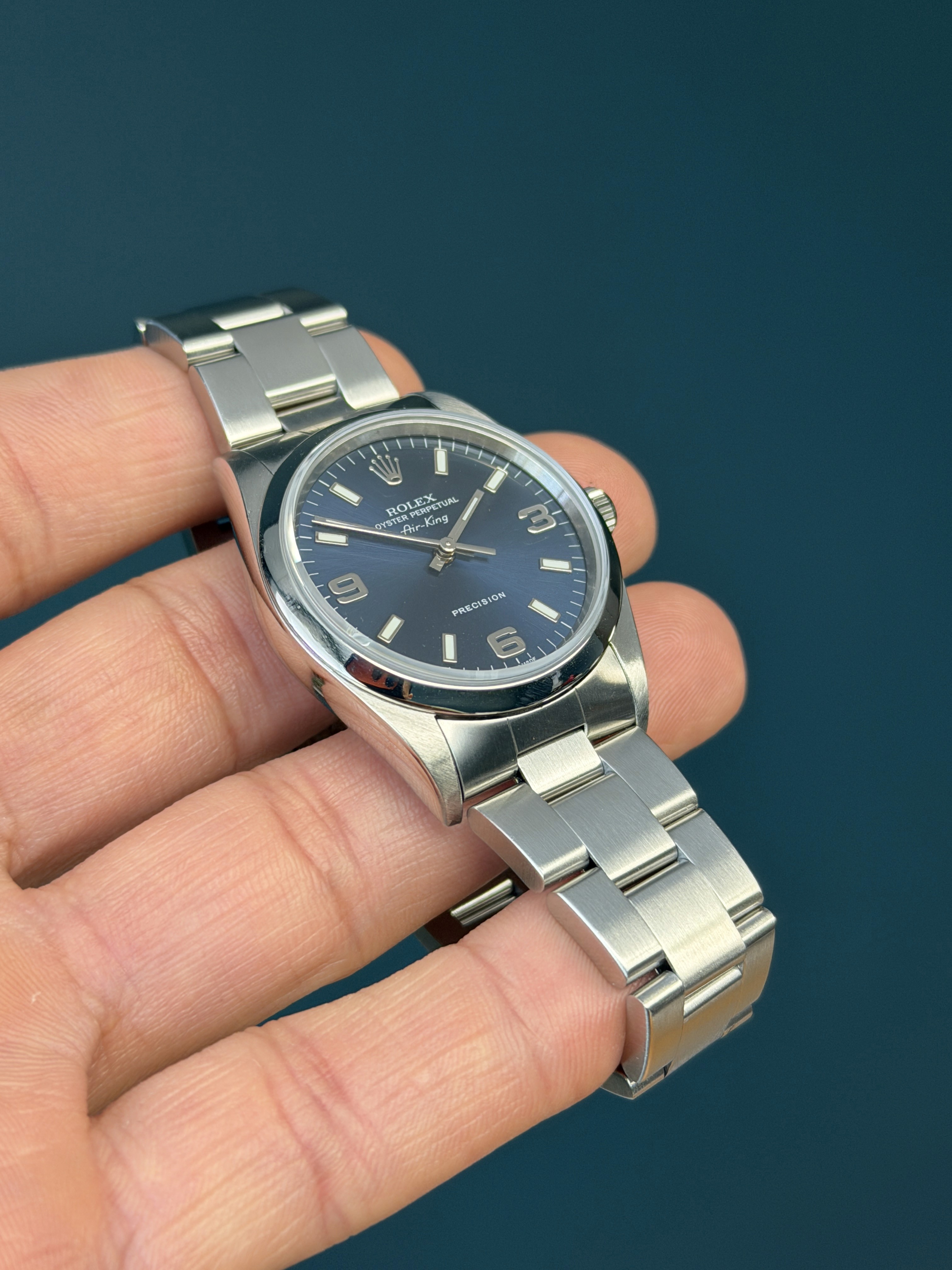 The Rolex Oyster Perpetual Air-King Reference 14000 with a Blue Dial is a stunning example of Rolex's commitment to timeless elegance and superior craftsmanship. This exquisite timepiece features a 34mm stainless steel case, perfectly balanced for both comfort and style. The unique Royal blue-colored dial adds a touch of sophistication, beautifully contrasted by the sleek, minimalist design and luminous hour markers. Powered by the reliable Rolex Caliber 3000 automatic movement, the Air-King 14000 guarantees precise timekeeping and robust performance. The smooth bezel and classic Oyster bracelet enhance its refined aesthetic, making it suitable for any occasion. This particular model, with its rare and captivating blue dial, stands out as a distinctive and highly sought-after addition to any watch collection, embodying the perfect blend of tradition and modernity.