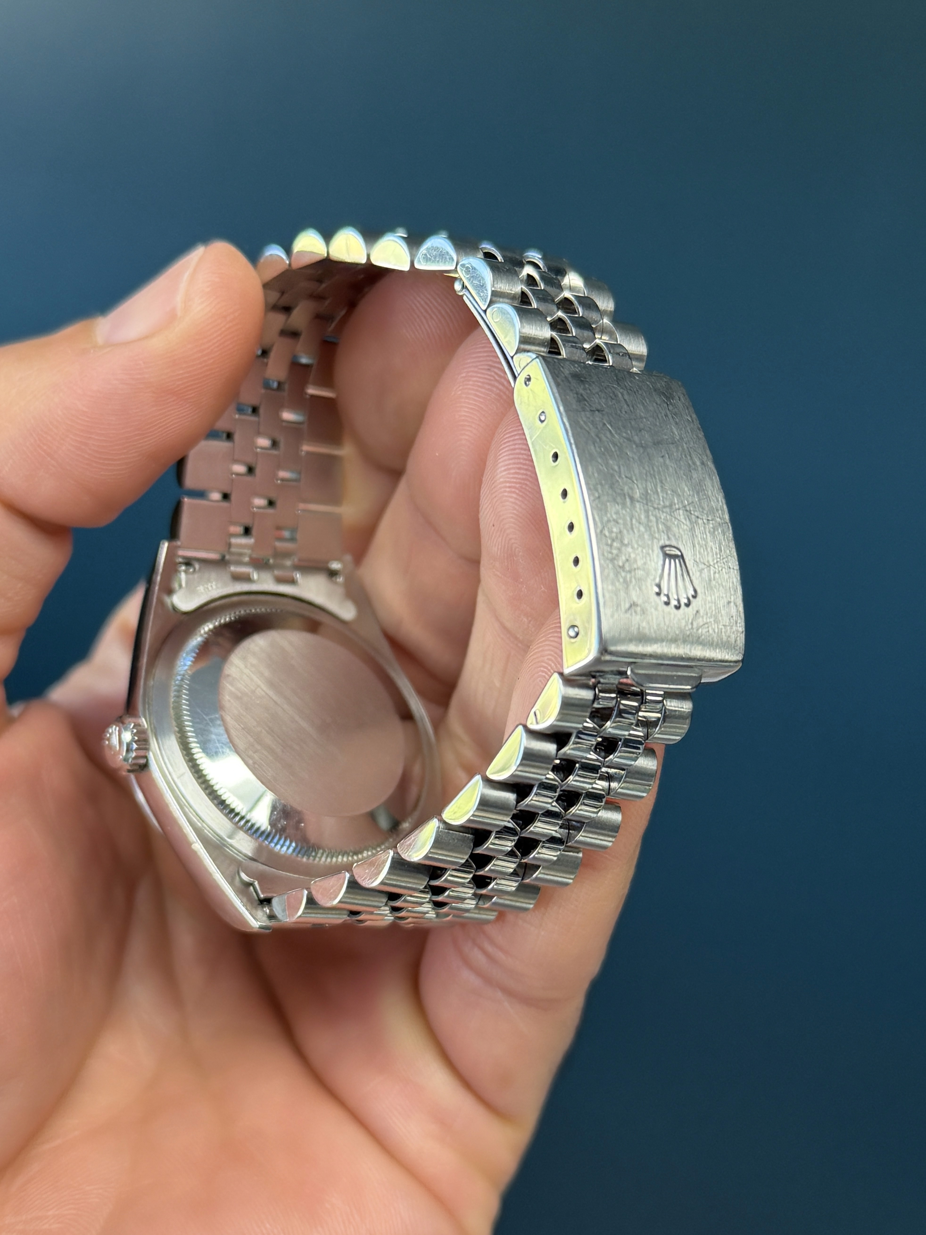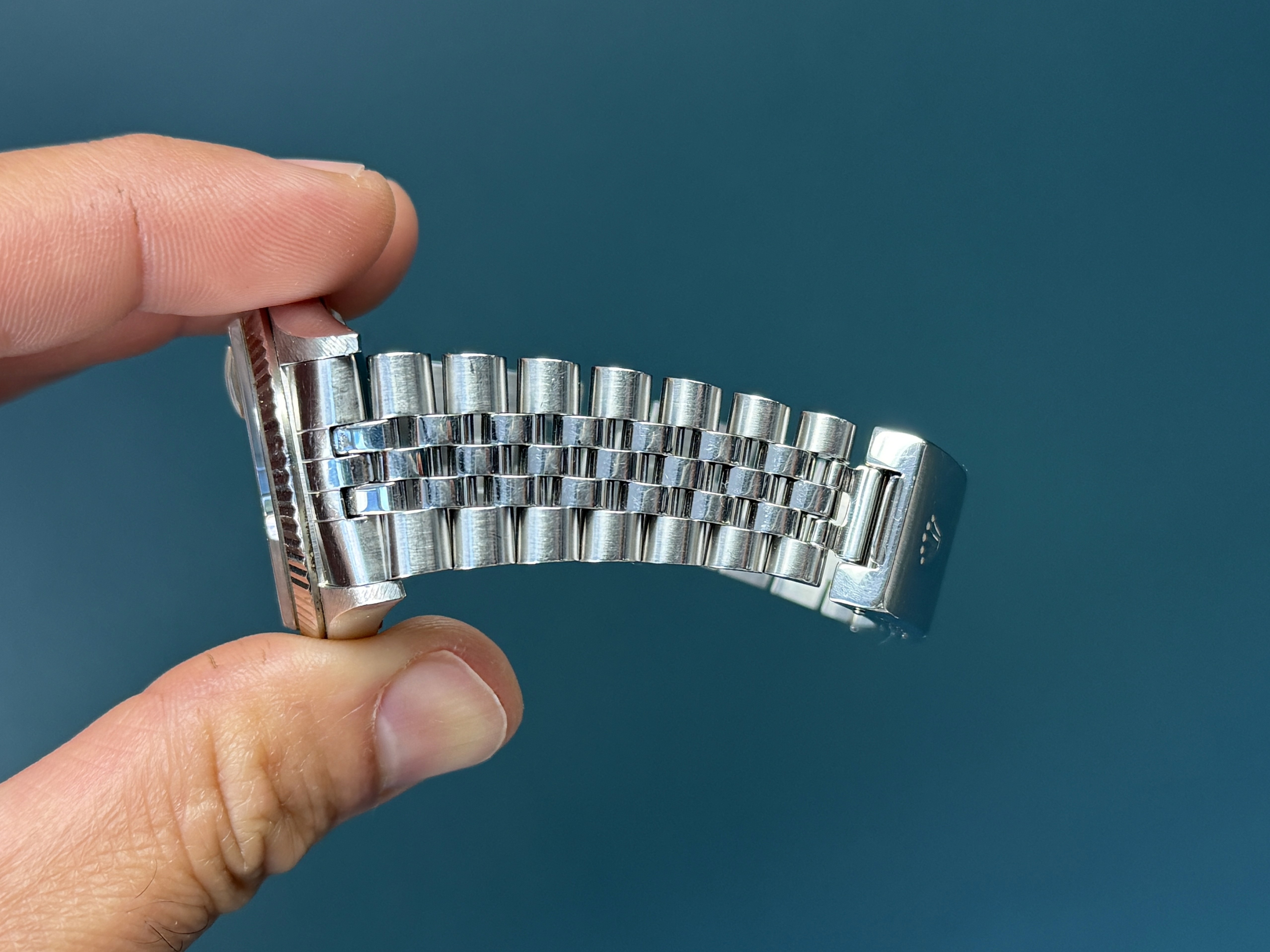 This example is in excellent condition with a sharp no holes case with thick lugs. The Tropical Anniversary Diamind dial is in excellent condition, showing no wear, and presents even tropical toning throughout. The jubilee bracelet is long and shows no stretch. This example is running COSC and has an excellent condition.