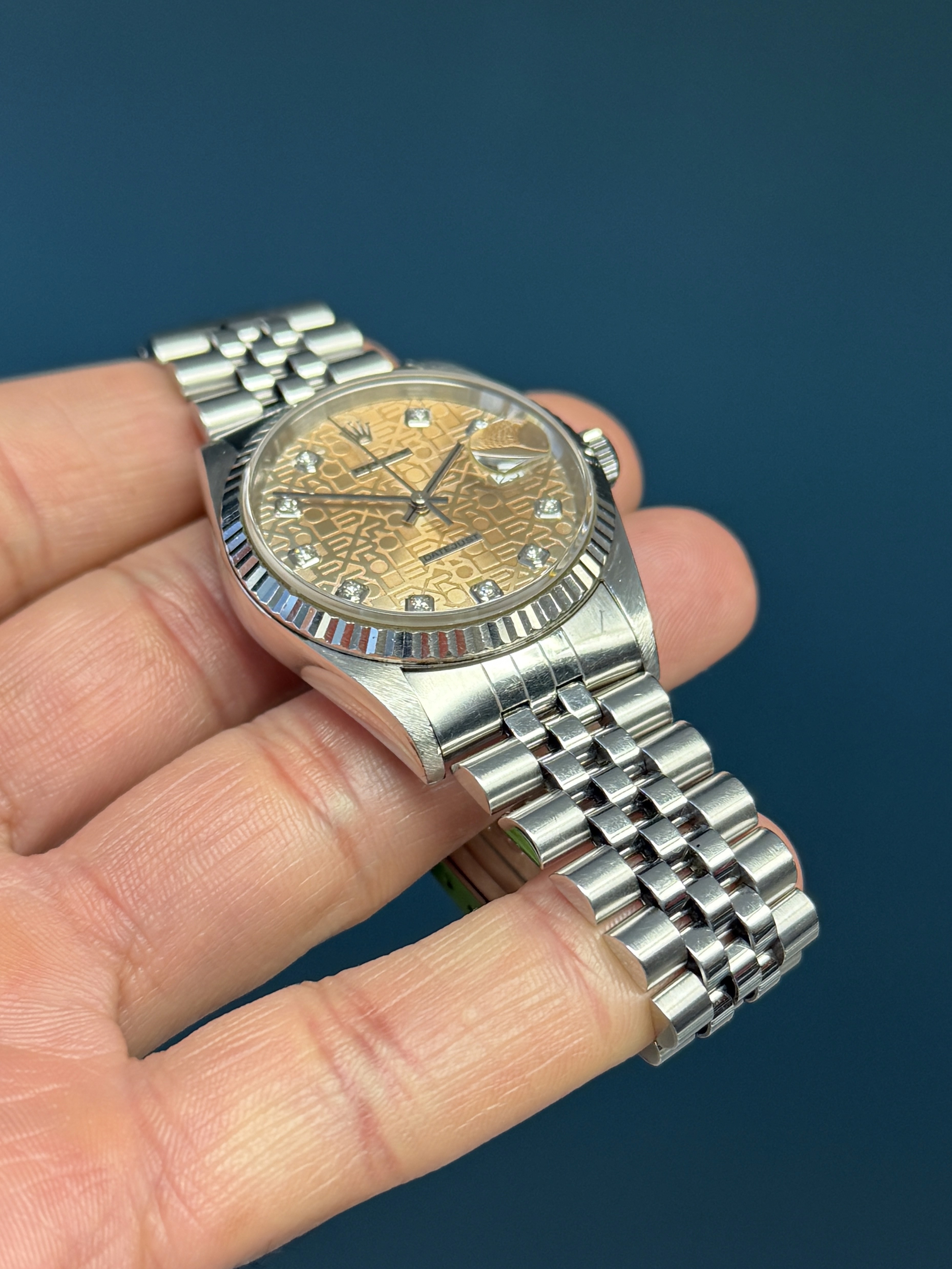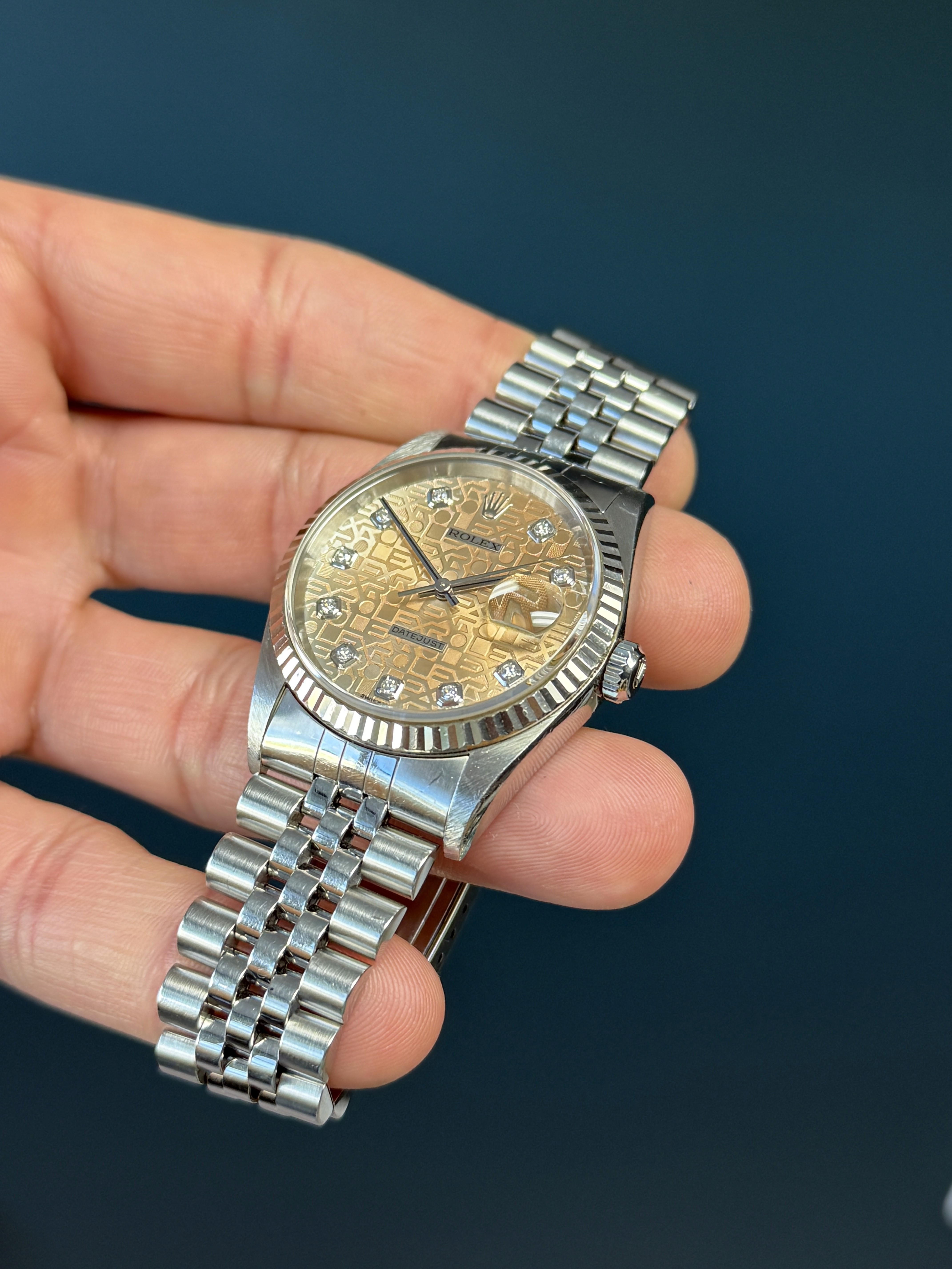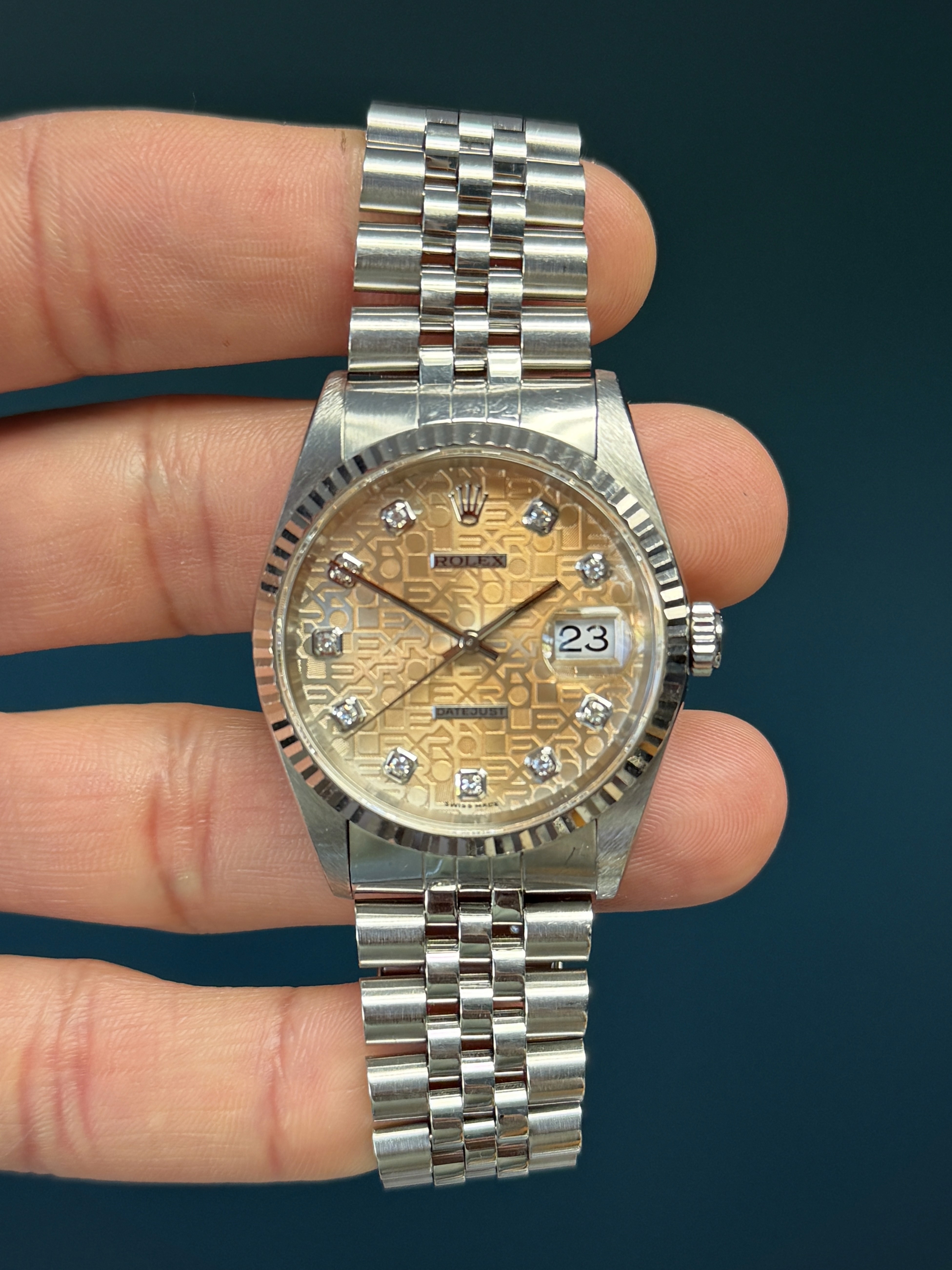 The Rolex Datejust reference 16234 is a timeless and iconic timepiece renowned for its elegant design and precision engineering. With a classic White gold bezel and holes stainless steel case measuring 36mm in diameter, this watch exudes understated luxury suitable for any occasion. Its Tropical anniversary diamond Dial with a date window at the 3 o'clock position, enhanced by the iconic Cyclops lens for magnified legibility is amazing. Powered by Rolex's reliable self-winding mechanical movement, the Datejust 16234 promises exceptional accuracy and durability. Finished with a stainless steel Jubilee bracelet, this watch epitomizes the perfect balance between sophistication and functionality, making it a cherished companion for all.