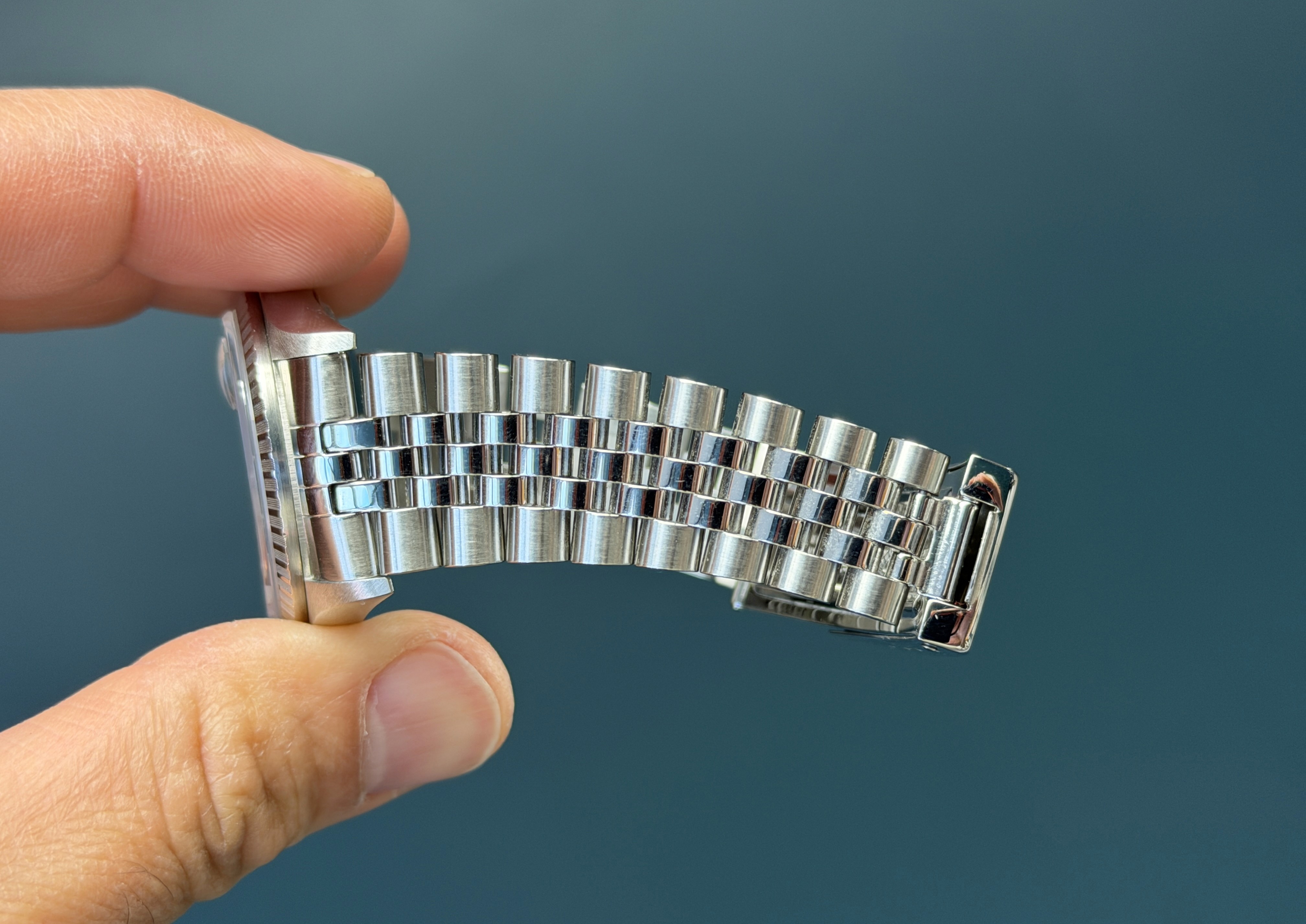 This example is in excellent unpolished condition with a sharp no-holes case with thick lugs. The Black Stick dial is excellent showing no wear. The jubilee bracelet is long and shows no stretch with a total of 3 removable screws. This example is running COSC and has an excellent aesthetic appearance ready to go.