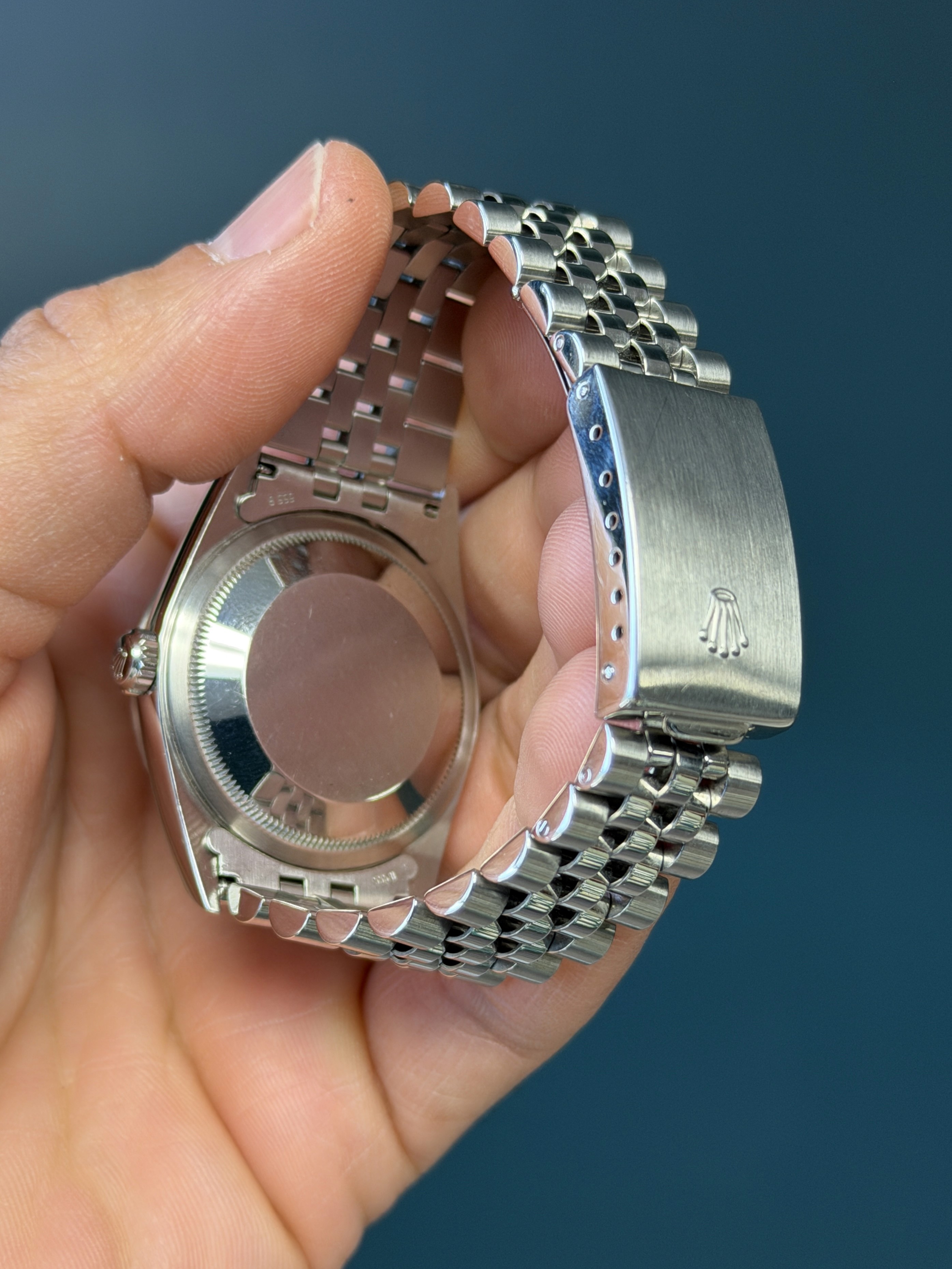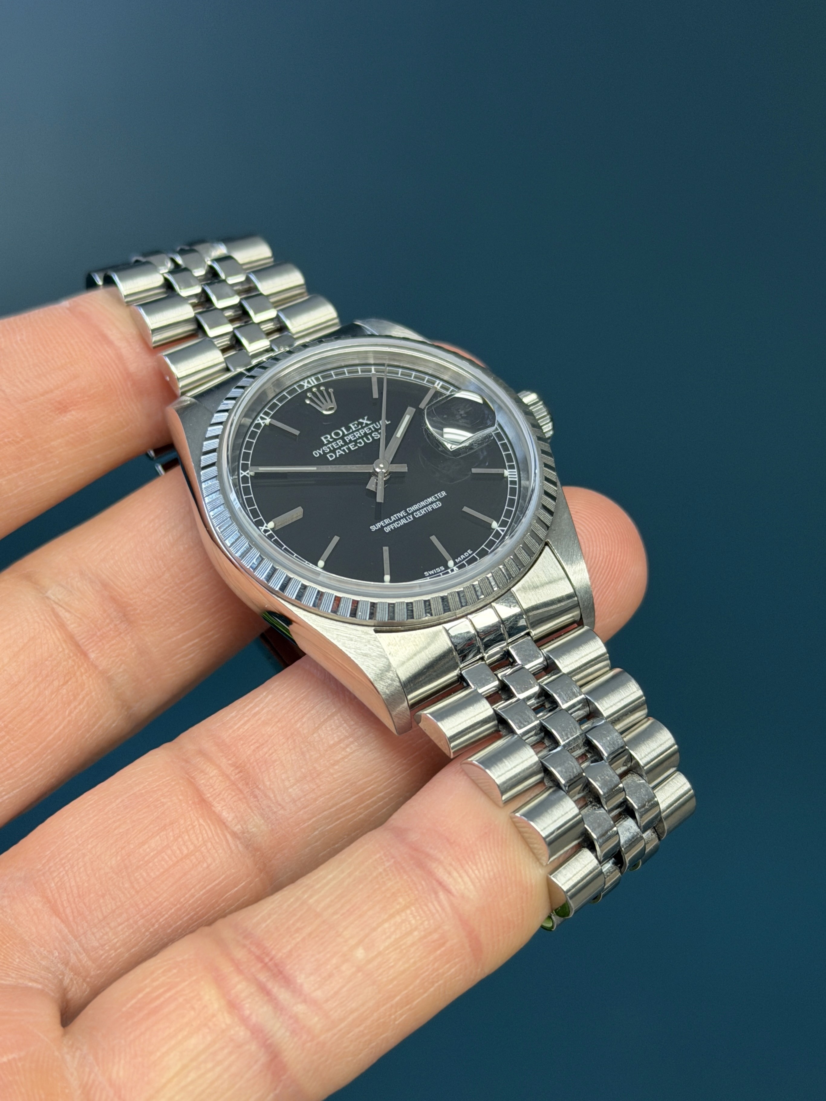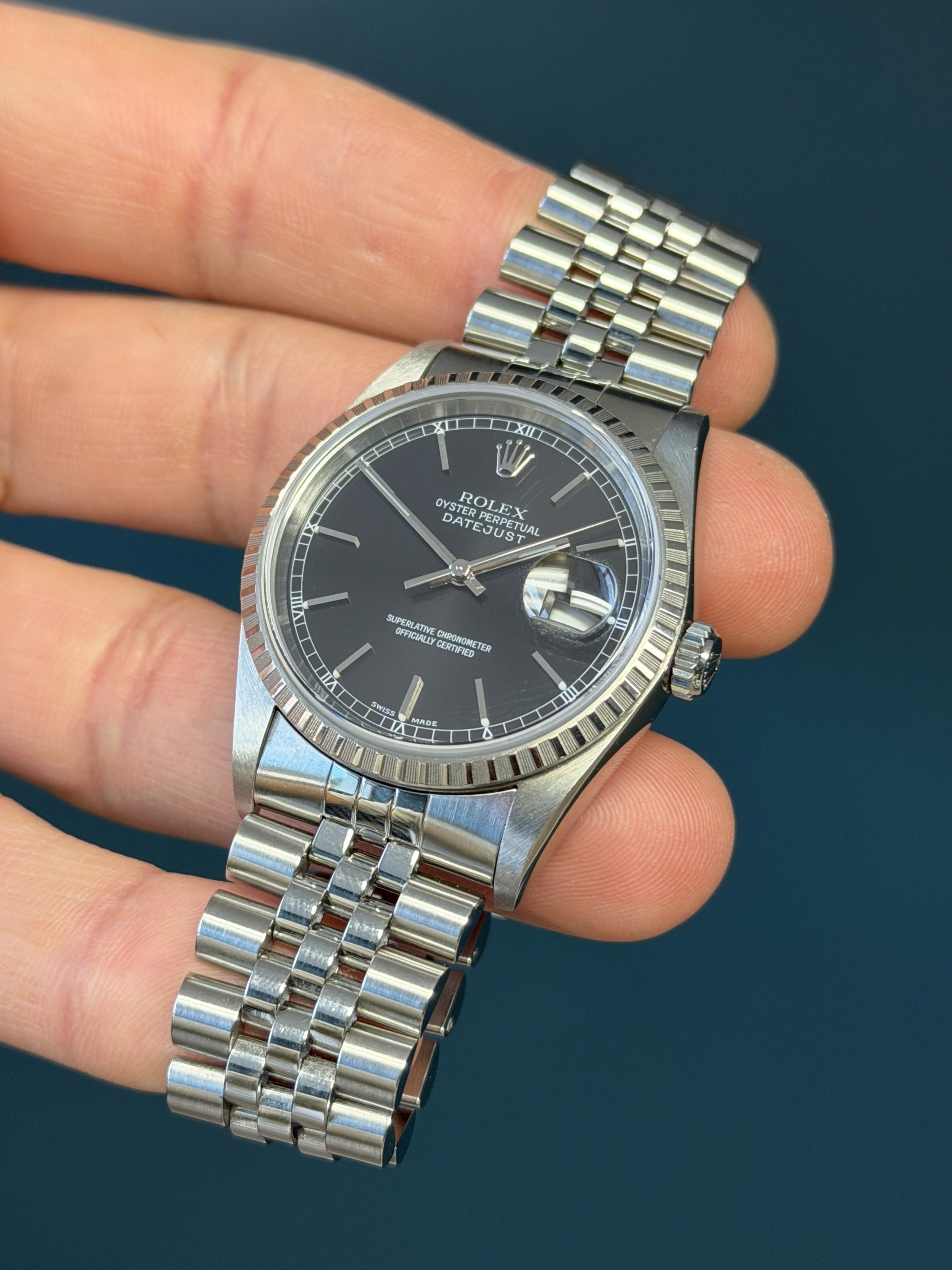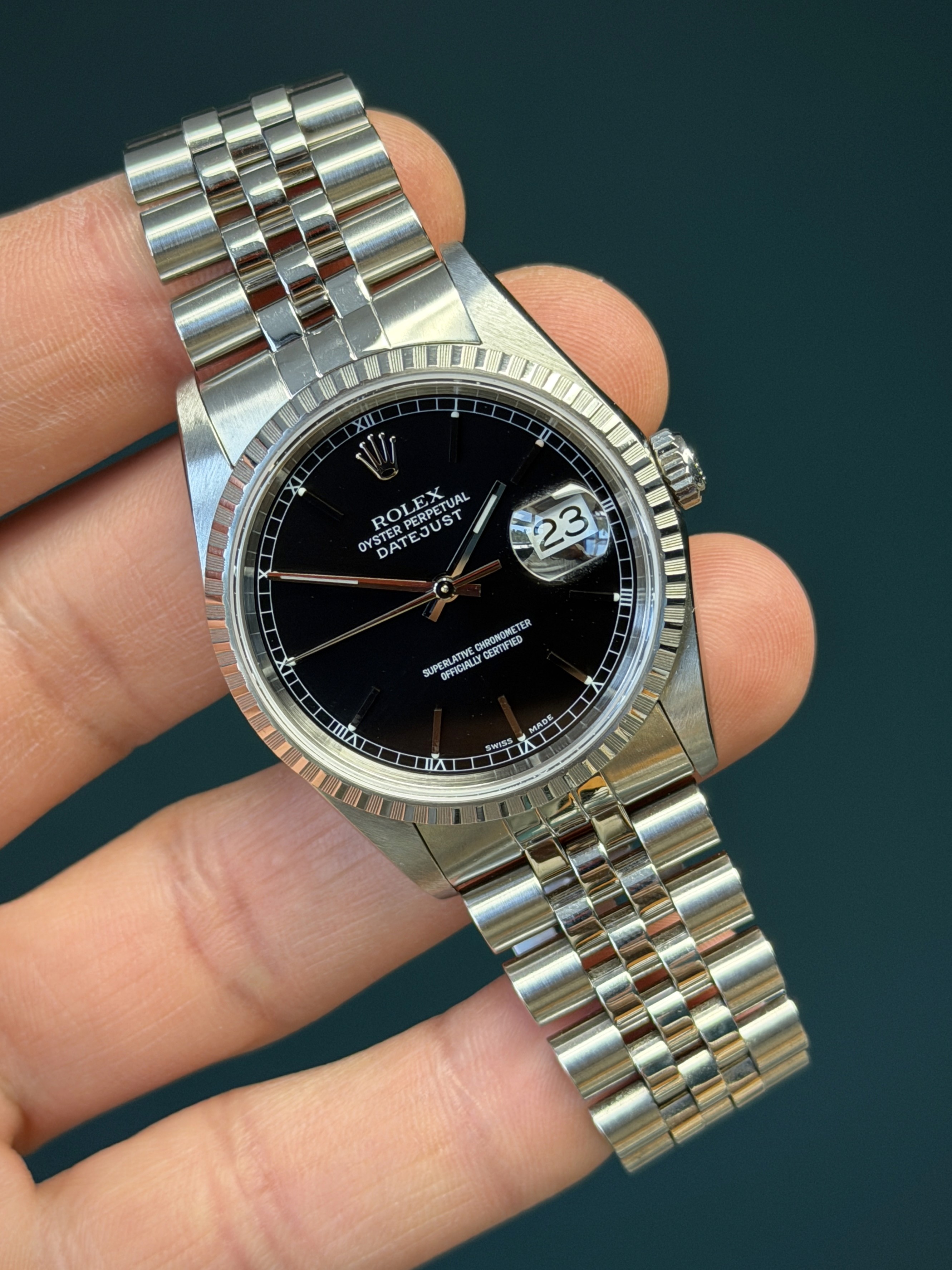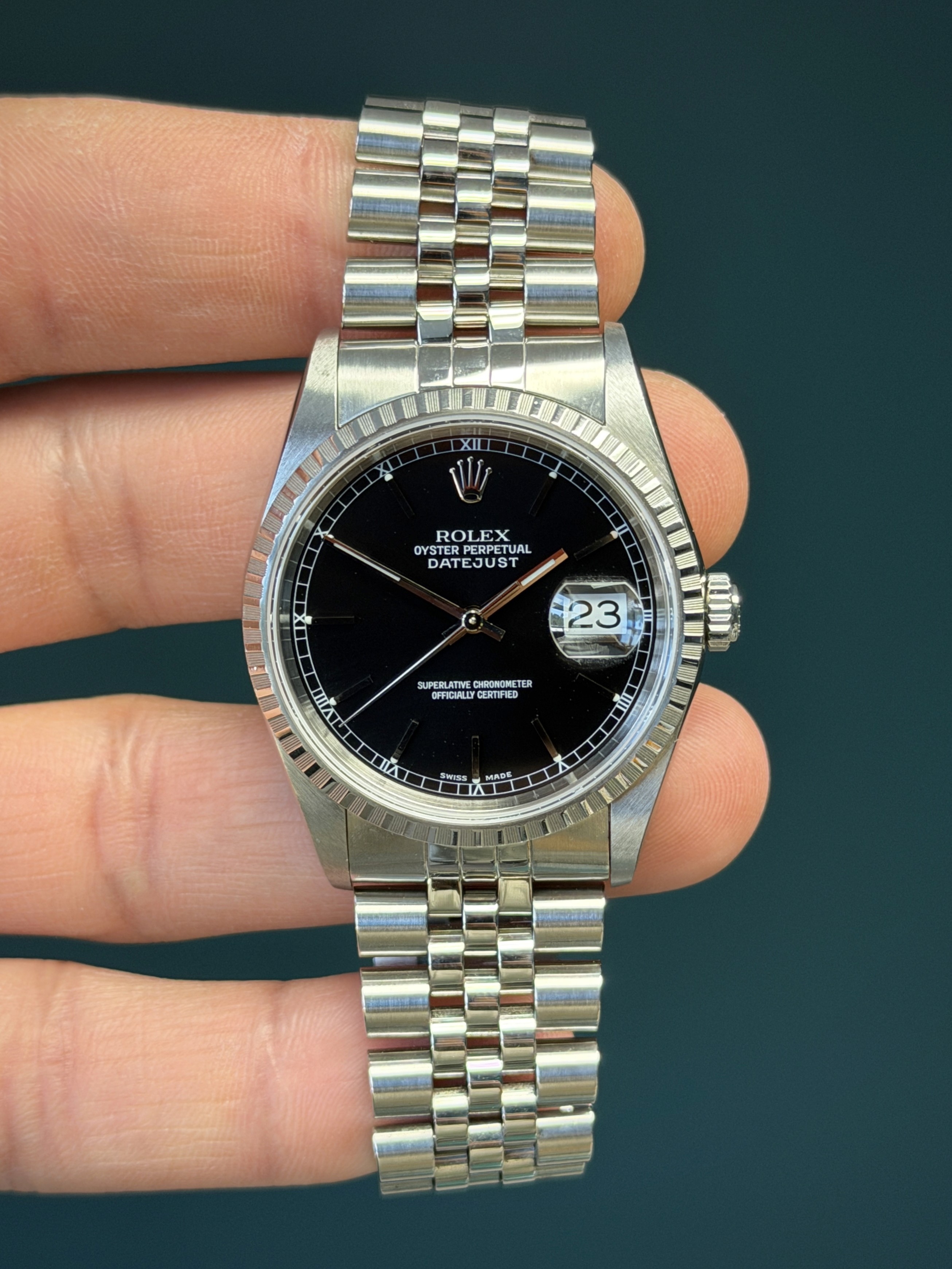 The Rolex Datejust reference 16220 is a timeless and iconic timepiece renowned for its elegant design and precision engineering. With a classic stainless steel case measuring 36mm in diameter, this watch exudes understated luxury suitable for any occasion. Its mint black stick dial features a date window at the 3 o'clock position, enhanced by the iconic Cyclops lens for magnified legibility. Powered by Rolex's reliable self-winding mechanical movement, the Datejust 16220 promises exceptional accuracy and durability. Finished with a stainless steel Jubilee bracelet, this watch epitomizes the perfect balance between sophistication and functionality, making it a cherished companion for all.