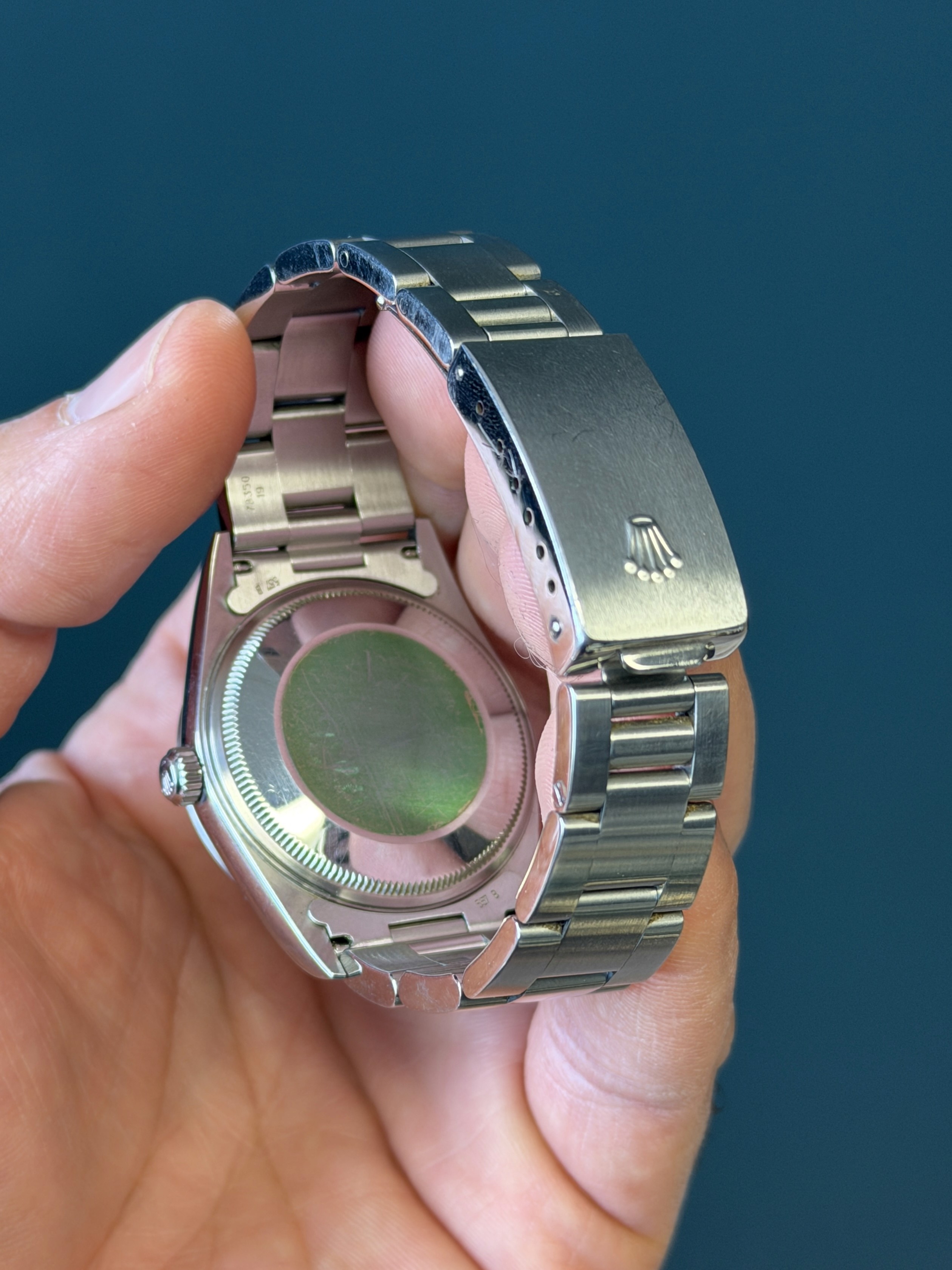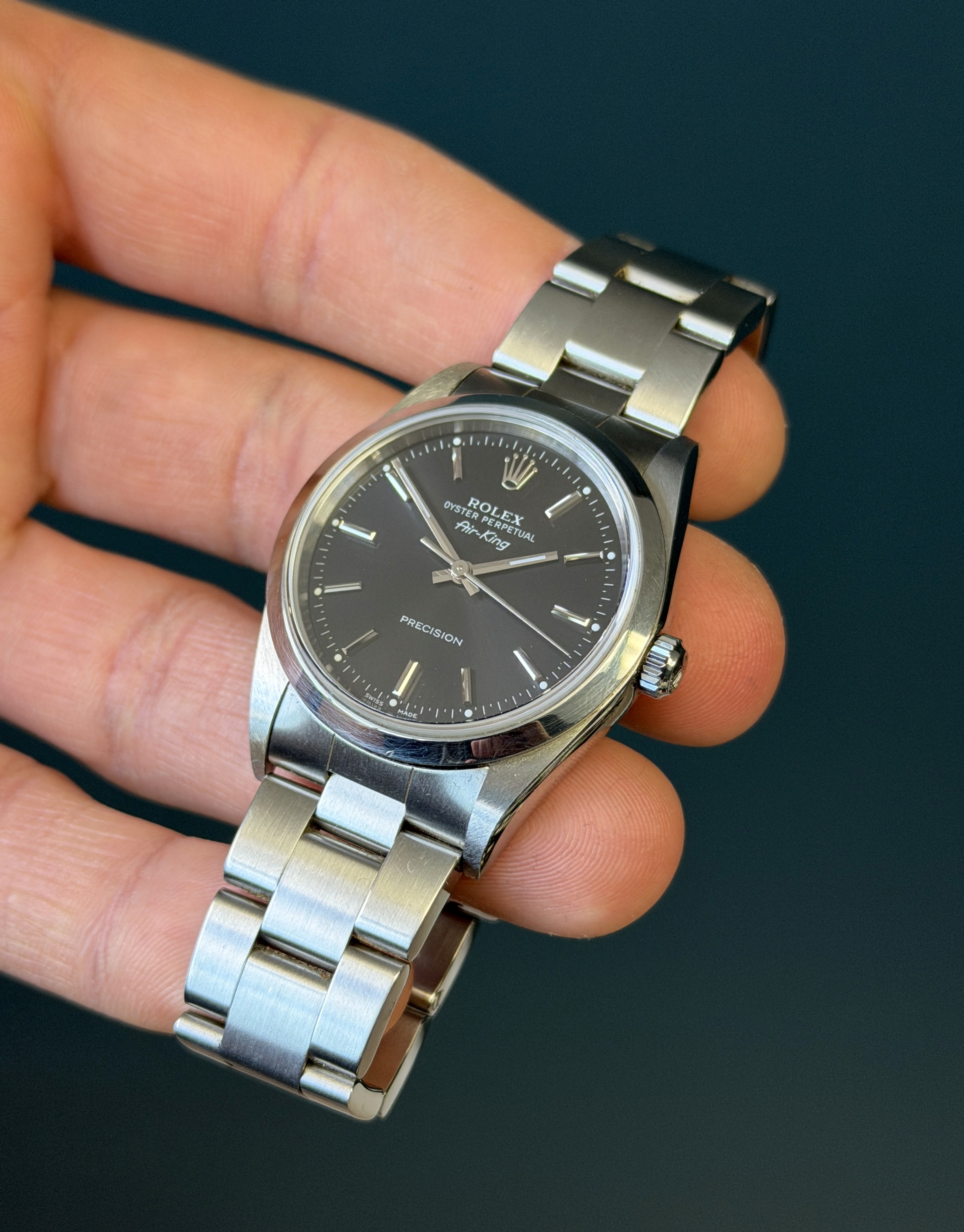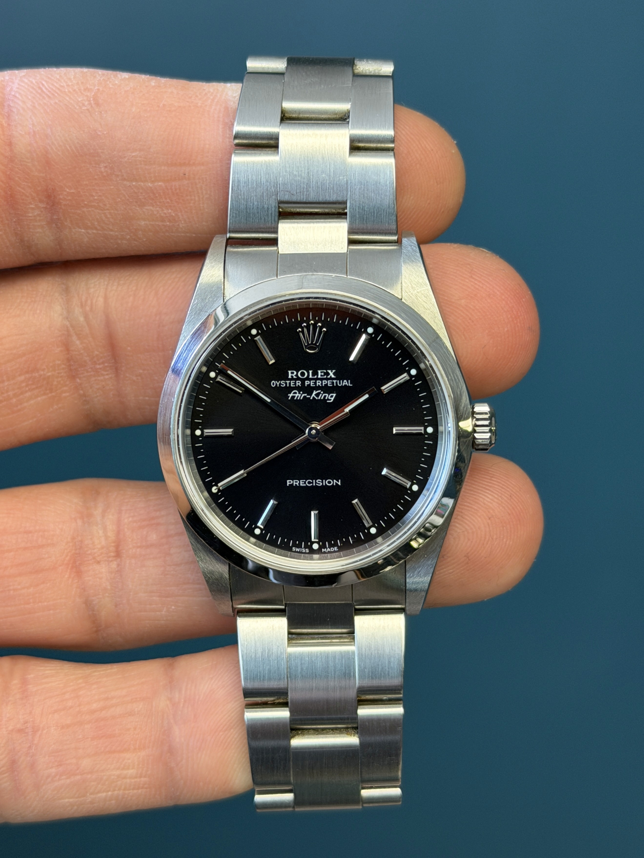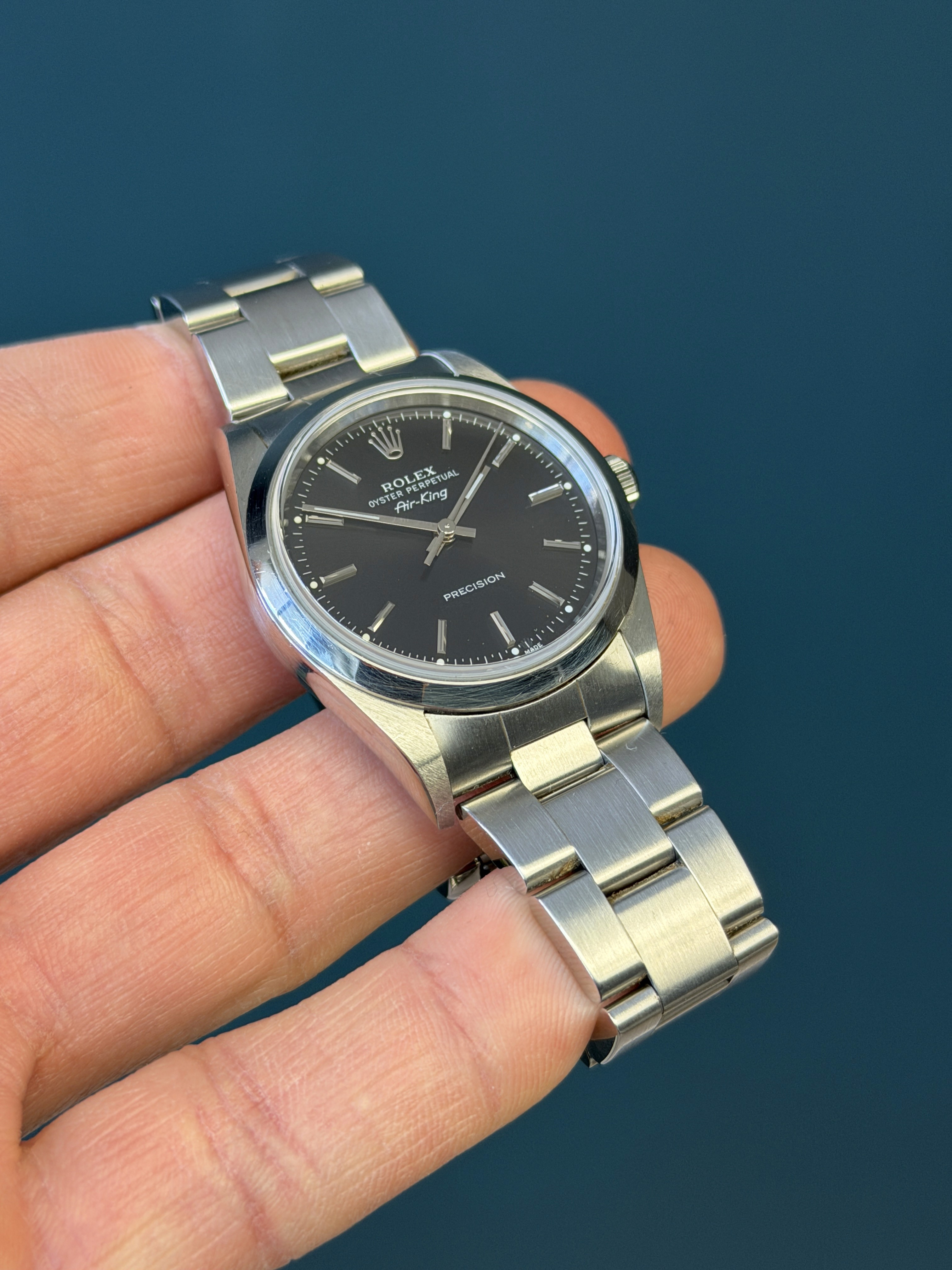 The Rolex Oyster Perpetual Air-King Reference 14000 with a black stick Dial is a stunning example of Rolex's commitment to timeless elegance and superior craftsmanship. This exquisite timepiece features a 34mm stainless steel case, perfectly balanced for both comfort and style. The sharp black stick dial adds a touch of sophistication, beautifully contrasted by the sleek, minimalist design and luminous hour markers. The smooth bezel and classic Oyster bracelet enhance its refined aesthetic, making it suitable for any occasion. This particular model, with its rare and captivating black salmon dial, stands out as a distinctive and highly sought-after addition to any watch collection, embodying the perfect blend of tradition and modernity.