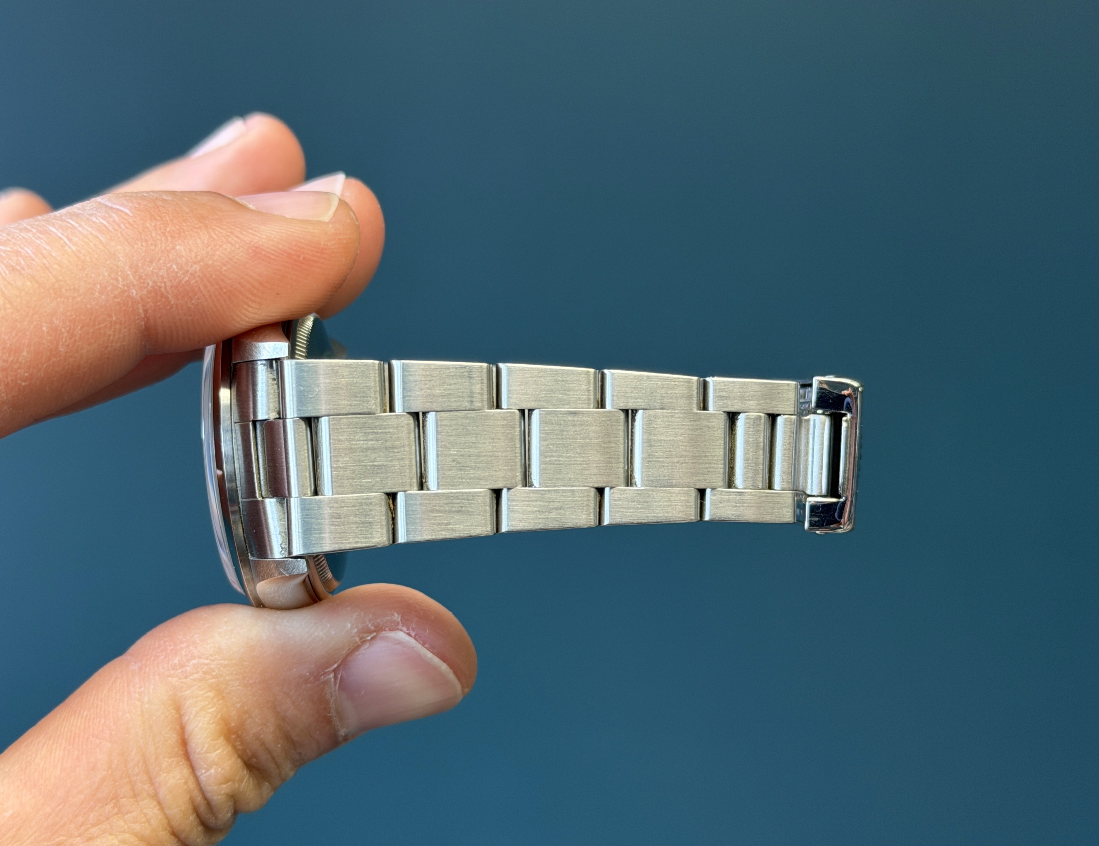 Today's example comes to us in excellent condition. The unpolished no holes case is sharp and crisp paired with its full caseback sticker present. The black stick dial is mint and shows no visible wear. The bracelet has 11 total links and shows no stretch. Just an excellent example at the right price!