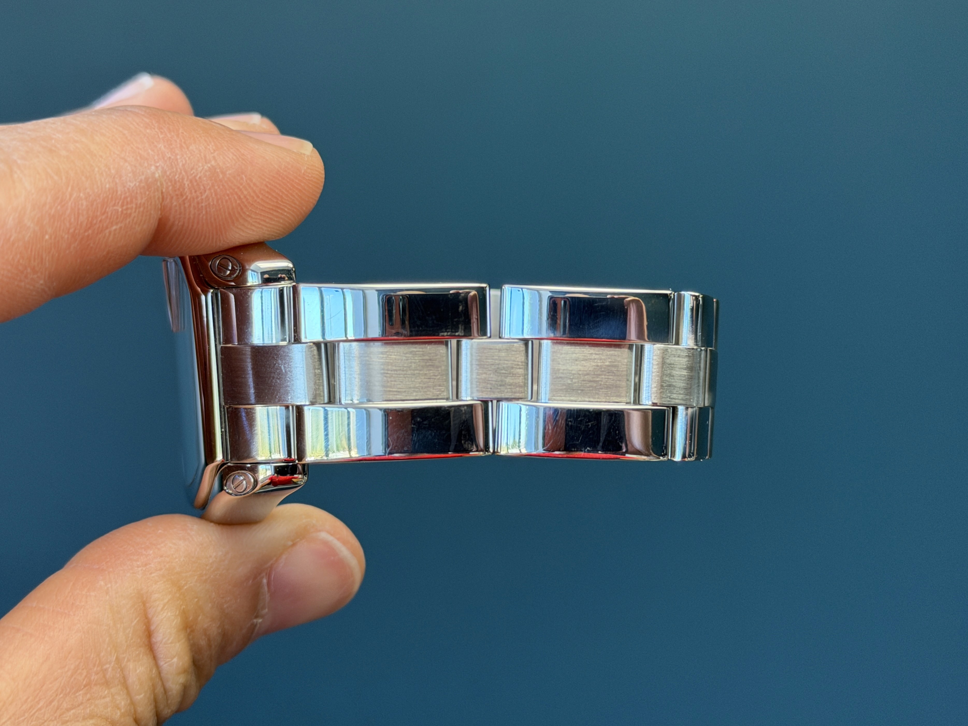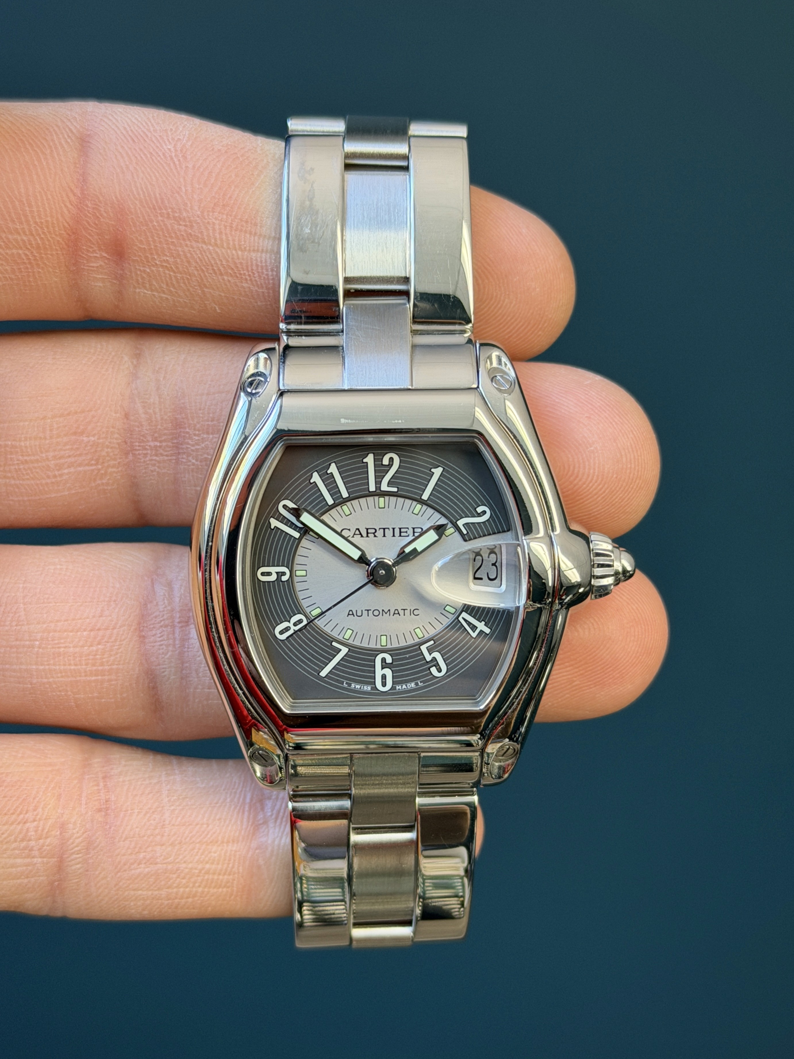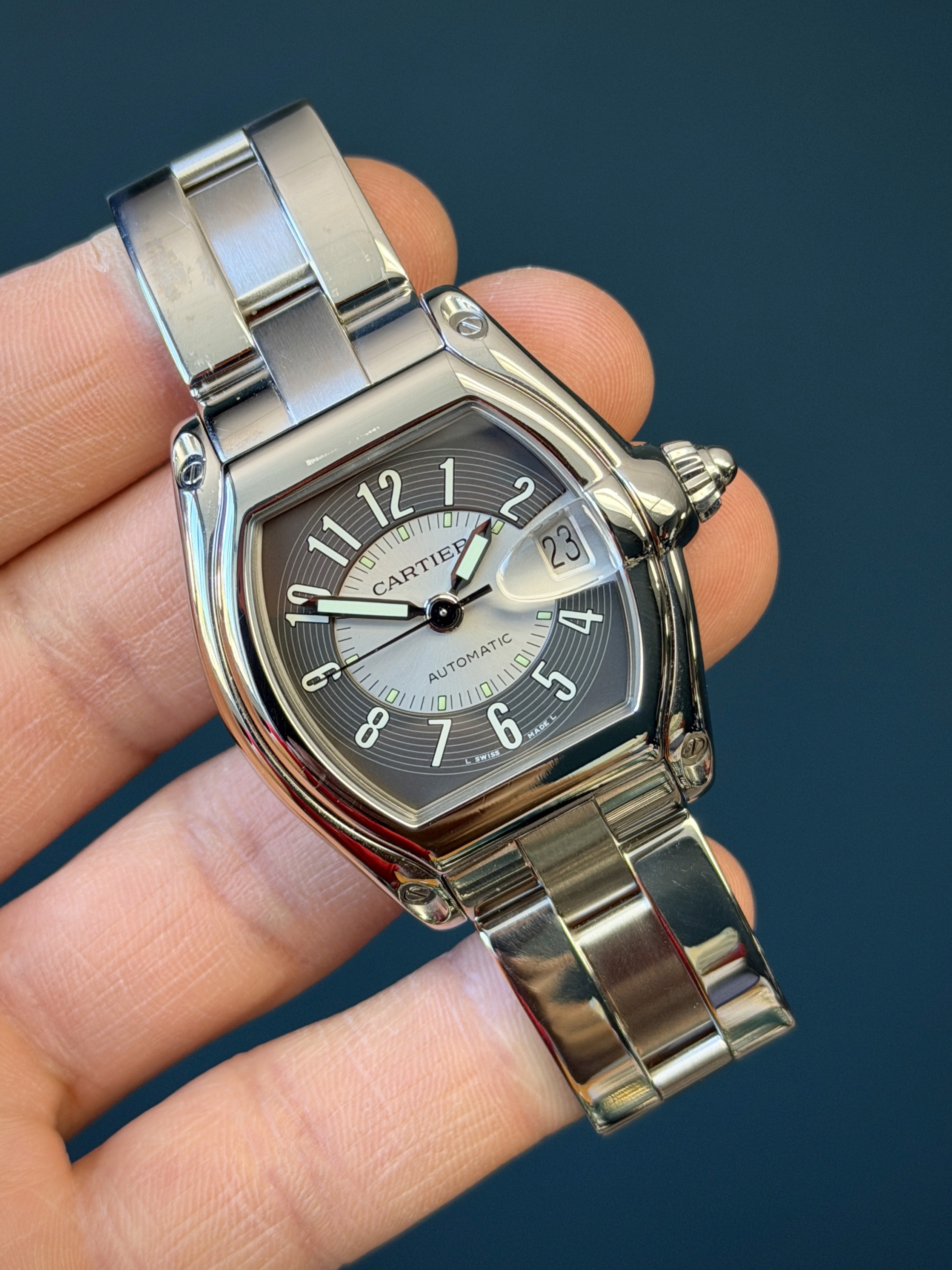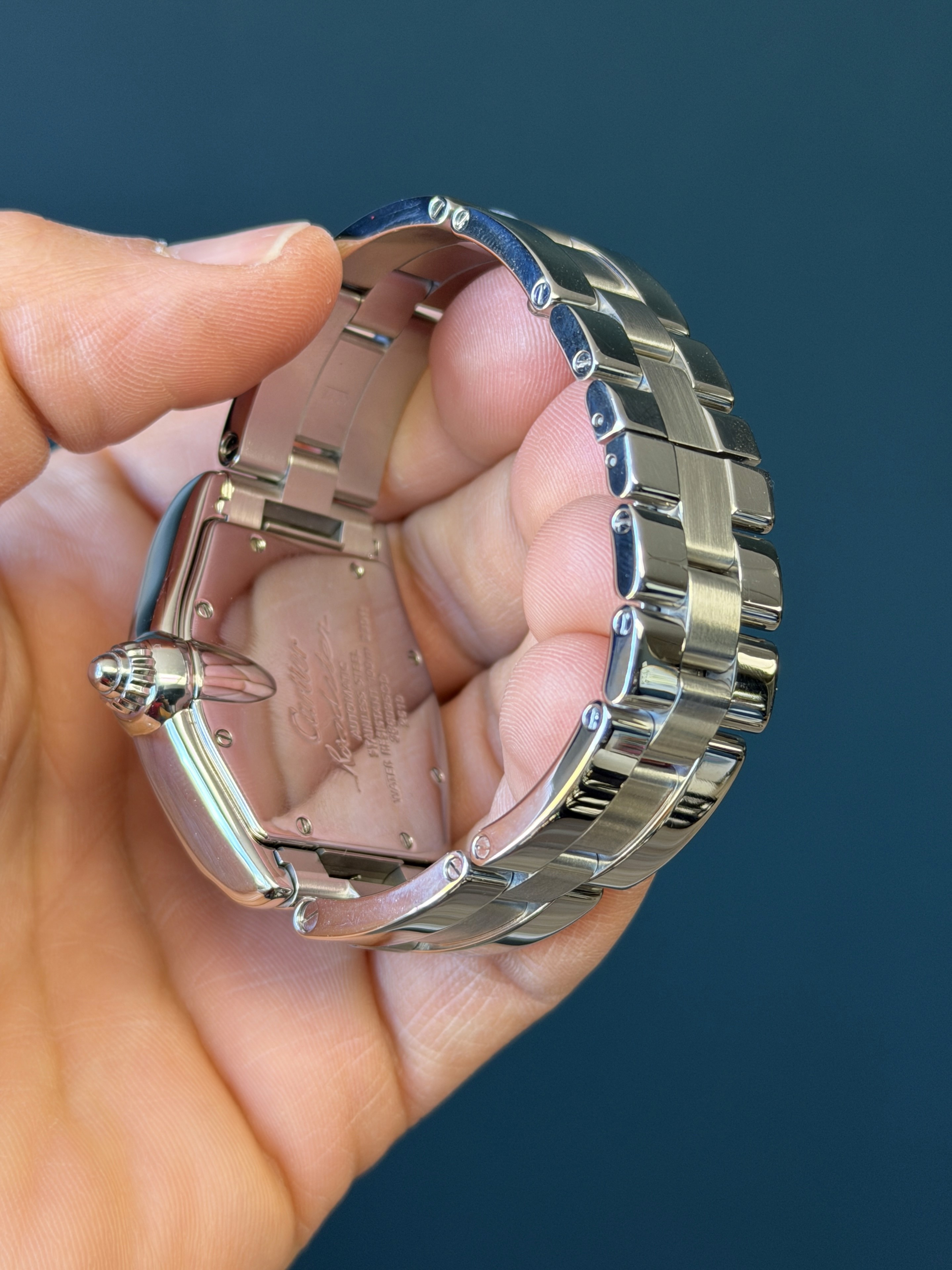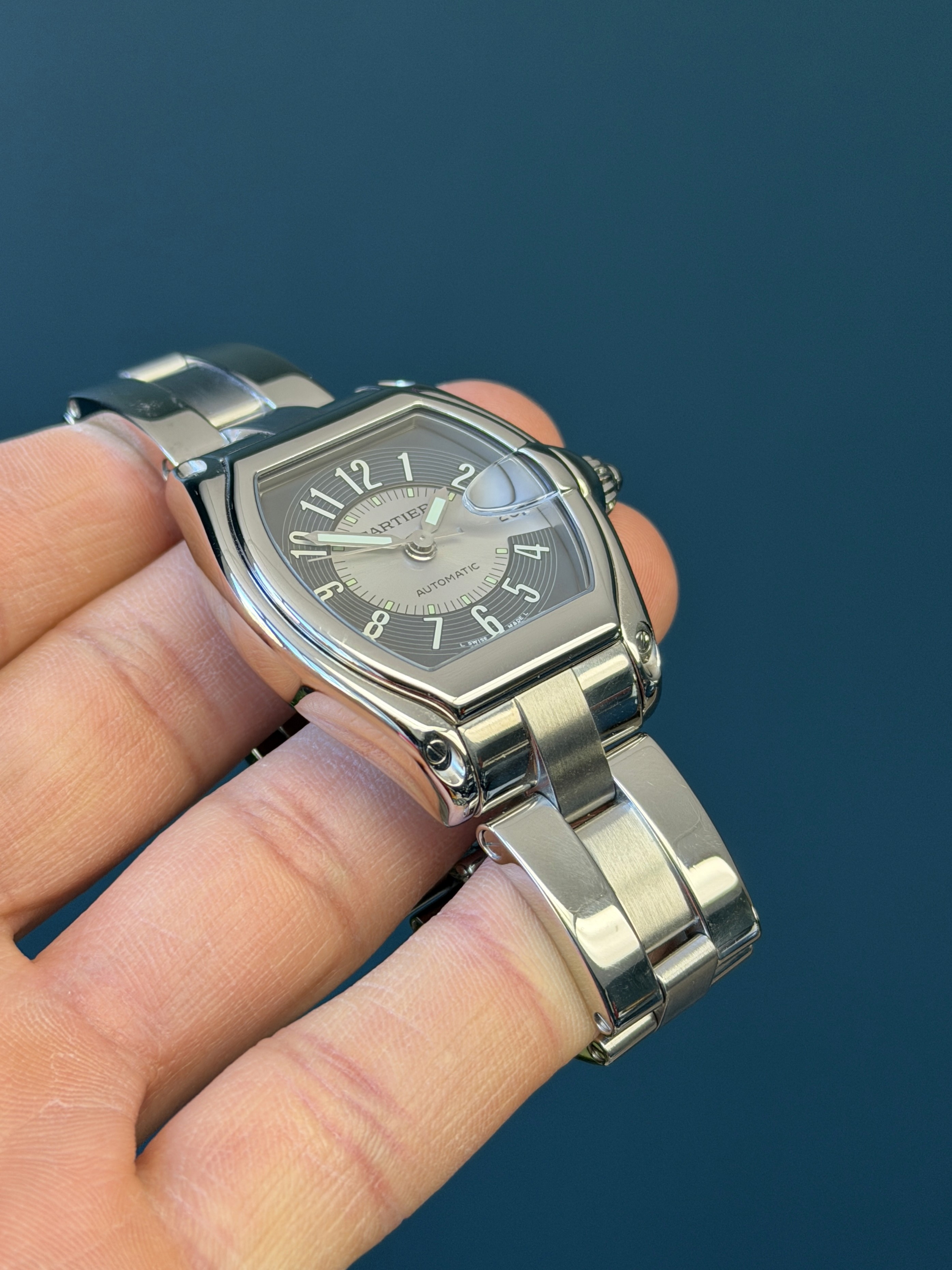 This Roadster model comes fitted with a stainless steel bracelet featuring a hidden deployant clasp with a total of 5 large and 5 small links.
