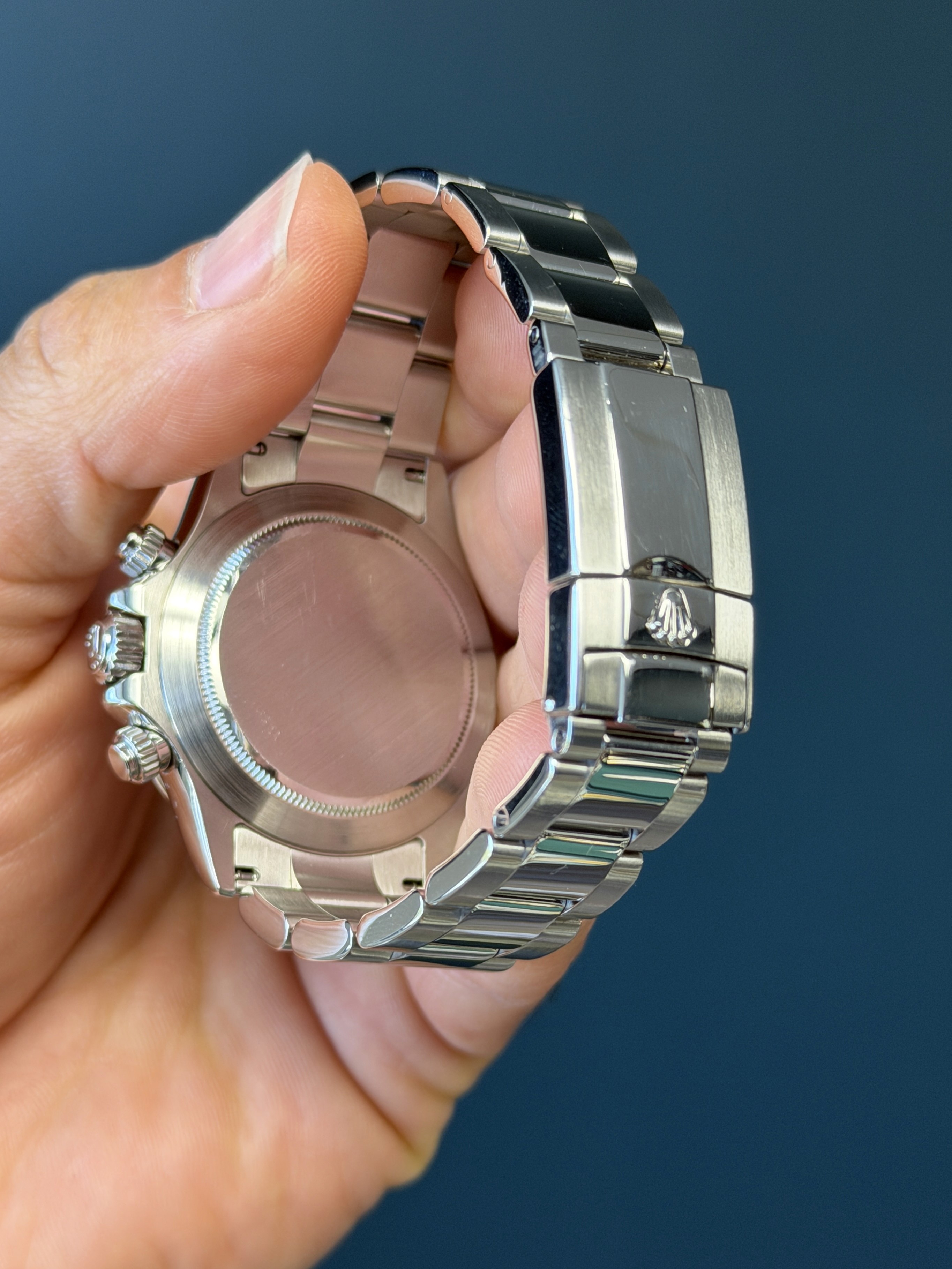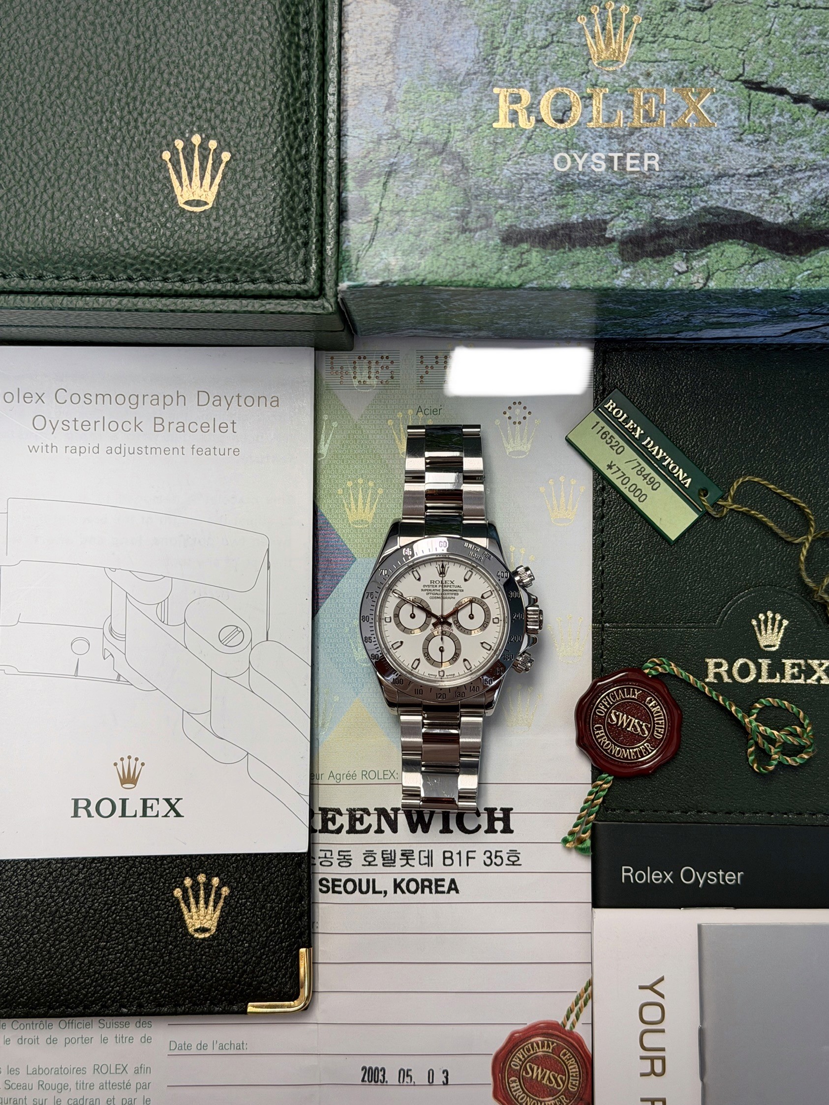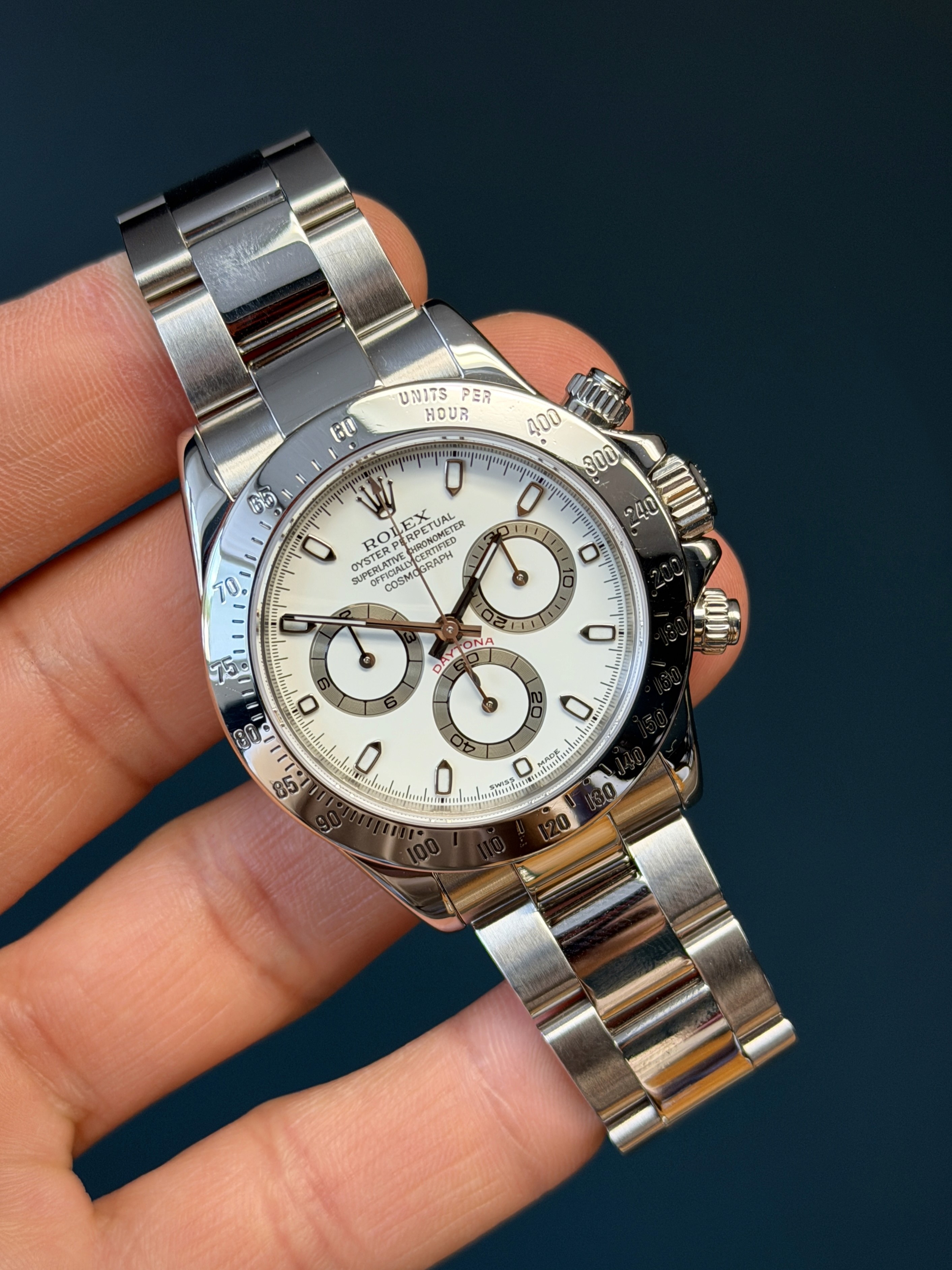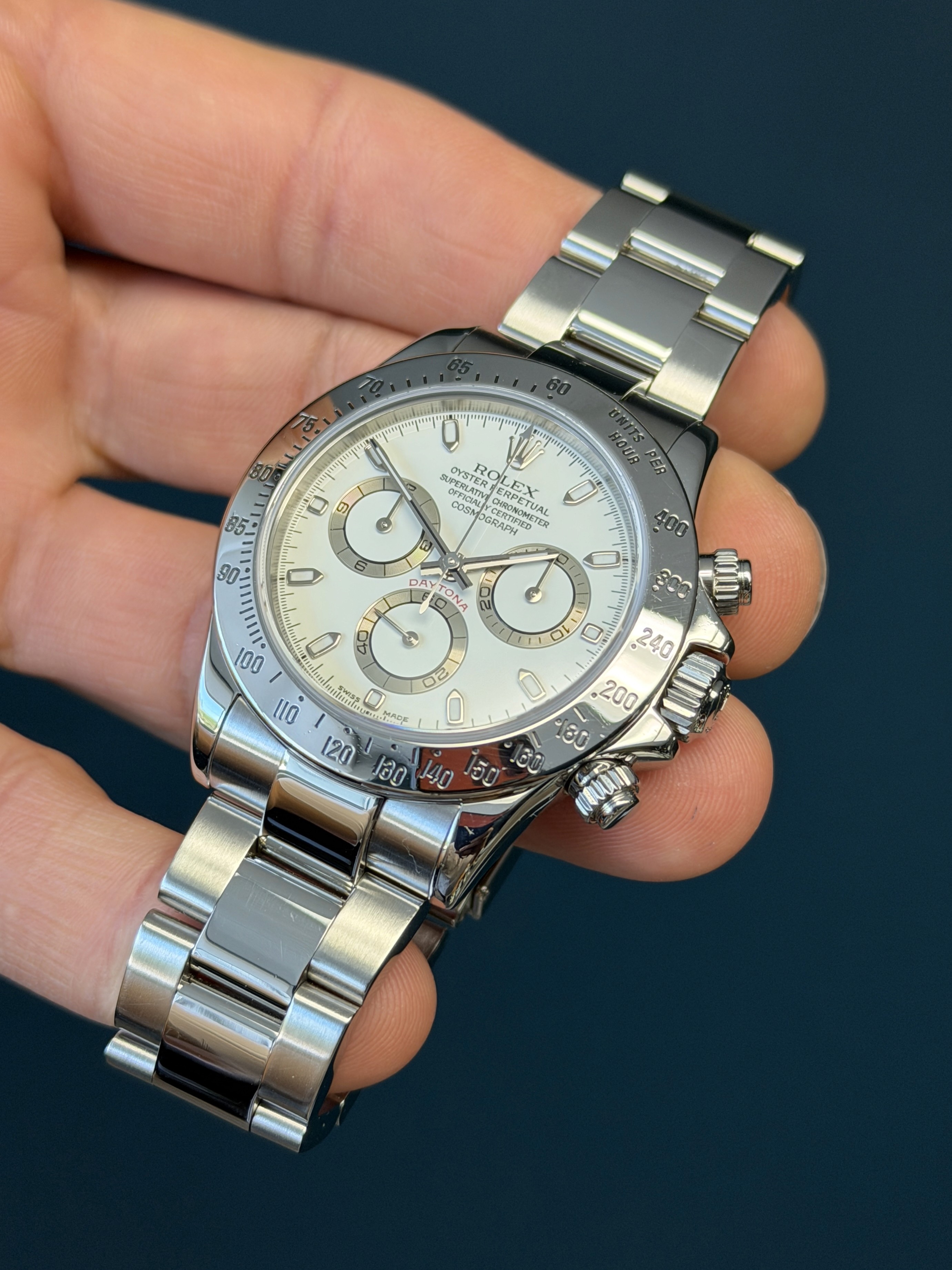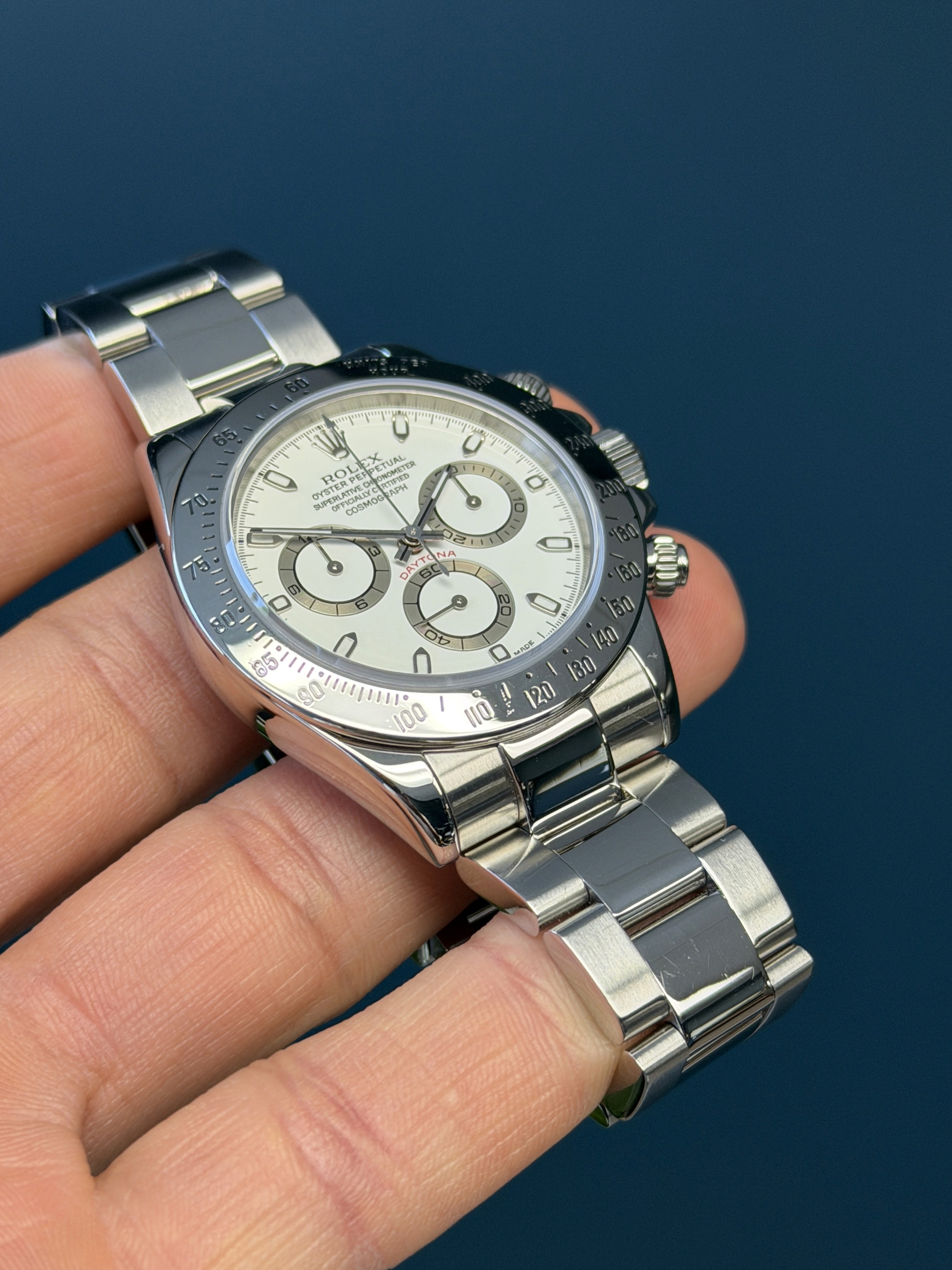 The Rolex Daytona Reference 116520 is a masterpiece of horological engineering and design, celebrated for its precision, durability, and timeless appeal. Featuring a robust 40mm stainless steel Oyster case, this iconic chronograph is both elegant and sporty, designed to withstand the rigors of professional racing. The Creamy dial is adorned with luminescent hour markers and hands, along with three sub-dials for measuring elapsed time. Powered by the in-house Rolex Caliber 4130 automatic movement, the Daytona 116520 ensures exceptional accuracy and reliability, boasting a power reserve of approximately 72 hours. The tachymetric scale on the bezel allows for precise speed calculations, making it a favorite among motorsport enthusiasts. Completed with a sturdy stainless steel Oyster bracelet featuring the Oysterlock clasp, the Rolex Daytona 116520 is a symbol of excellence and prestige, perfect for those who appreciate both functionality and luxurious design.